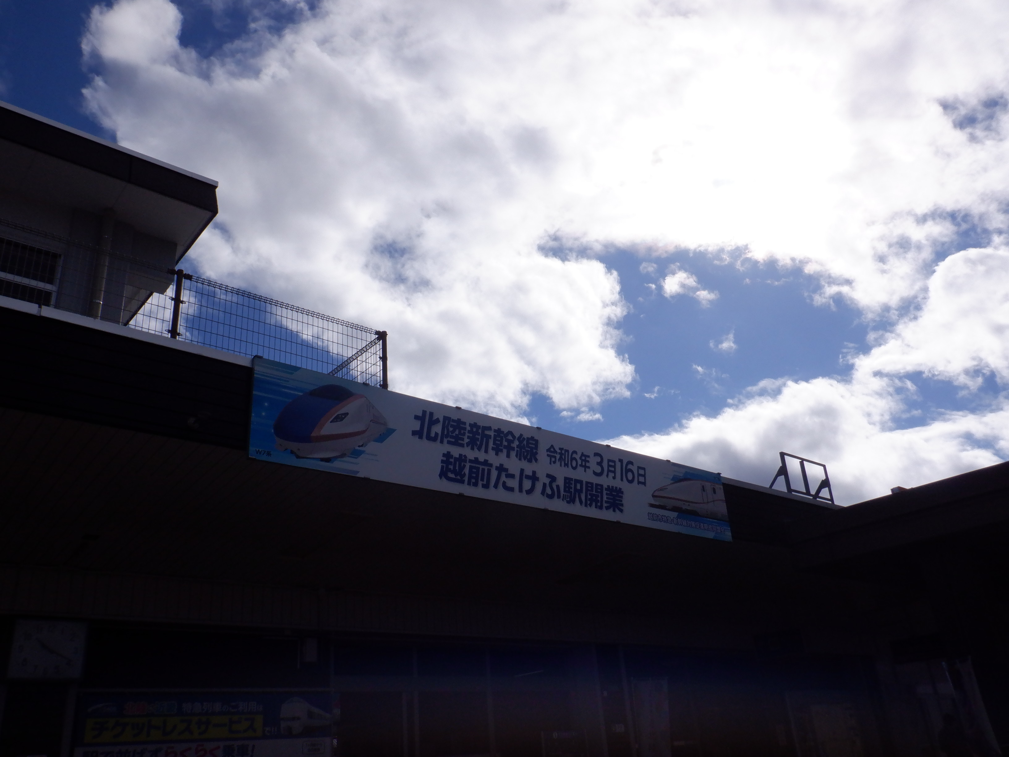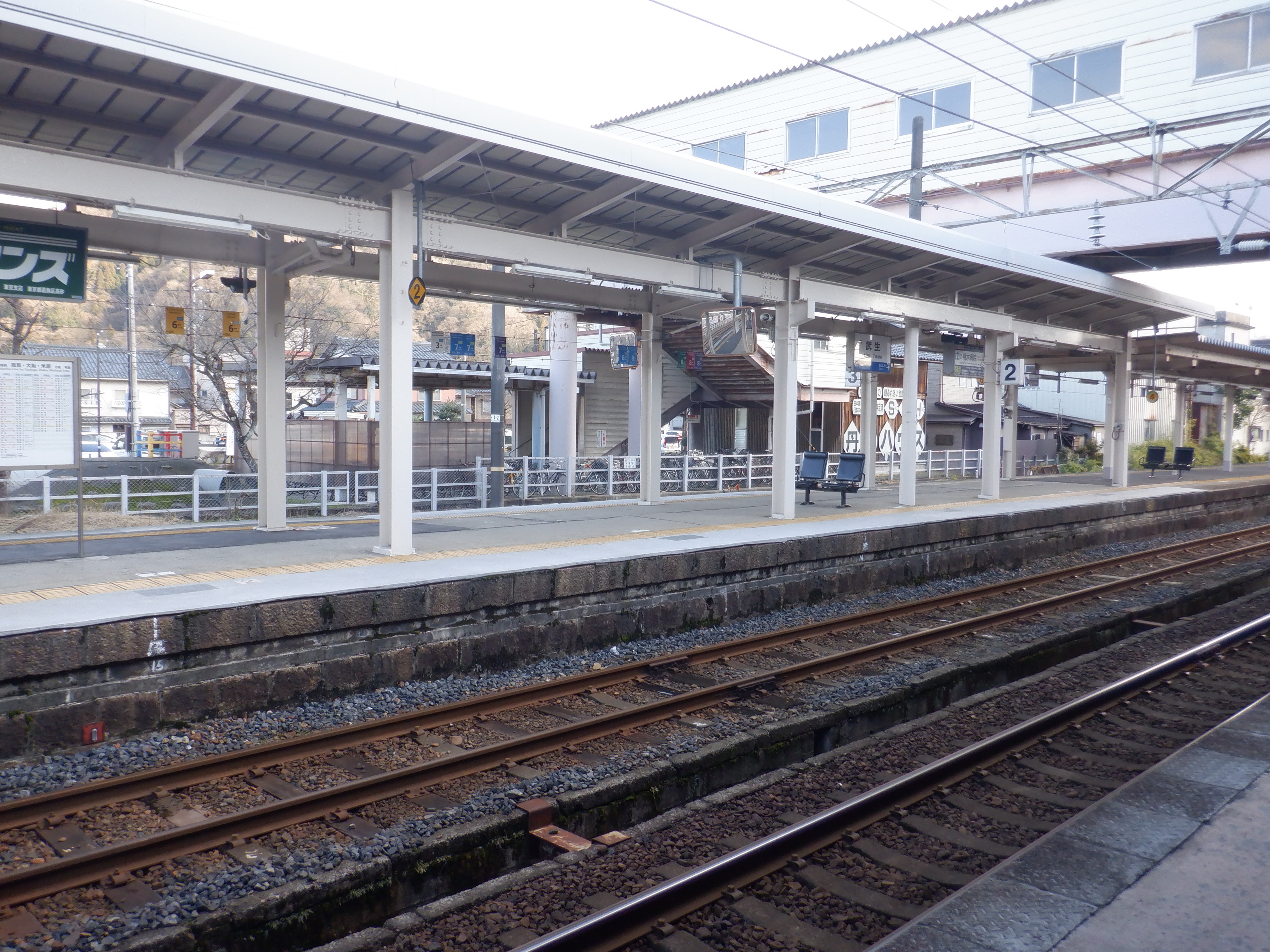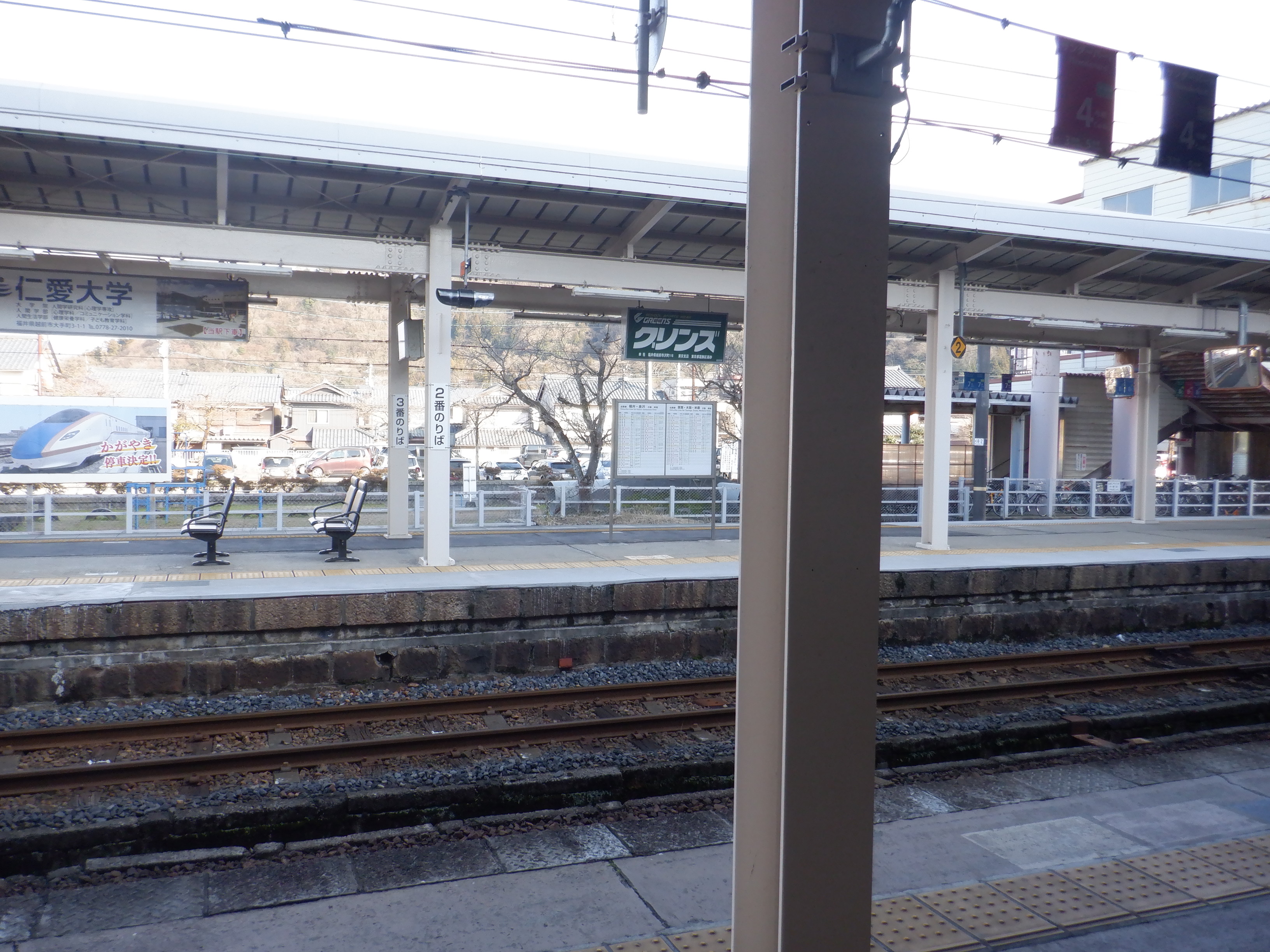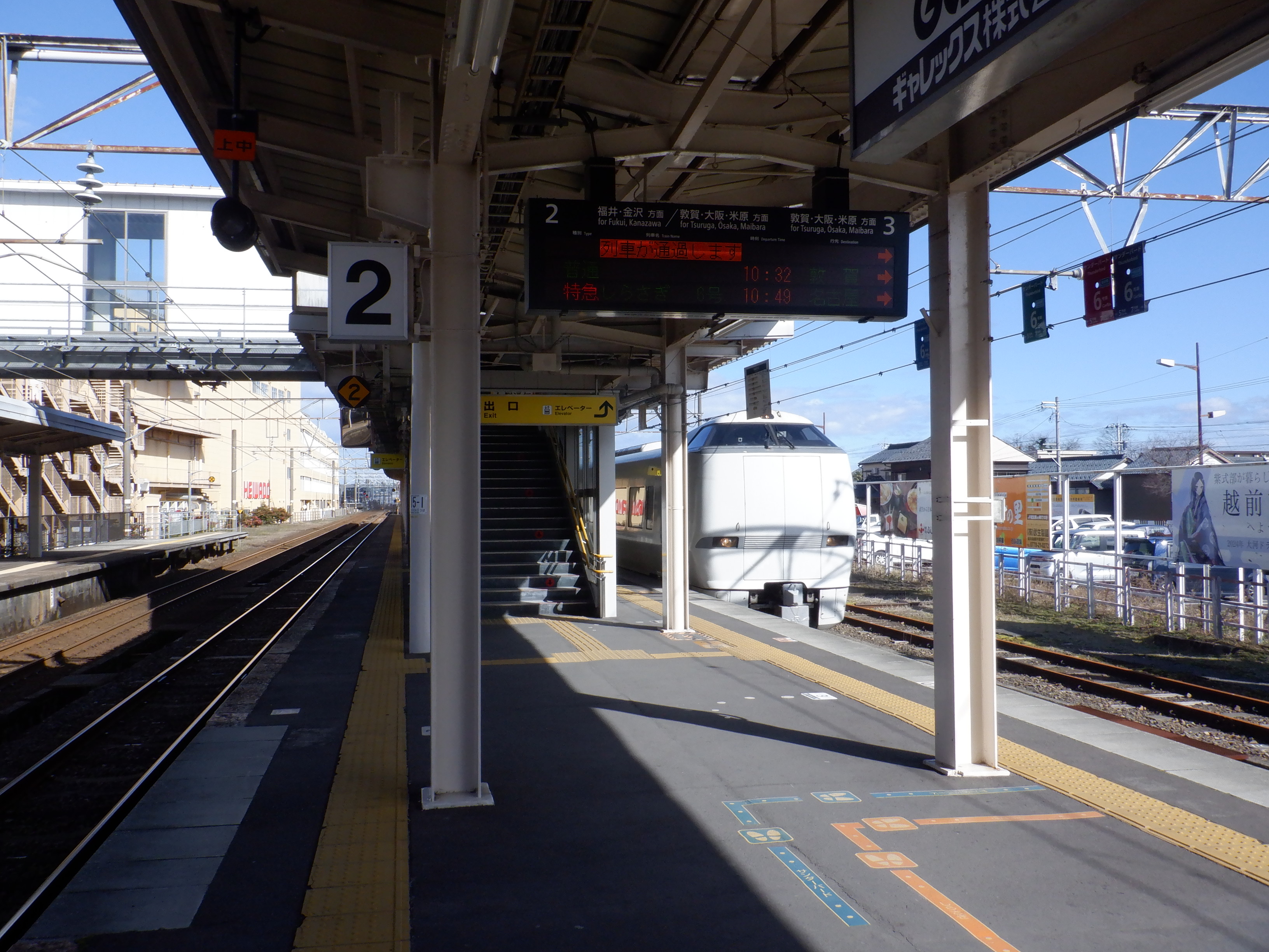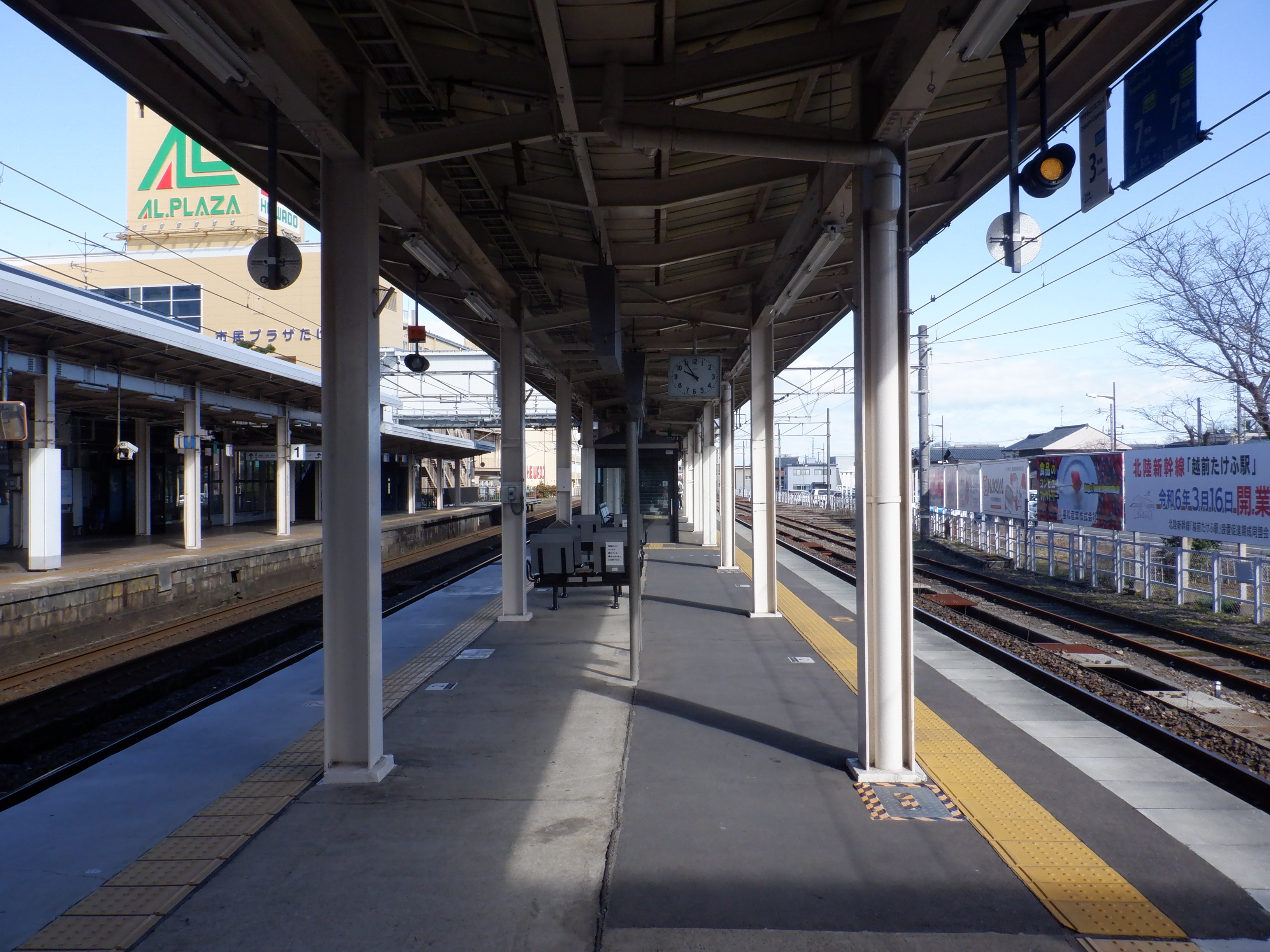 武生駅の2024年2月〜3月の移管前の様子です。駅名標等が他の駅同様、ハピラインふくいの駅名標の上に仮のJR駅名標が貼られるなどの様子が見られました。