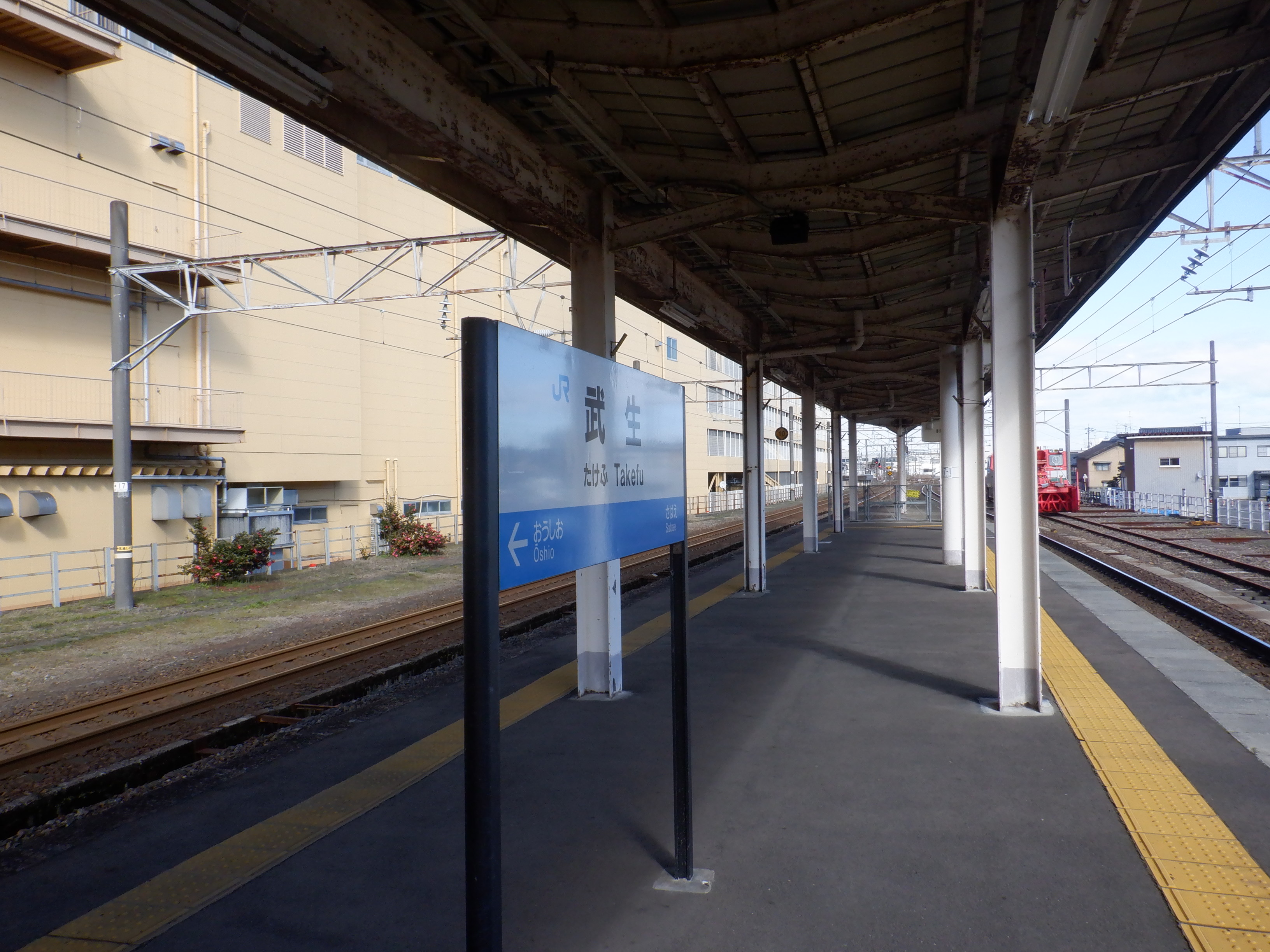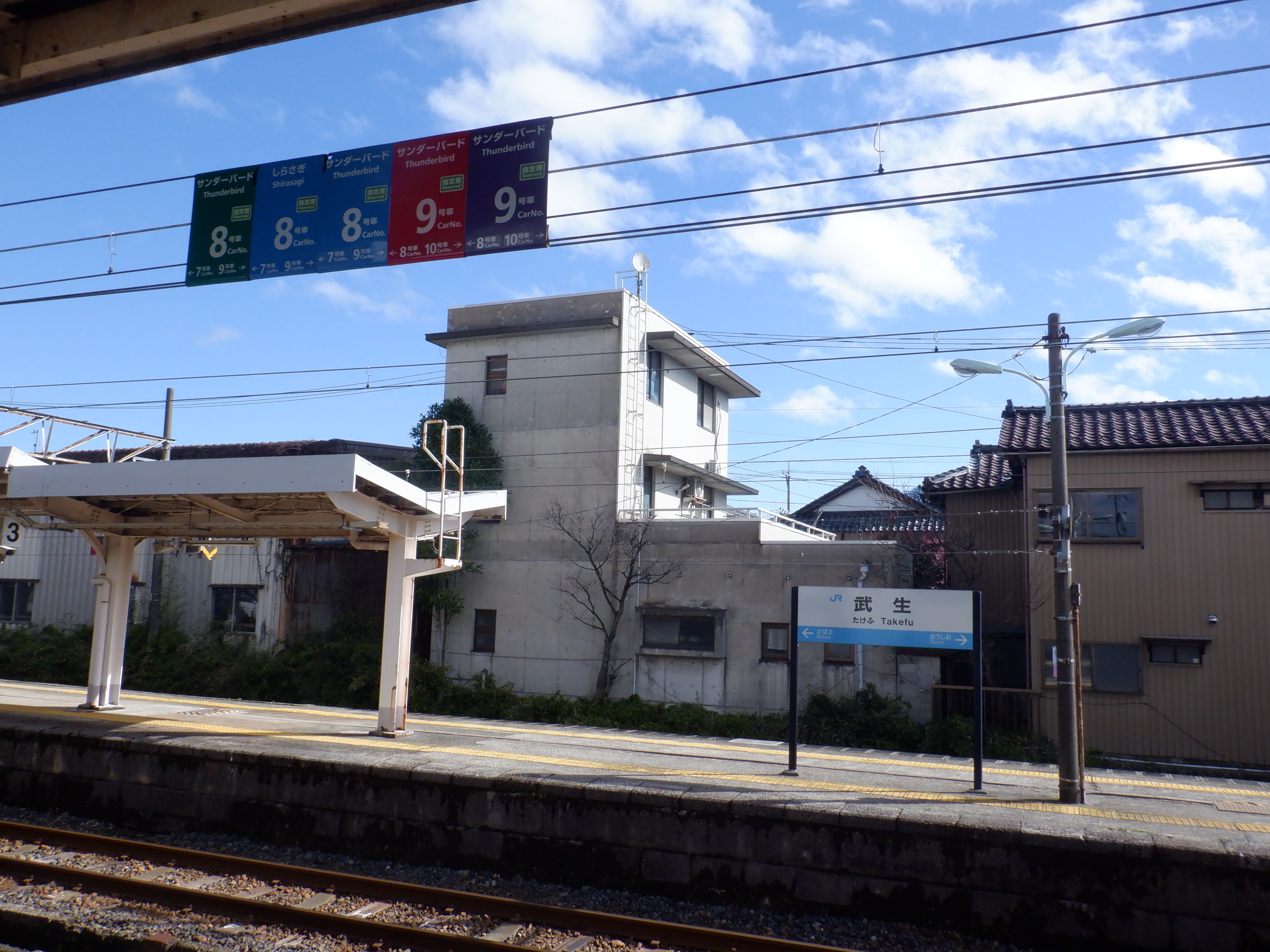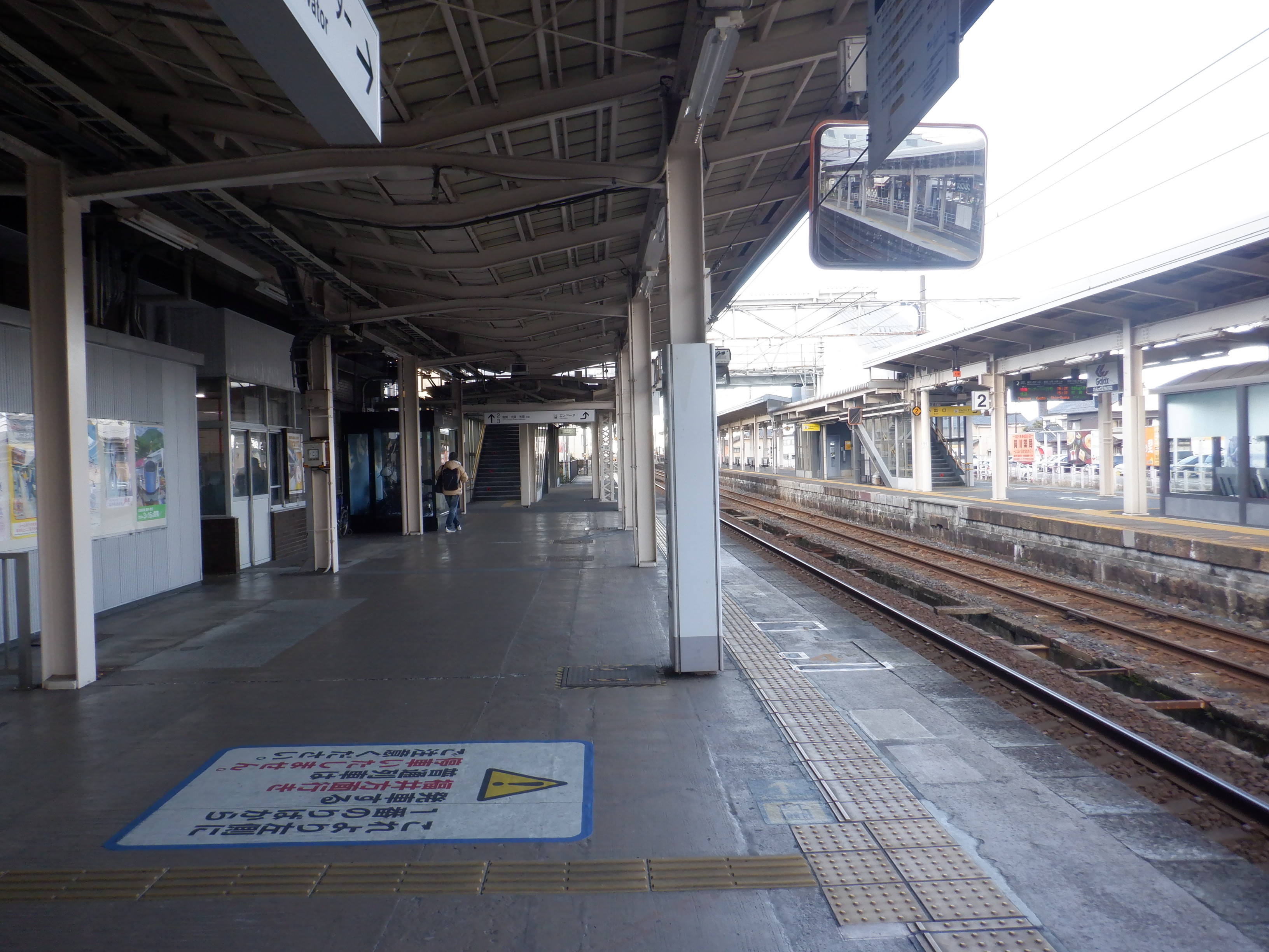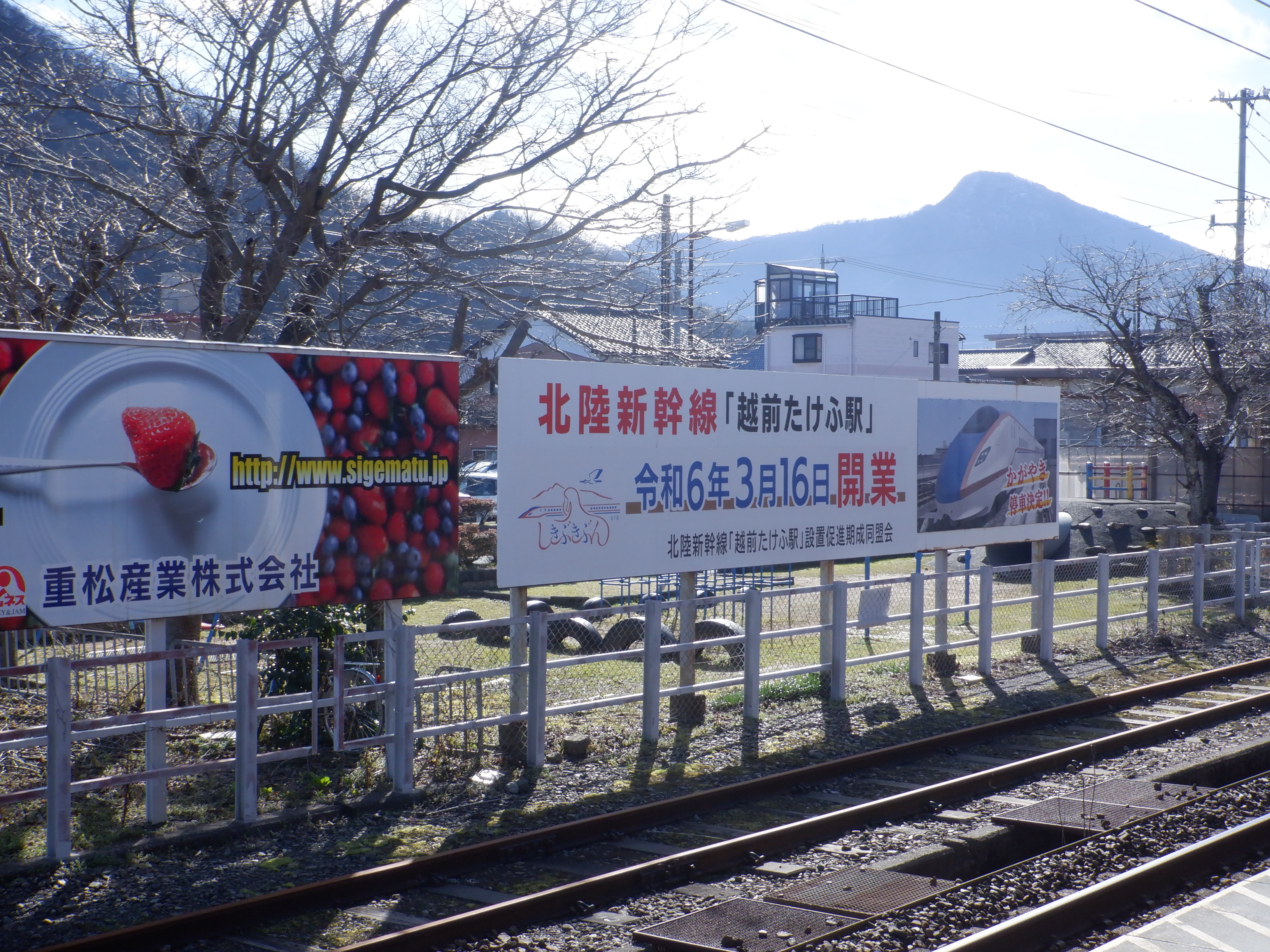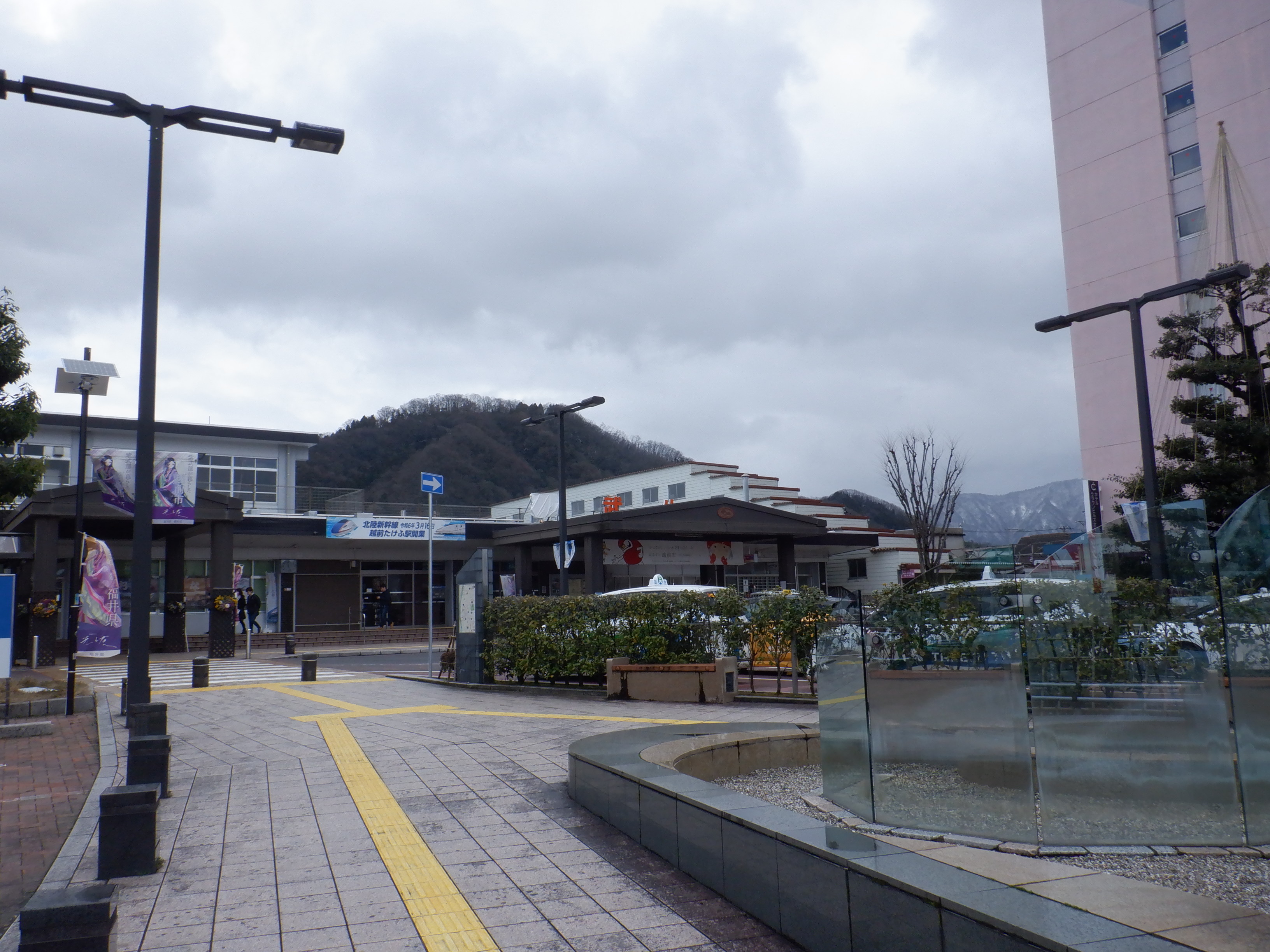 武生駅の2024年2月〜3月の移管前の様子です。駅名標等が他の駅同様、ハピラインふくいの駅名標の上に仮のJR駅名標が貼られるなどの様子が見られました。
