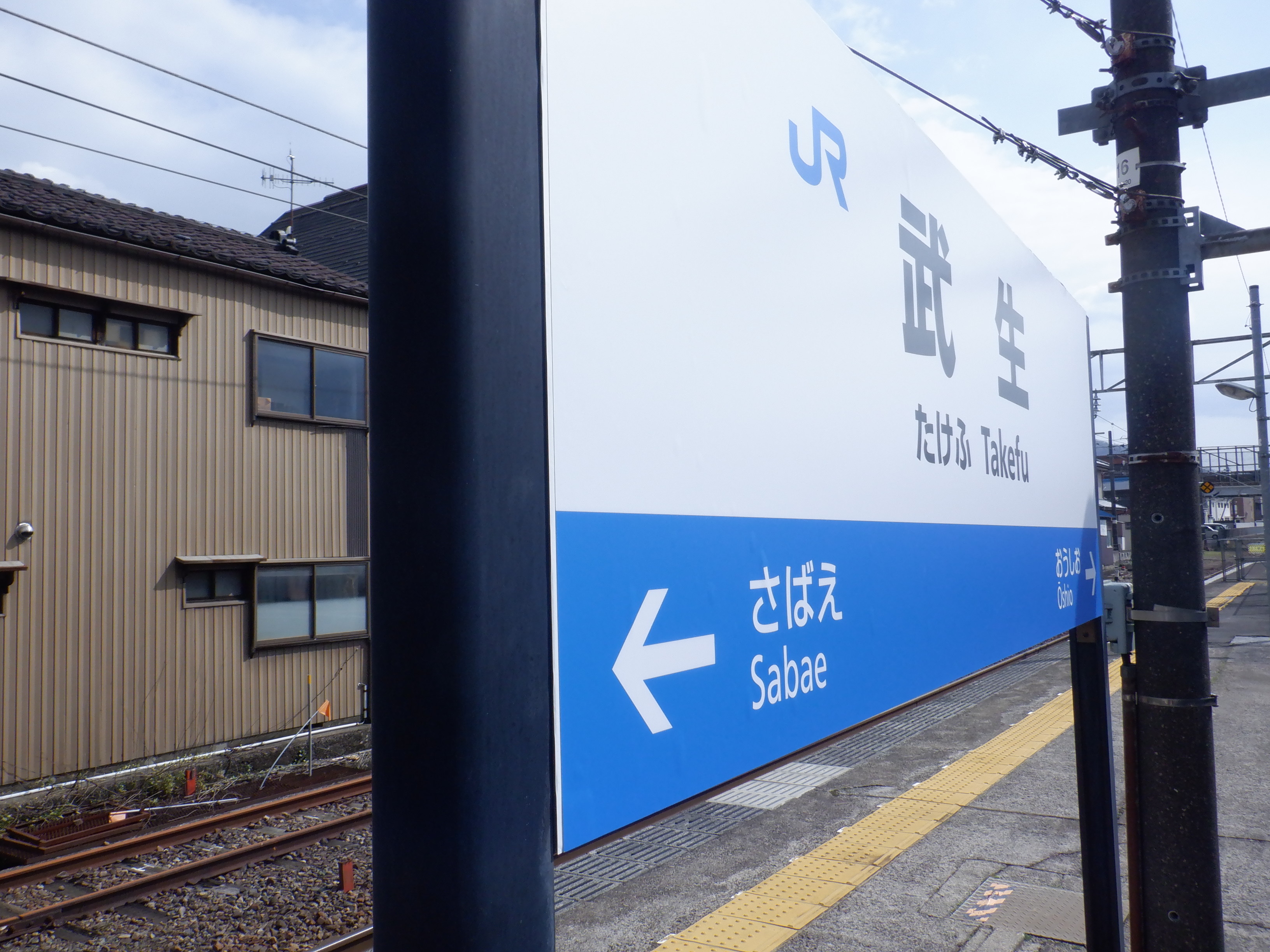 2・3番のりば鯖江駅側の駅名標。白い板の上に仮のJR駅名標が貼られた状態です。
