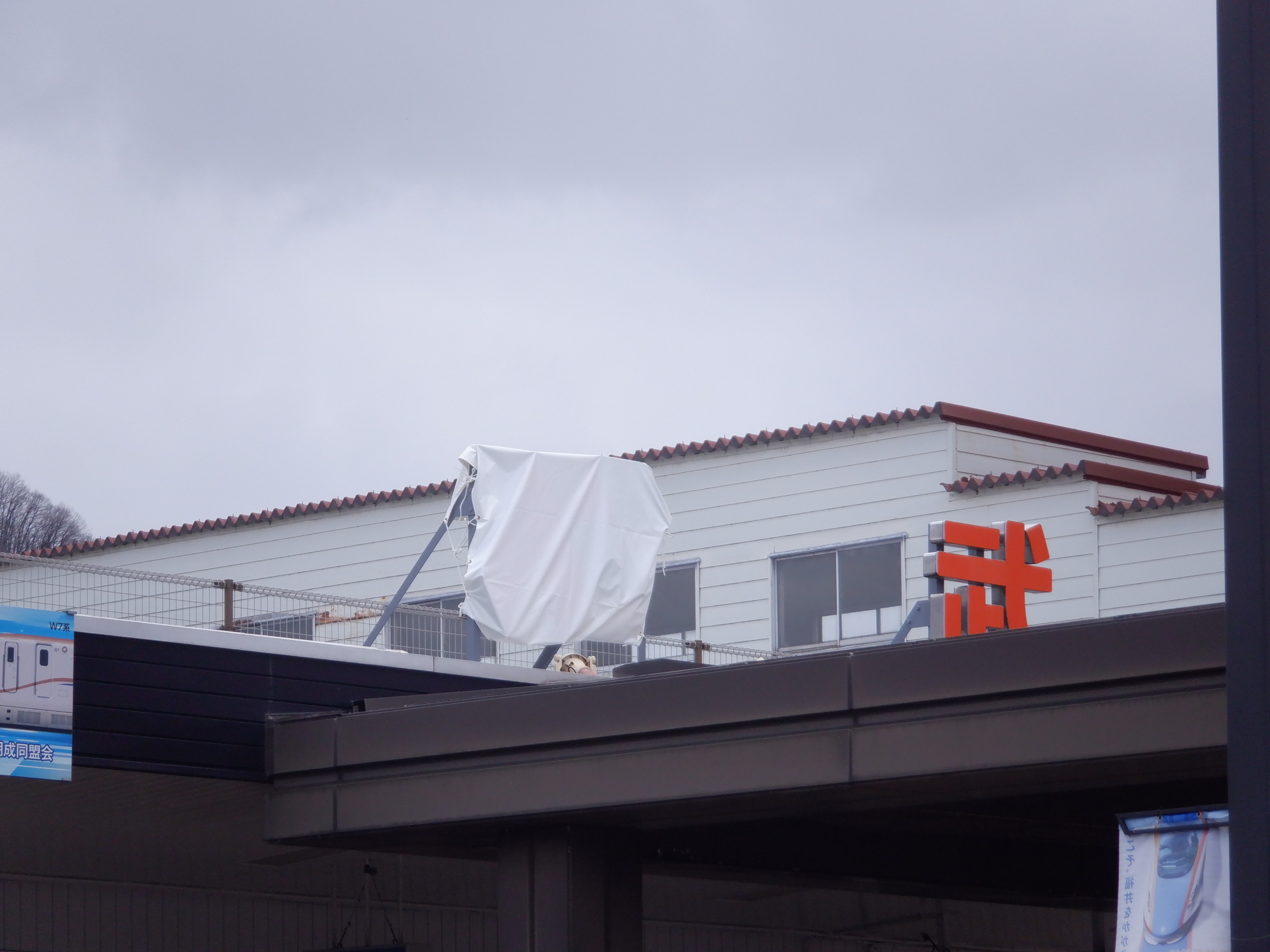 建植式の駅名標も同様に白い板の上に仮のJR駅名標が貼られた状態になっていました。