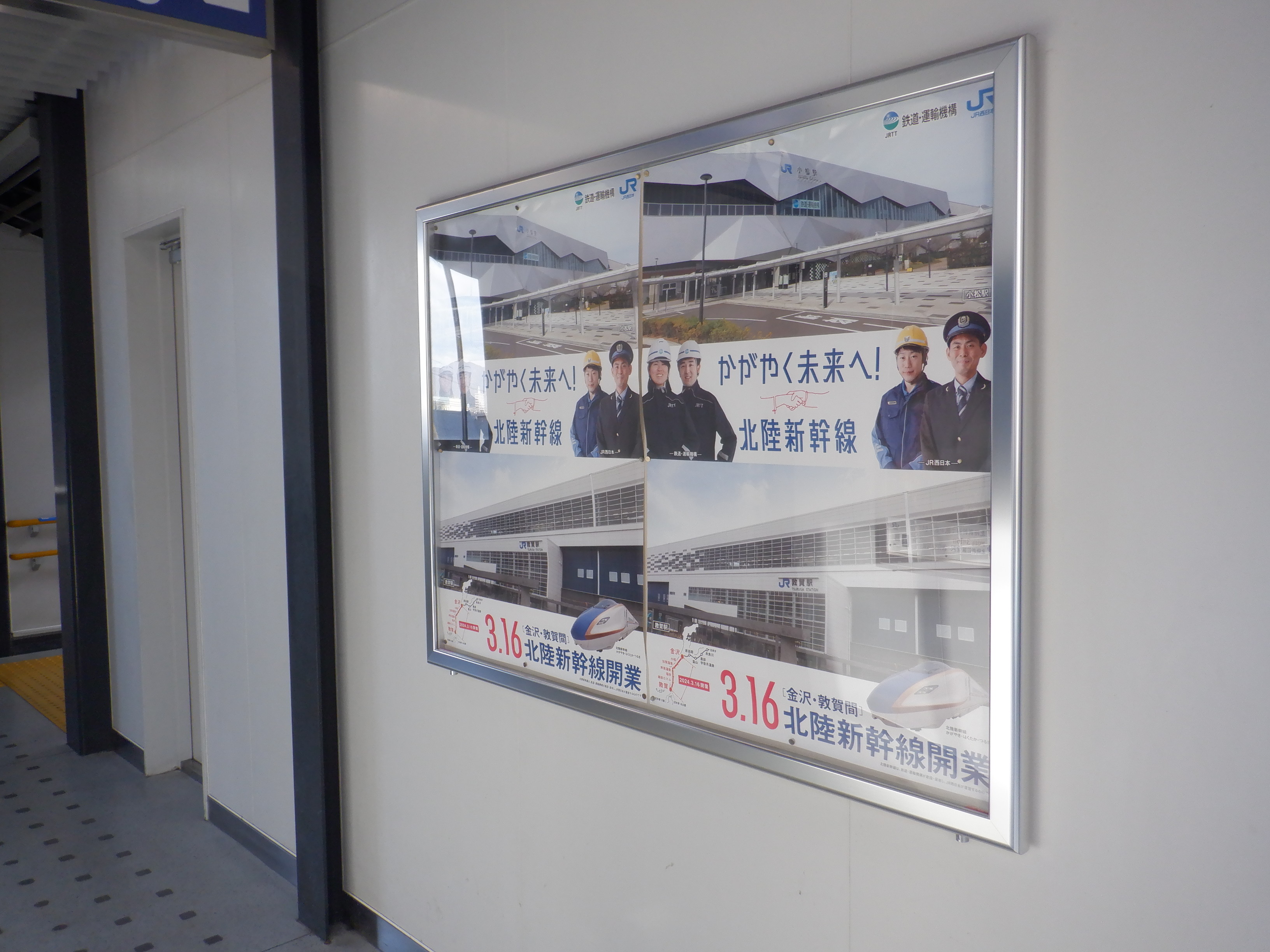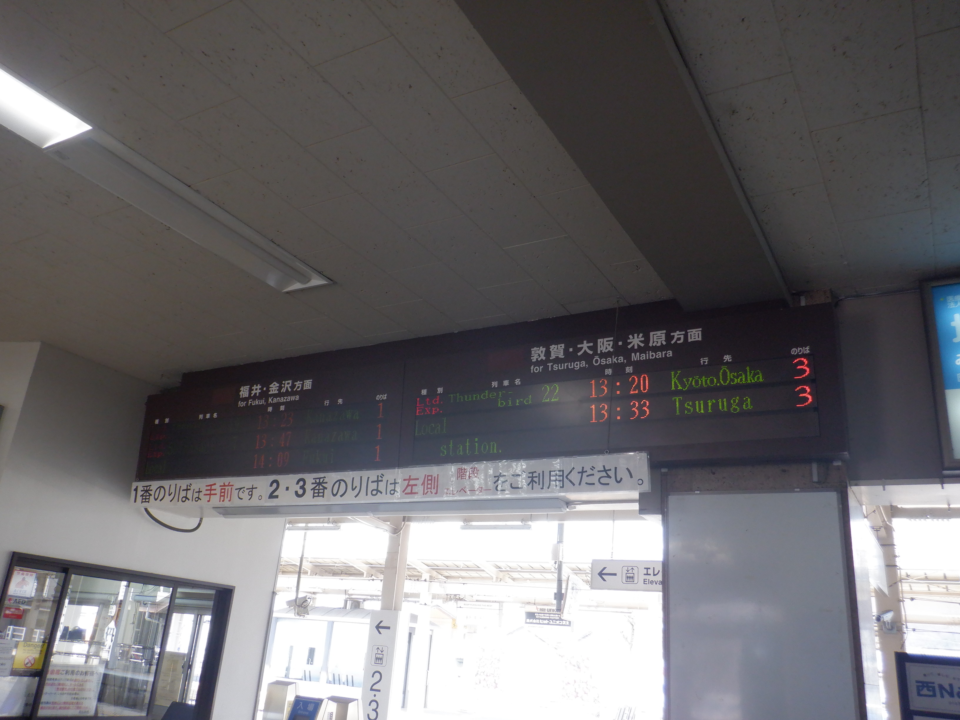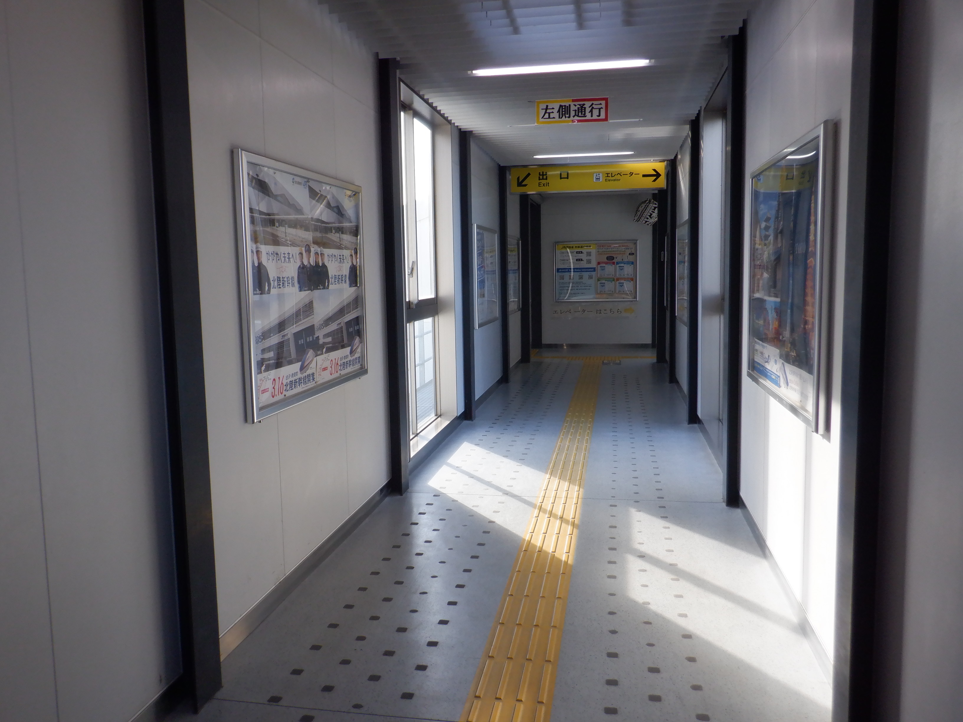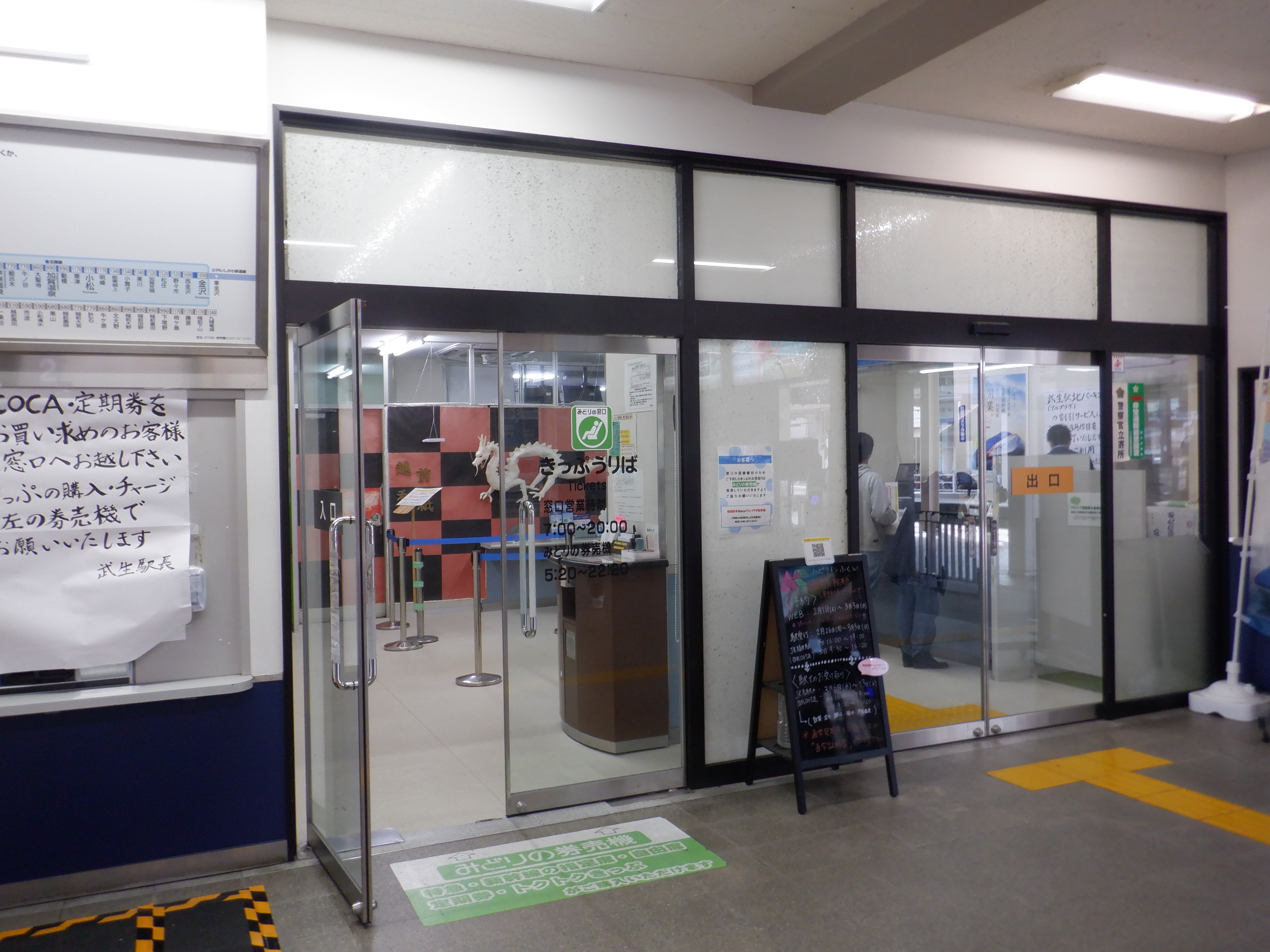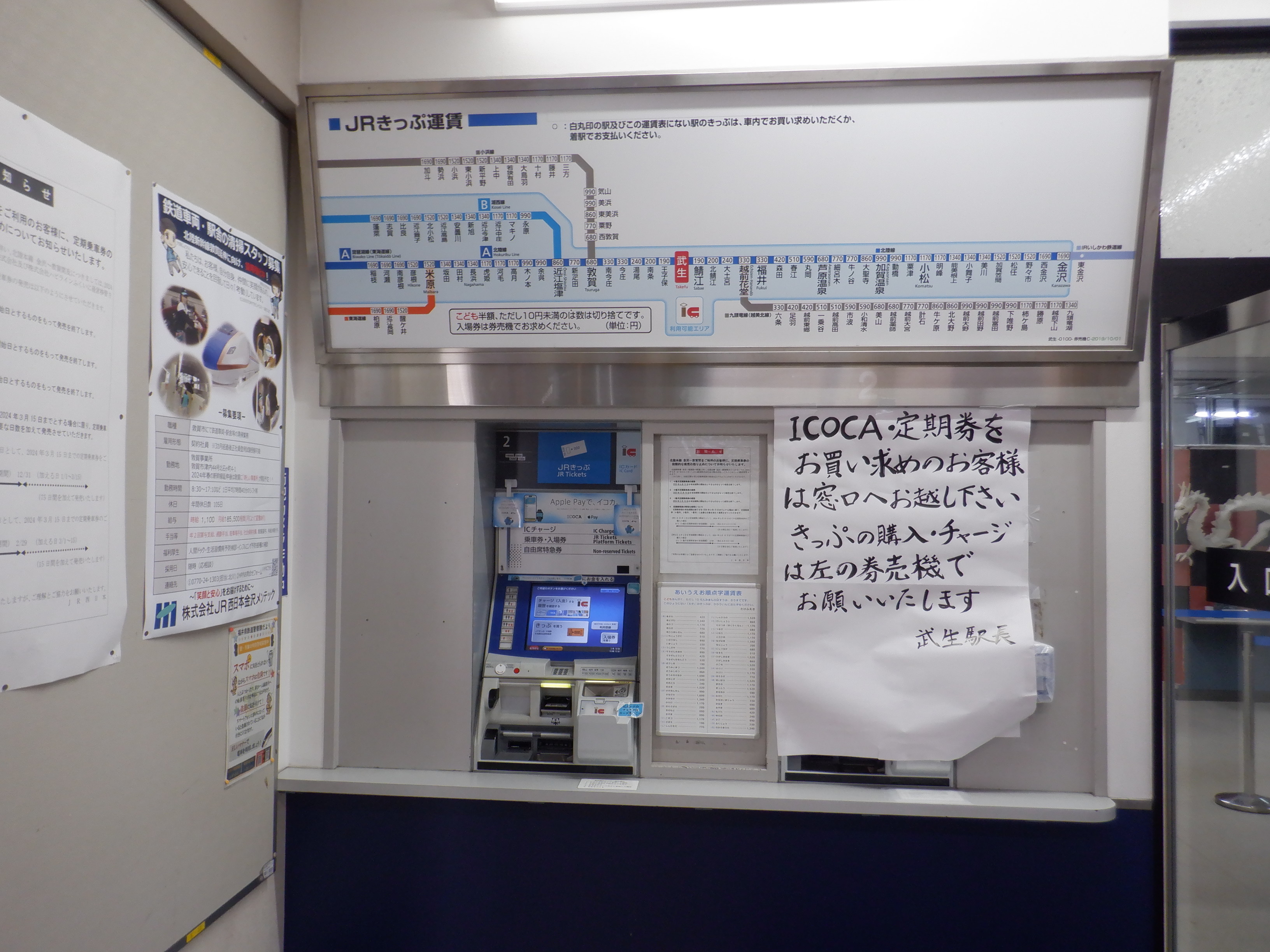 改札口横のハピラインふくいのポスターなど。