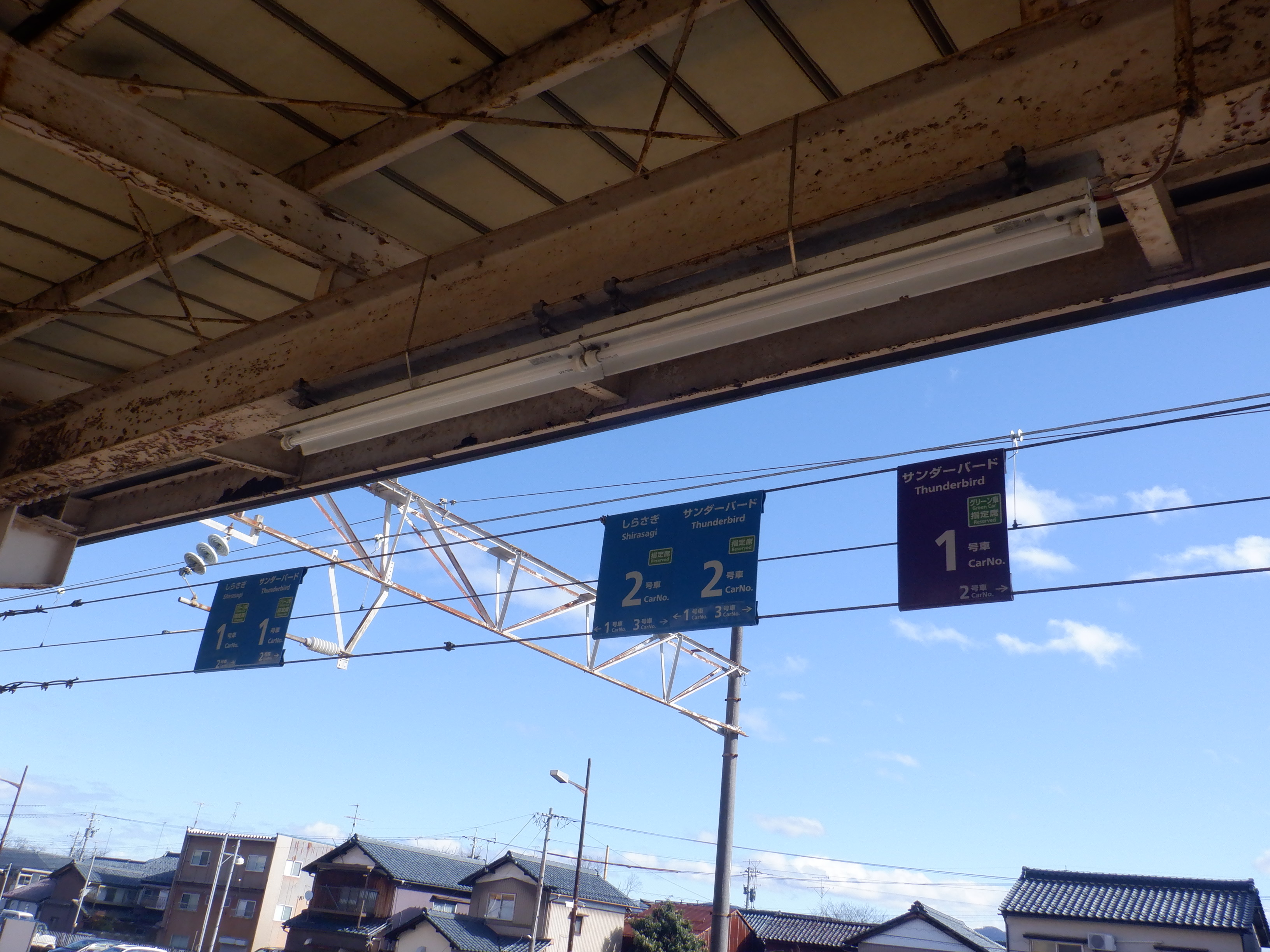 2・3番のりば上屋付近の吊り下げ式駅名標。ハピラインふくいの駅名標の上に仮のJR駅名標が貼られています。