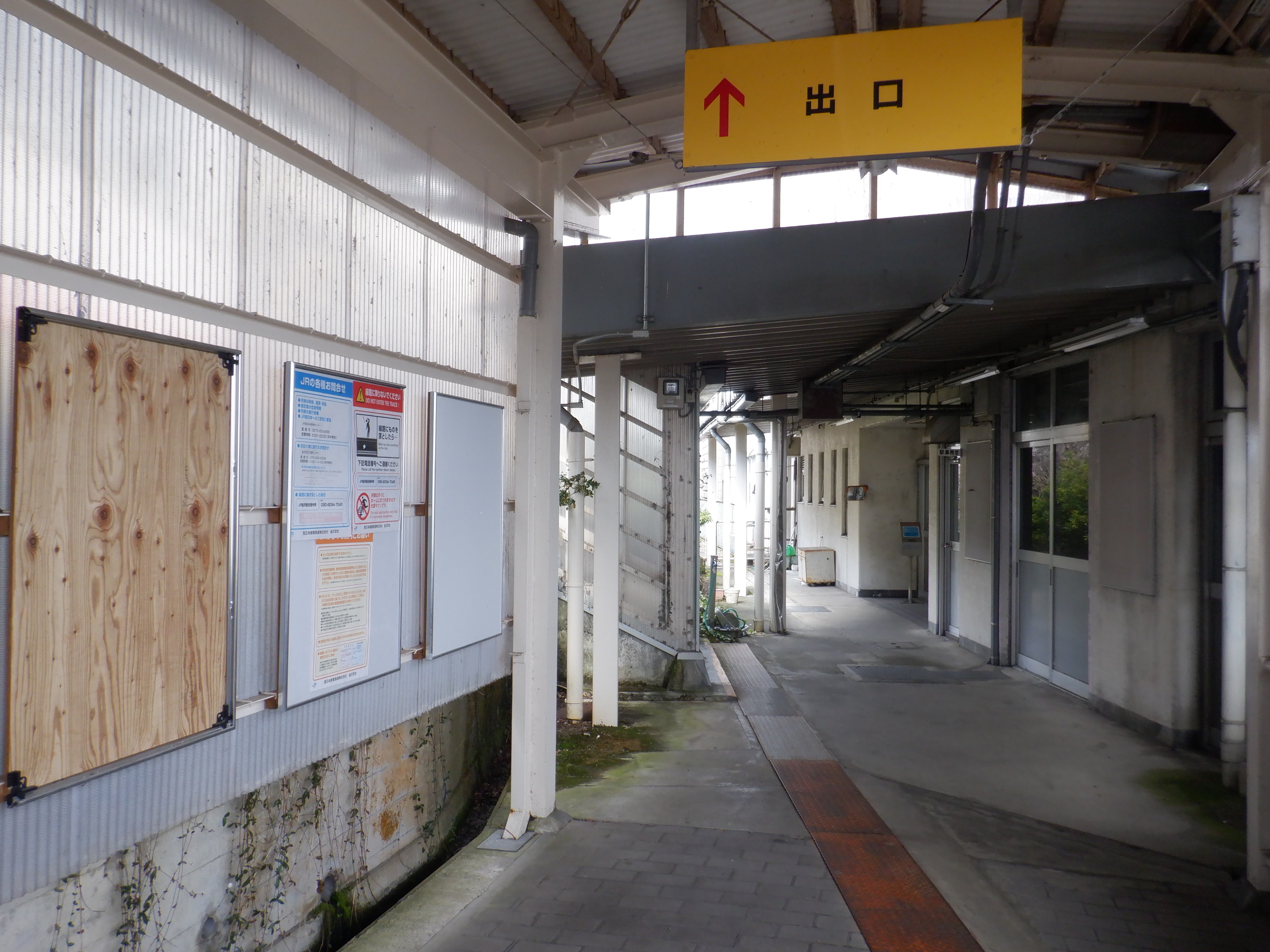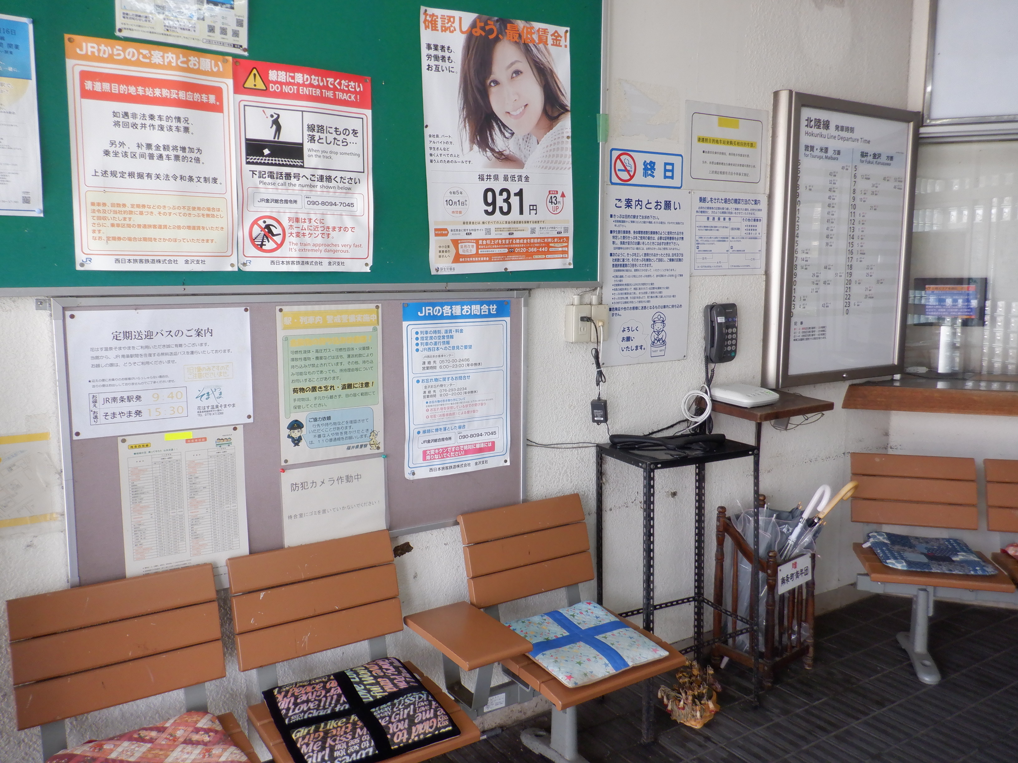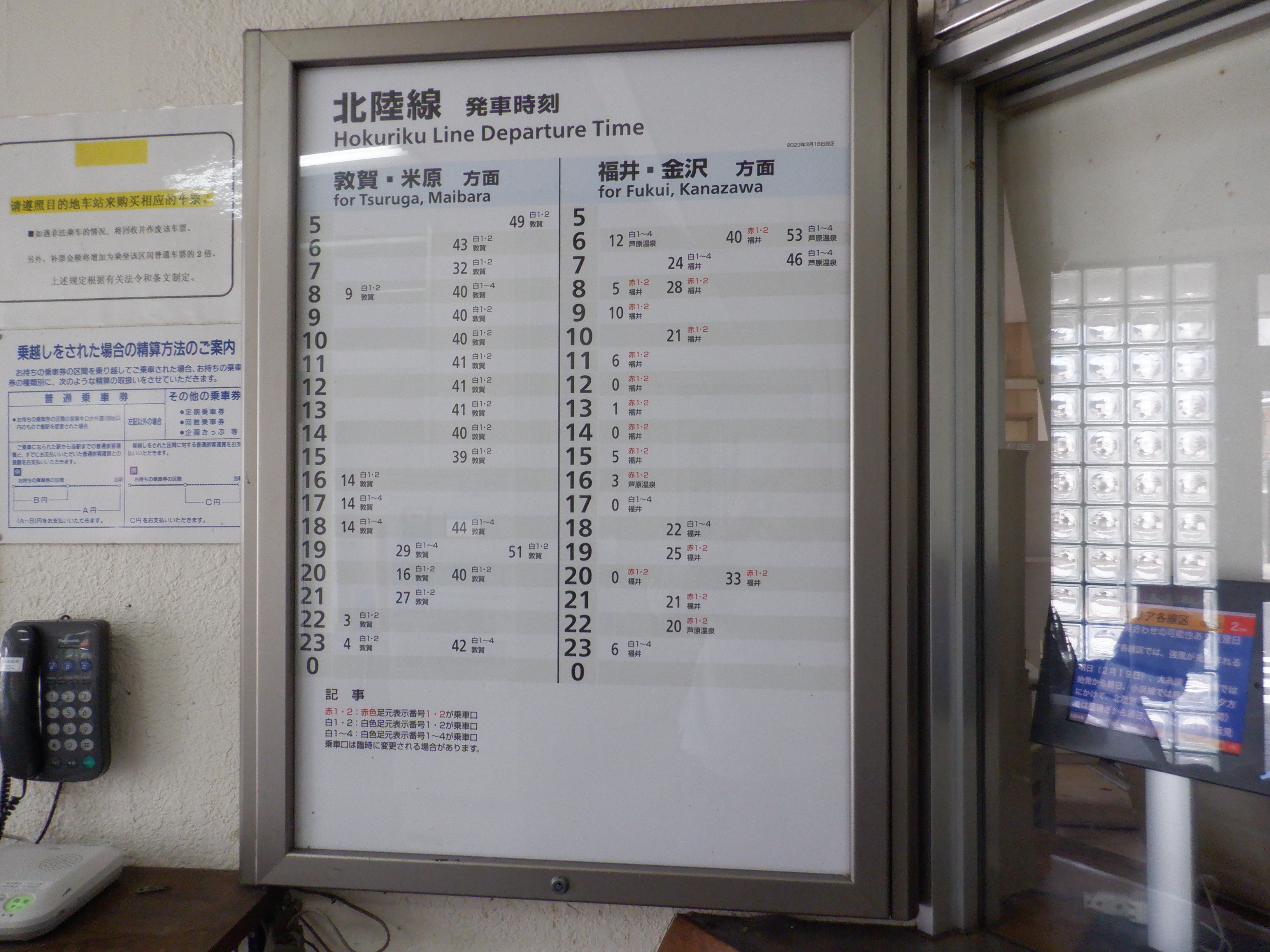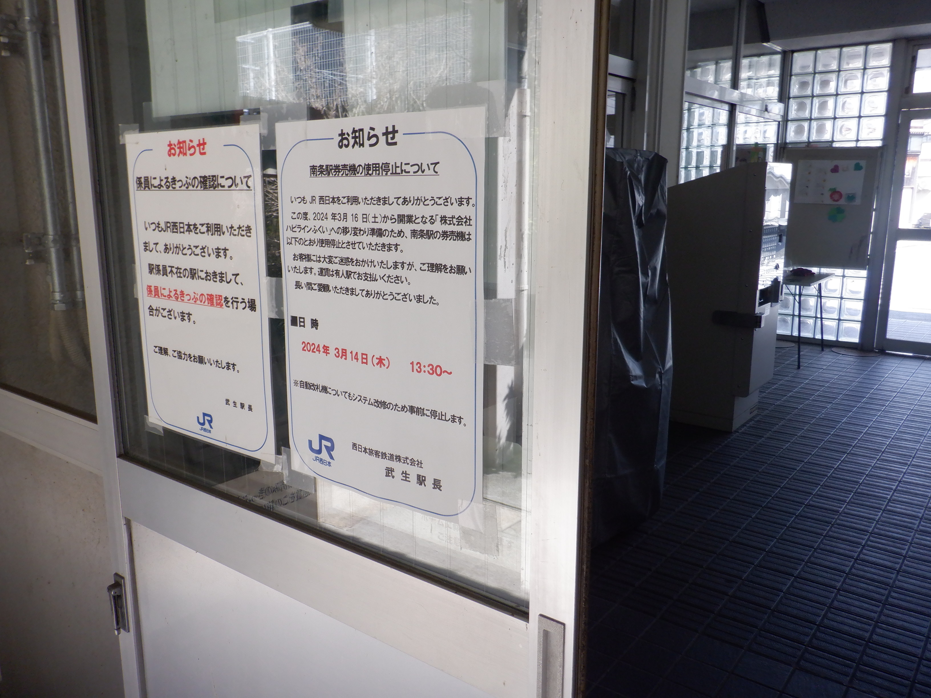 南条駅の2024年移管前2回分の様子です。移管後に使用される券売機が設置され、また、ハピラインふくいの駅名標の上に仮のJR駅名標が貼られた状態となりました。