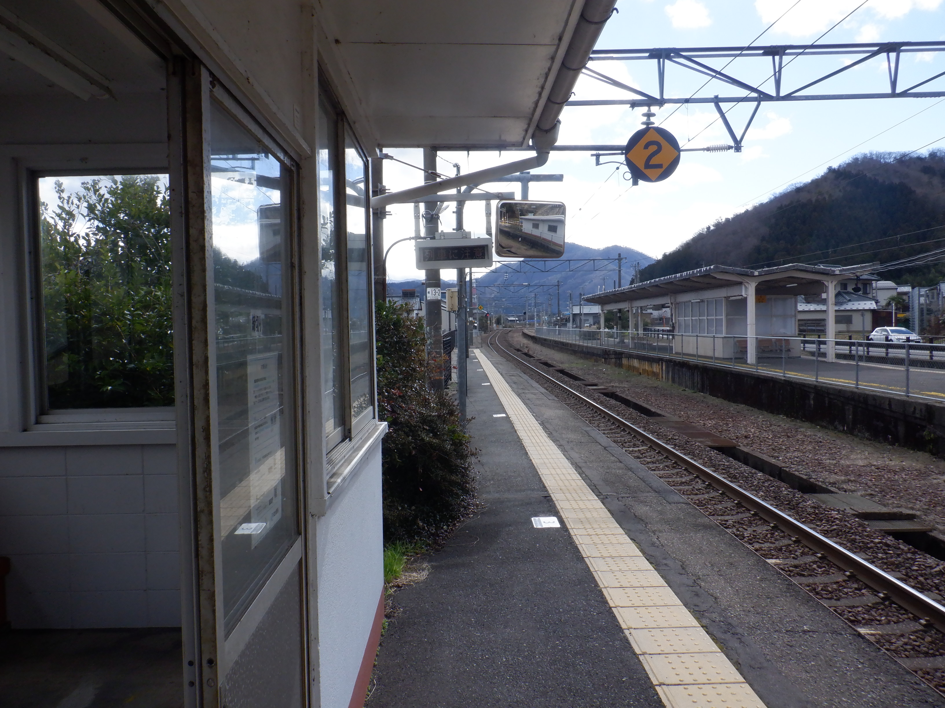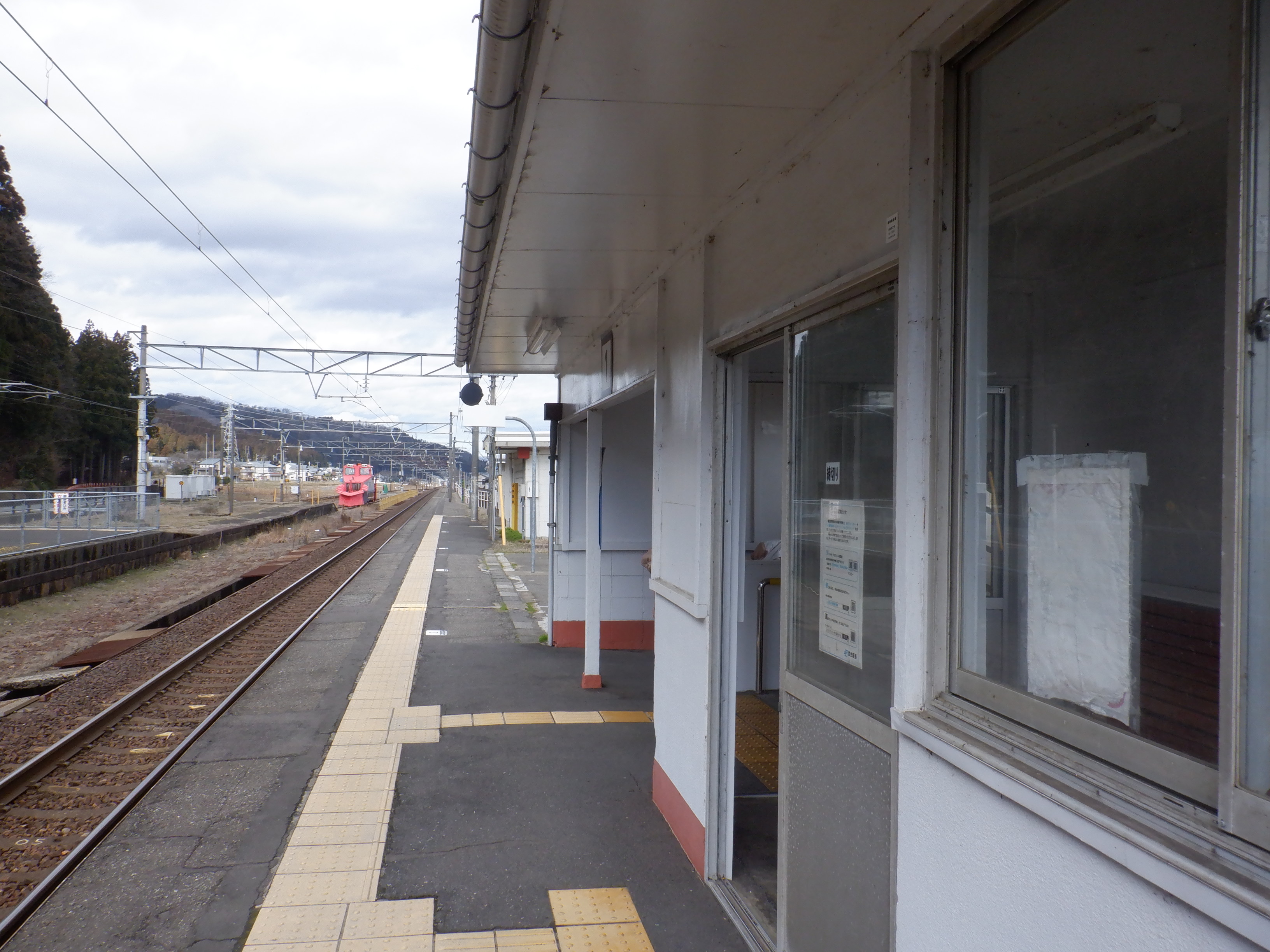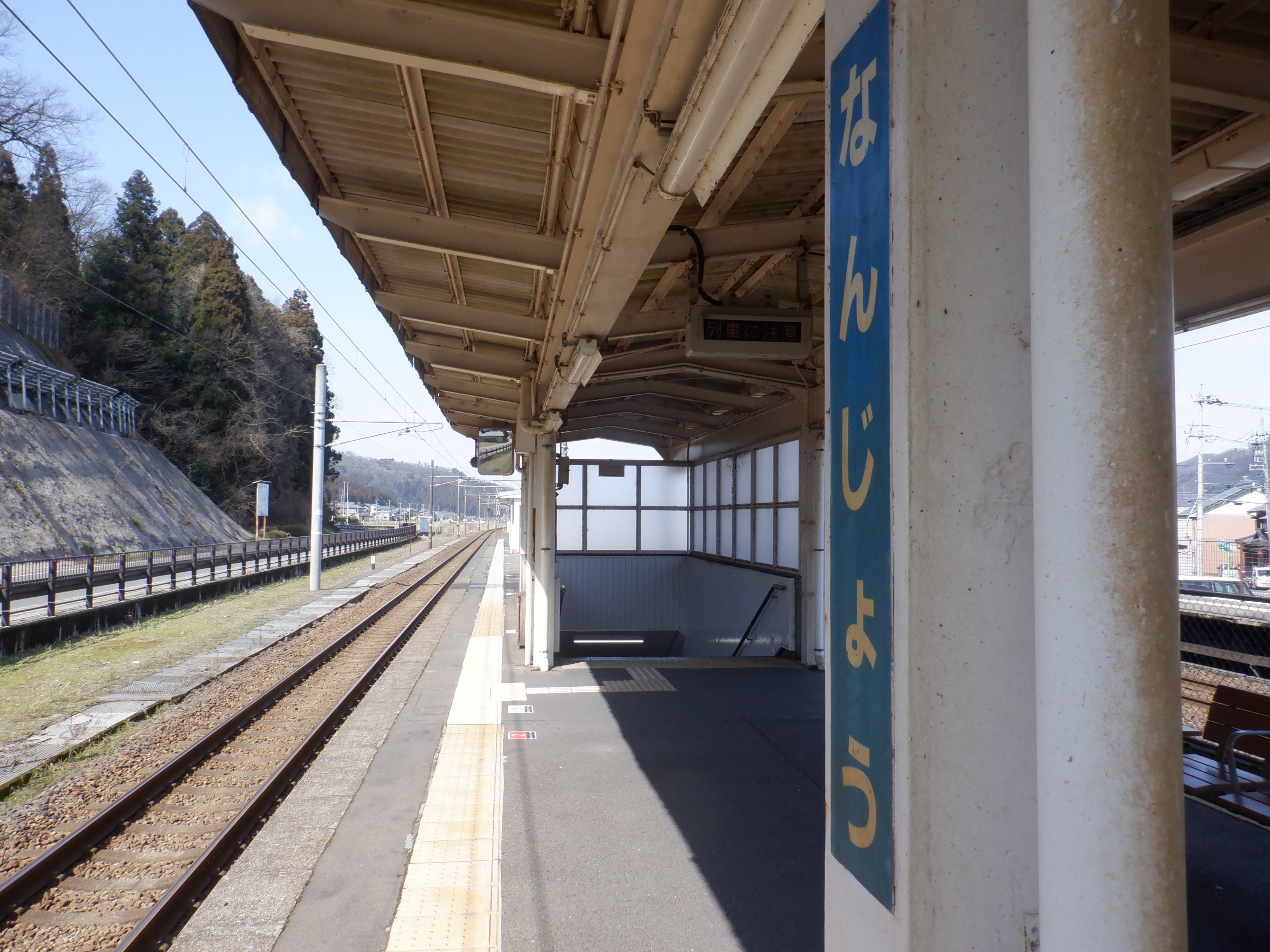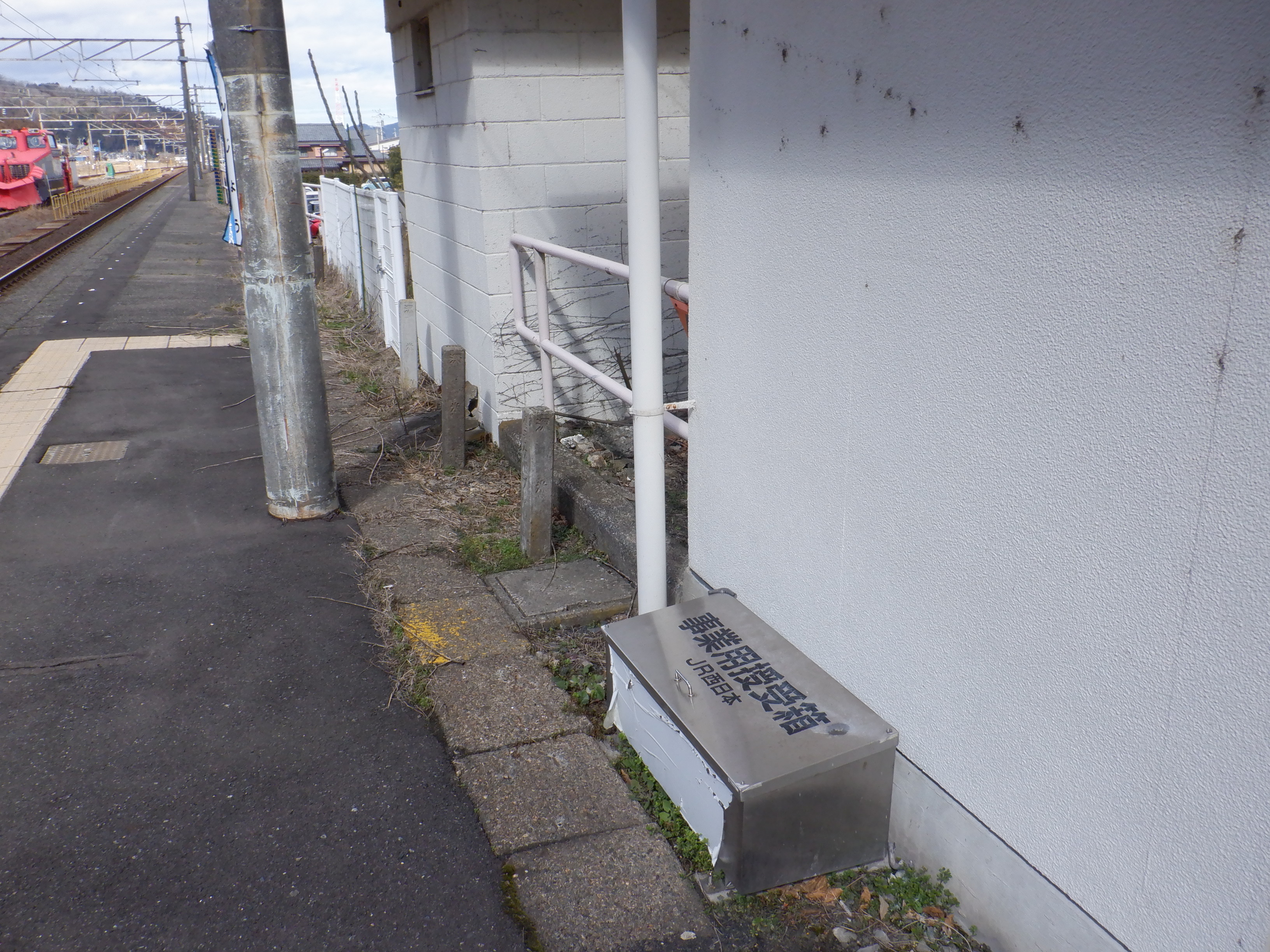 南条駅の2024年移管前2回分の様子です。移管後に使用される券売機が設置され、また、ハピラインふくいの駅名標の上に仮のJR駅名標が貼られた状態となりました。