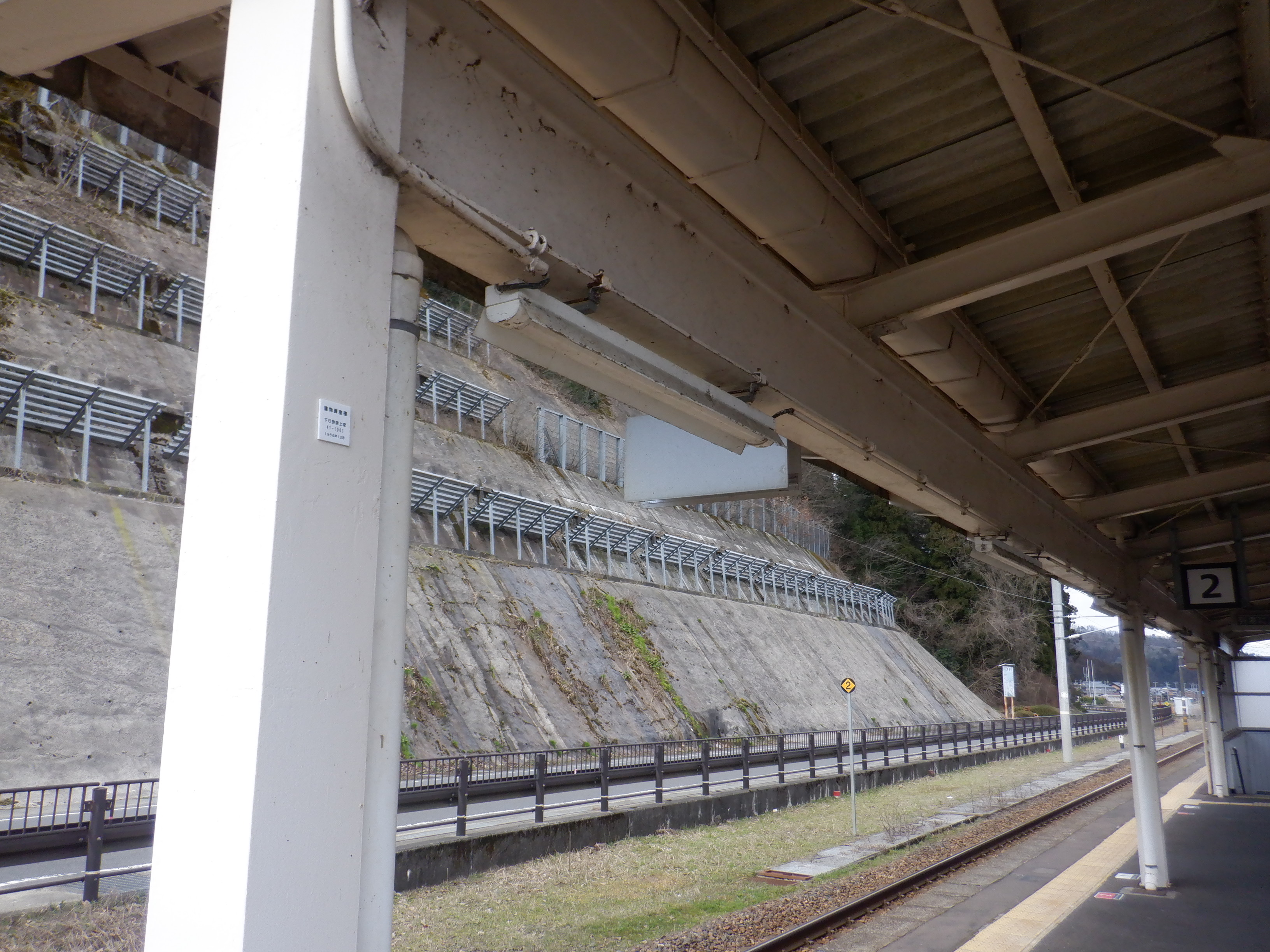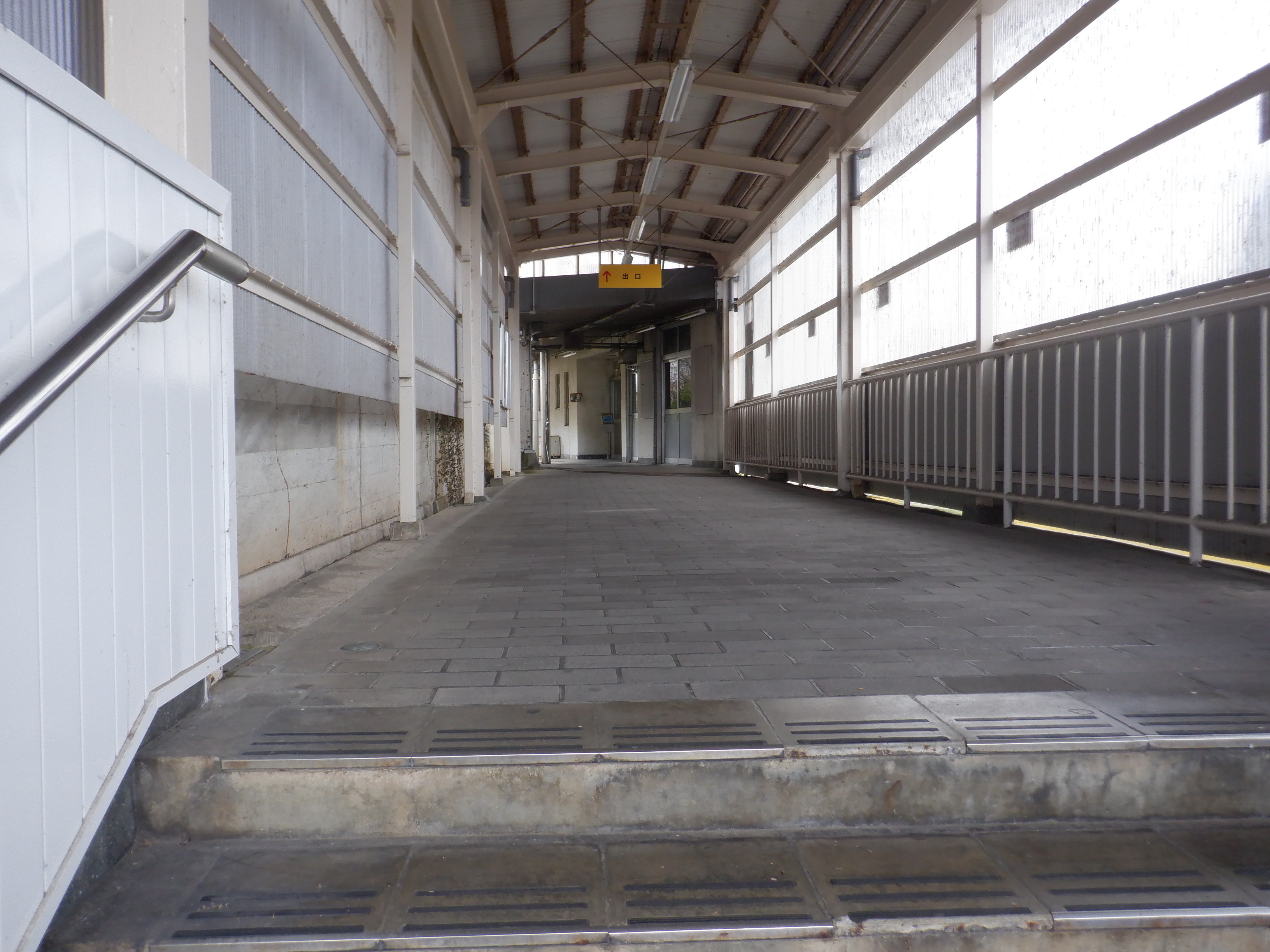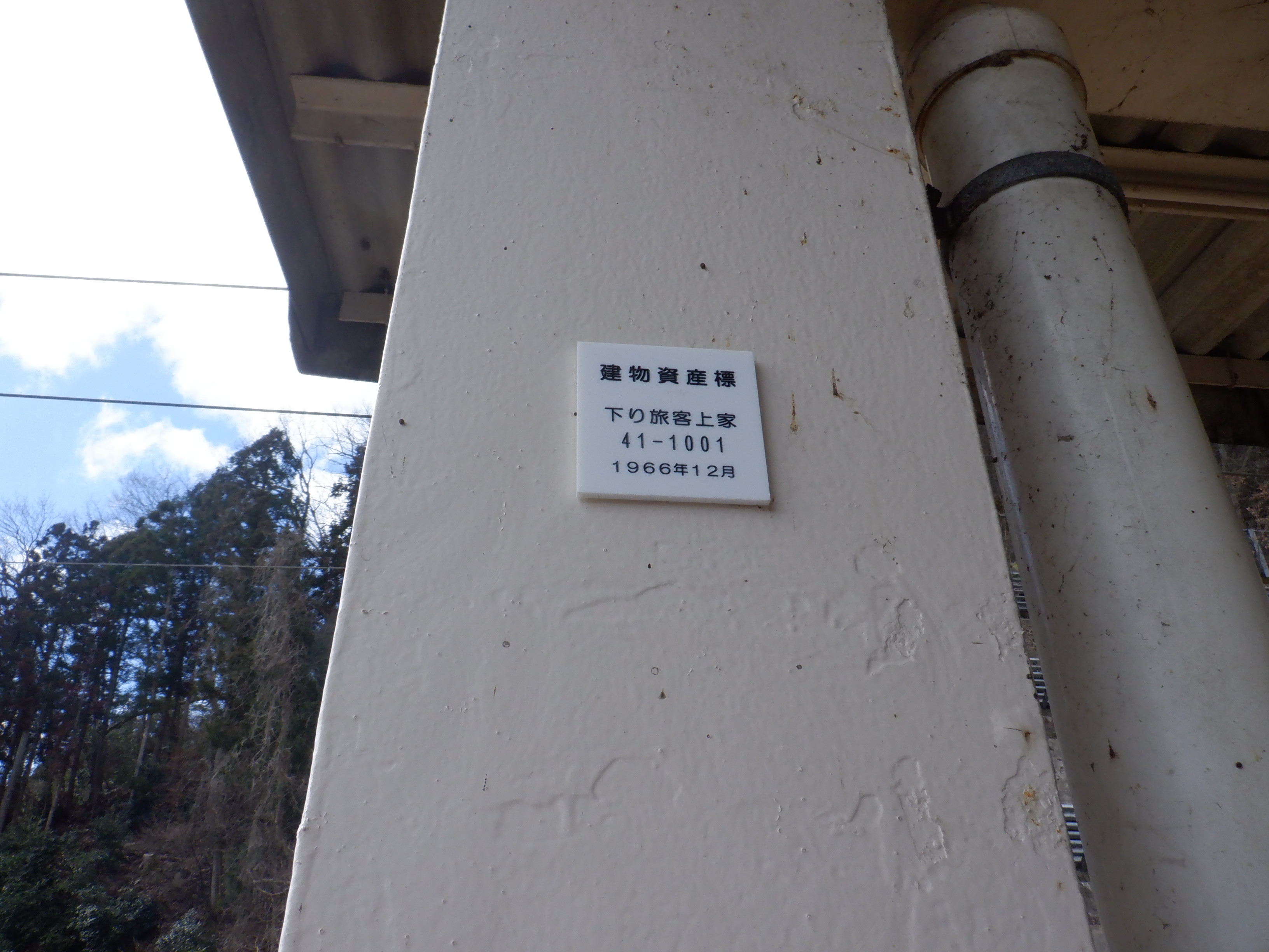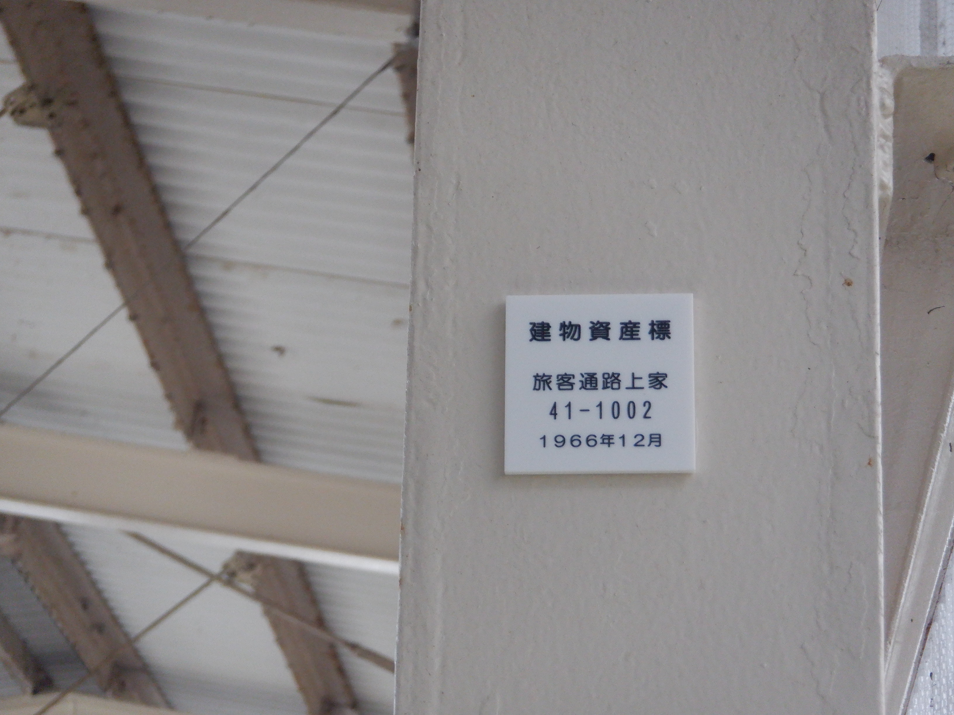 再び駅に入り、階段の横、通路上屋の資産標とそこにある温度計。