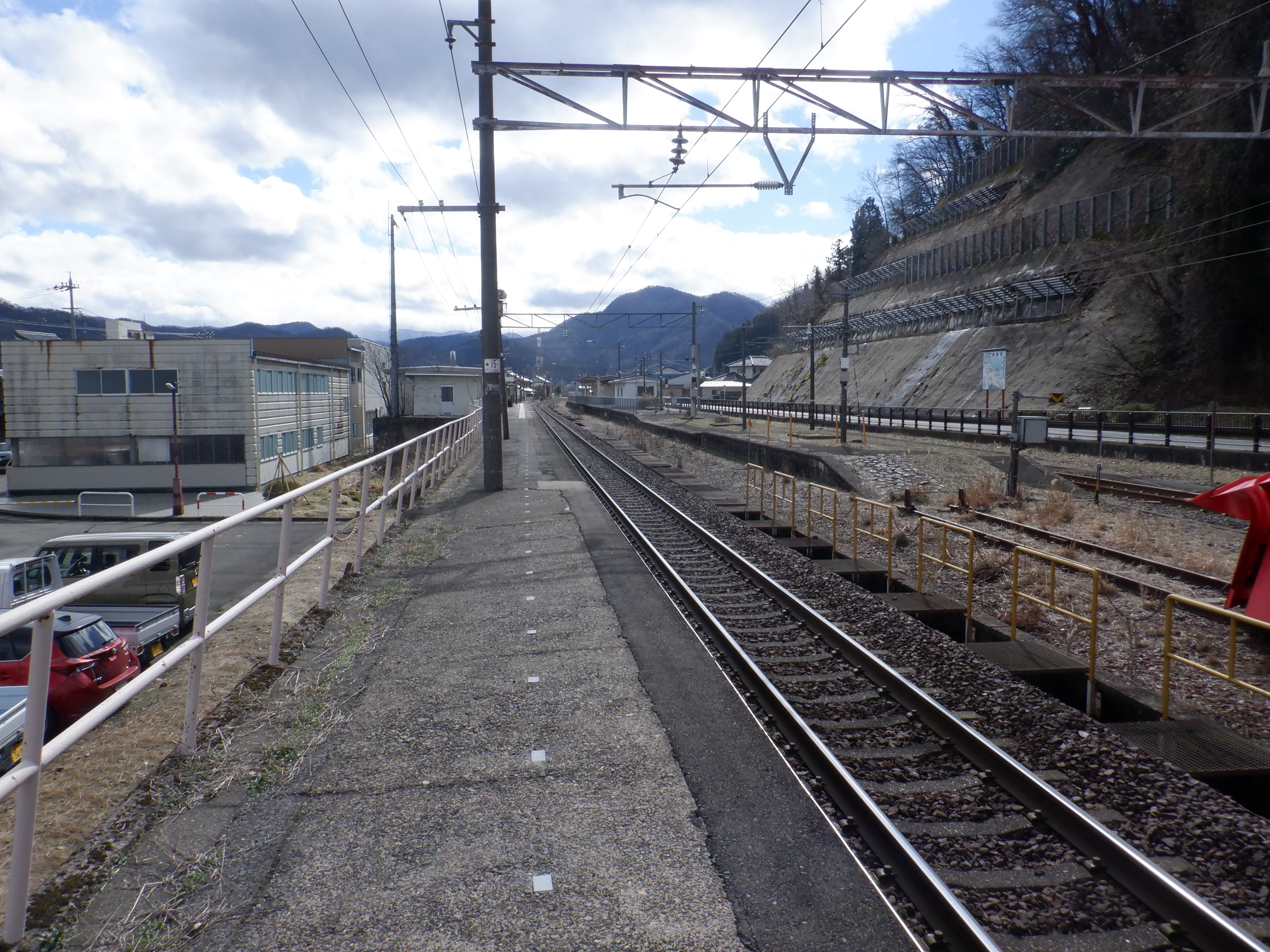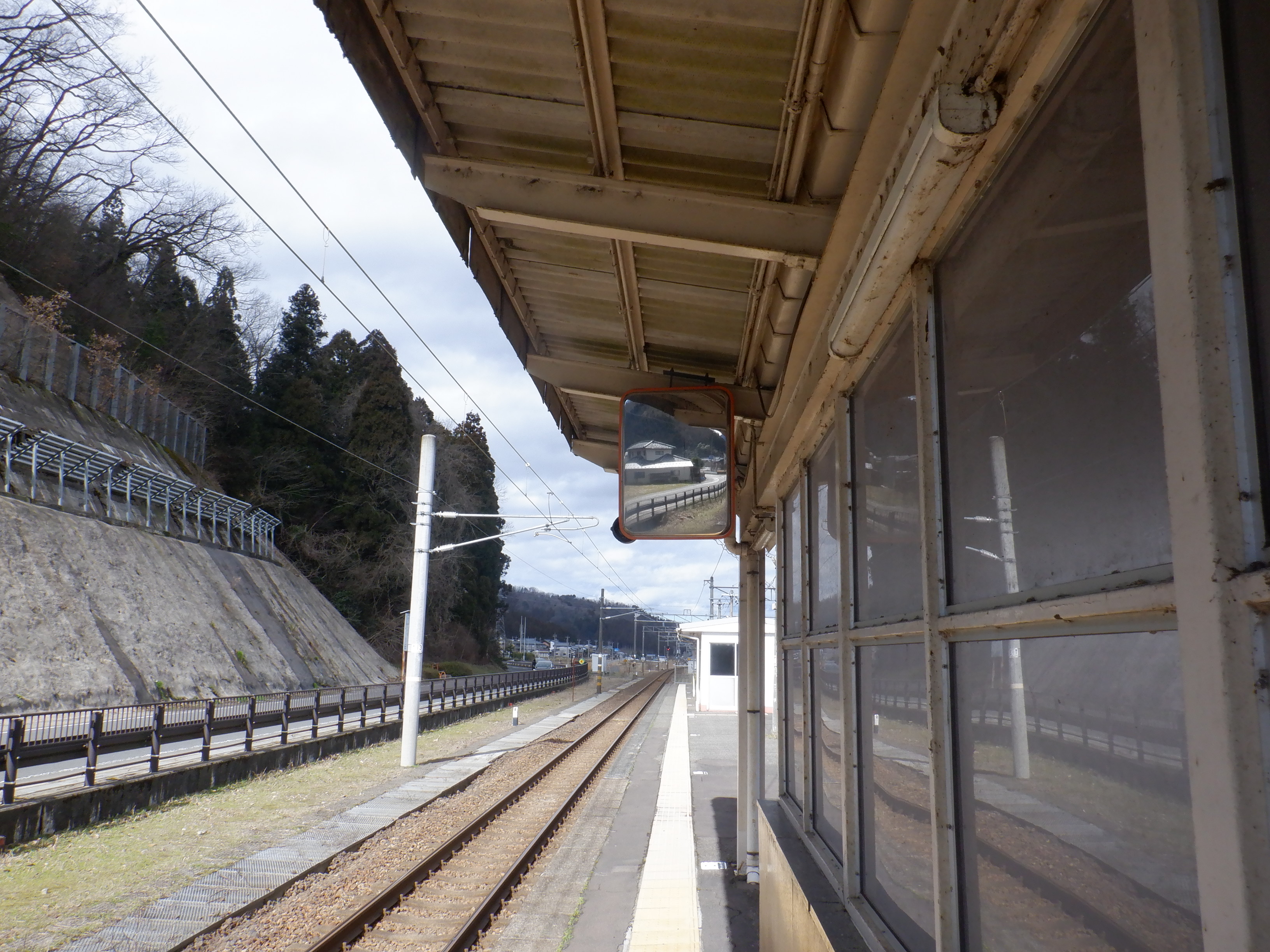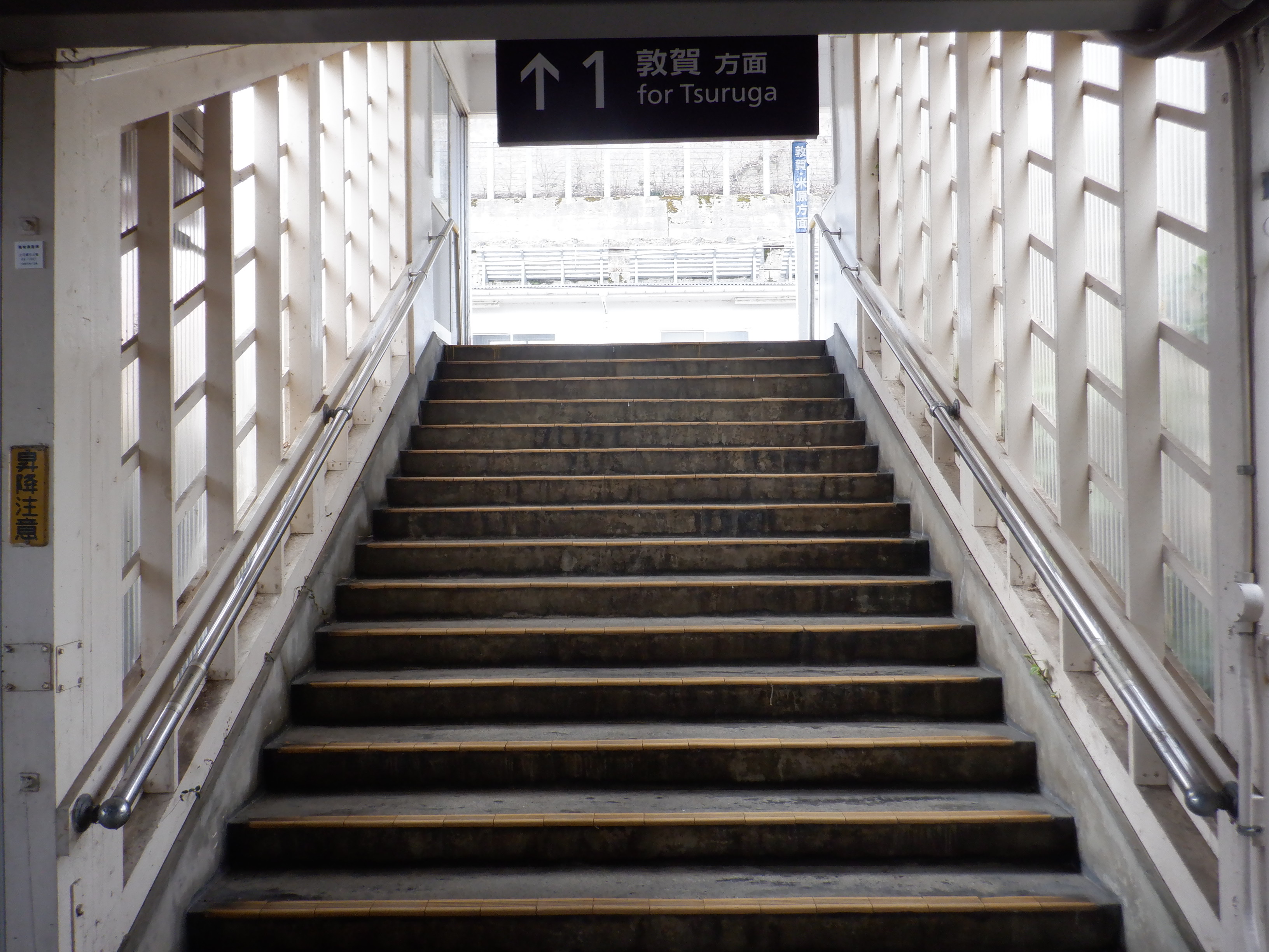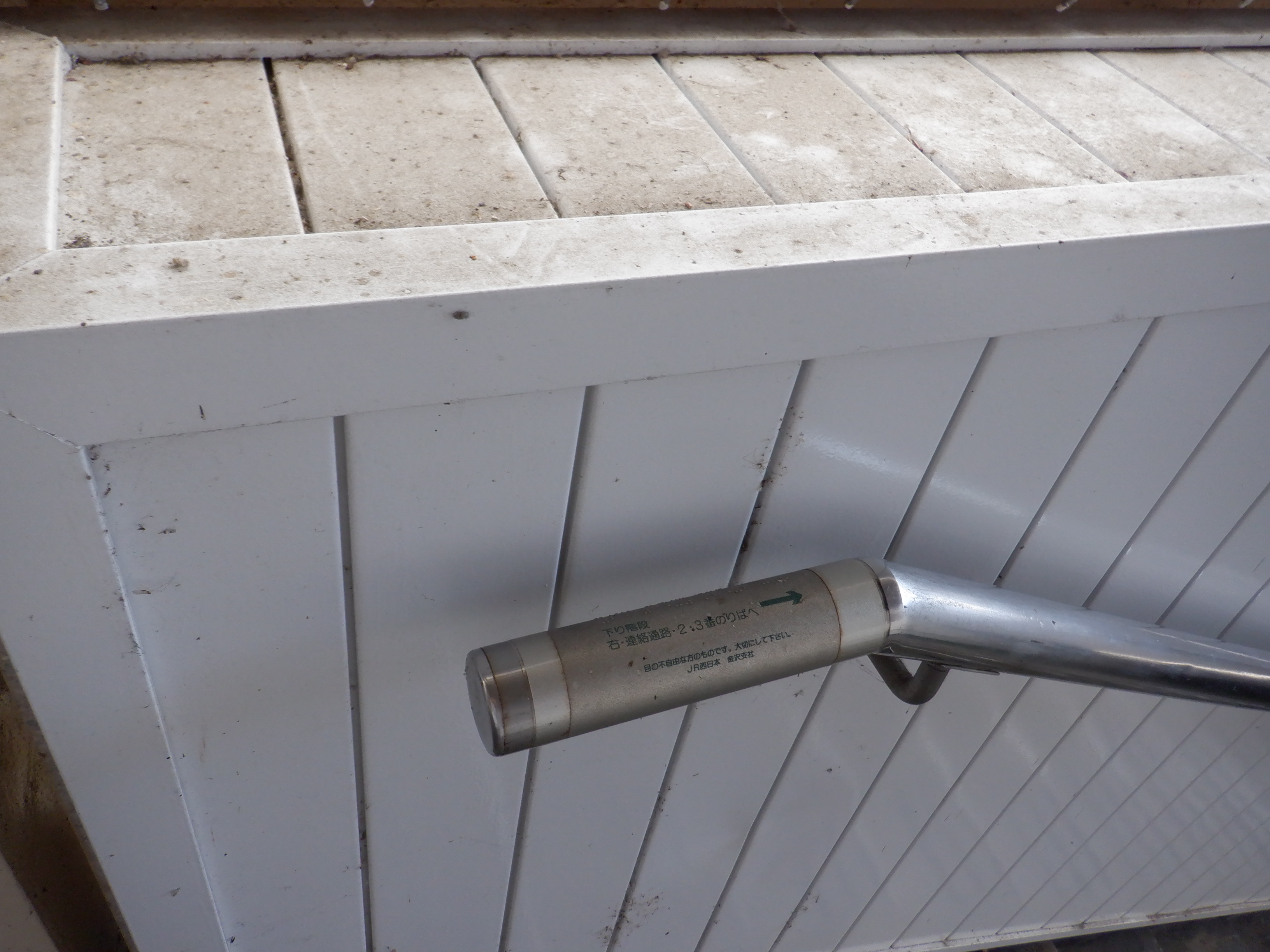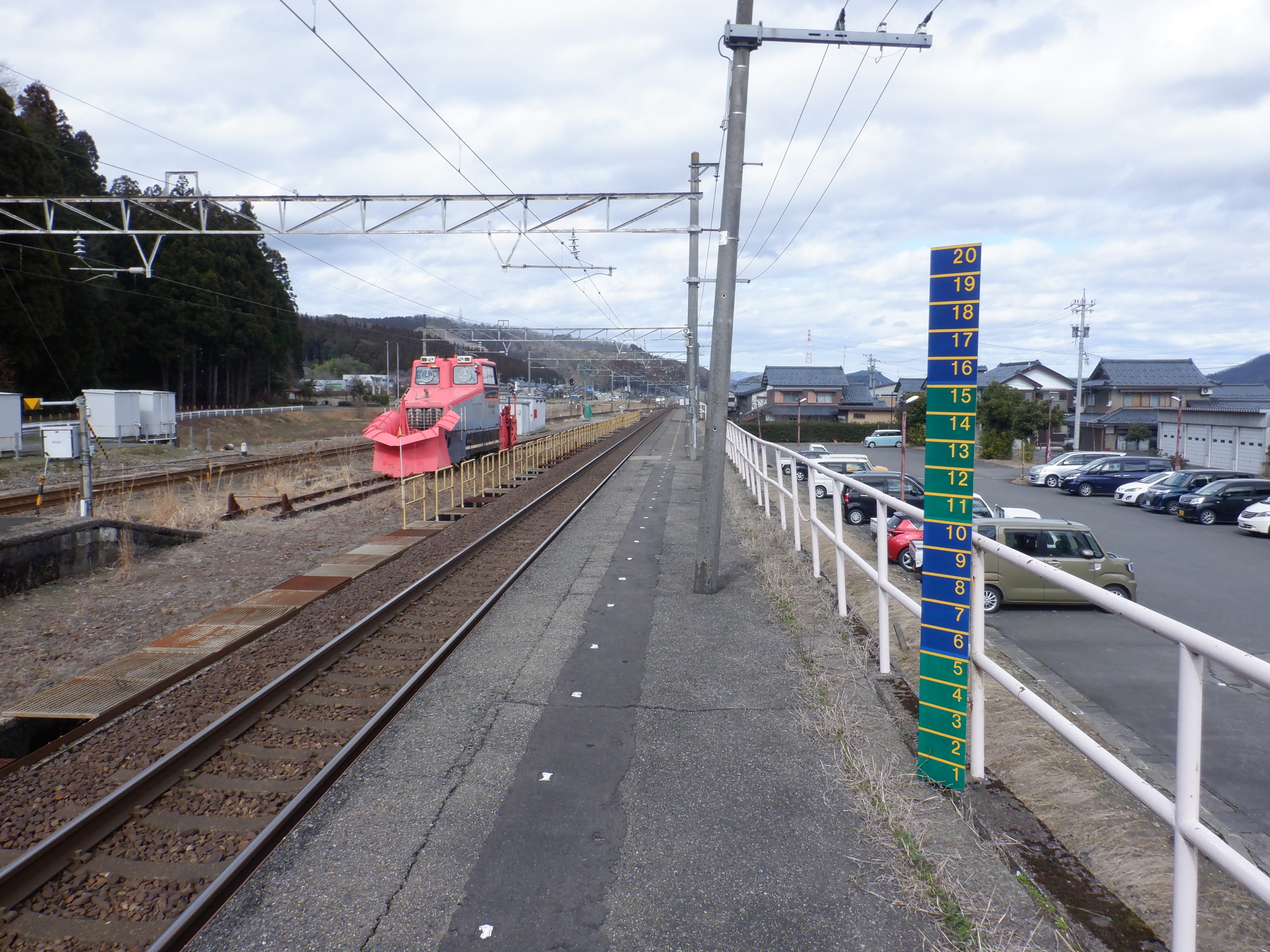 再び駅に入り、階段の横、通路上屋の資産標とそこにある温度計。