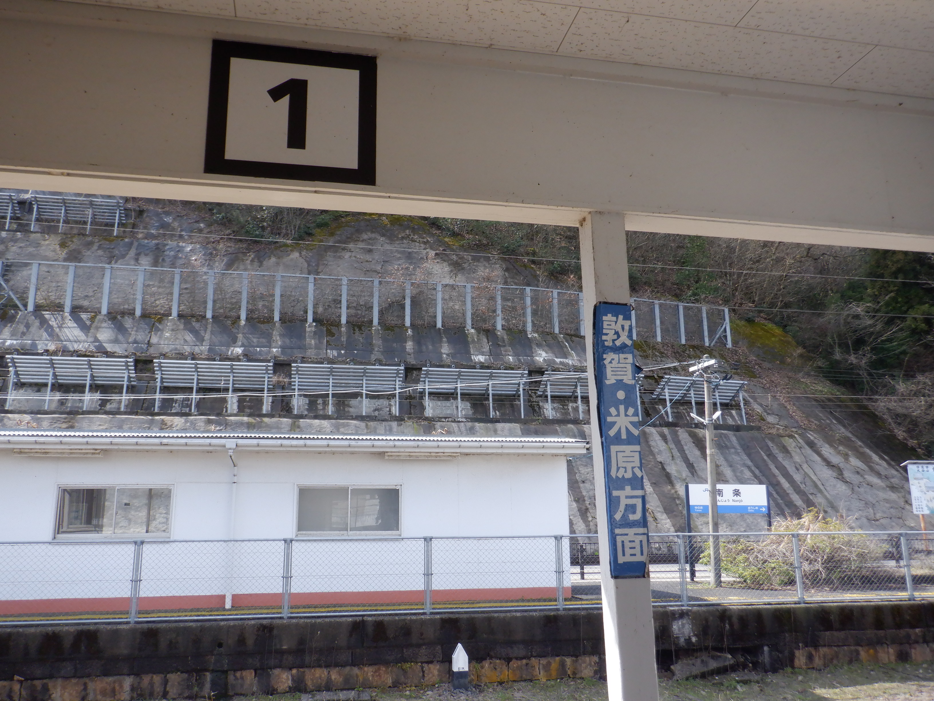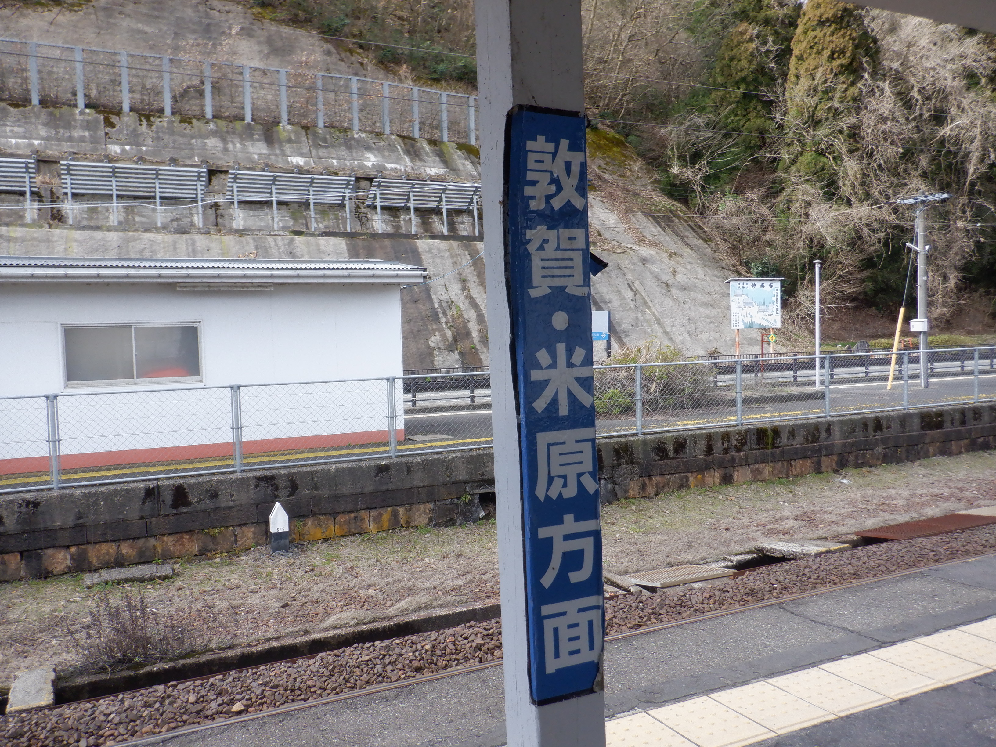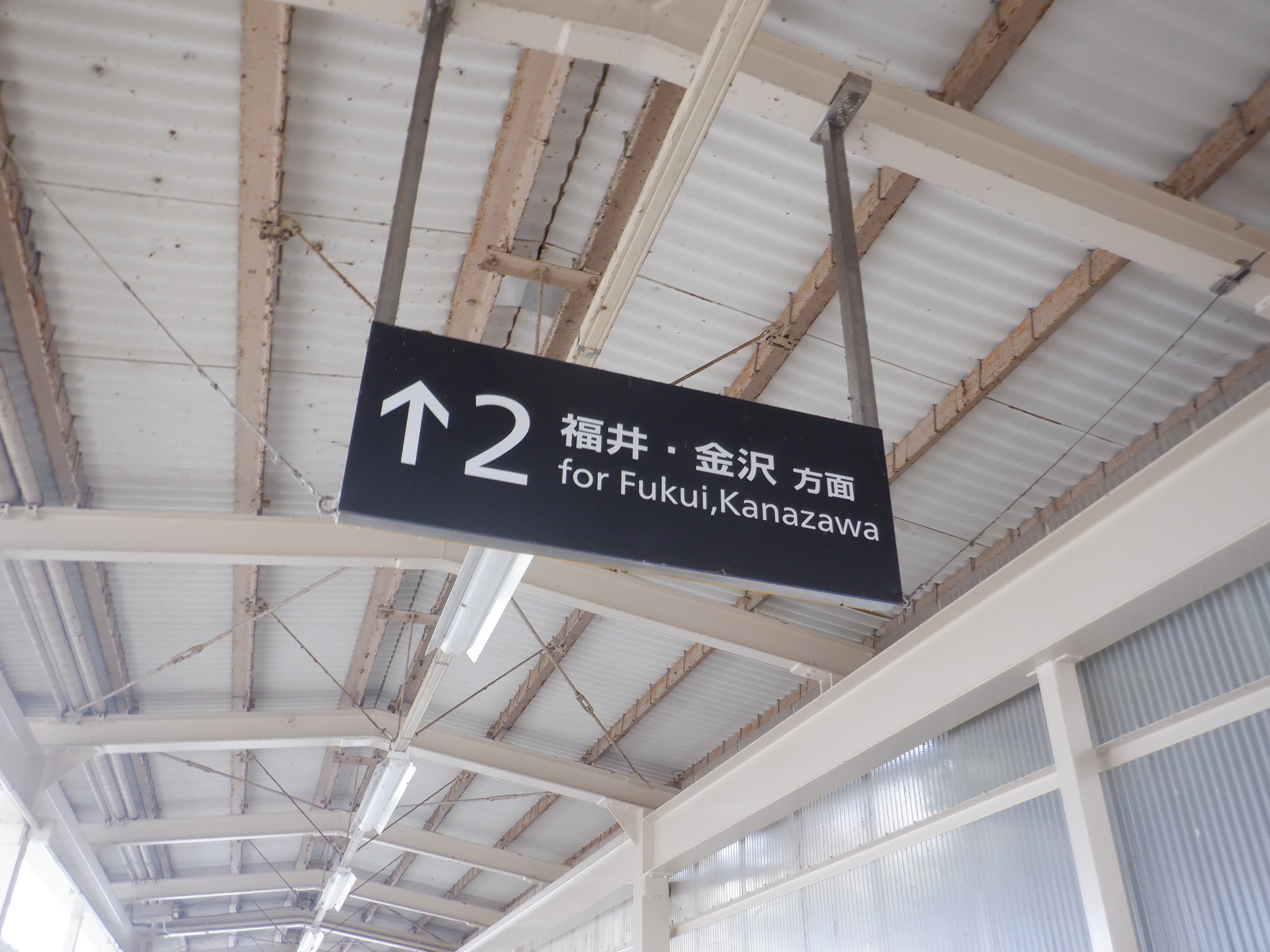 1番のりばの駅名標。こちらもハピラインふくいの駅名標の上に仮のJR駅名標が貼られています。