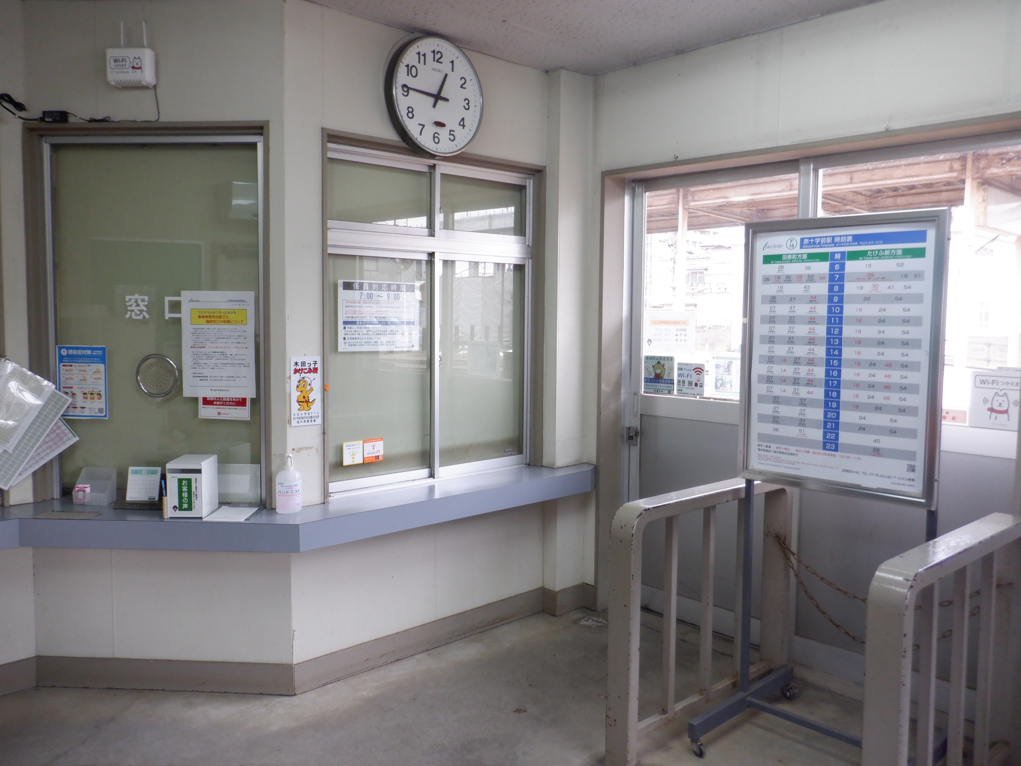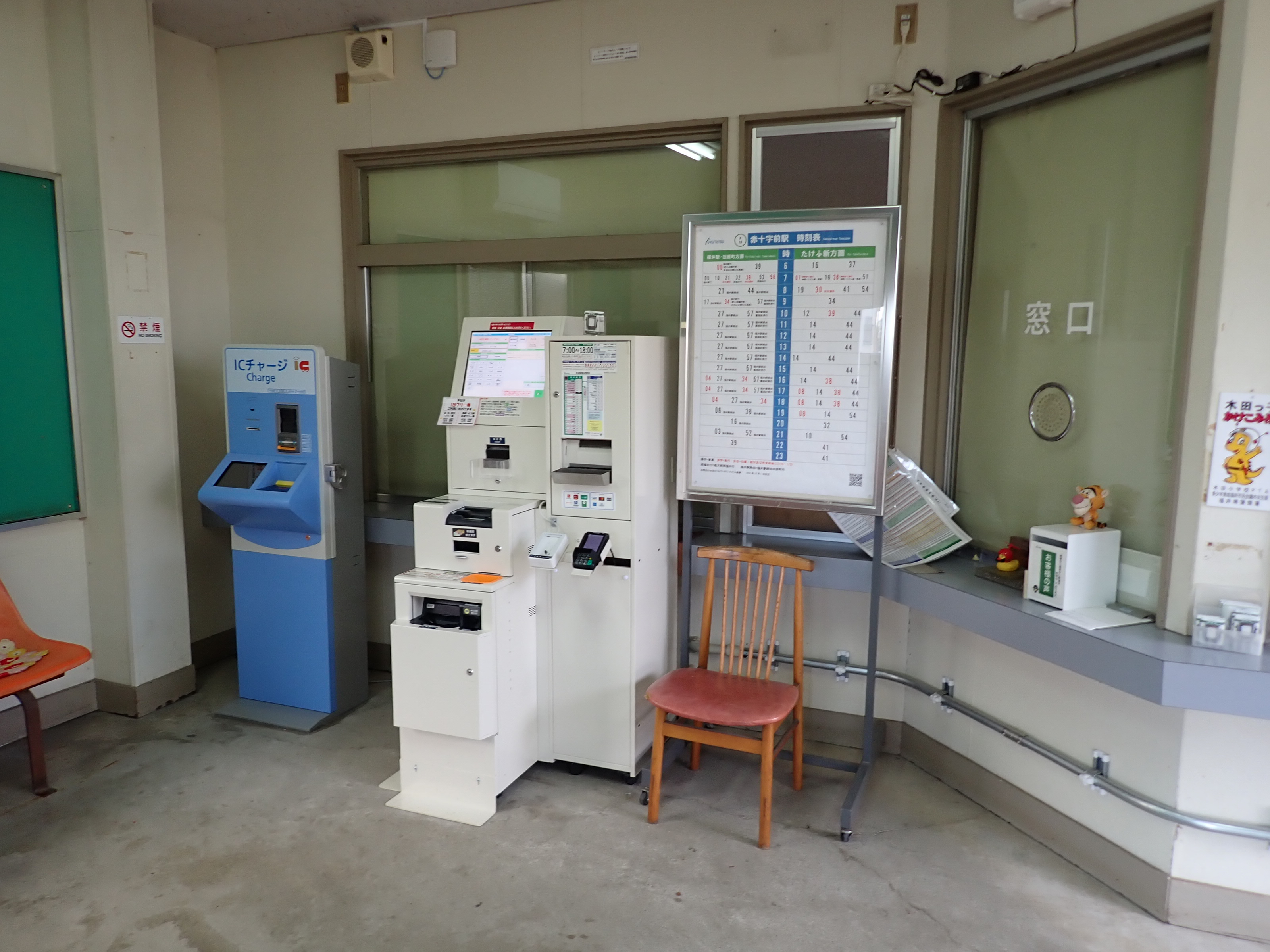 駅舎内。ICOCA改札機とカバーを被ったチャージ機が設置されていました。