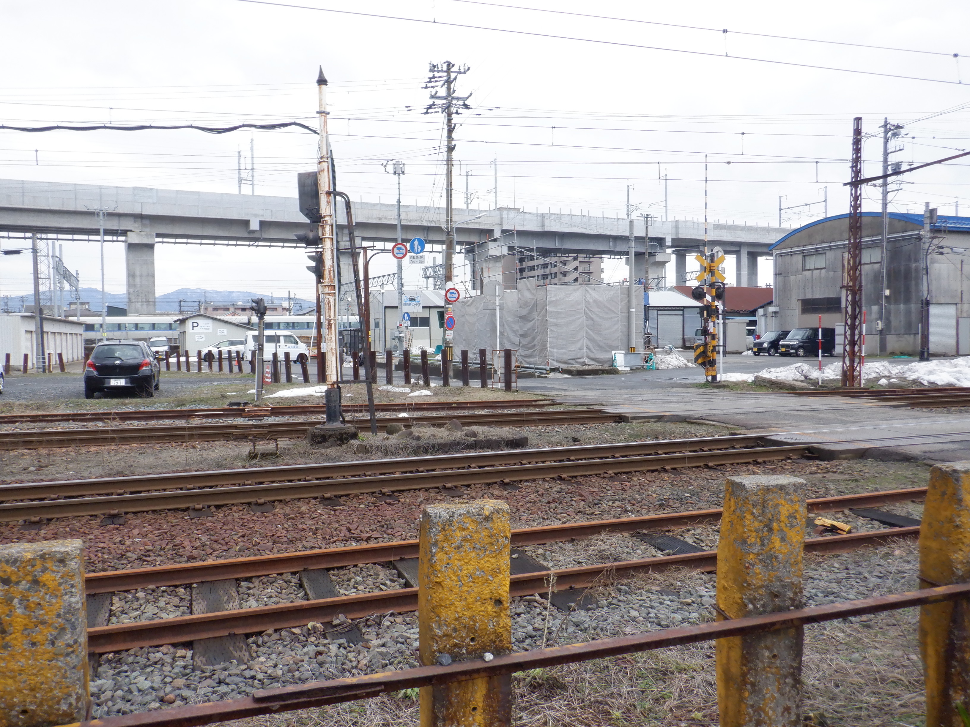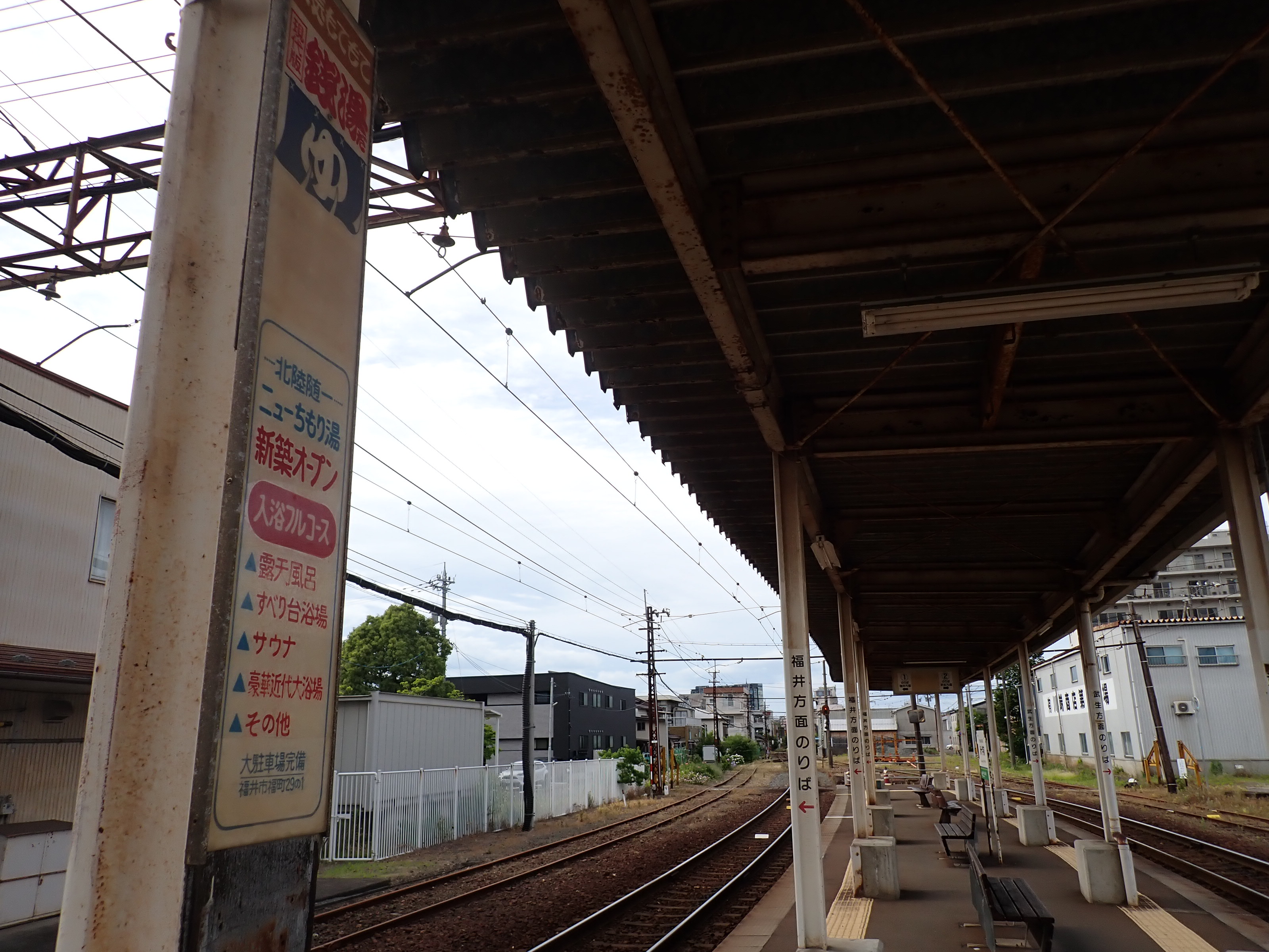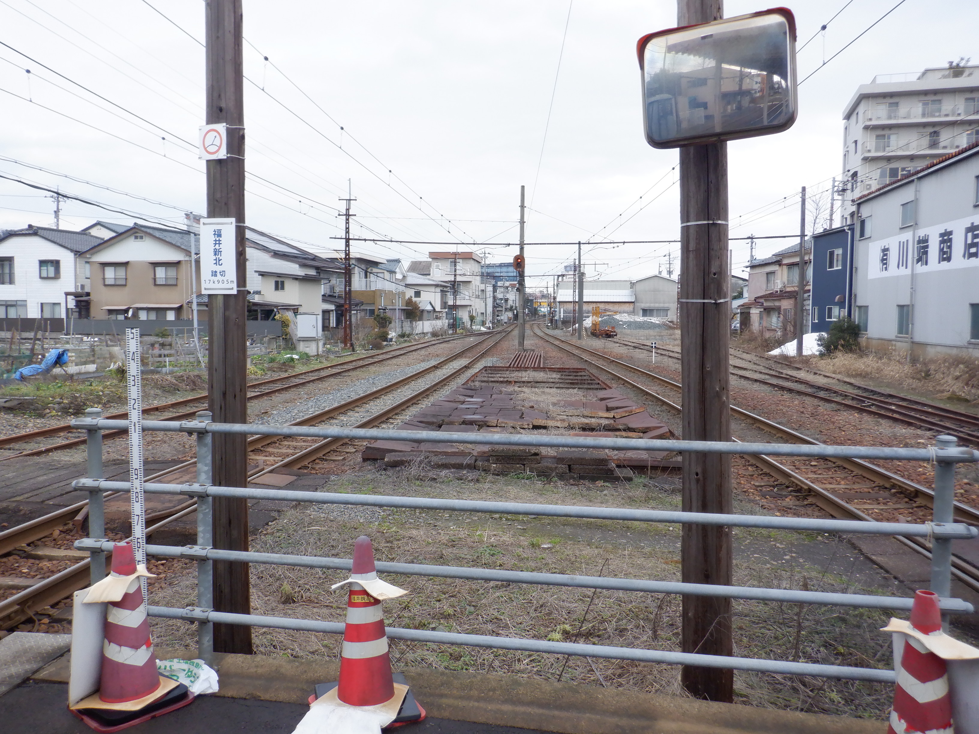 駅のそばの踏切とその付近から。こちらも「福井新」の名前が残っています。