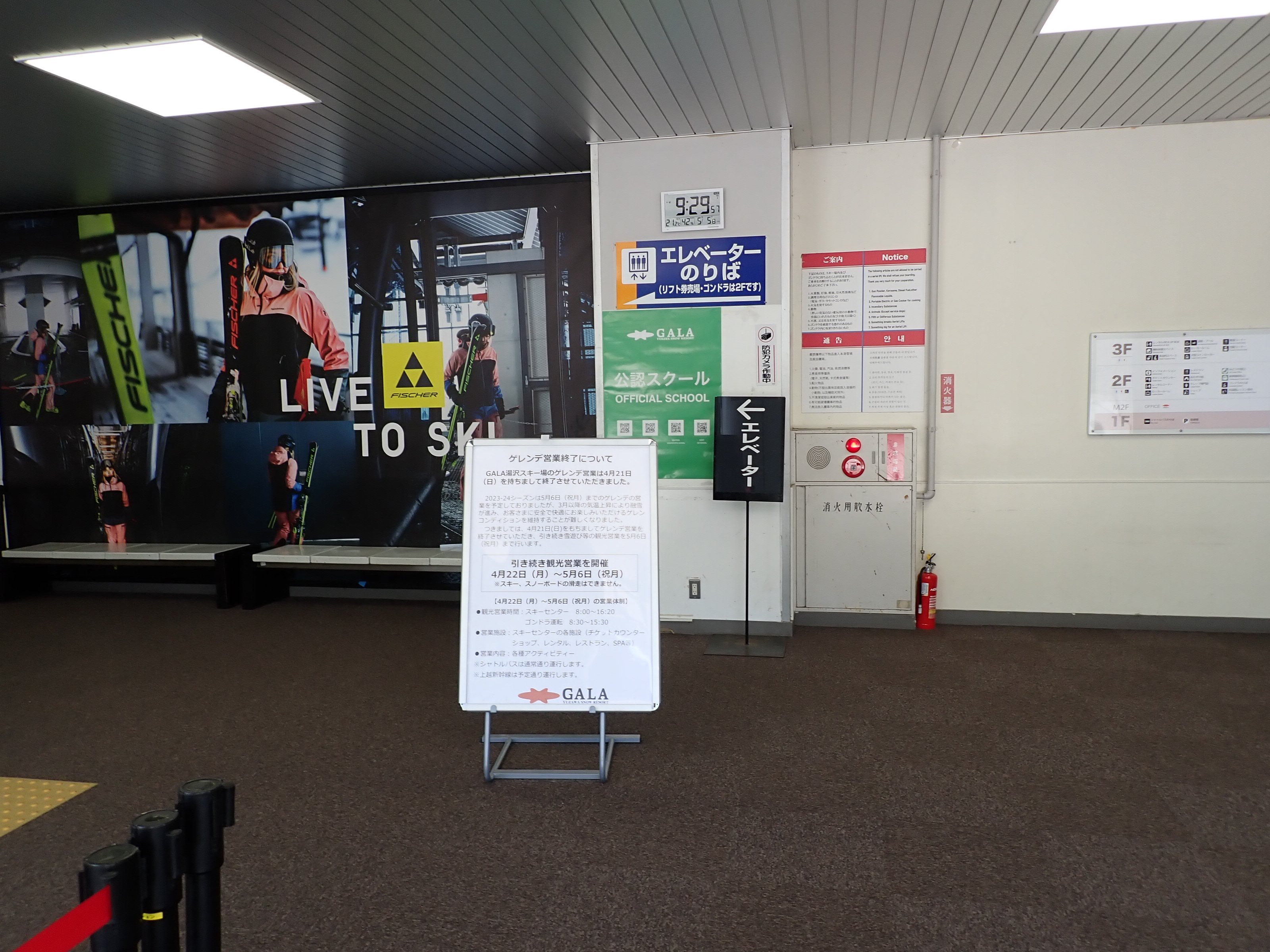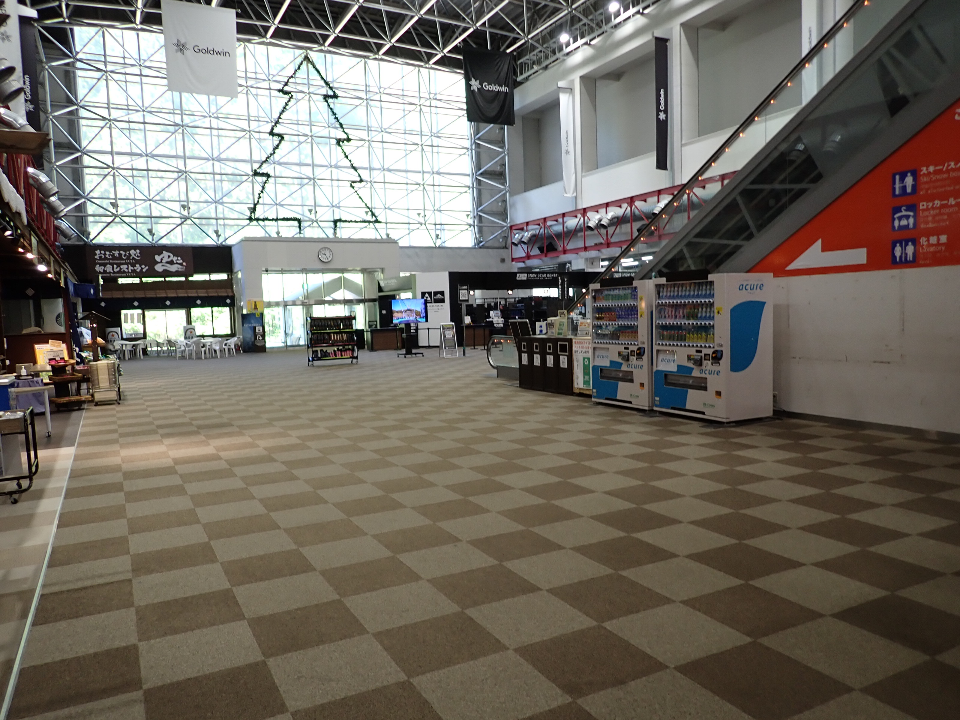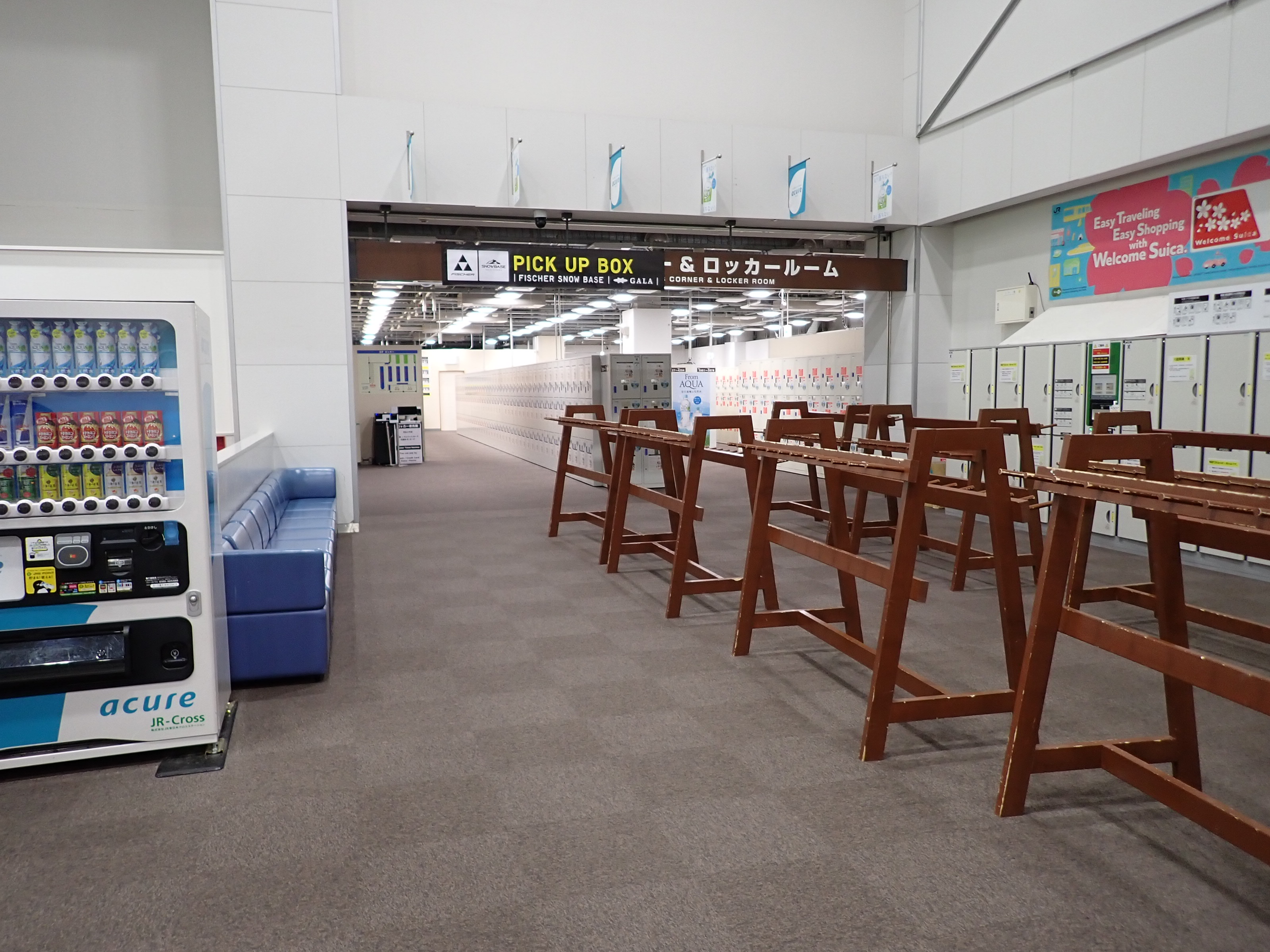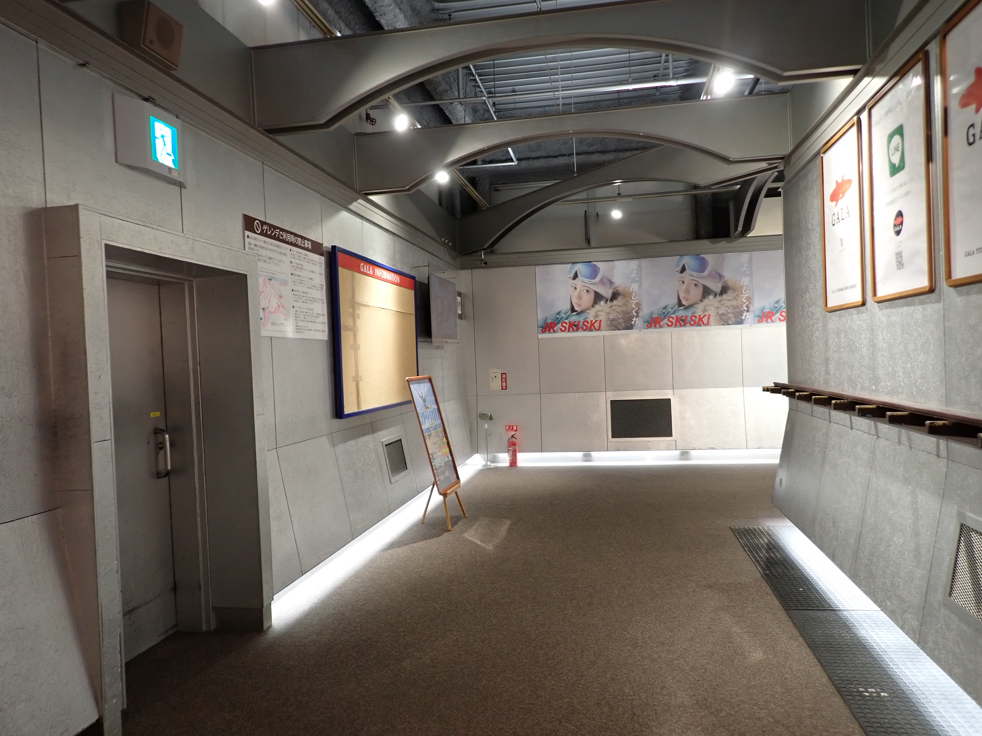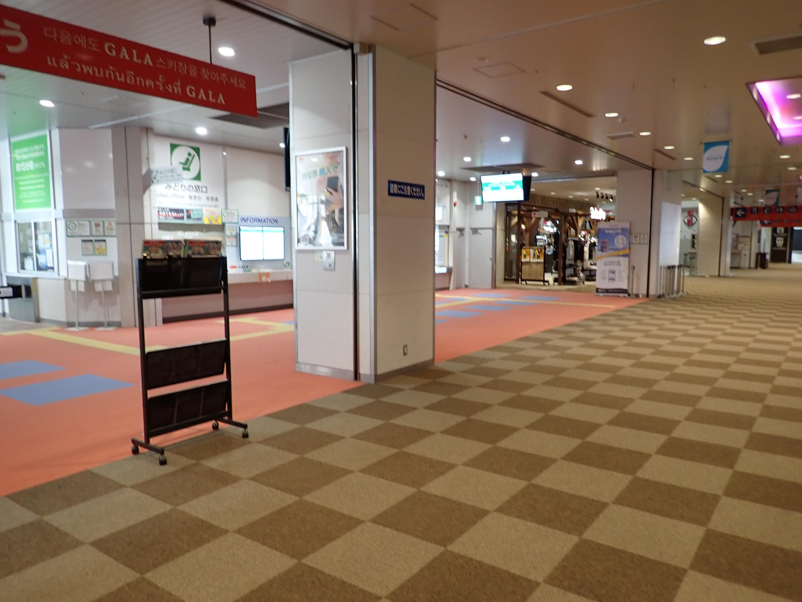 改札を抜けたところにあるスキー場の窓口。そのままスキー場施設である「カワバンガ」の2階になります。