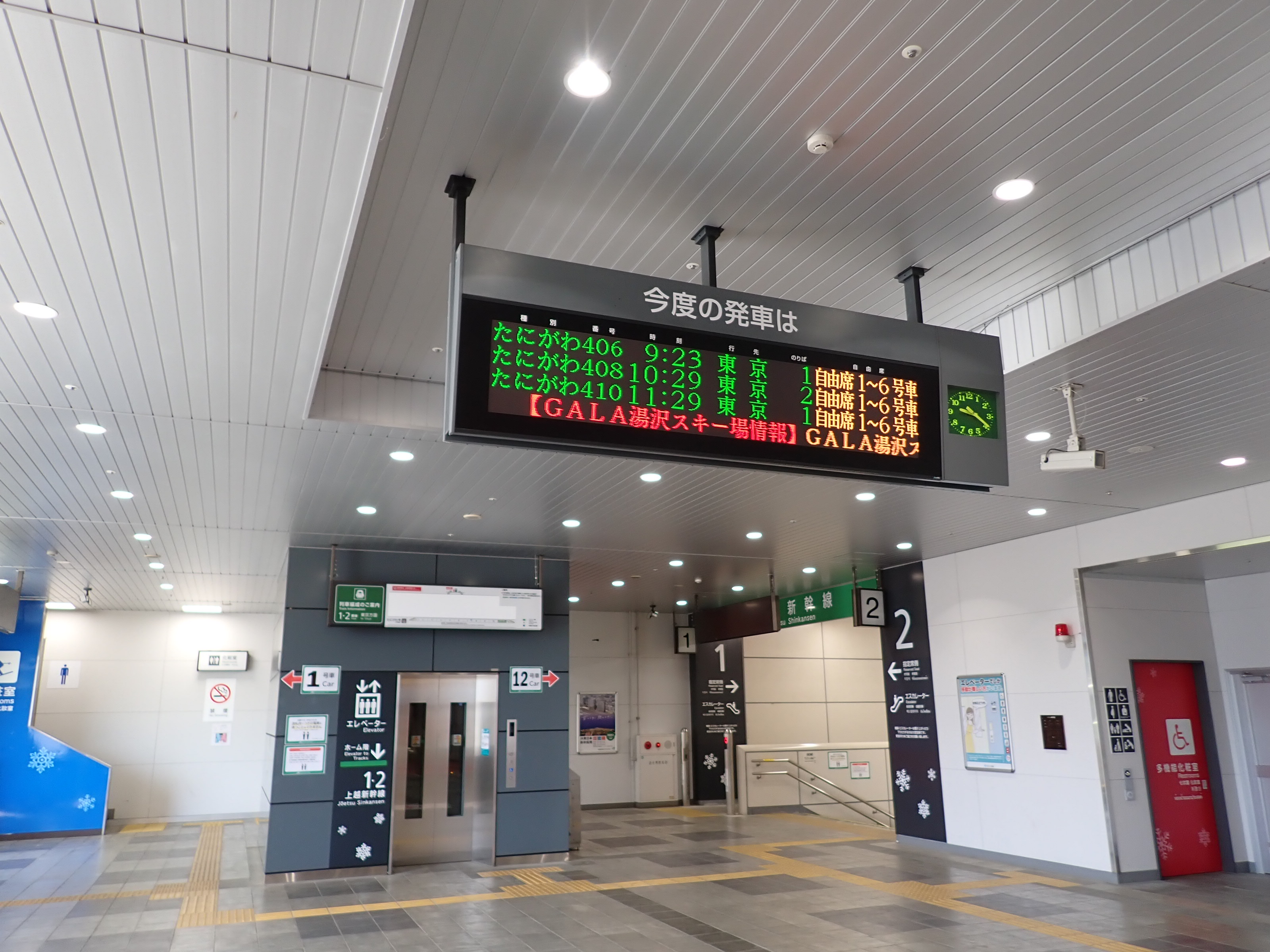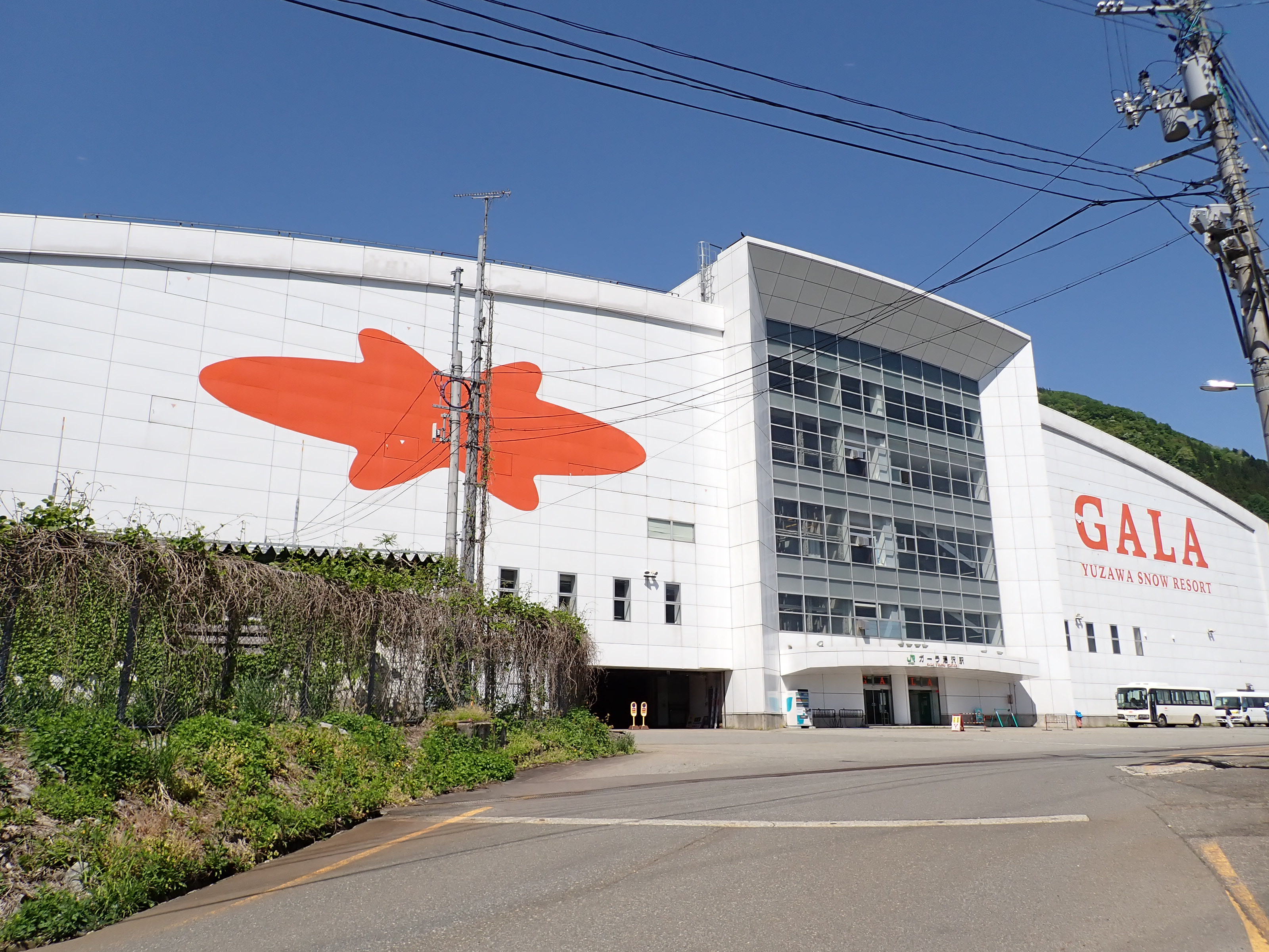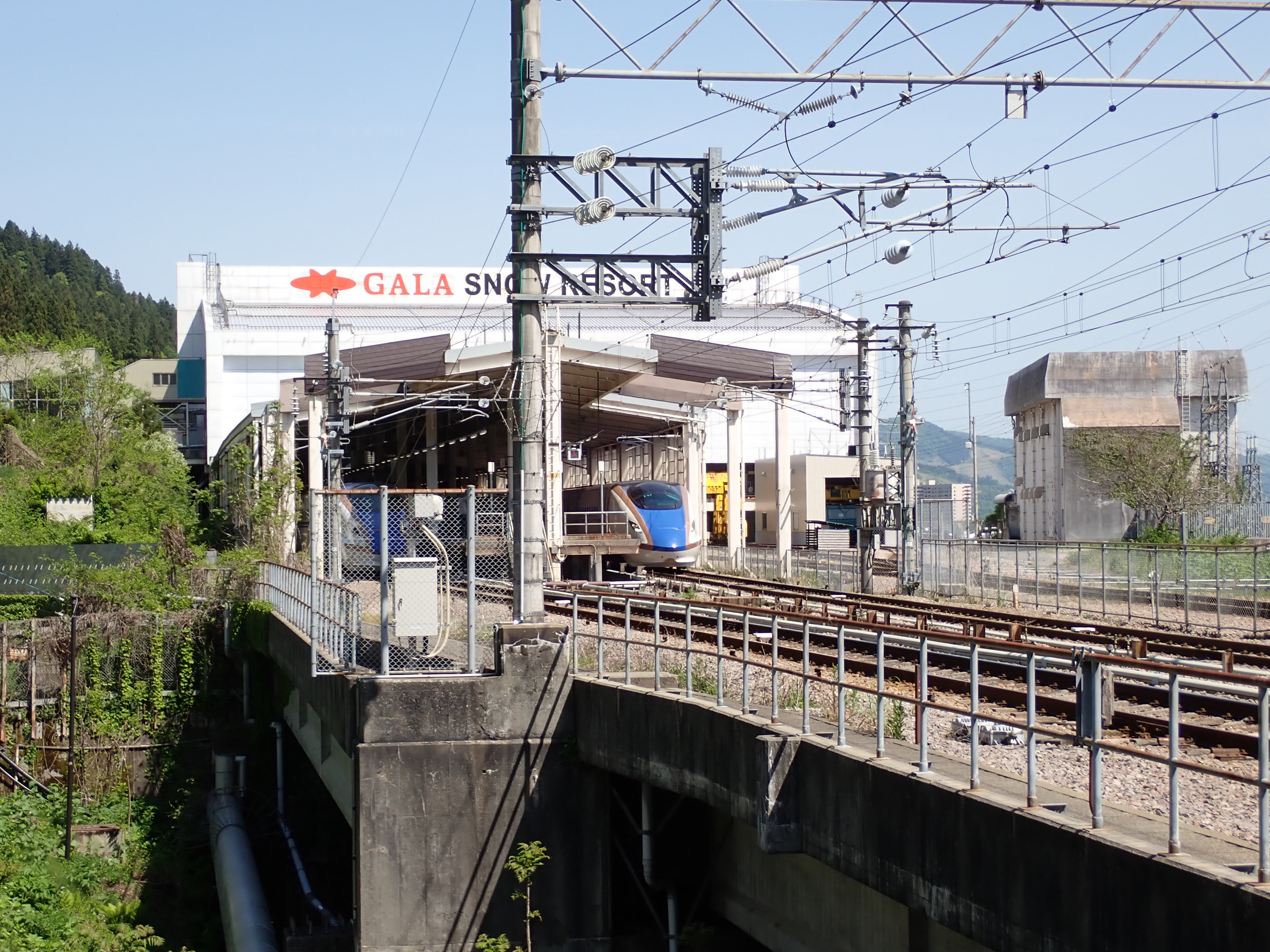 スキー場施設へ直結している季節営業の駅です。在来線の駅という扱いですが、列車や施設はもちろん新幹線の駅そのものです。駅・スキー場建物から外へ出ると、関越道や国道、上越線が通る谷を見おろすことができます。