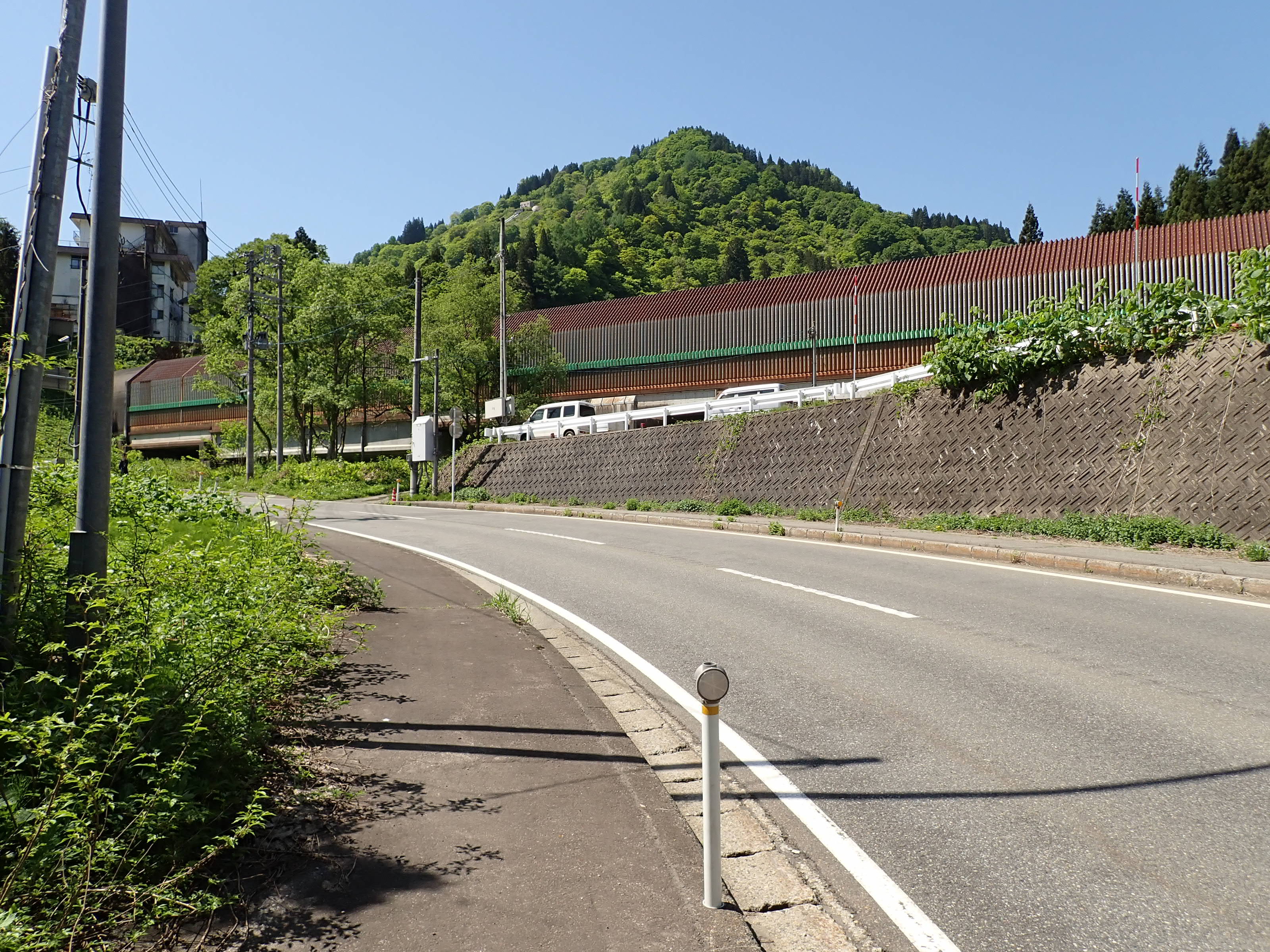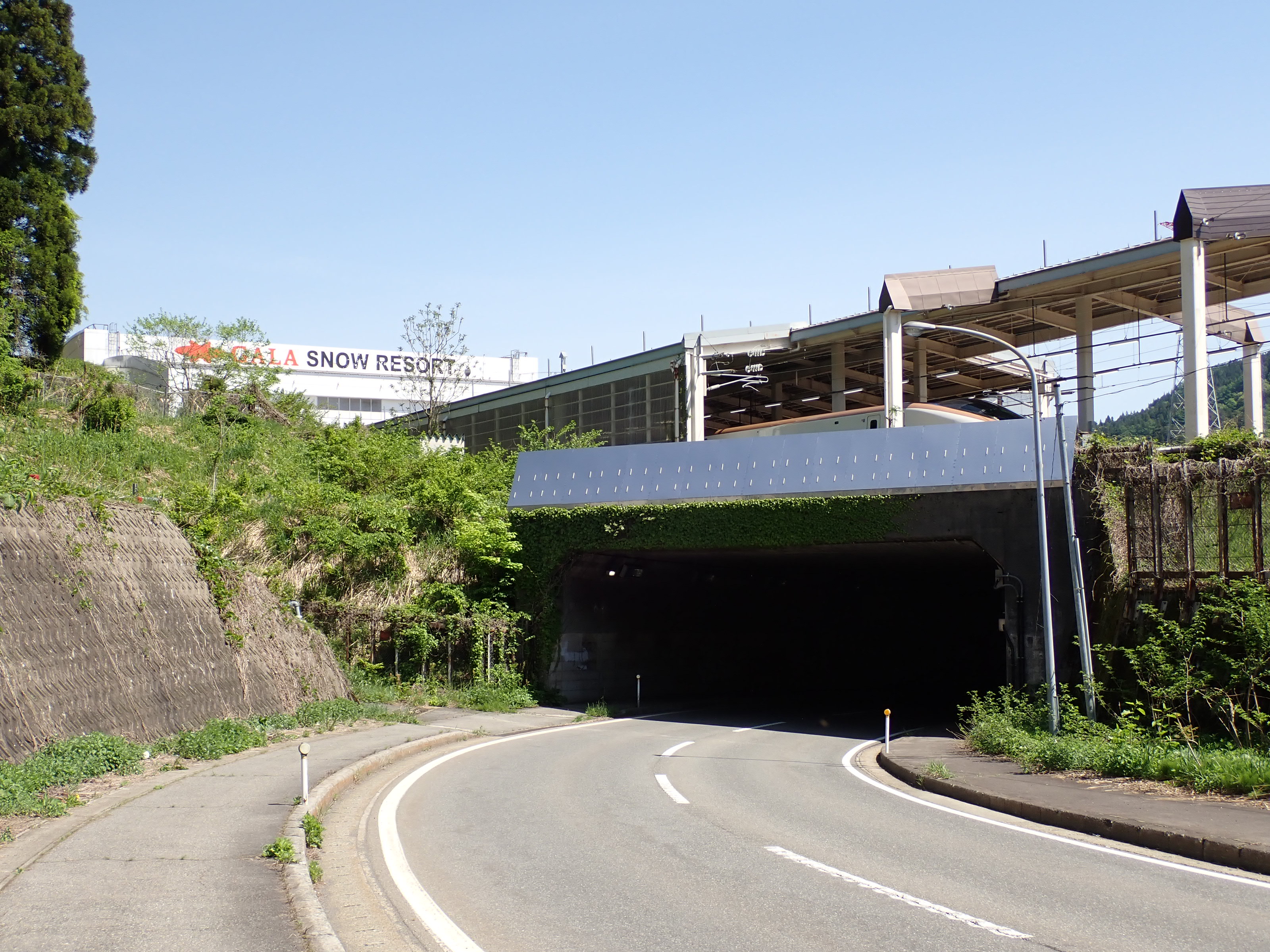 そのまま進み、線路の下をくぐります。前方に上越新幹線のスノーシェルターが見えます。