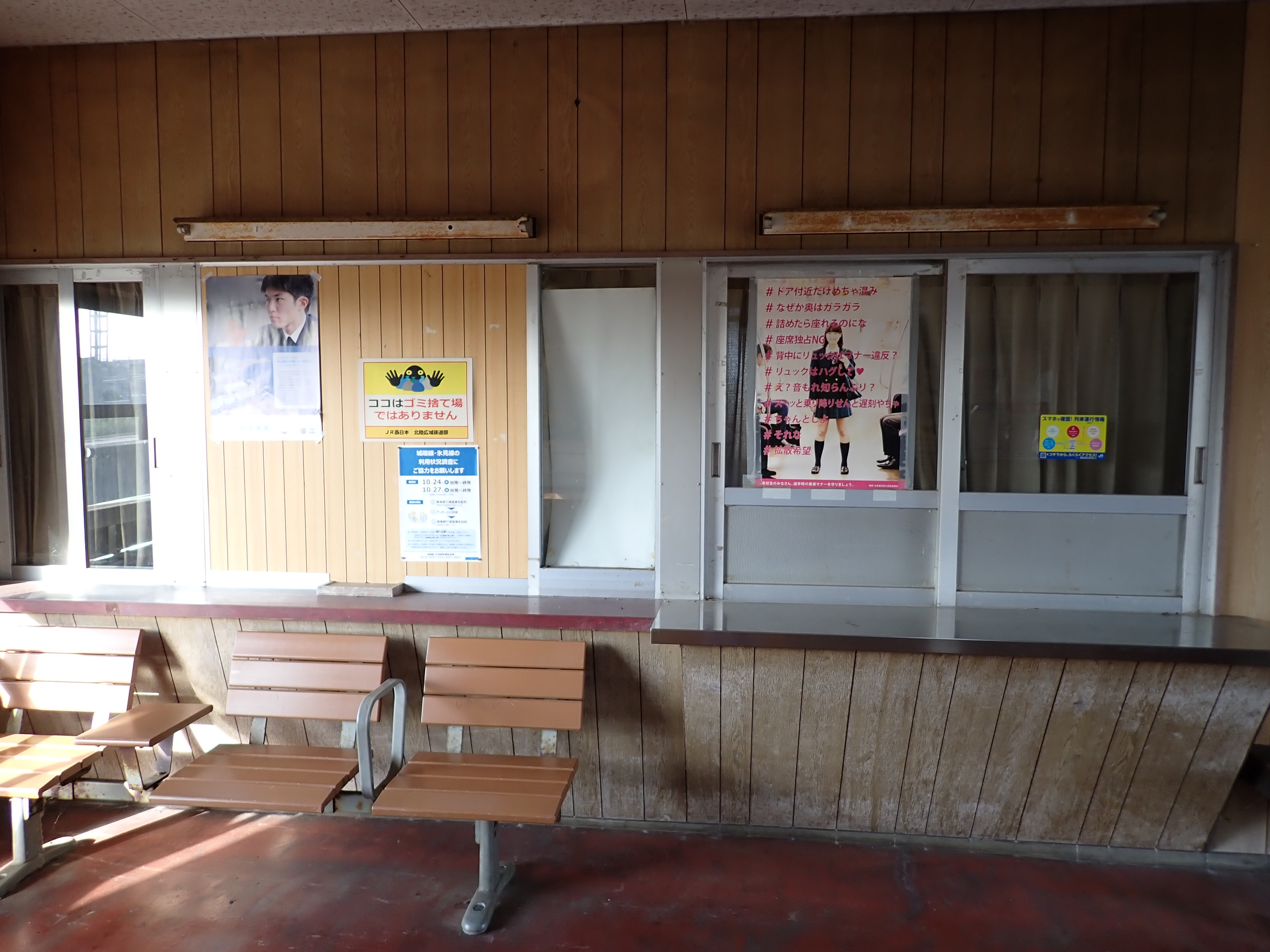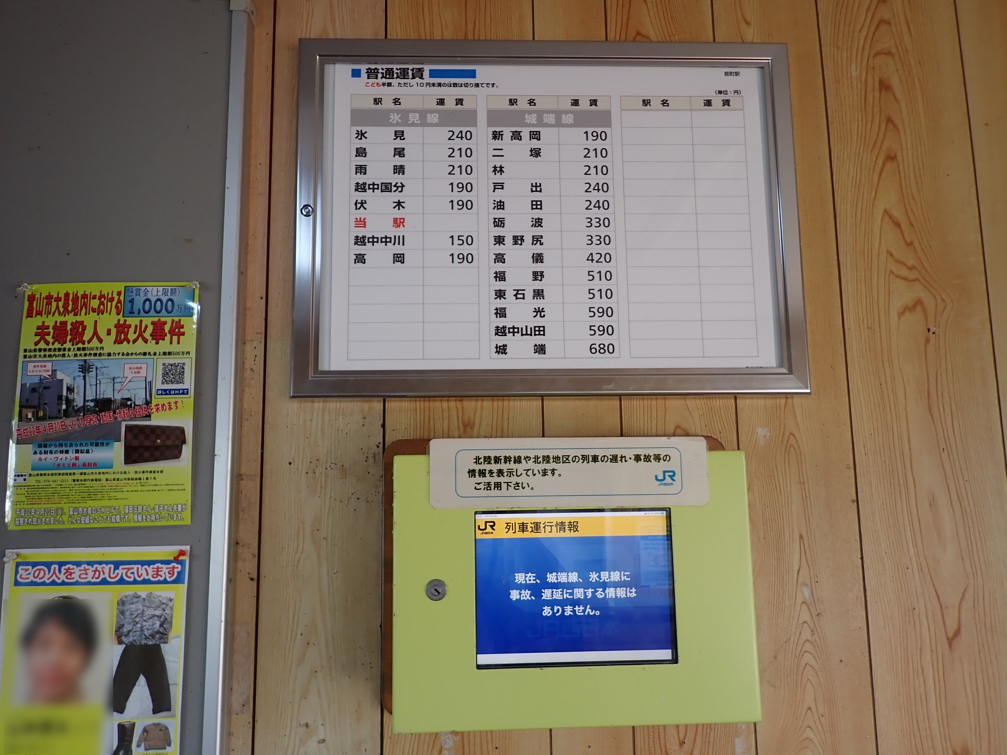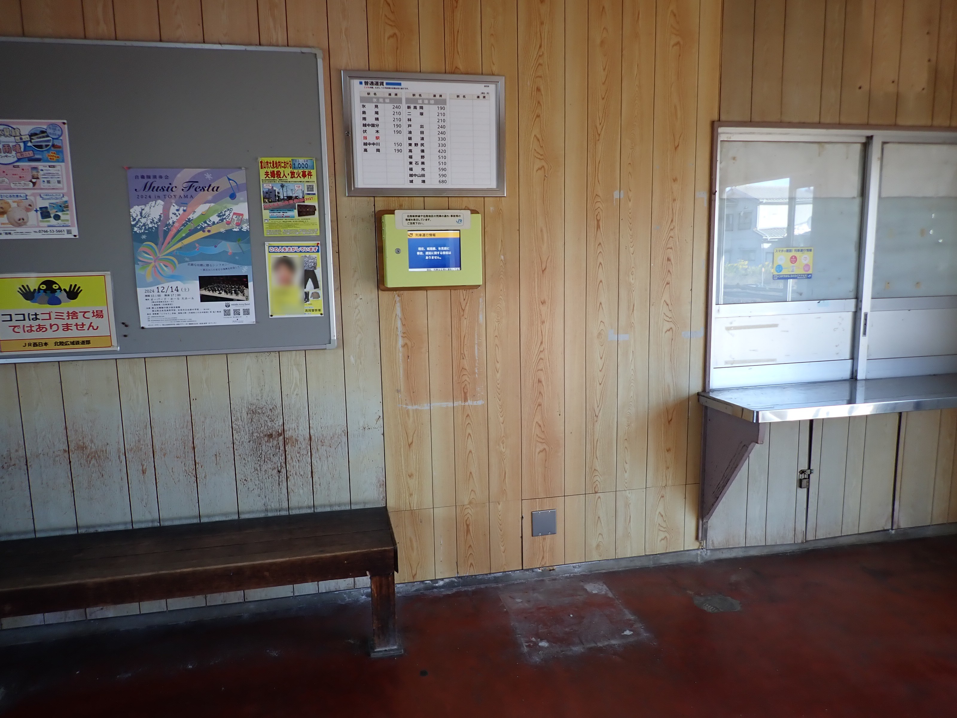券売機が撤去され、運賃表が設置された駅舎内の様子。