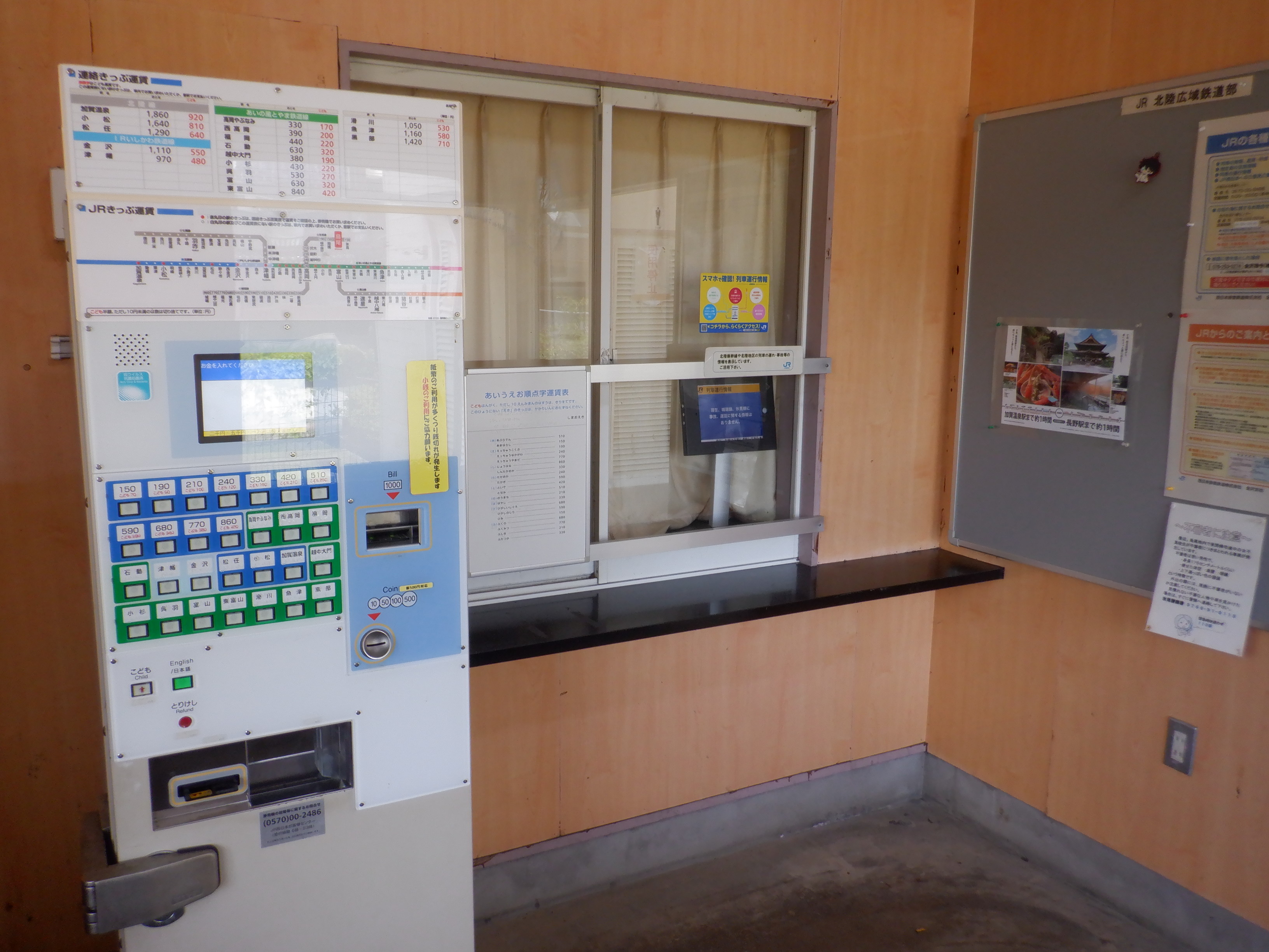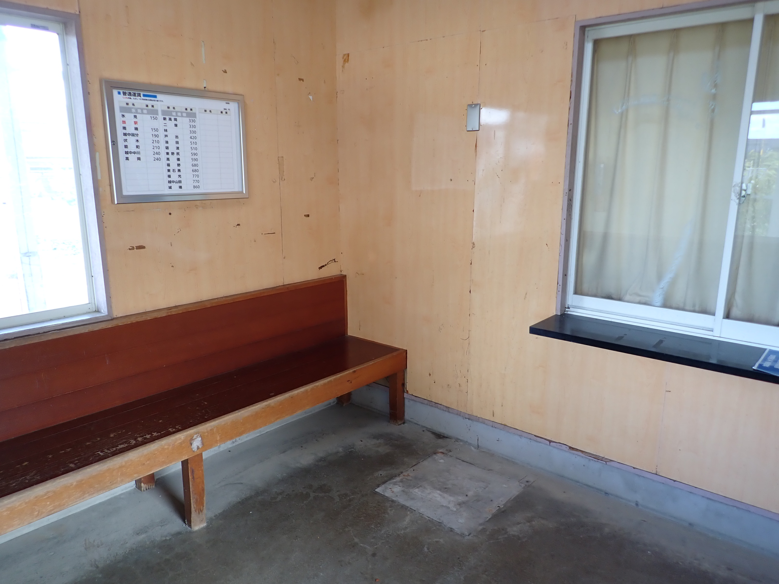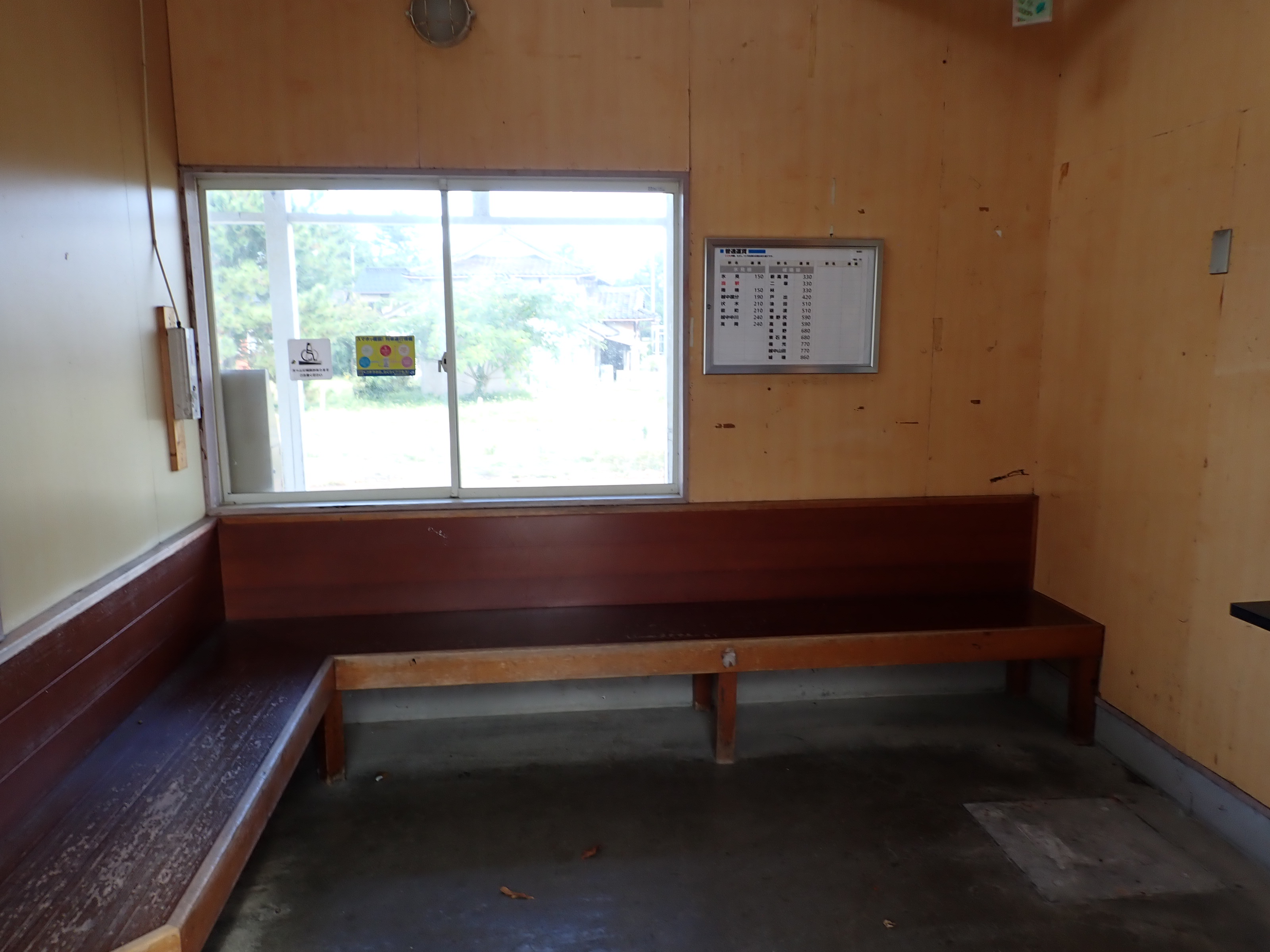 待合室内の様子。券売機が撤去され、運賃表が設置されていました。