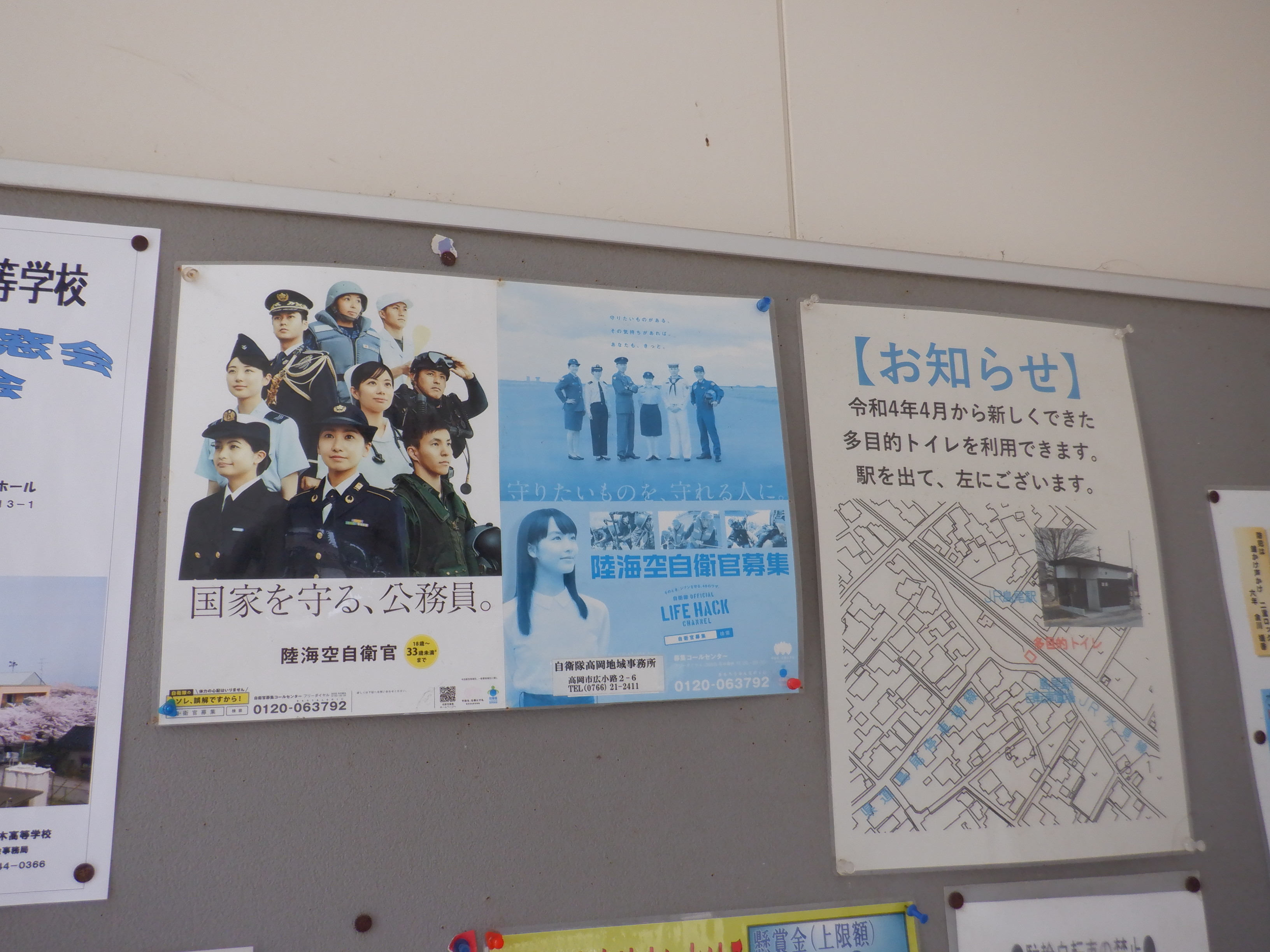 駅舎の掲示板にある新しいトイレの案内。