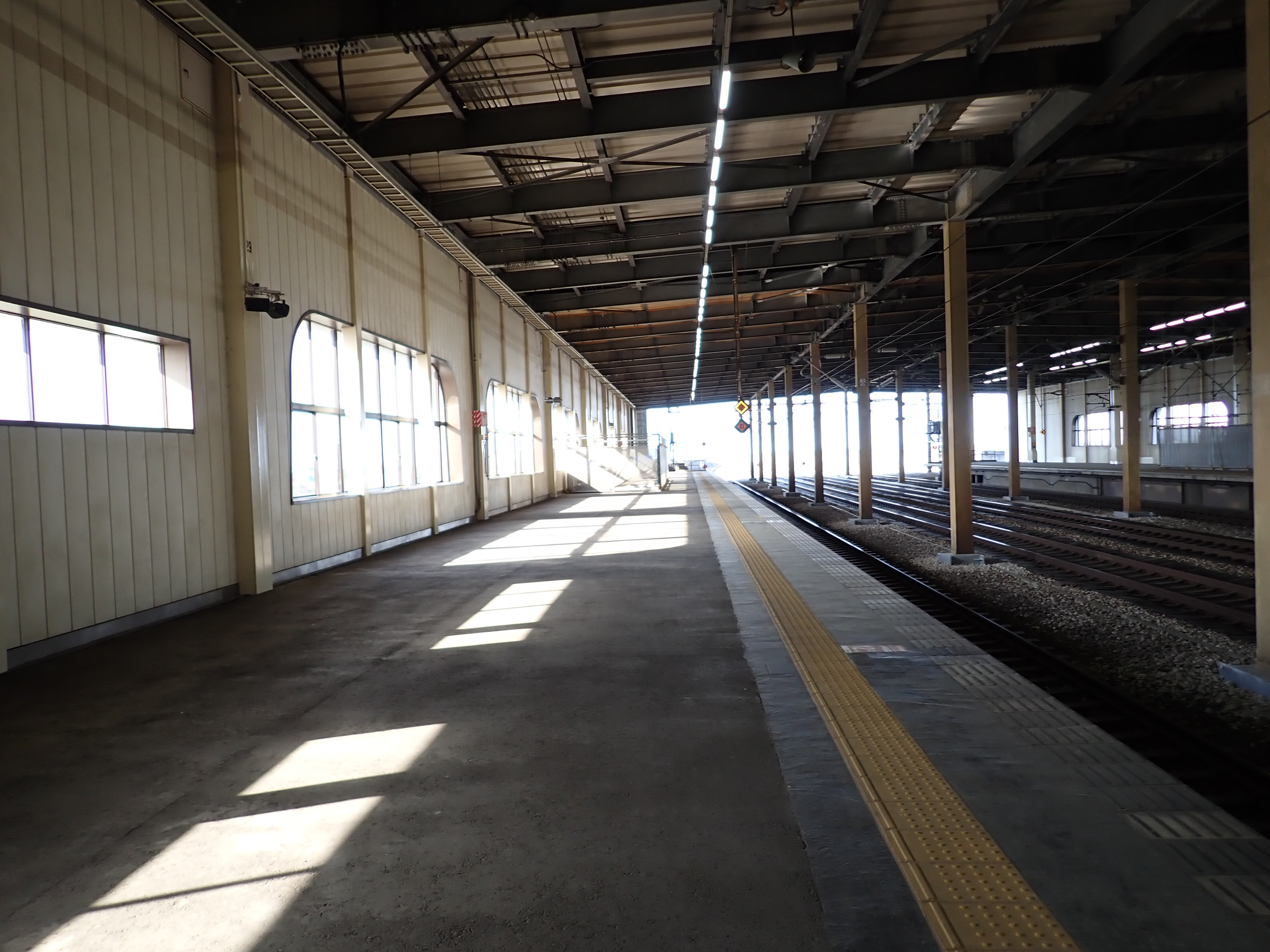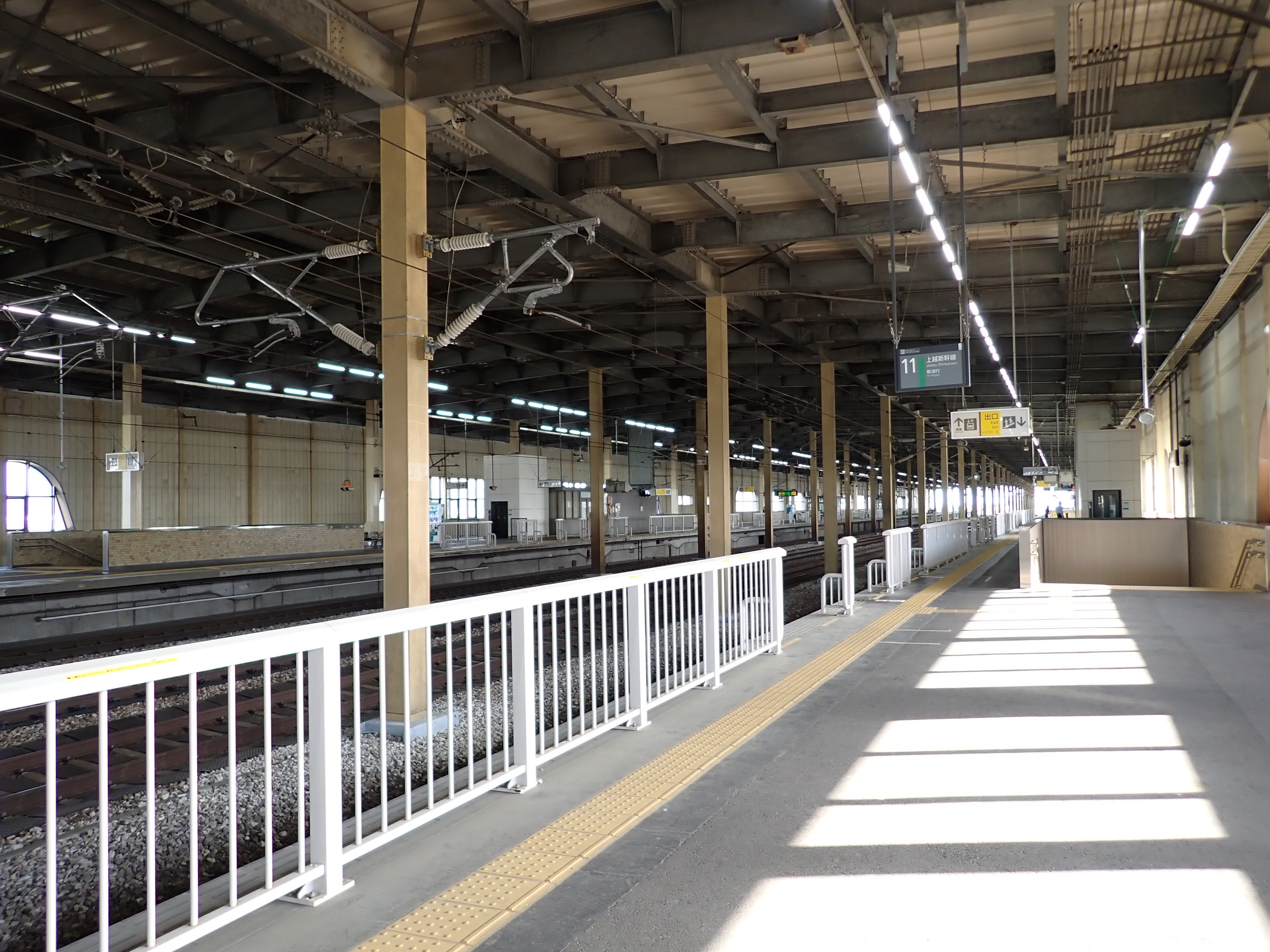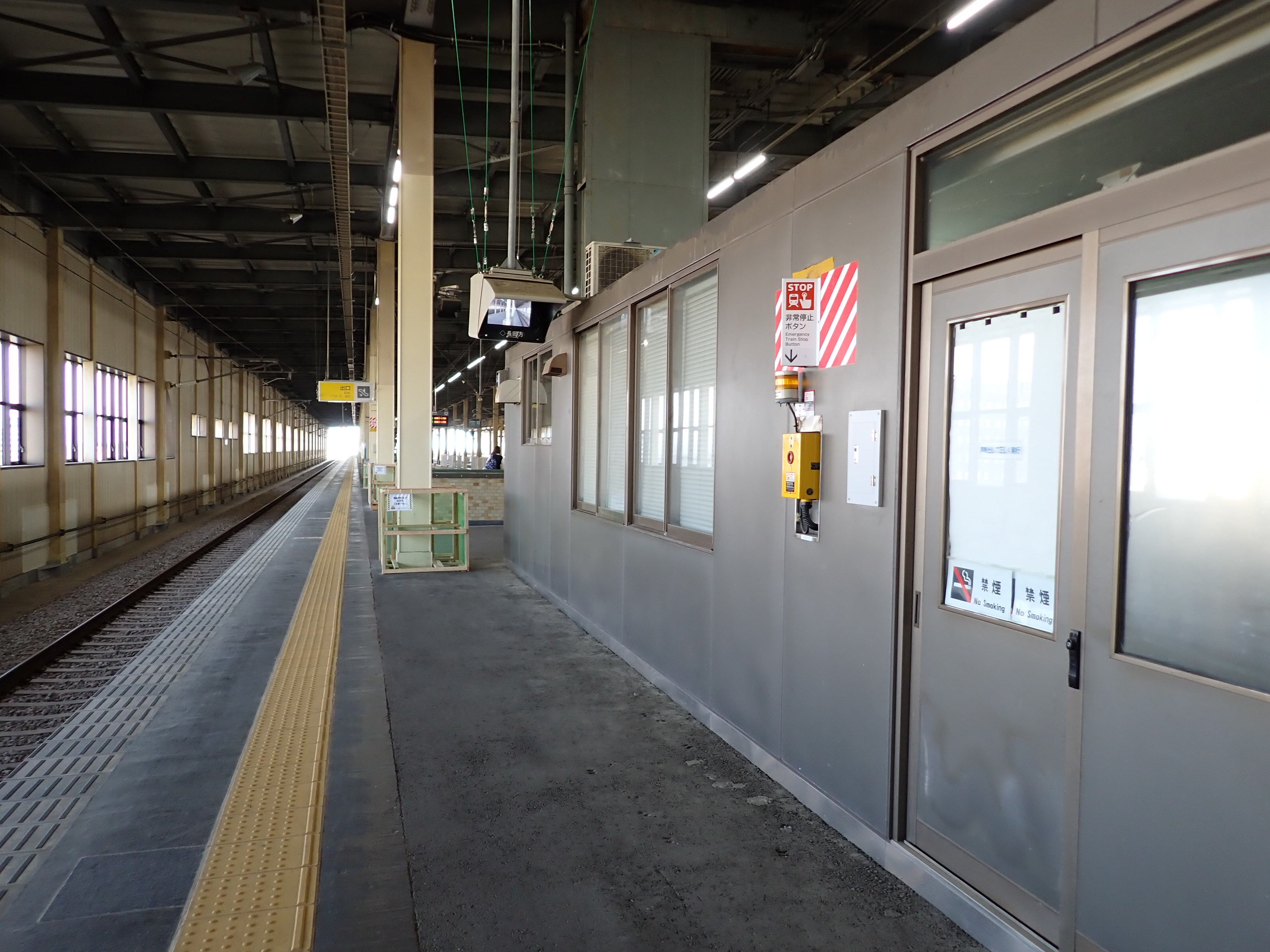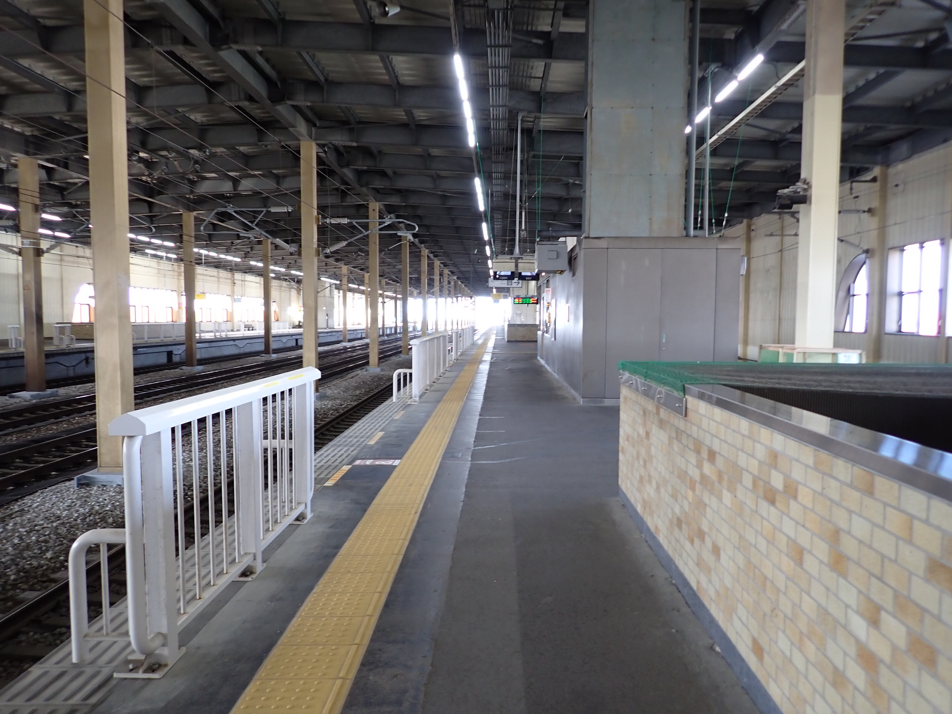 ホームの新潟駅側。現在、12両編成の列車が停車しない範囲。一部囲いがされています。
