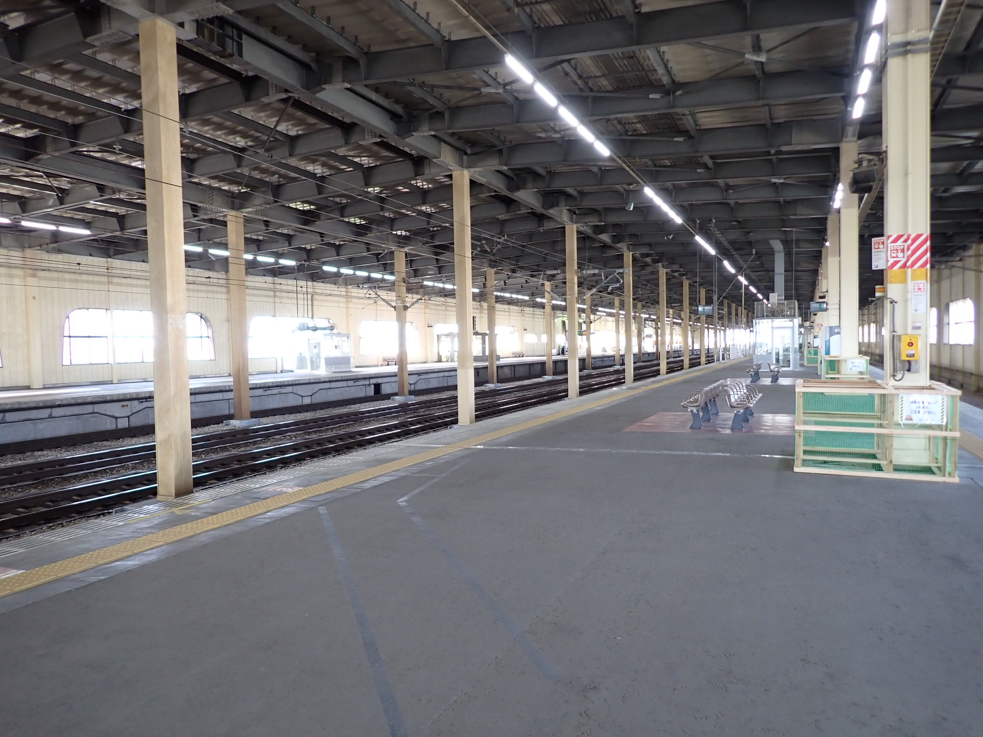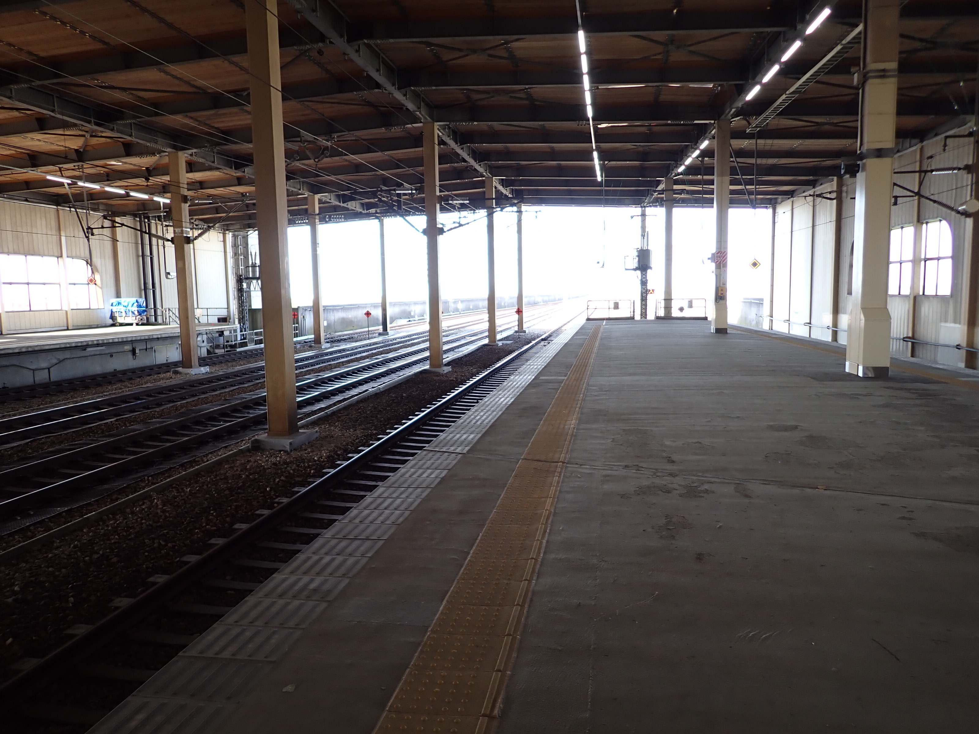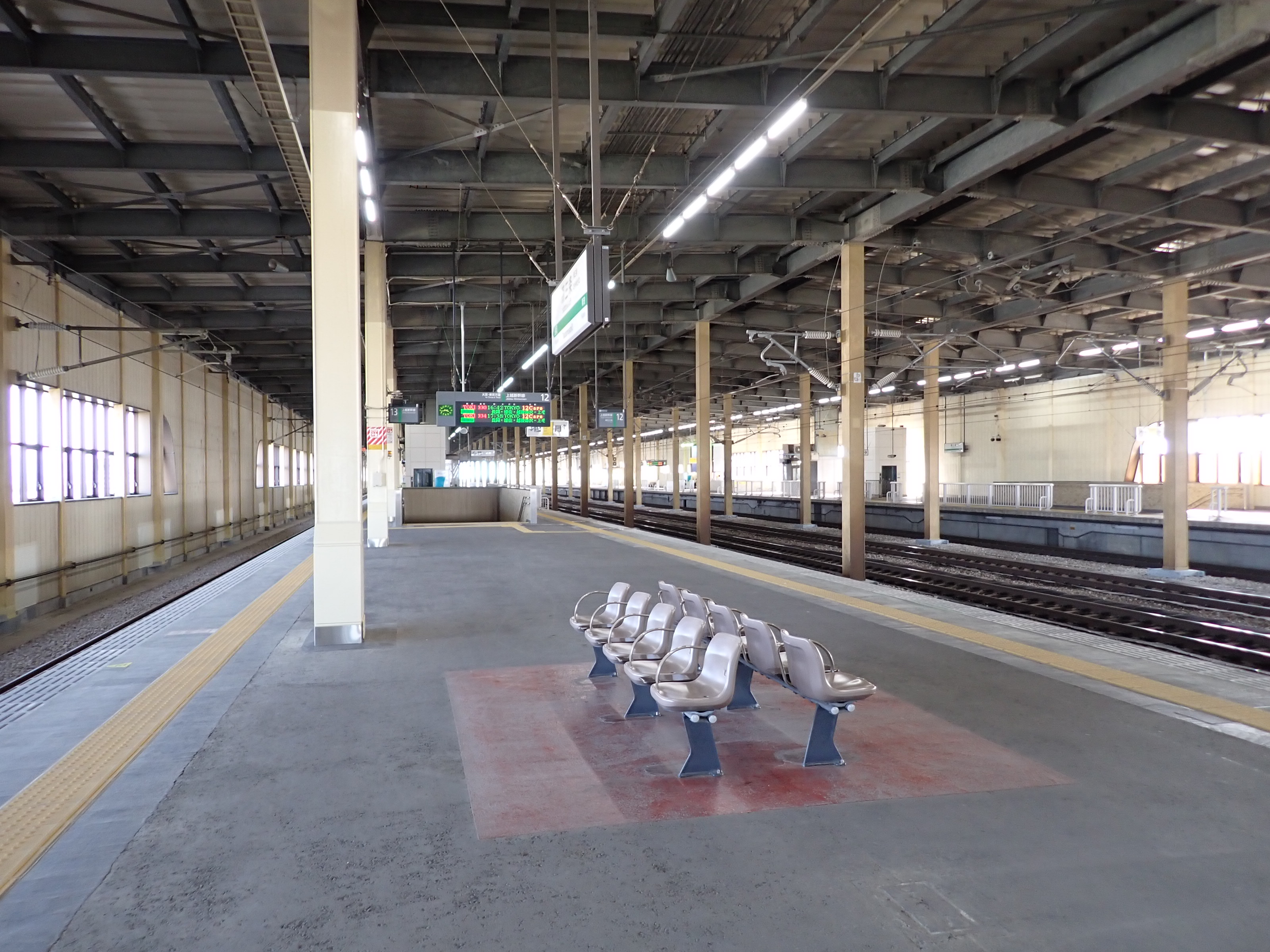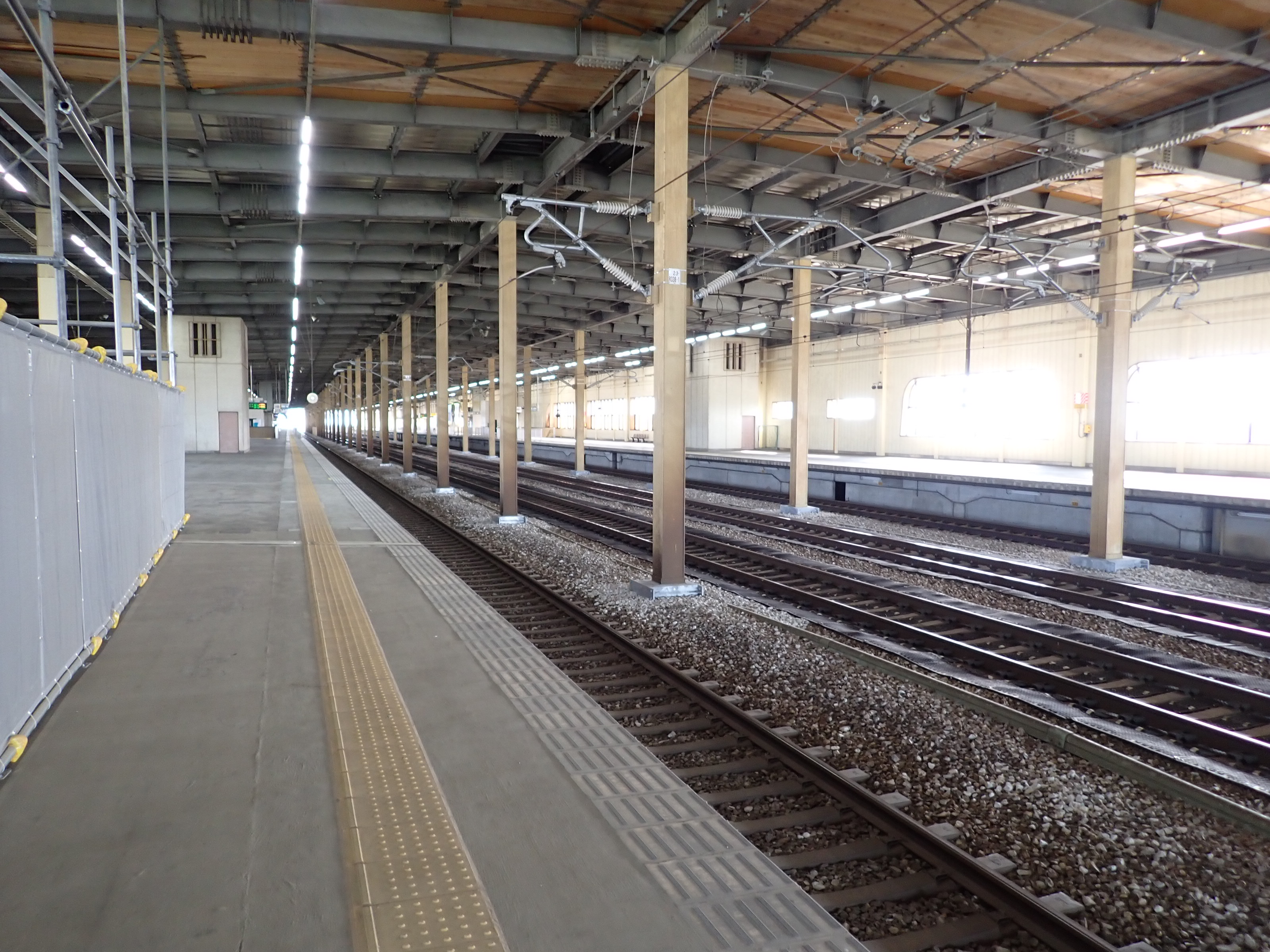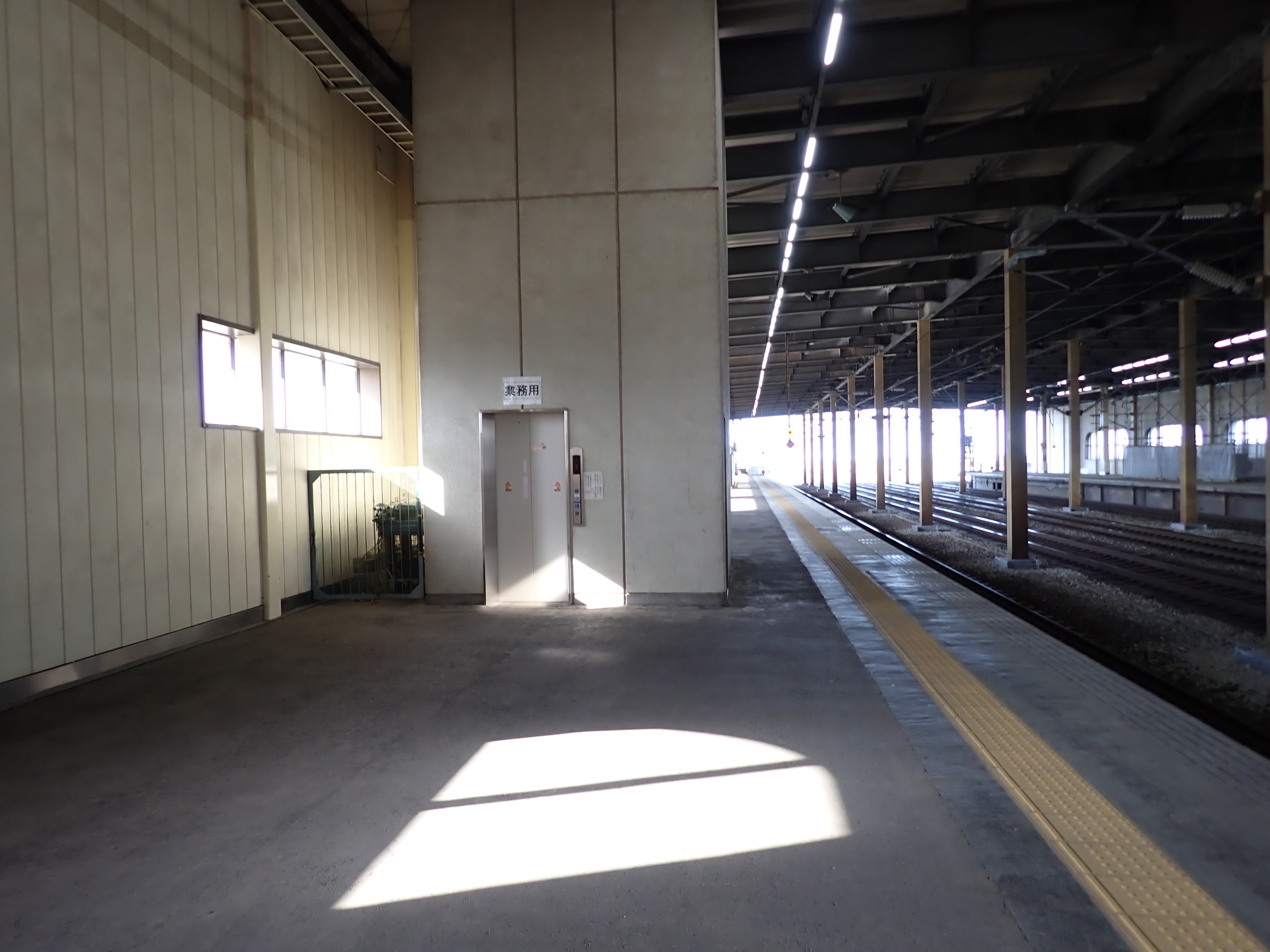 ホームの新潟駅側。現在、12両編成の列車が停車しない範囲。一部囲いがされています。