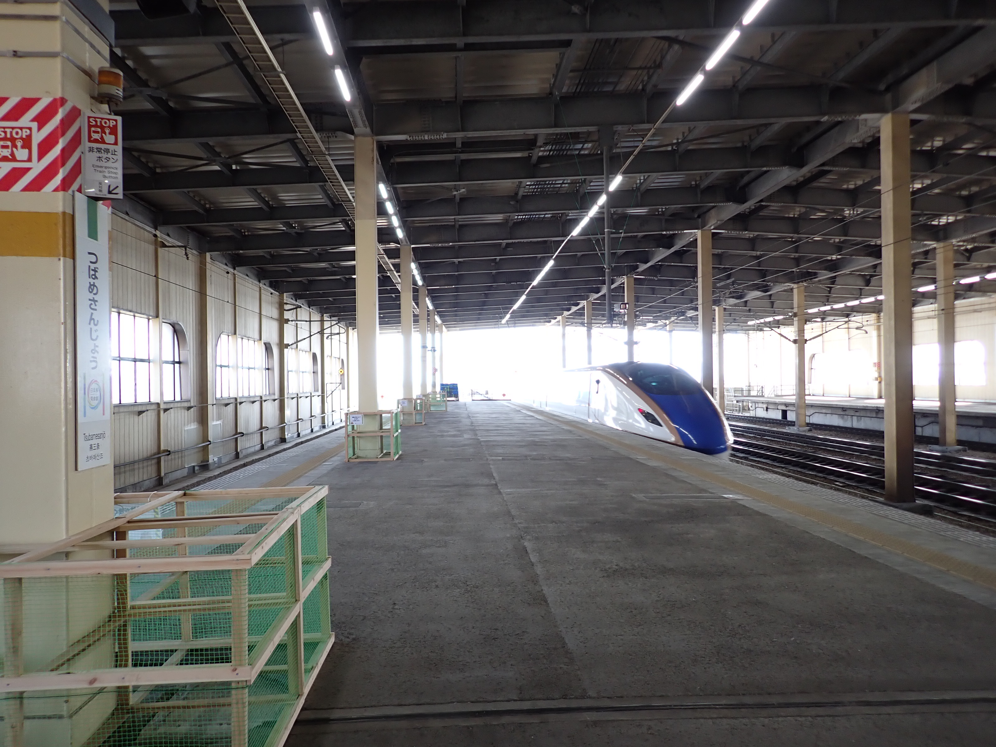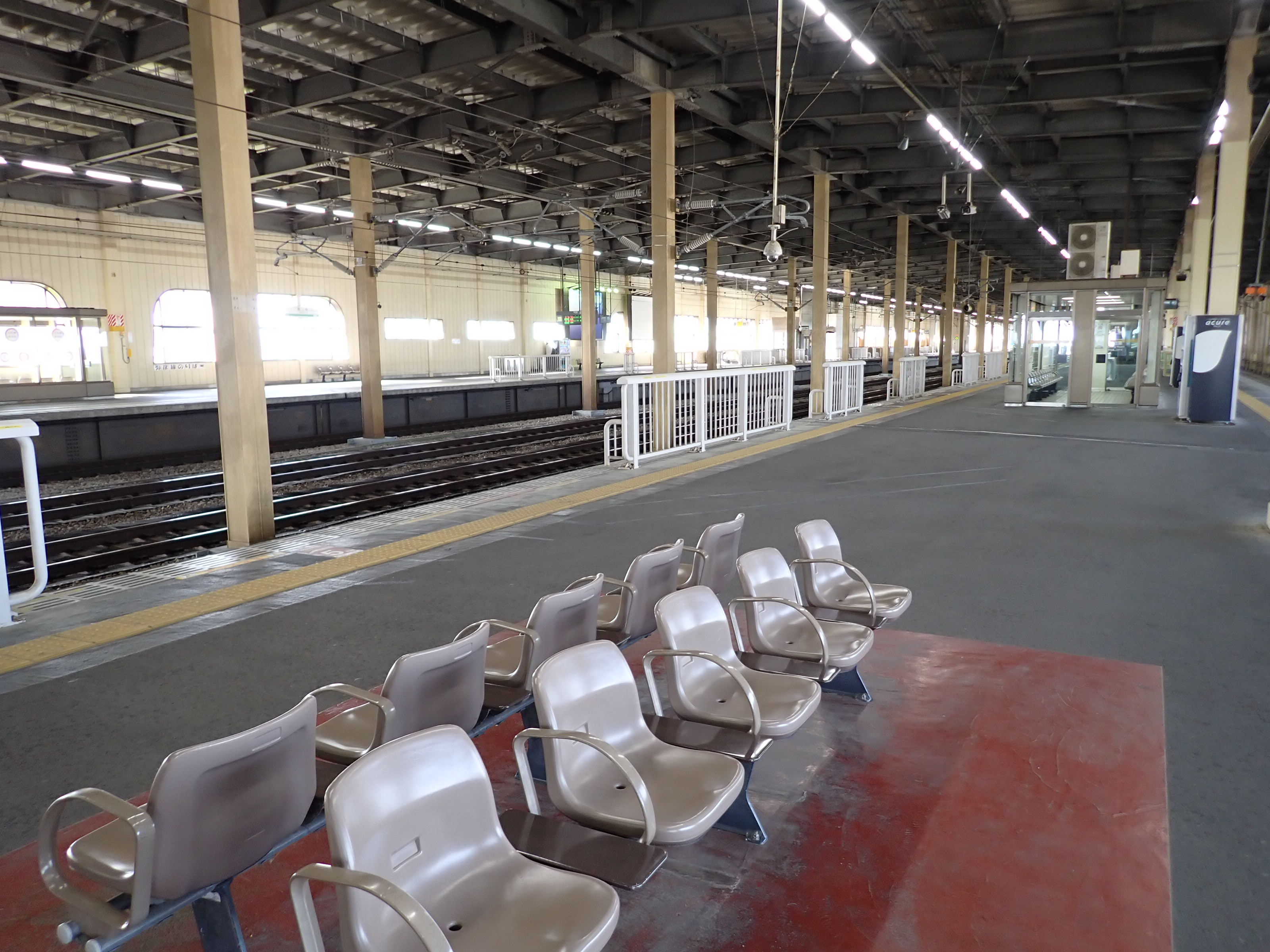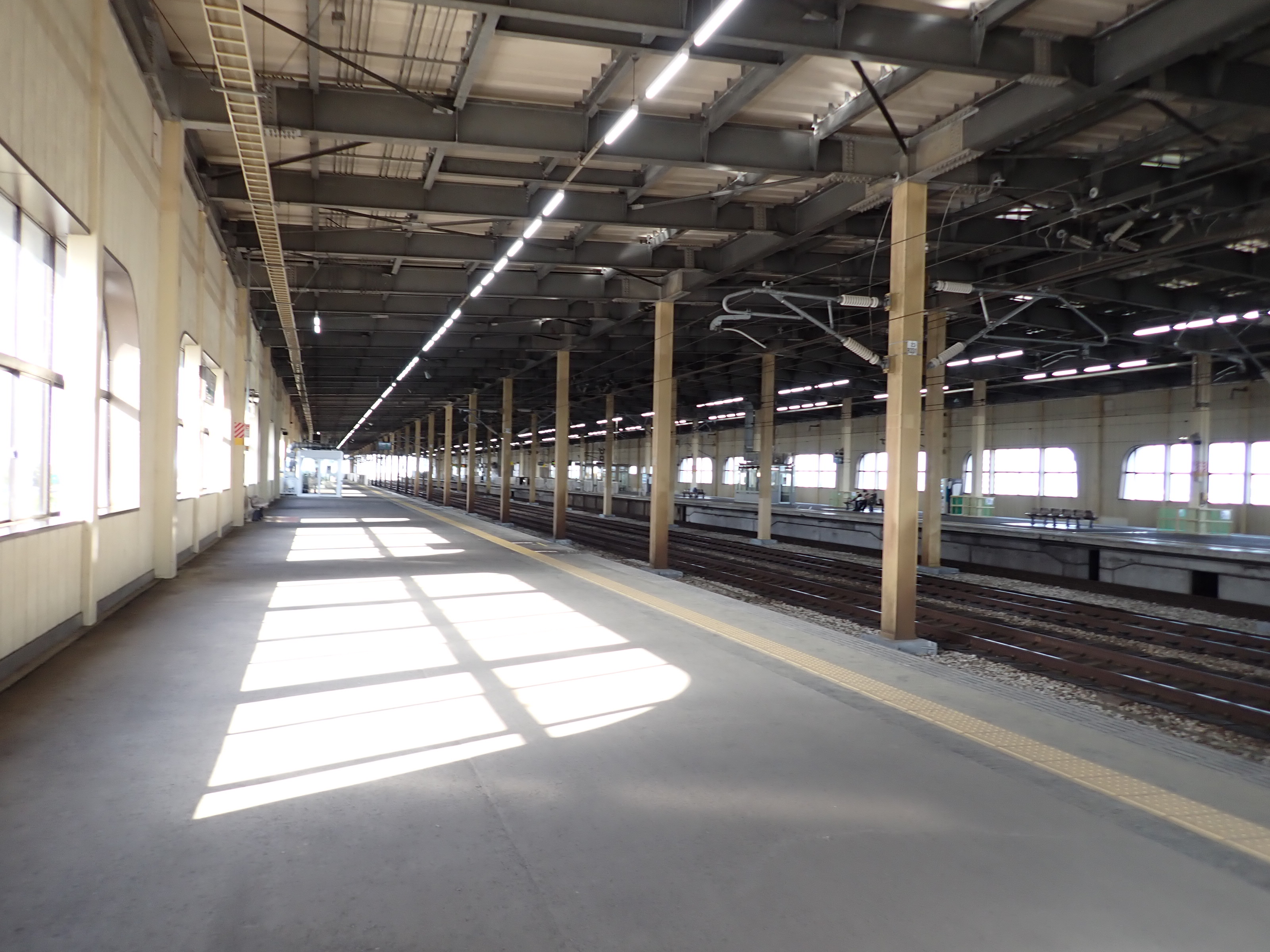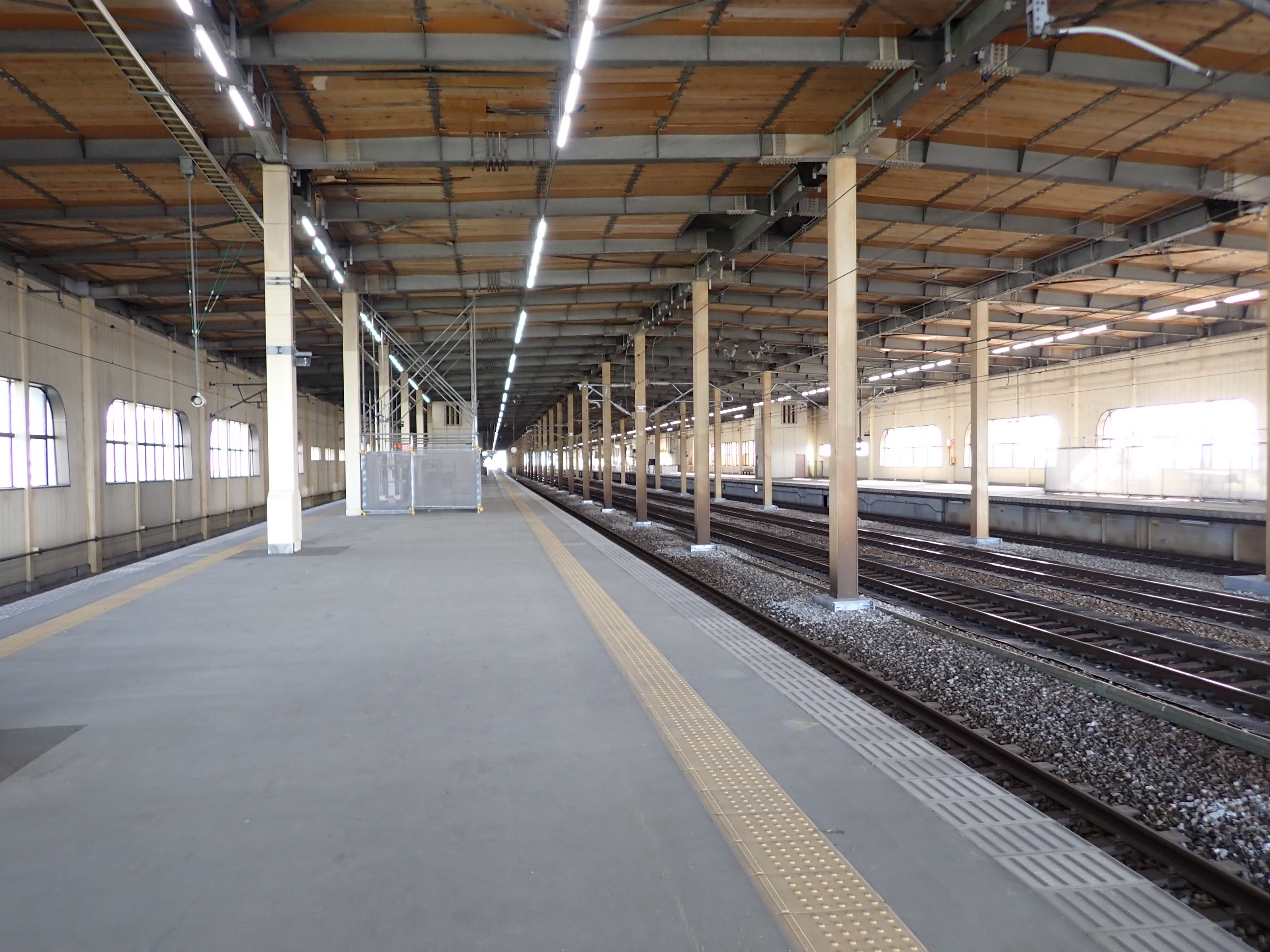 ホームの新潟駅側。現在、12両編成の列車が停車しない範囲。一部囲いがされています。