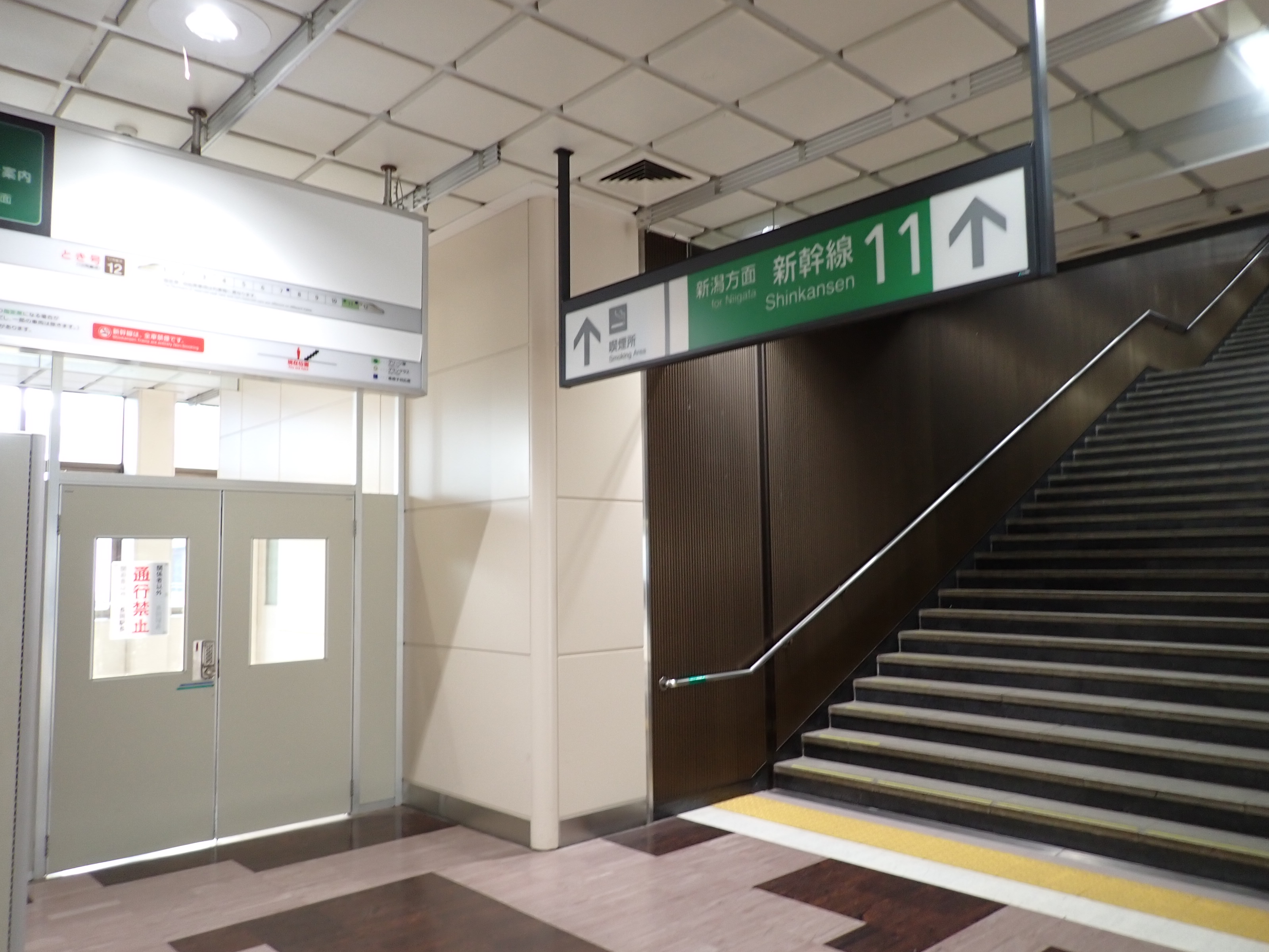 12番線の浦佐駅側の階段とエスカレーターの間、運転事務室。