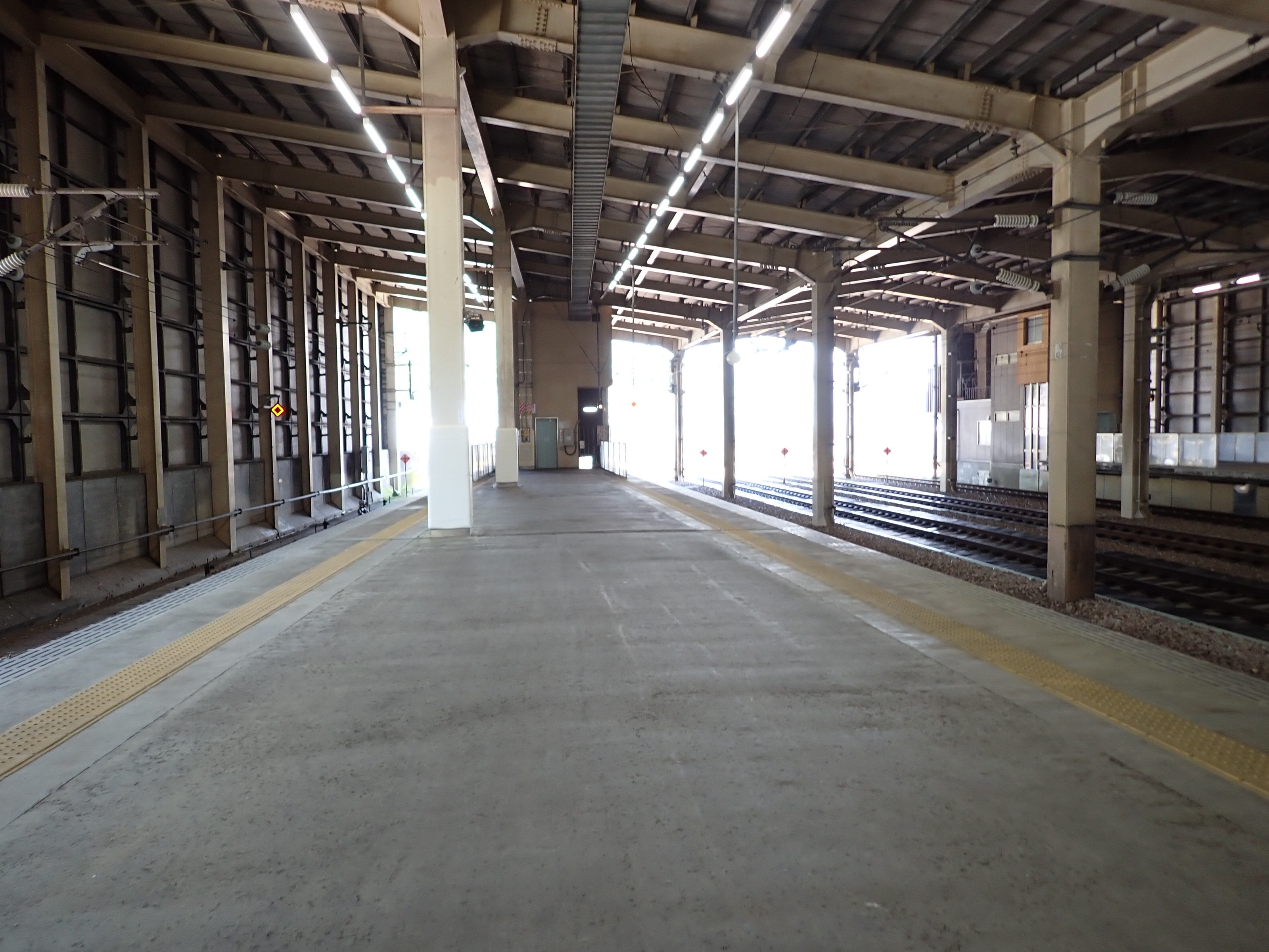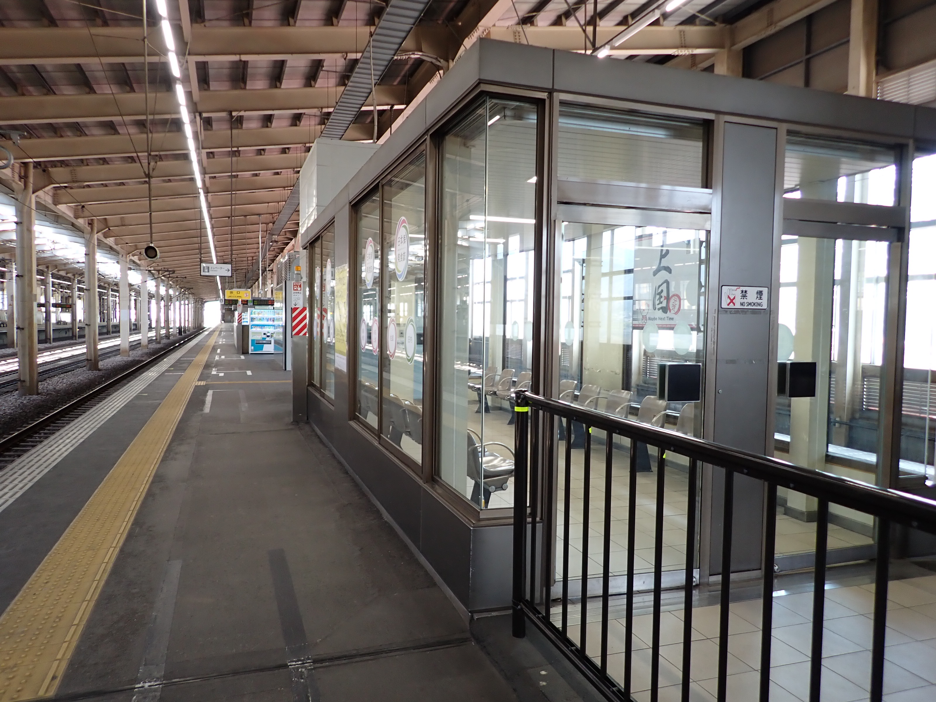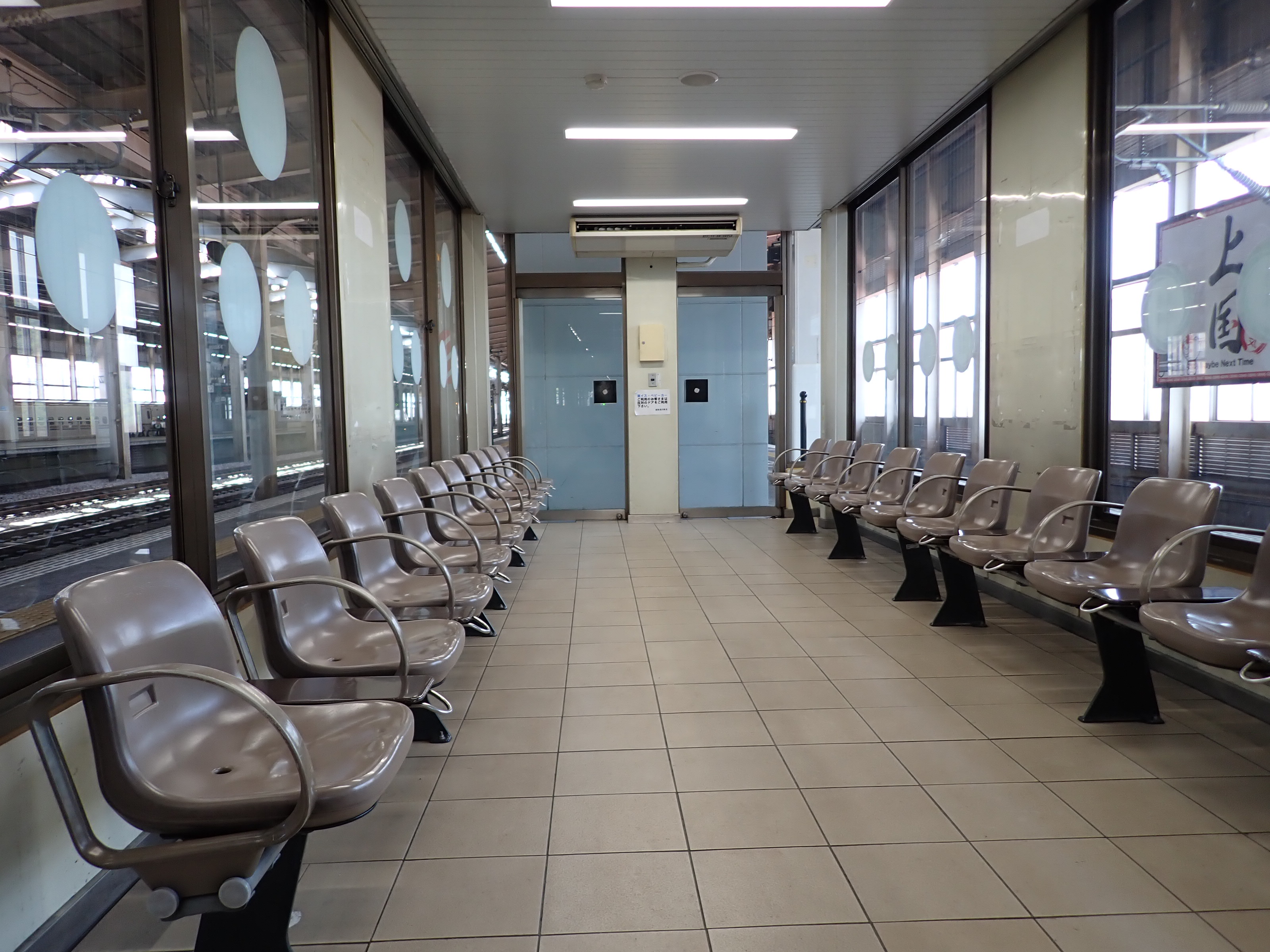 改札口に遠い側の両ホーム階段入口と使われていない待合室らしきスペース入口。