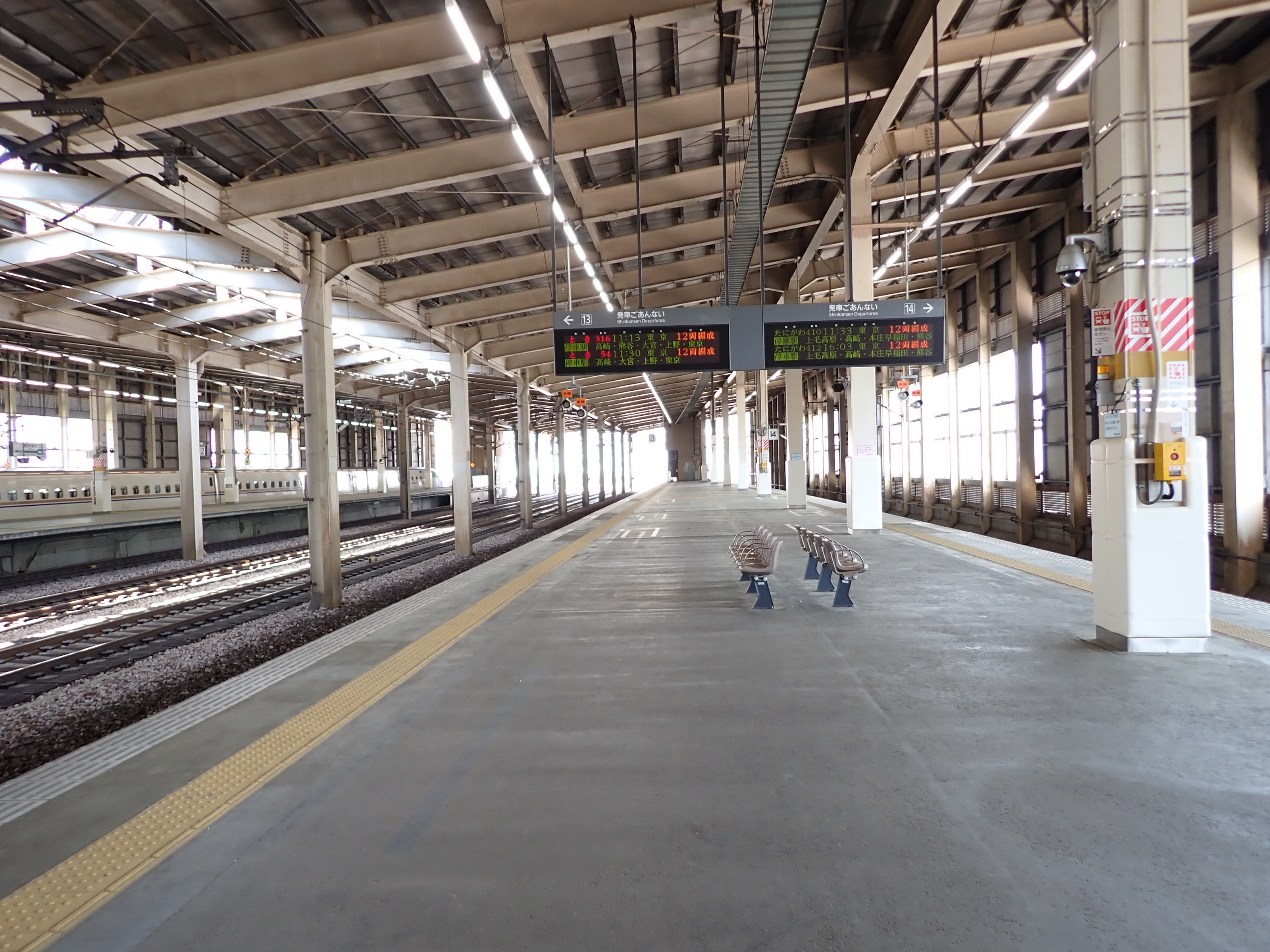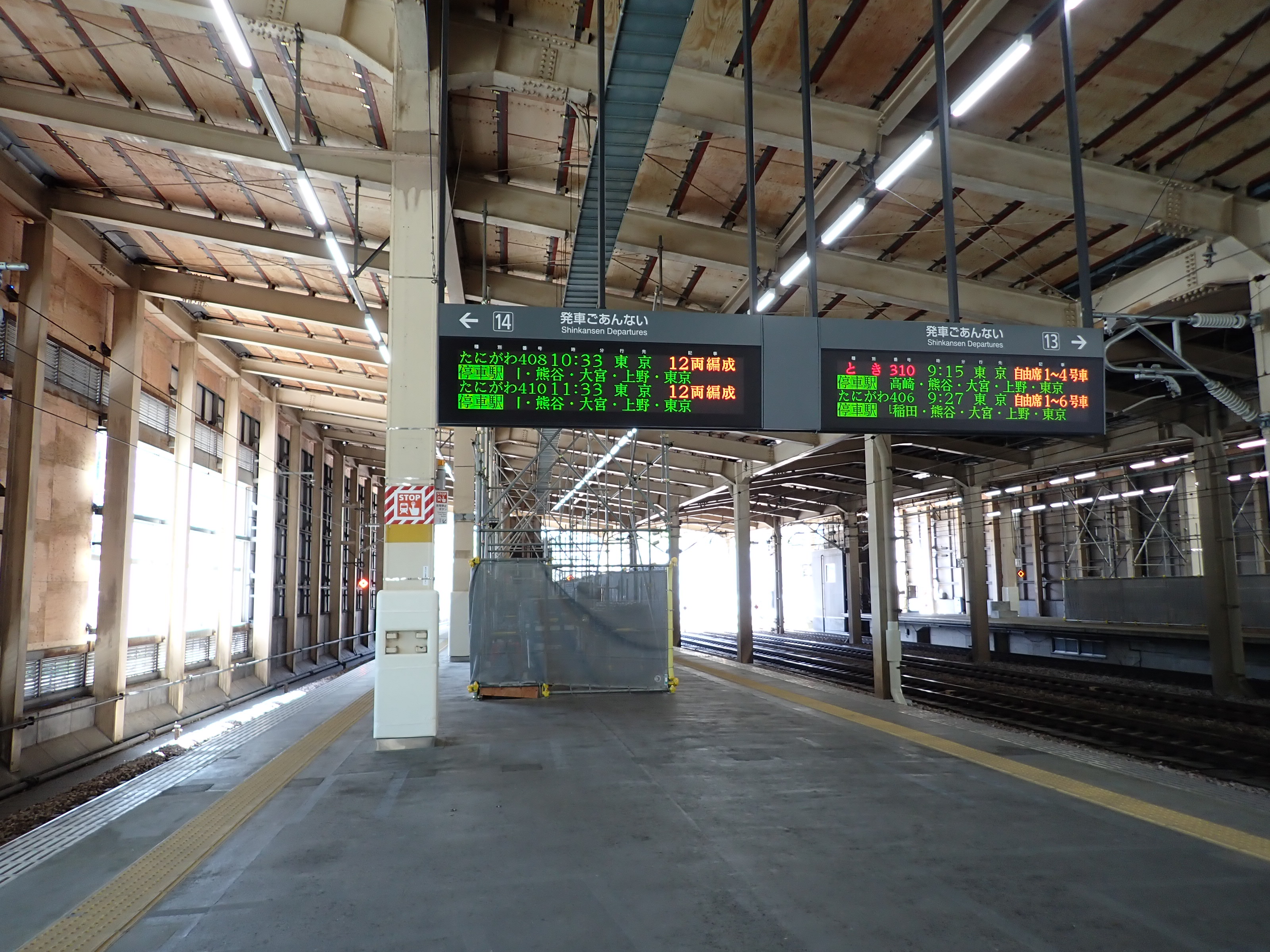 13・14番線の上毛高原駅側。12両編成に統一されてからは列車が停車しない範囲になりました。