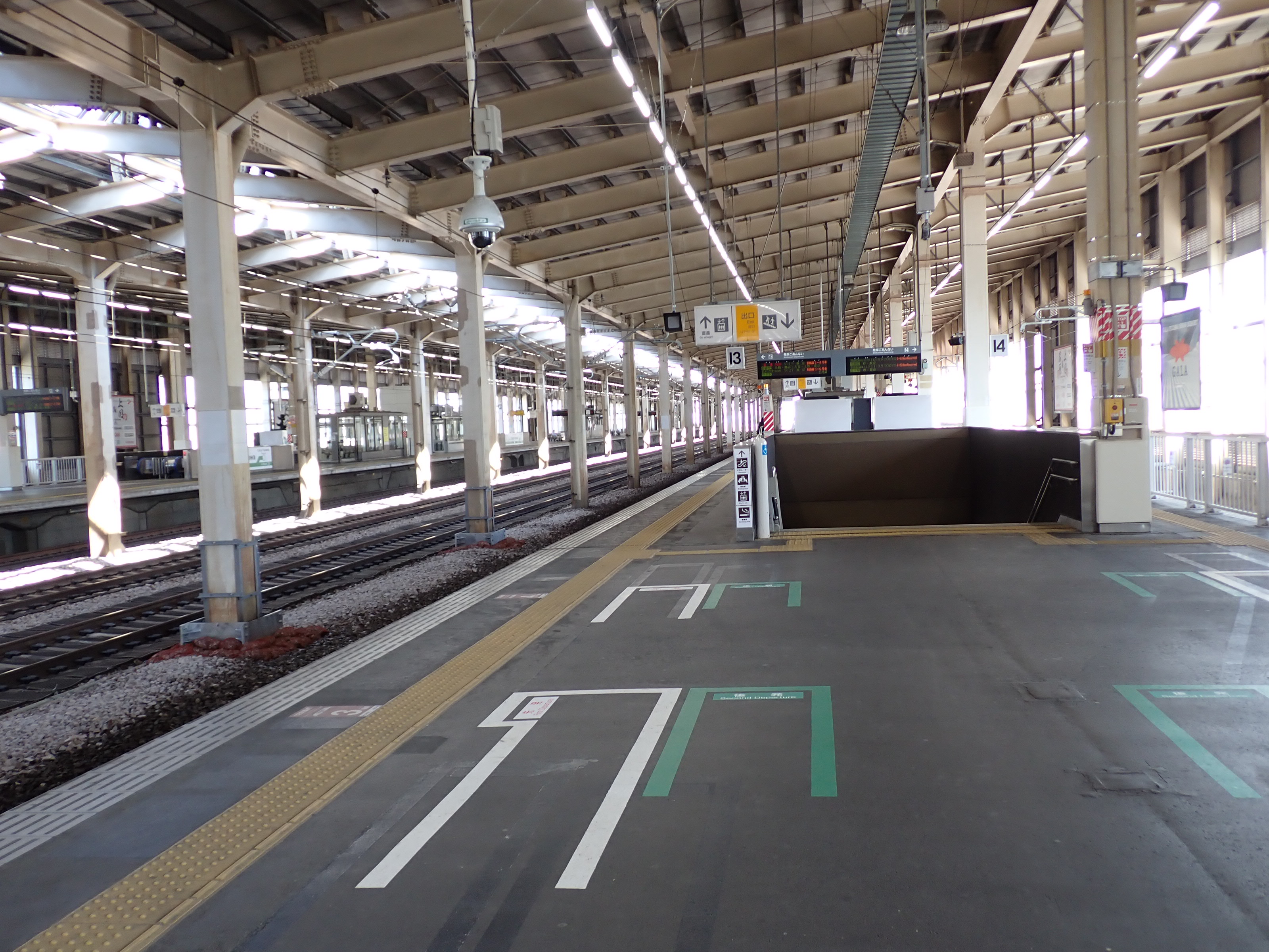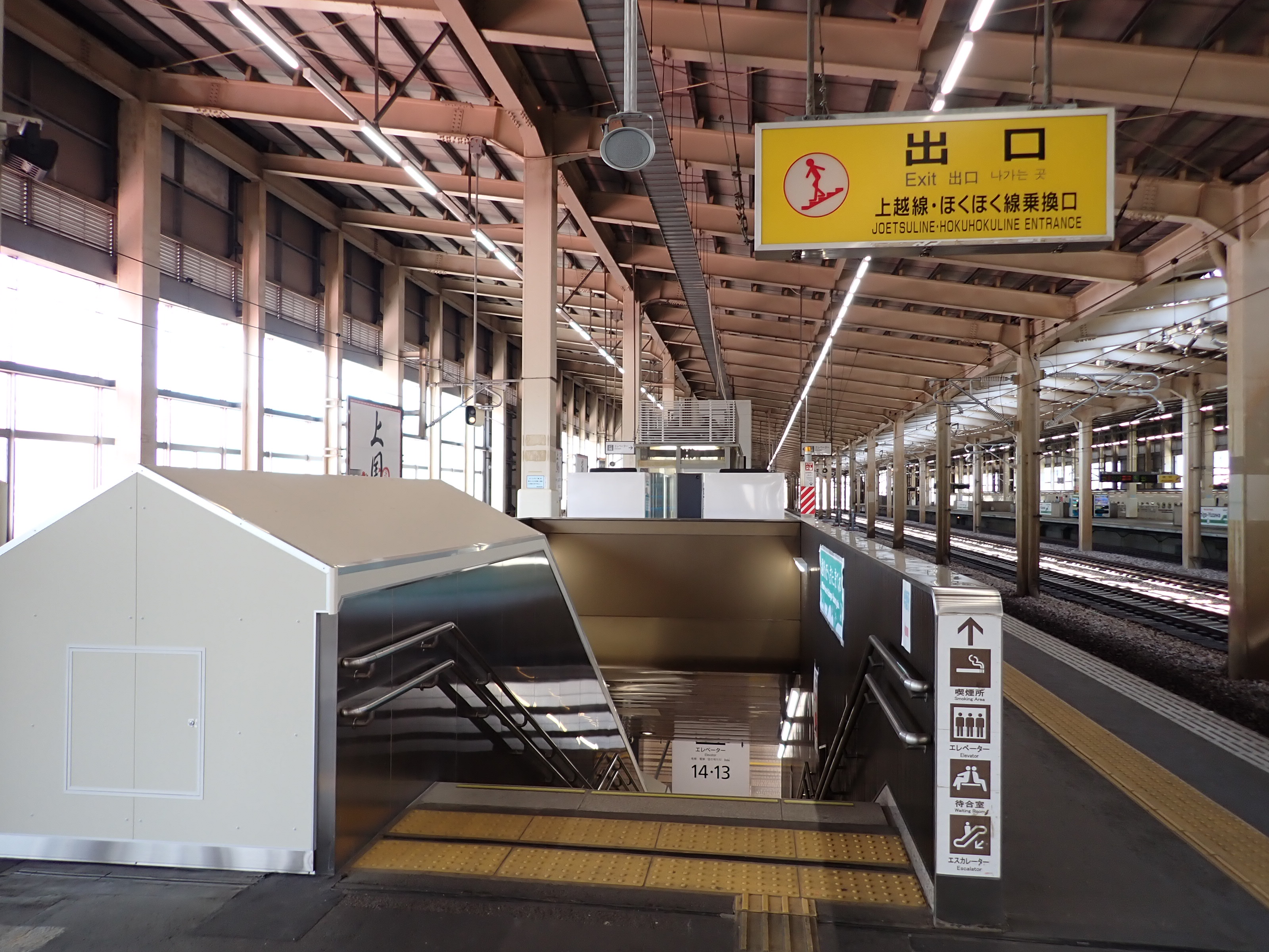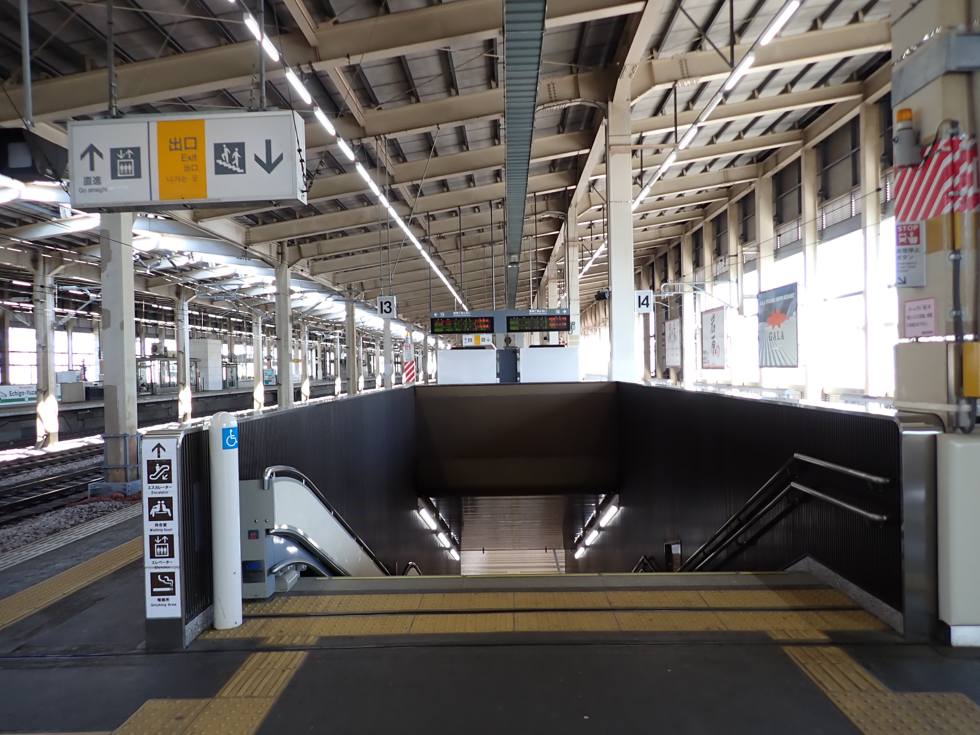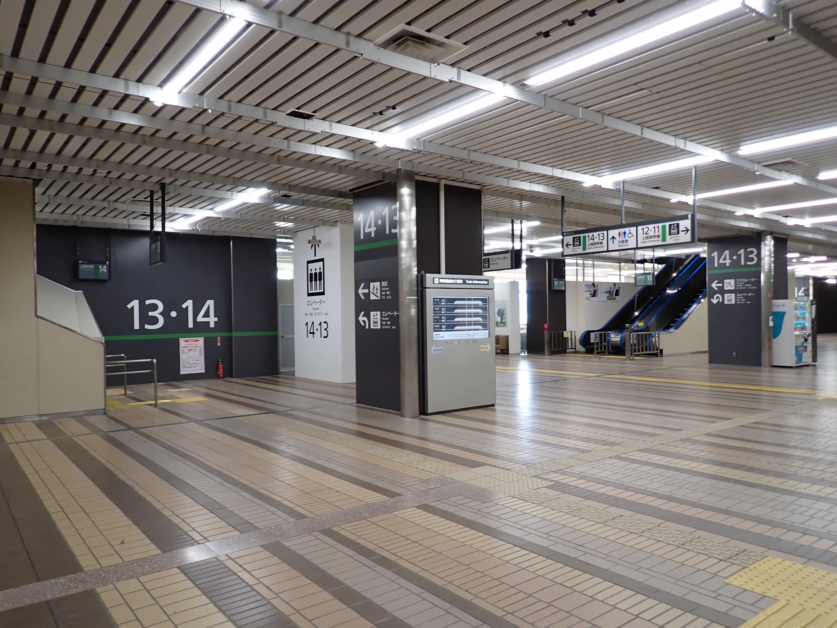 13・14番線の改札口に近い側の階段・エスカレーターの遠景。