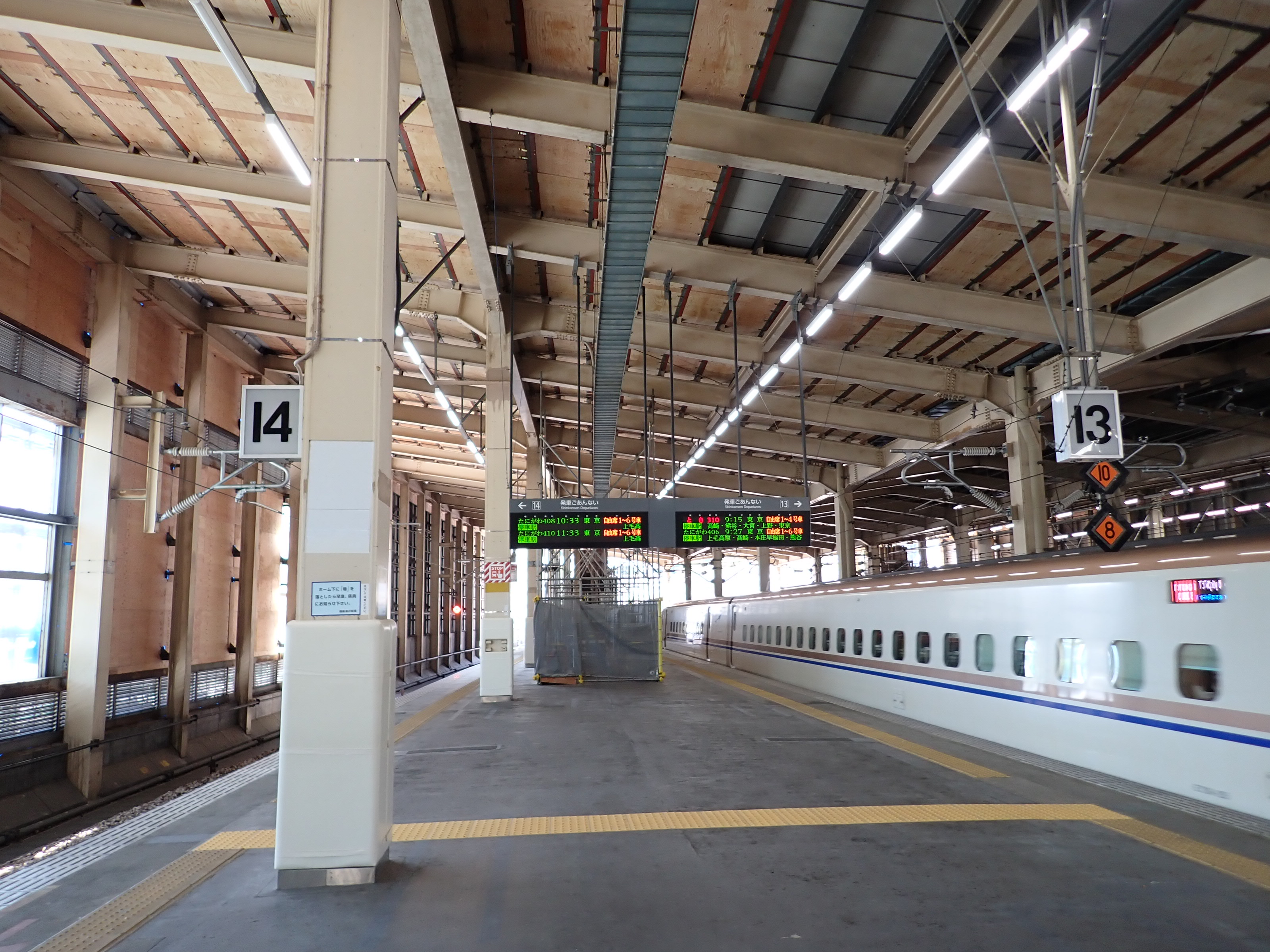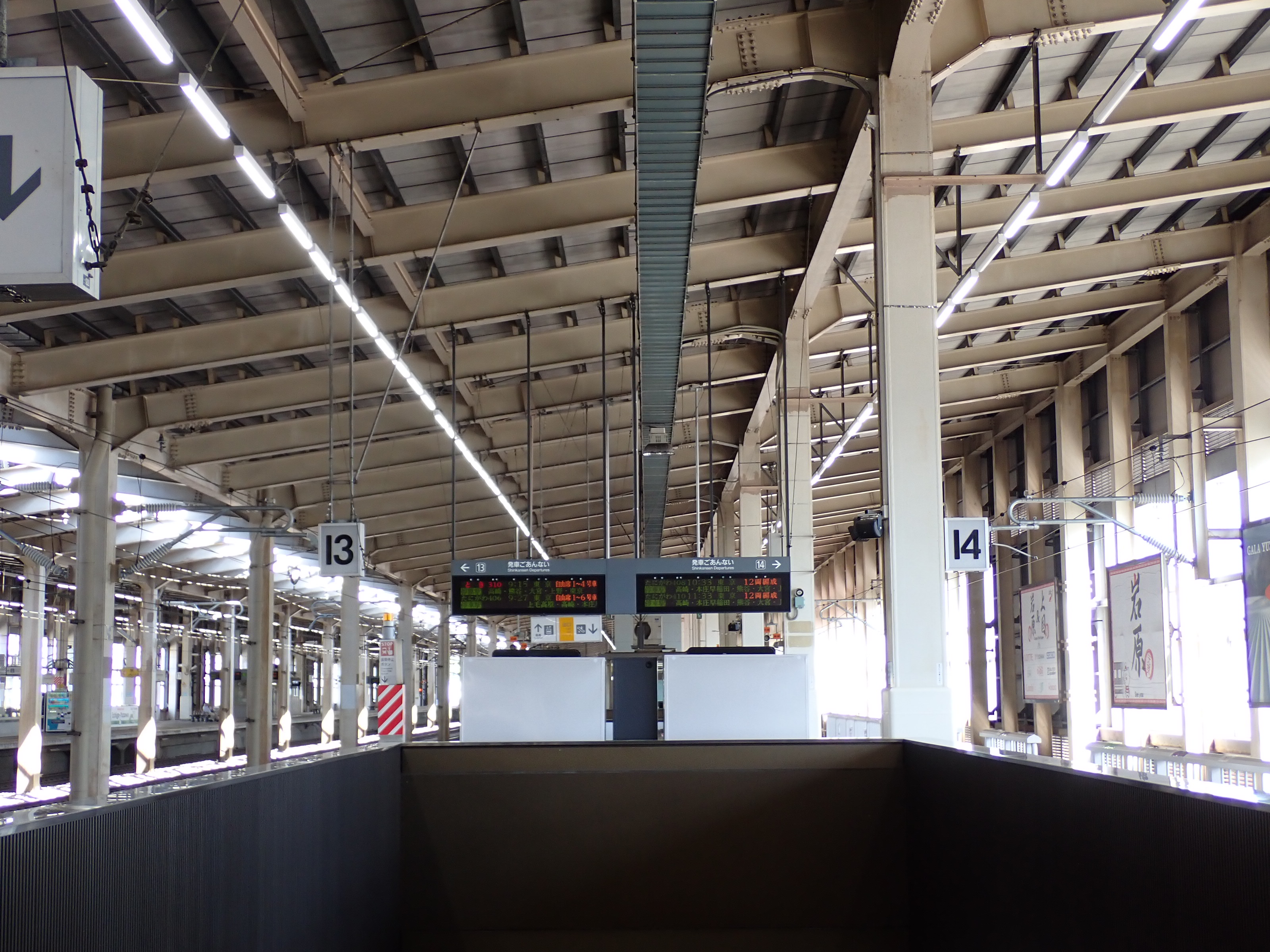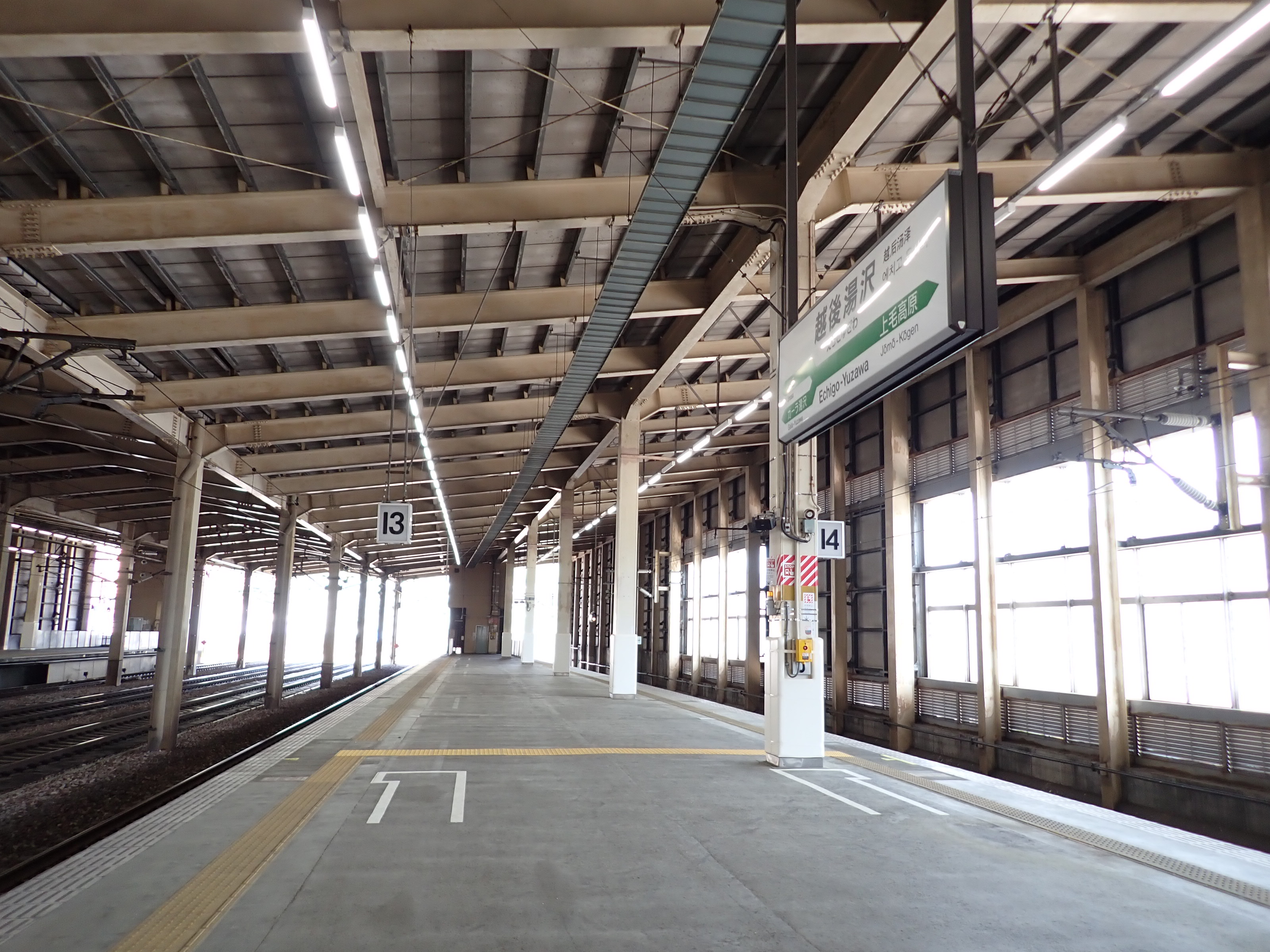 13・14番線の上毛高原駅側。この駅は両ホームに何台もこの番線標があります。