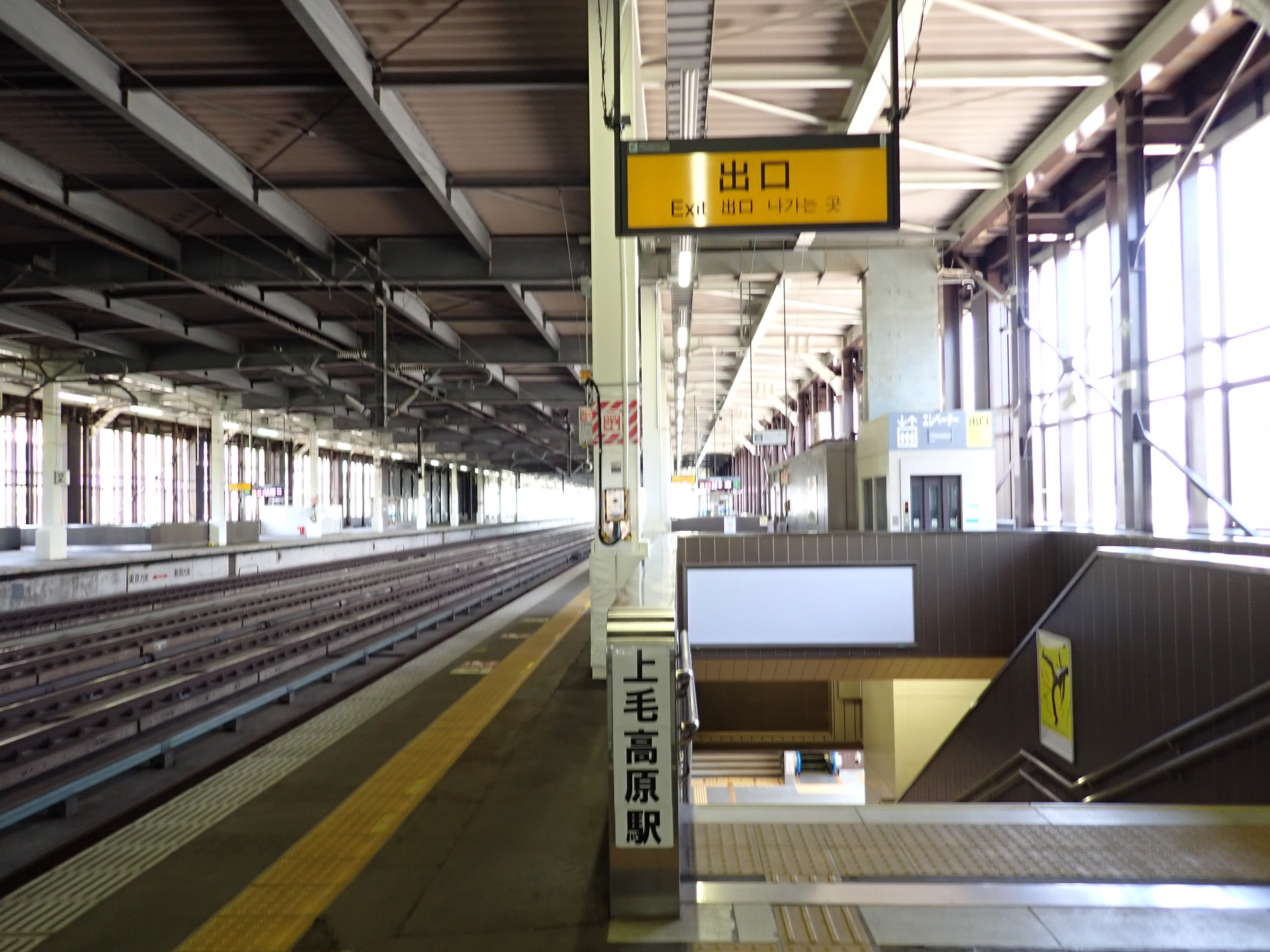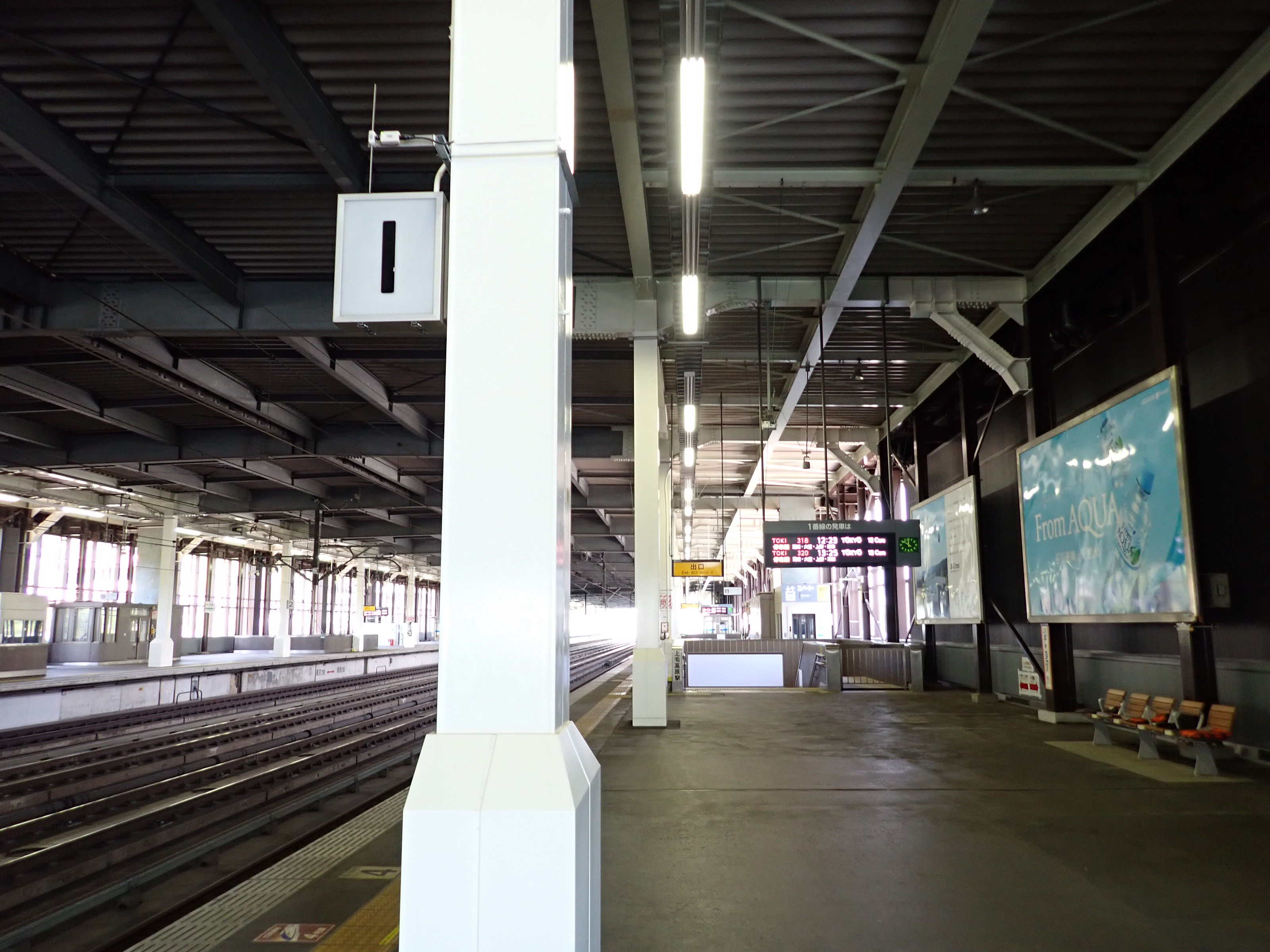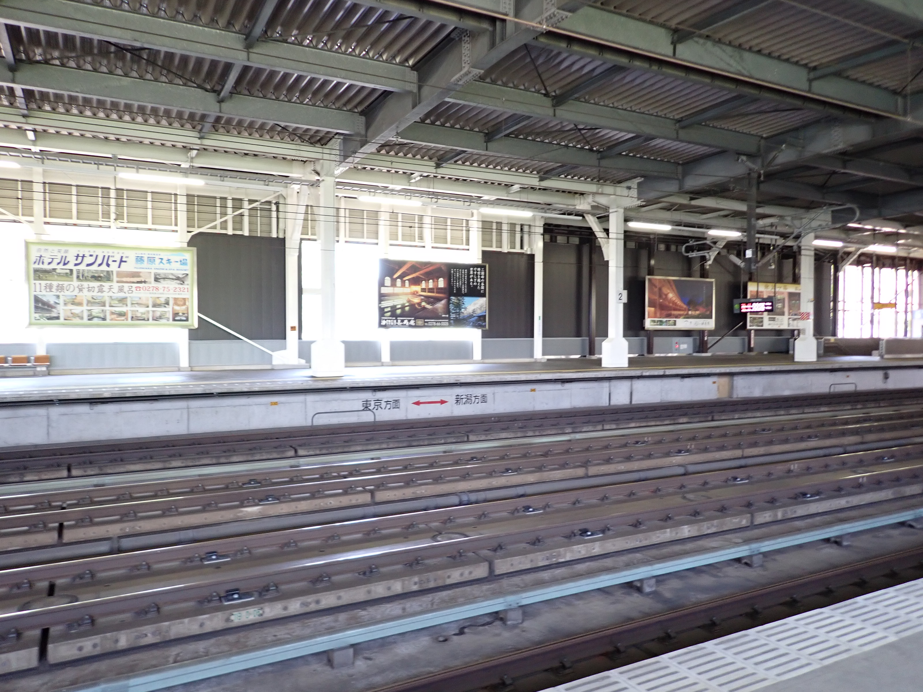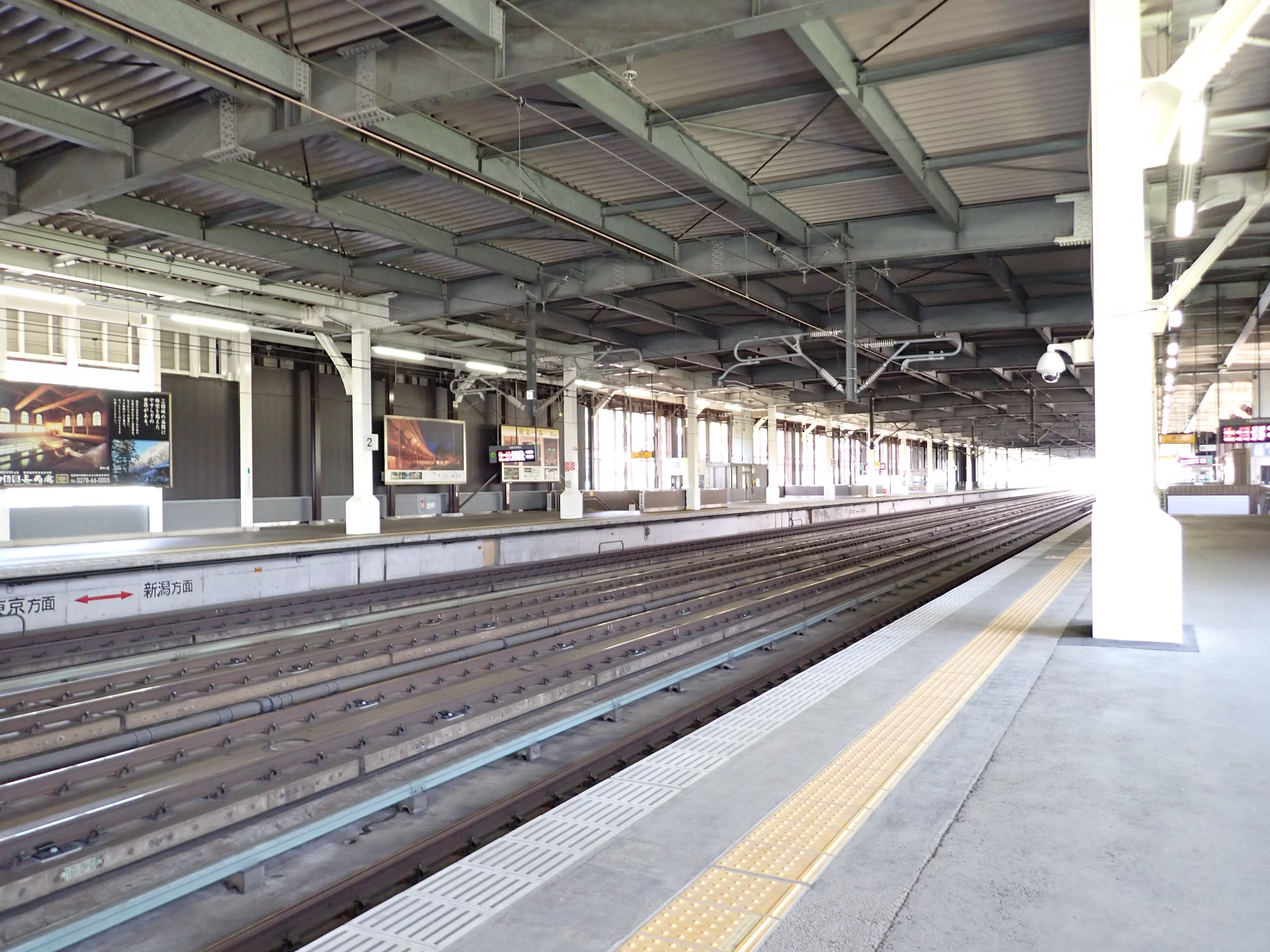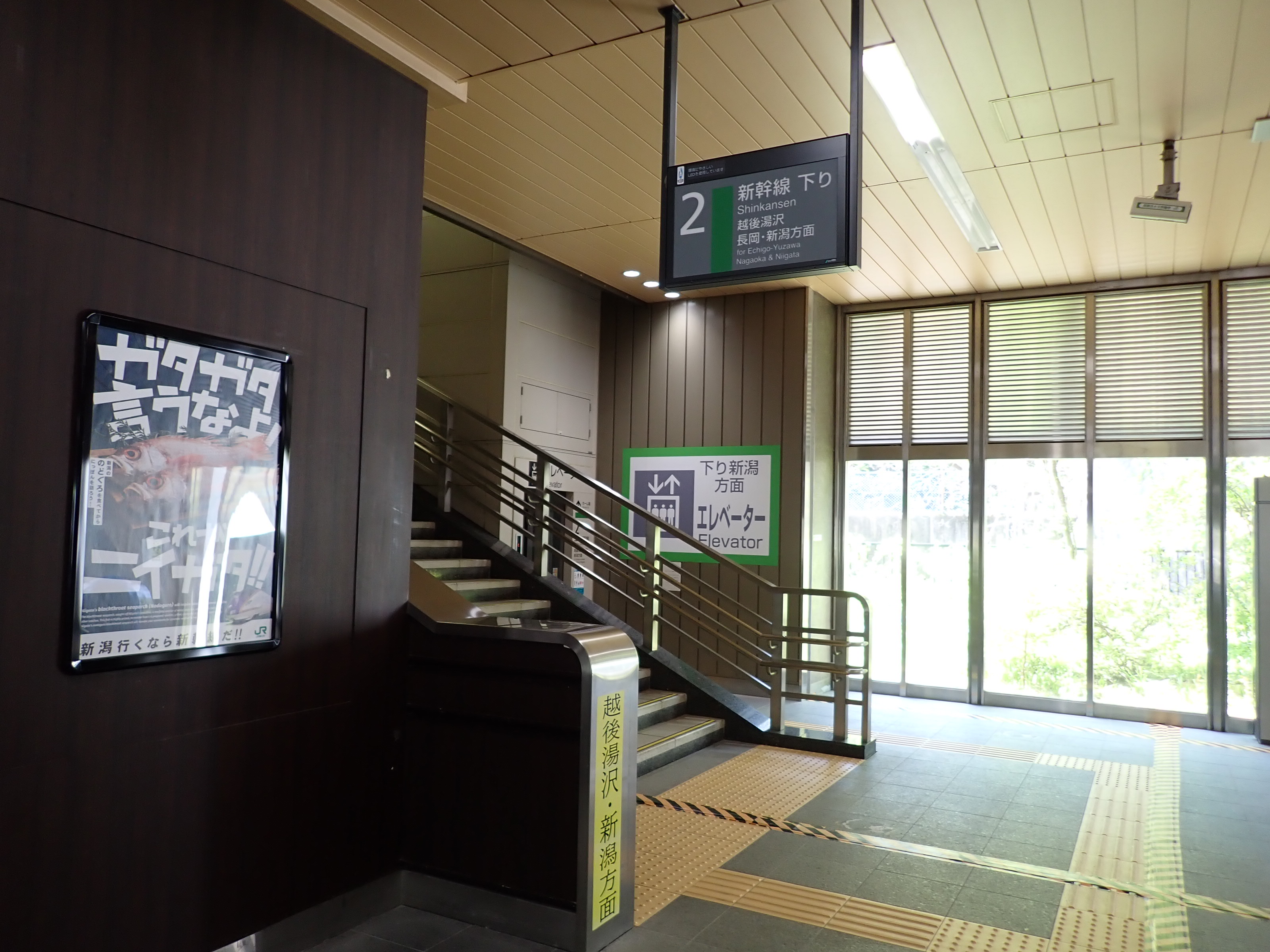 2番線両側の階段と上越新幹線のポスター。