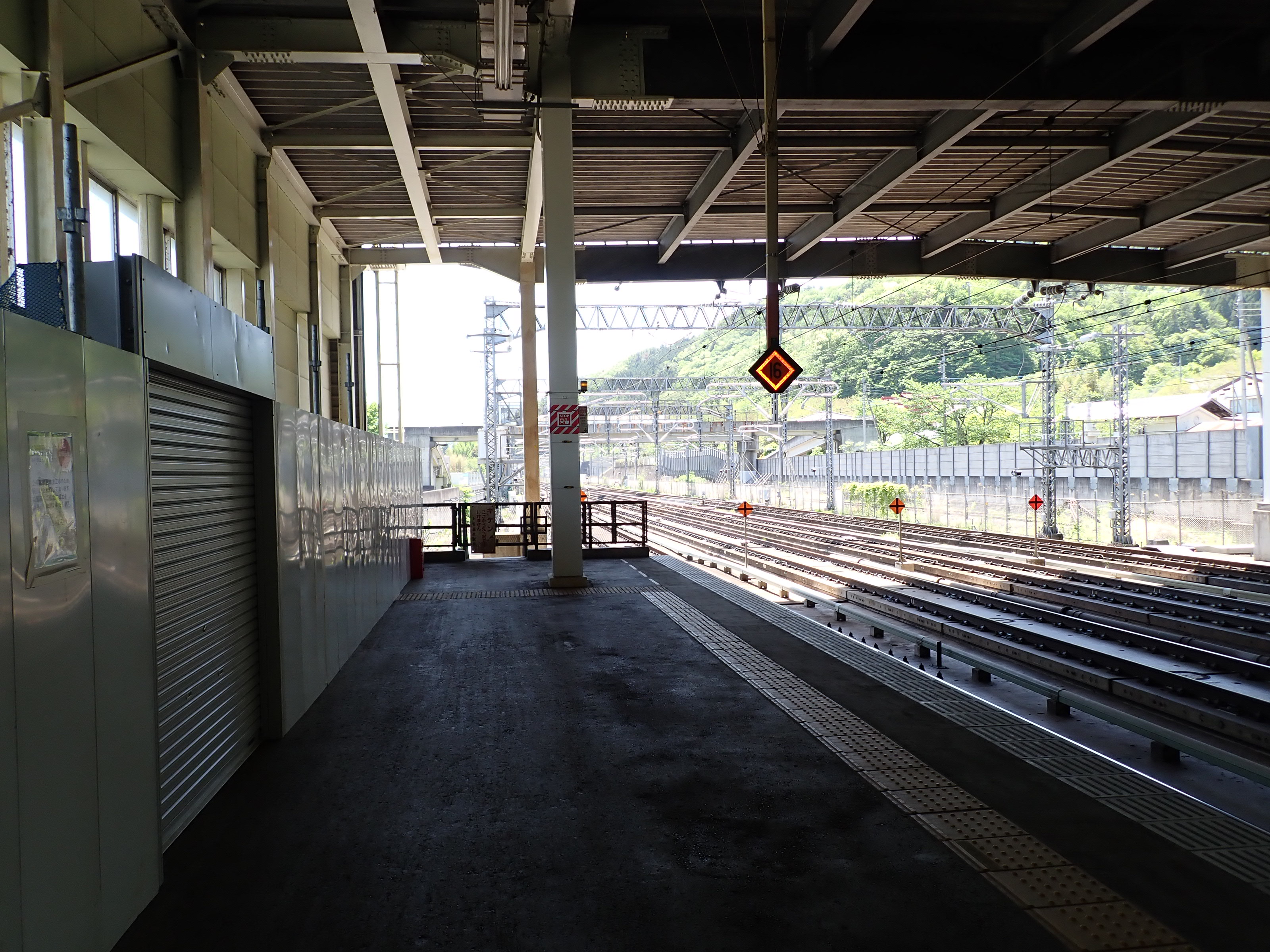 階段と階段の間の運転事務室とそこから見た2番線。