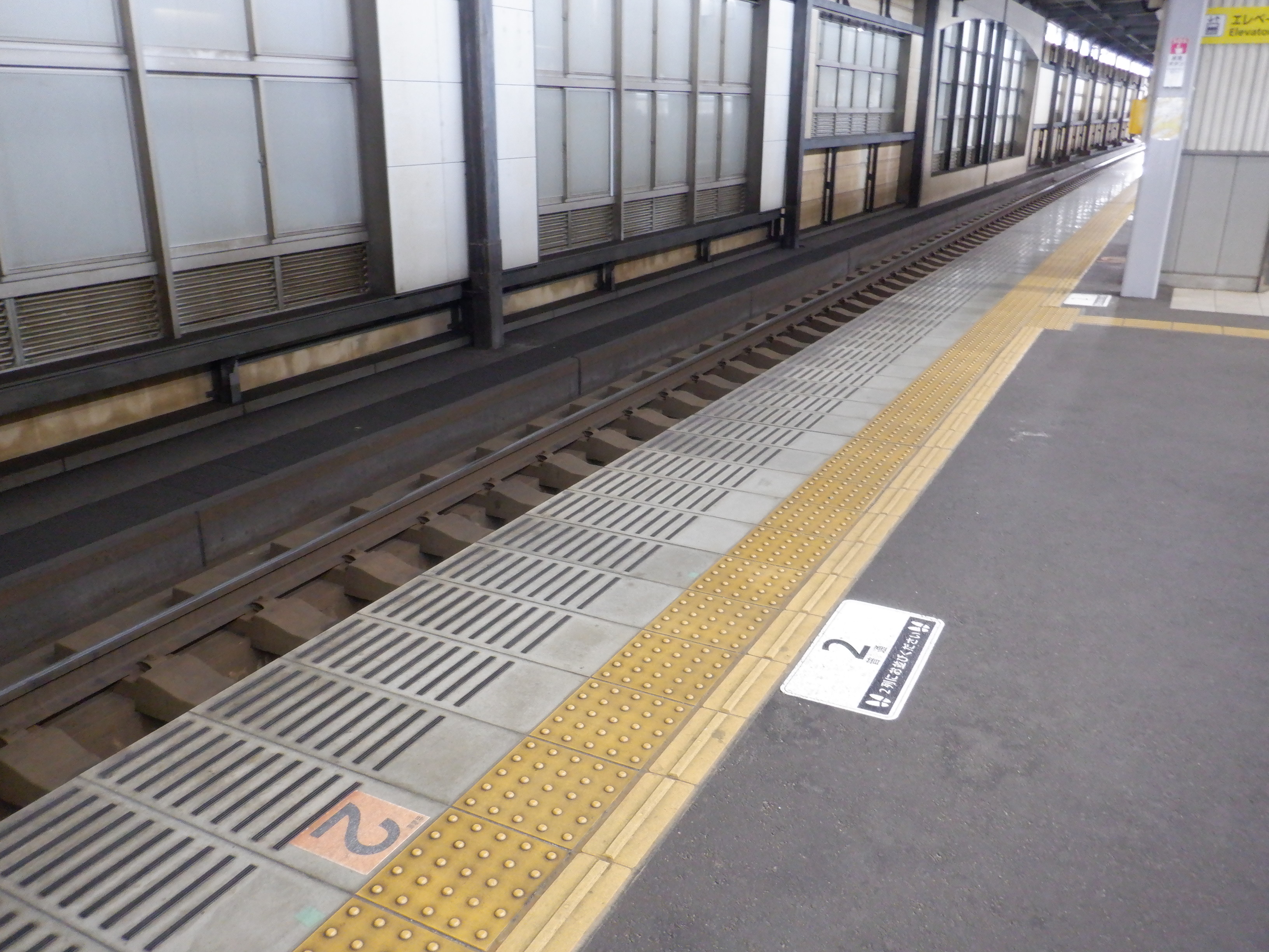 2番のりばの普通列車乗車位置案内。3番のりばより小さいものが使われています。