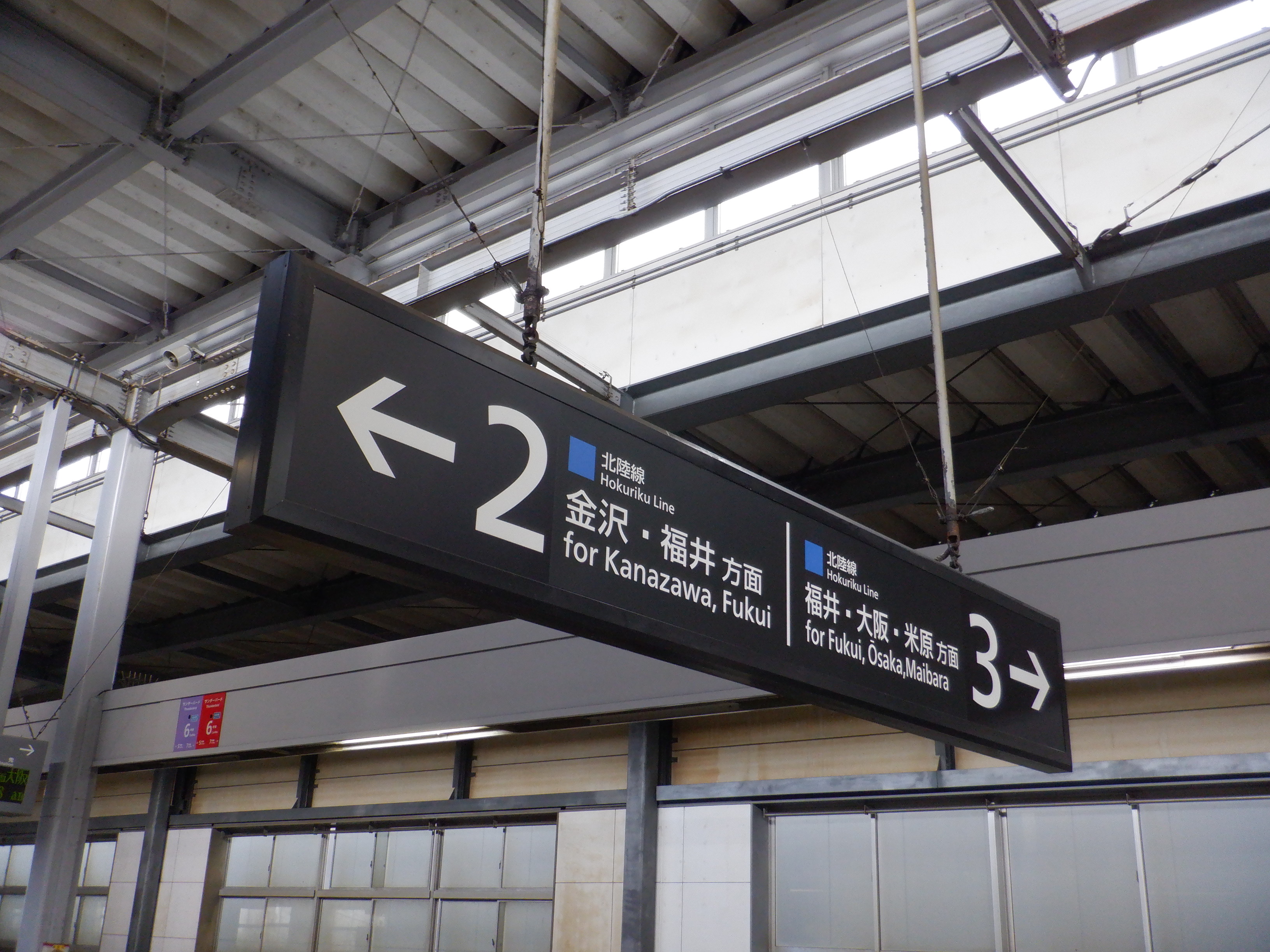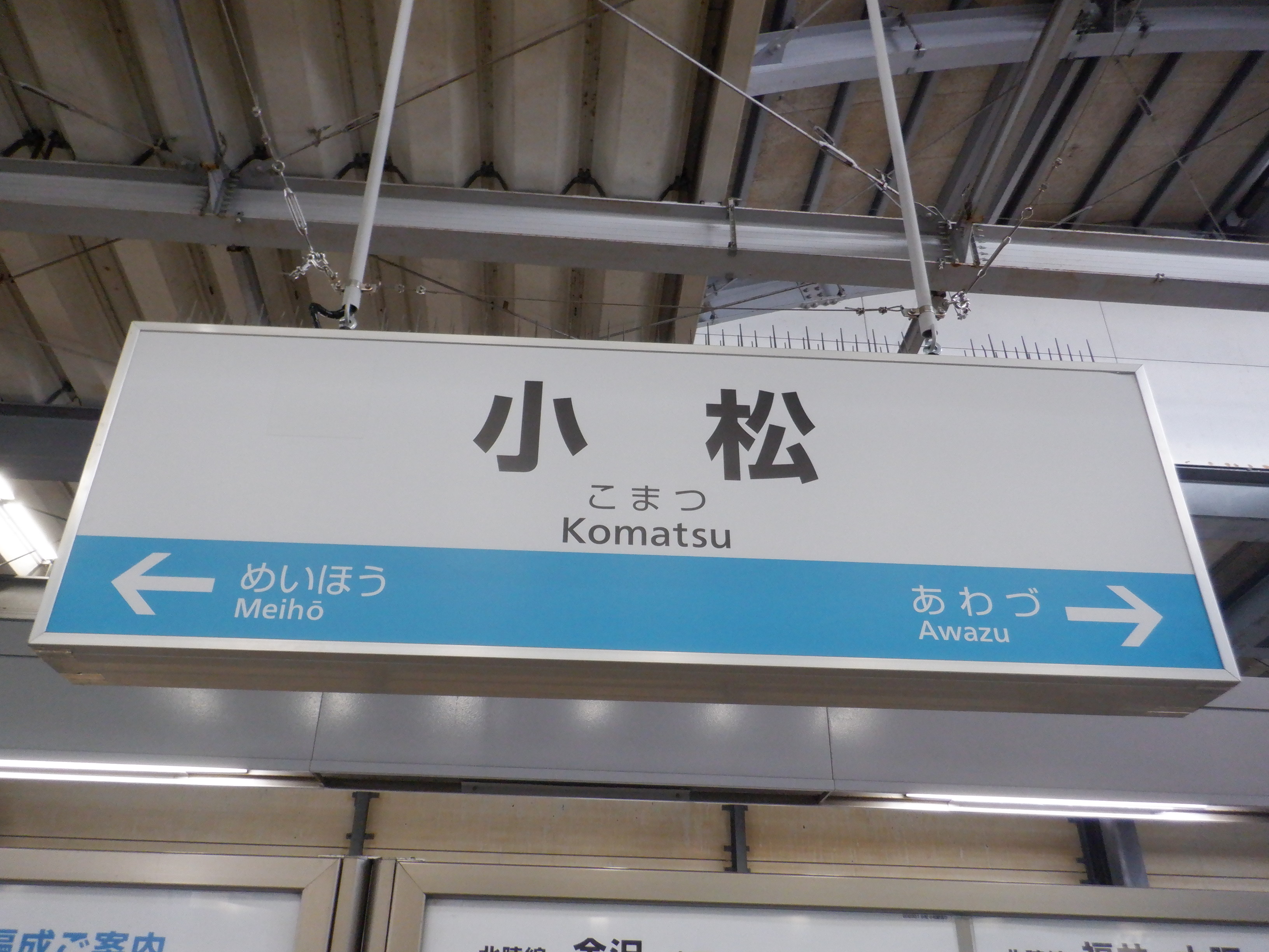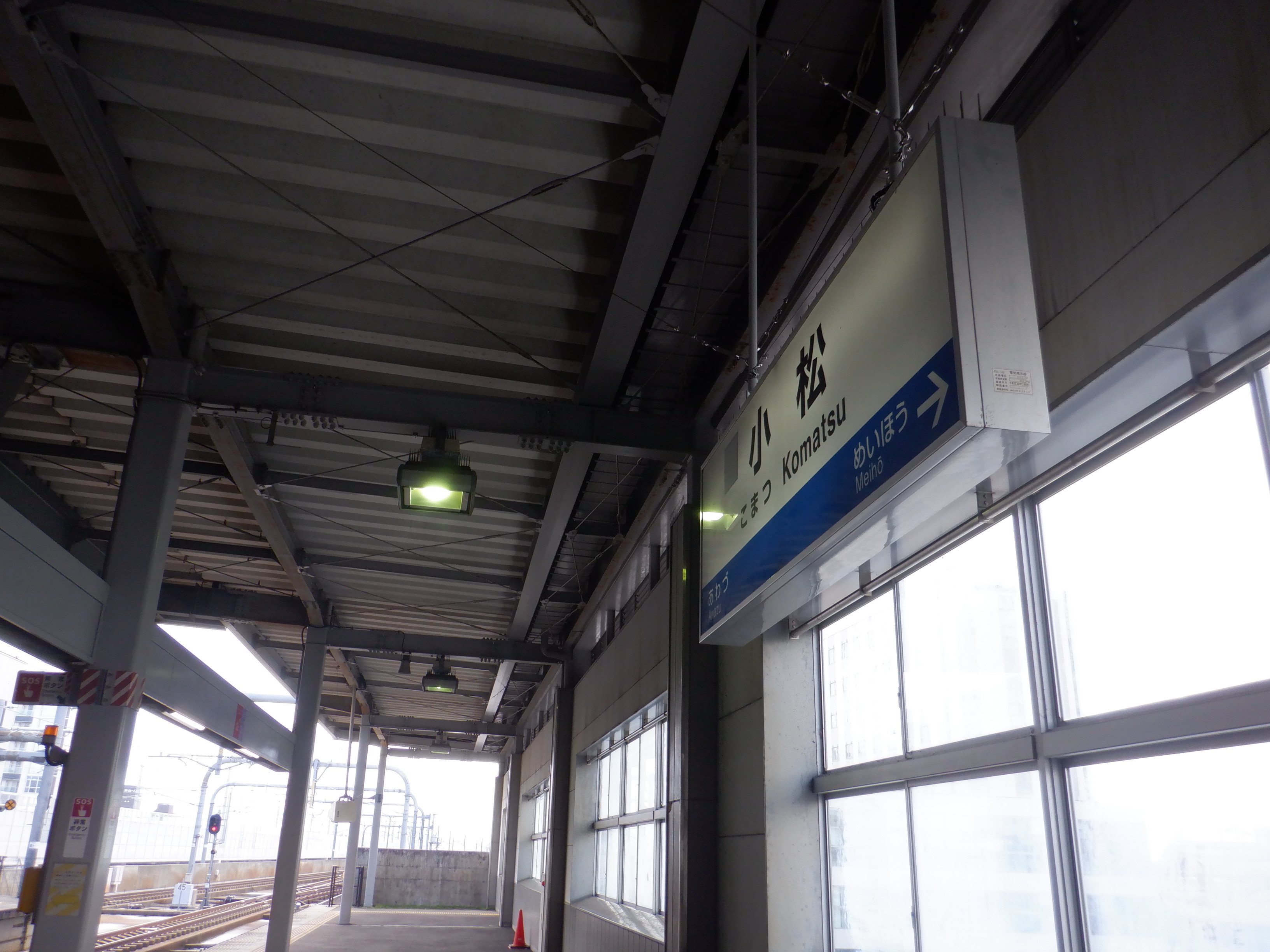 2・3番のりば明峰駅側の階段・エスカレーター寄りの駅名標。IRいしかわ鉄道のものに差し替わっていますが、ロゴがあると思われるところはシールが貼られています。