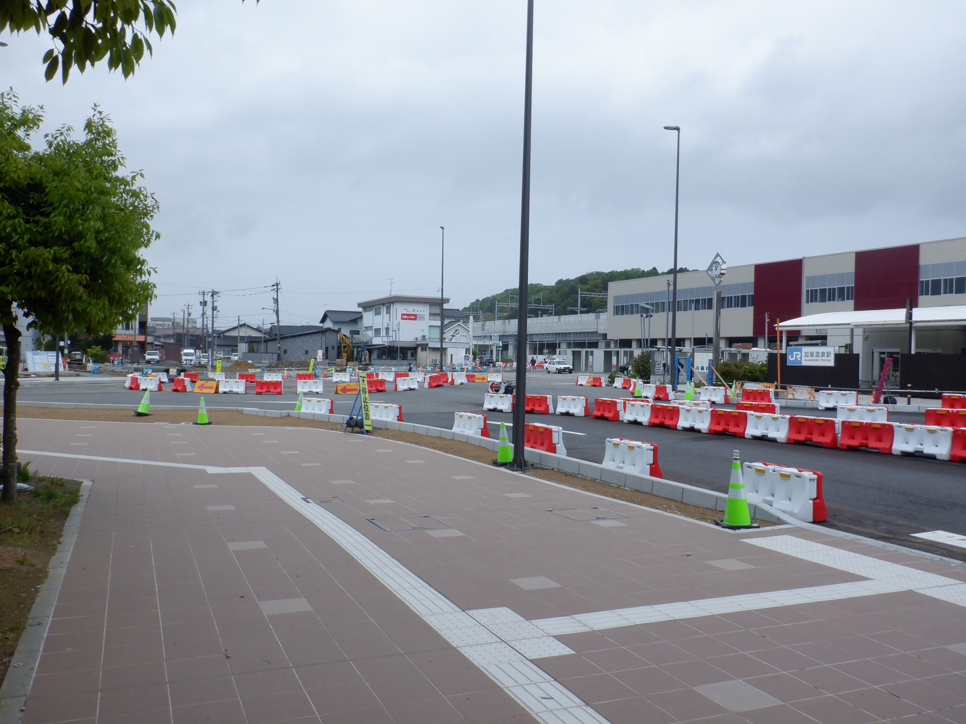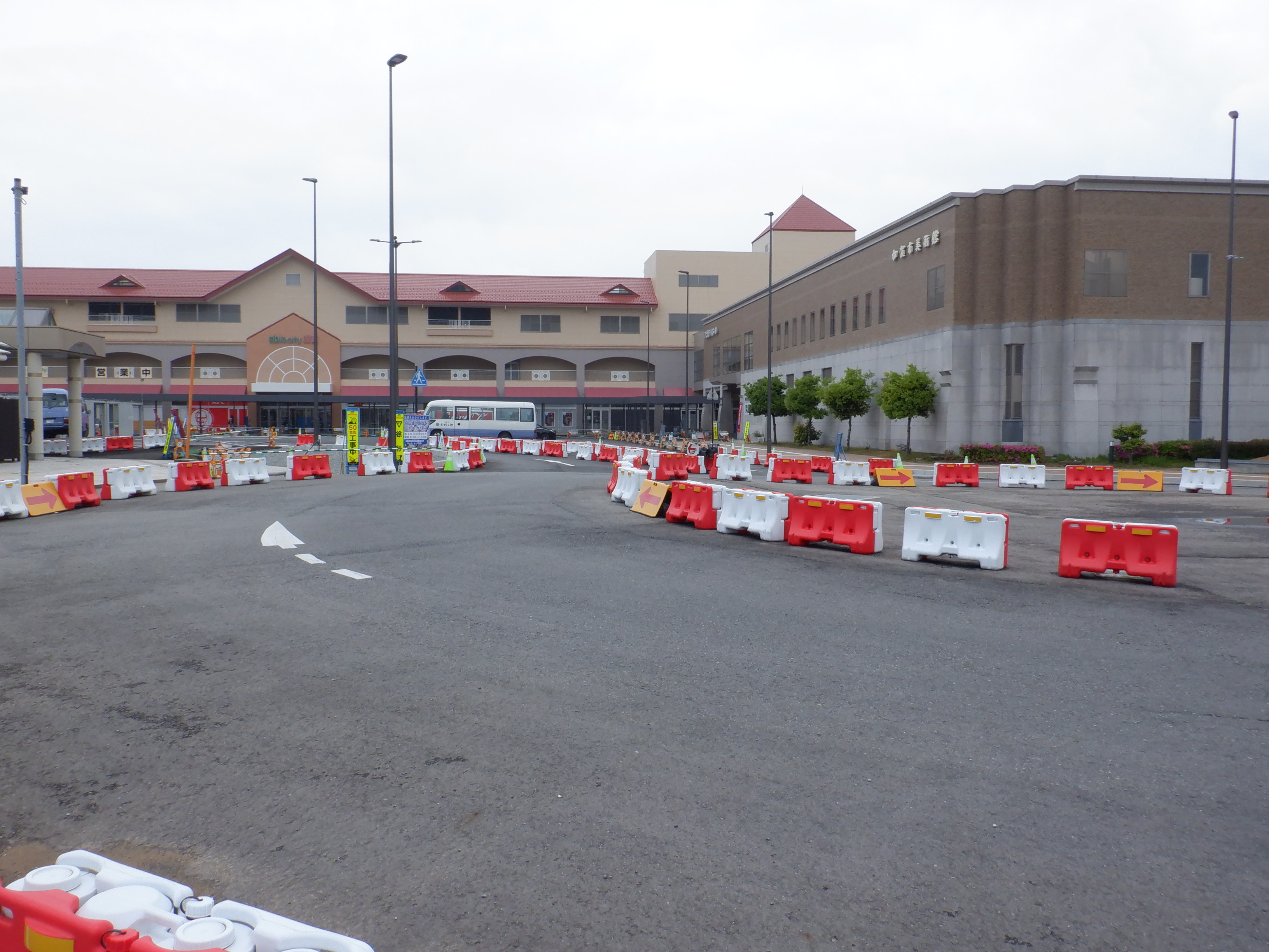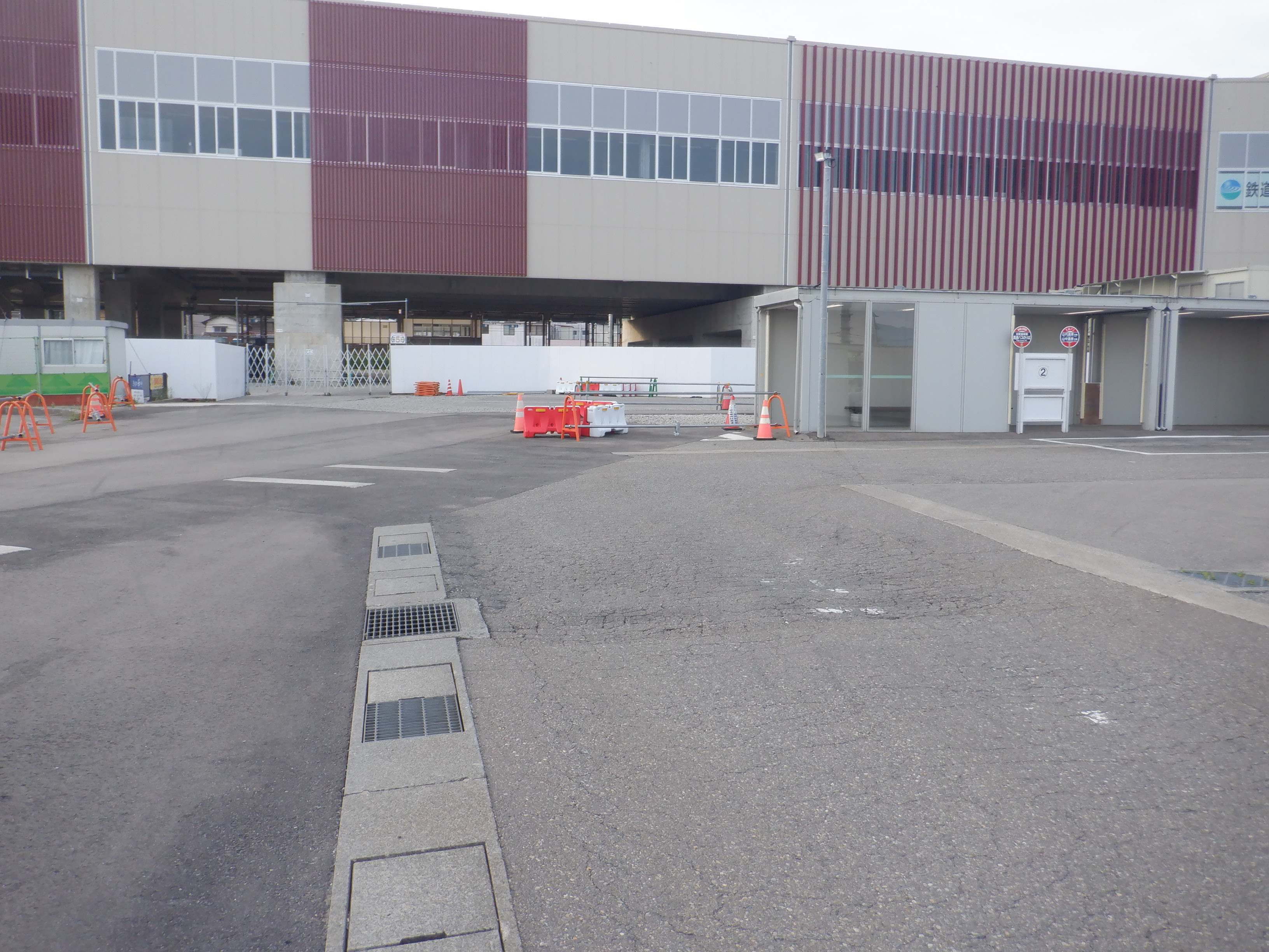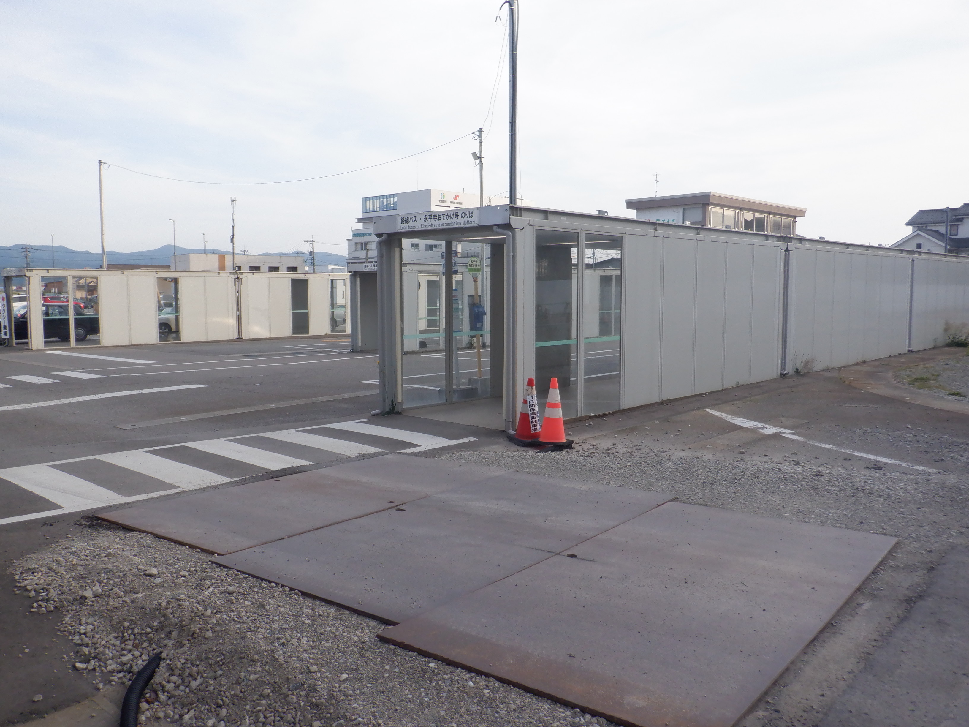 仮設駅舎の横から見た仮設バスのりばとかつてのバスのりば。
