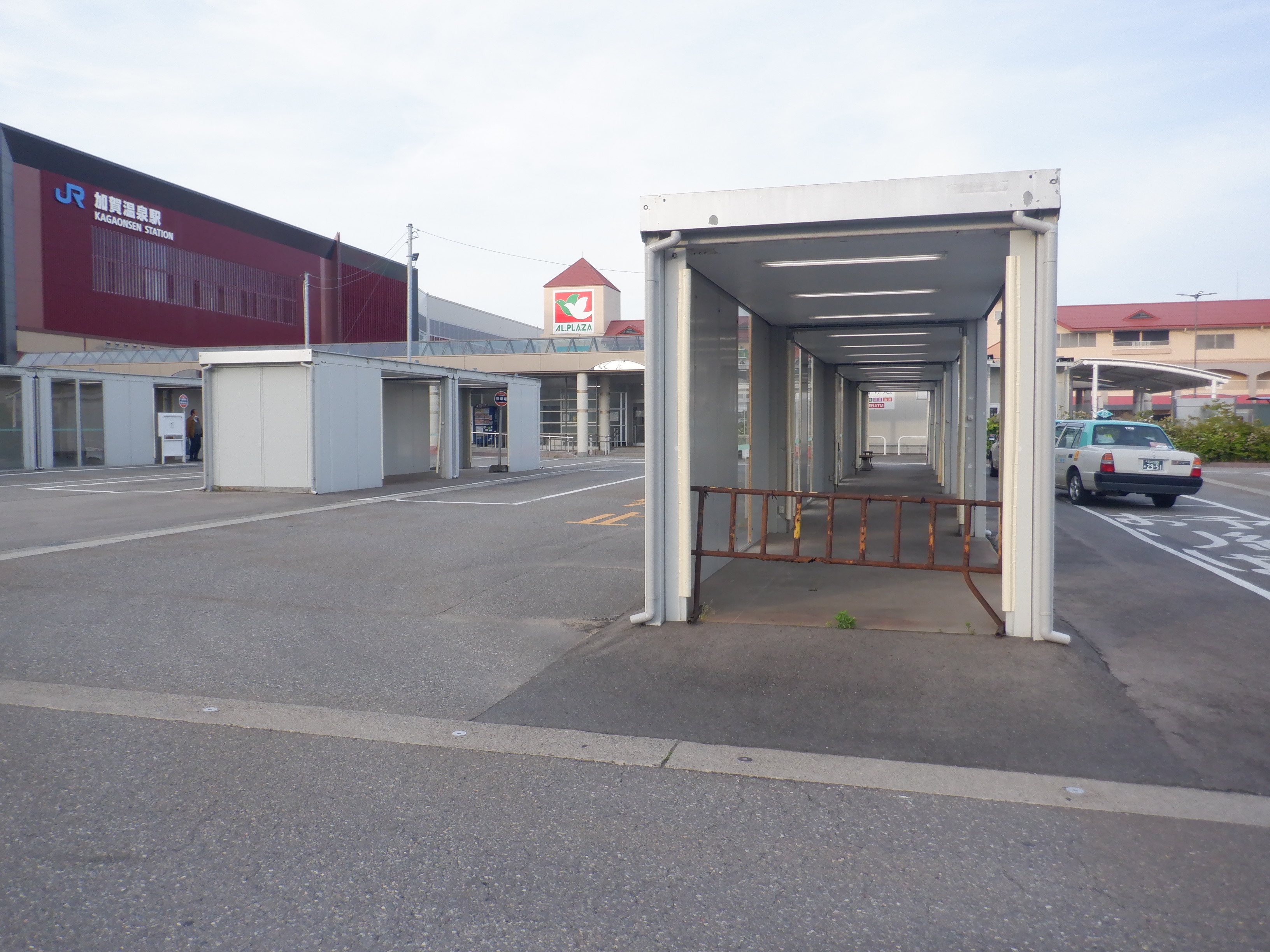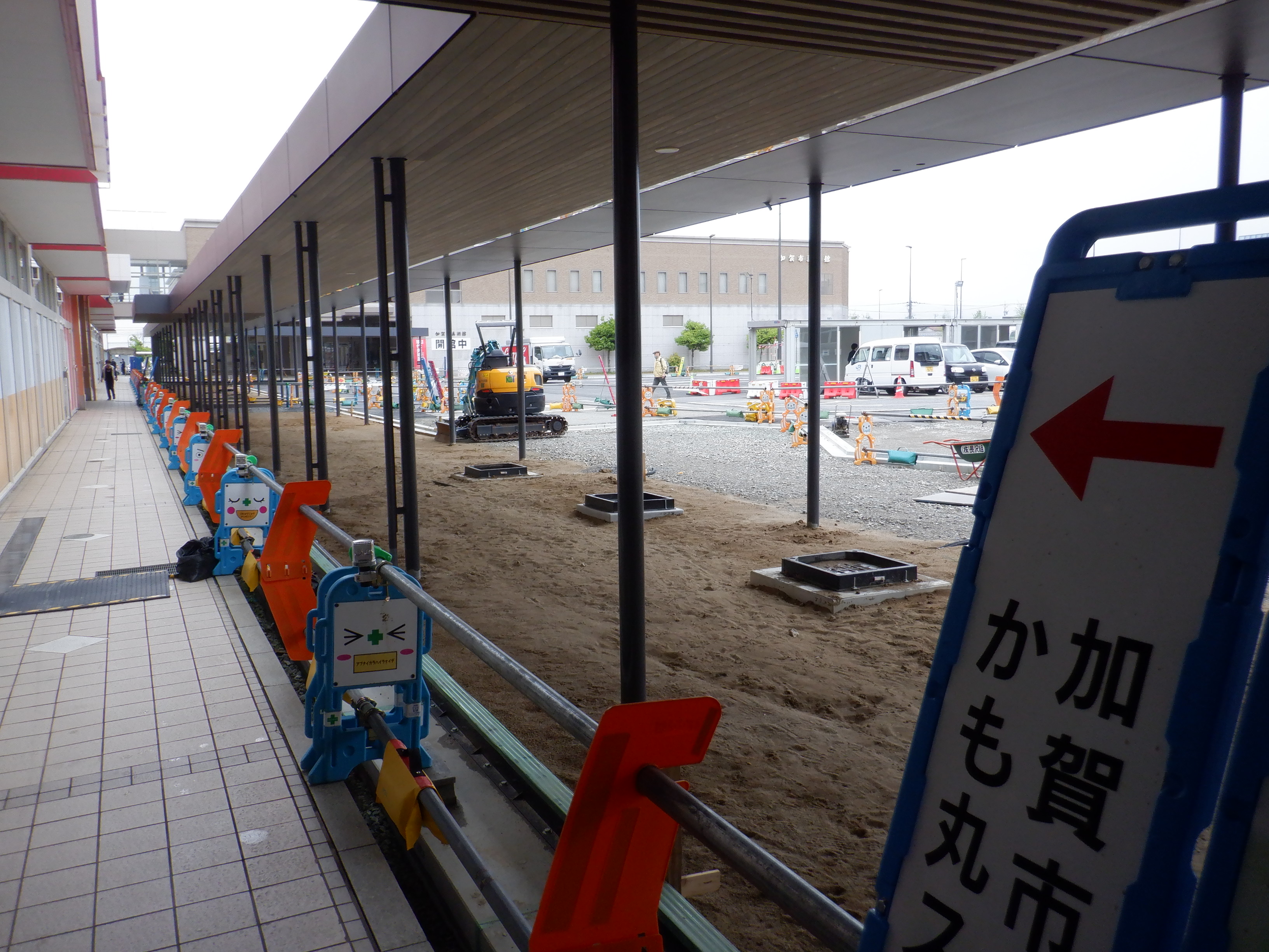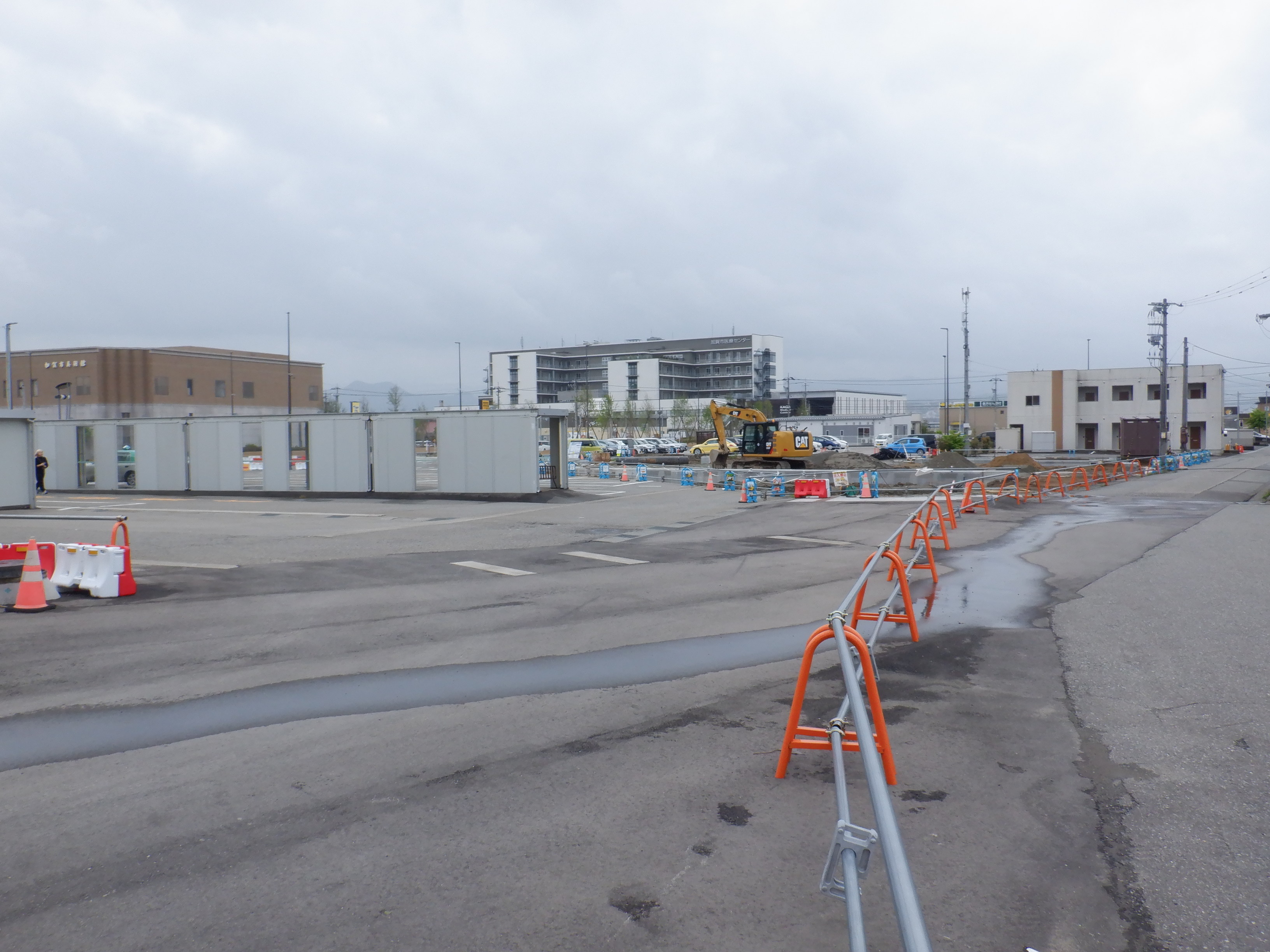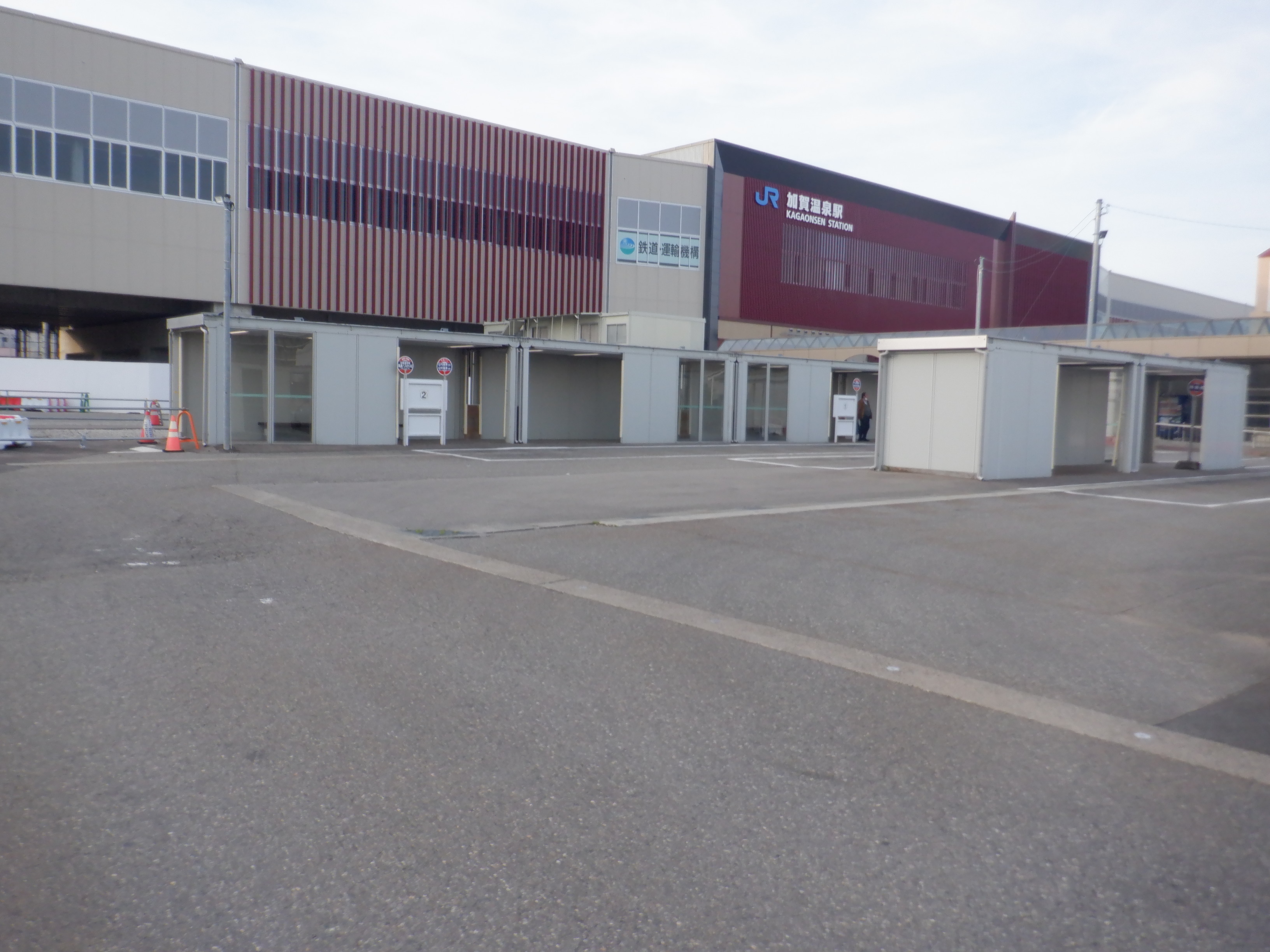 仮設駅舎の横から見た仮設バスのりばとかつてのバスのりば。