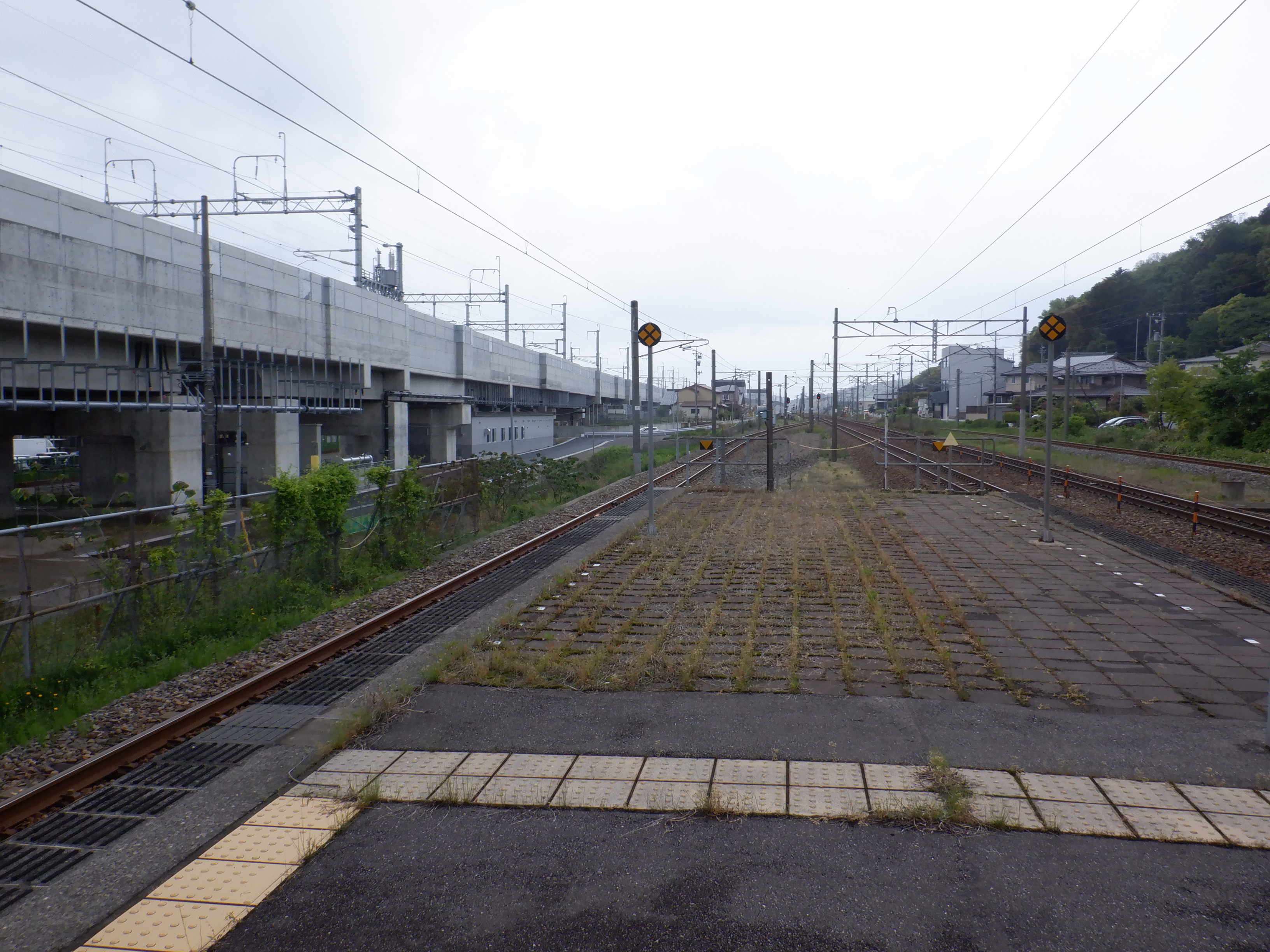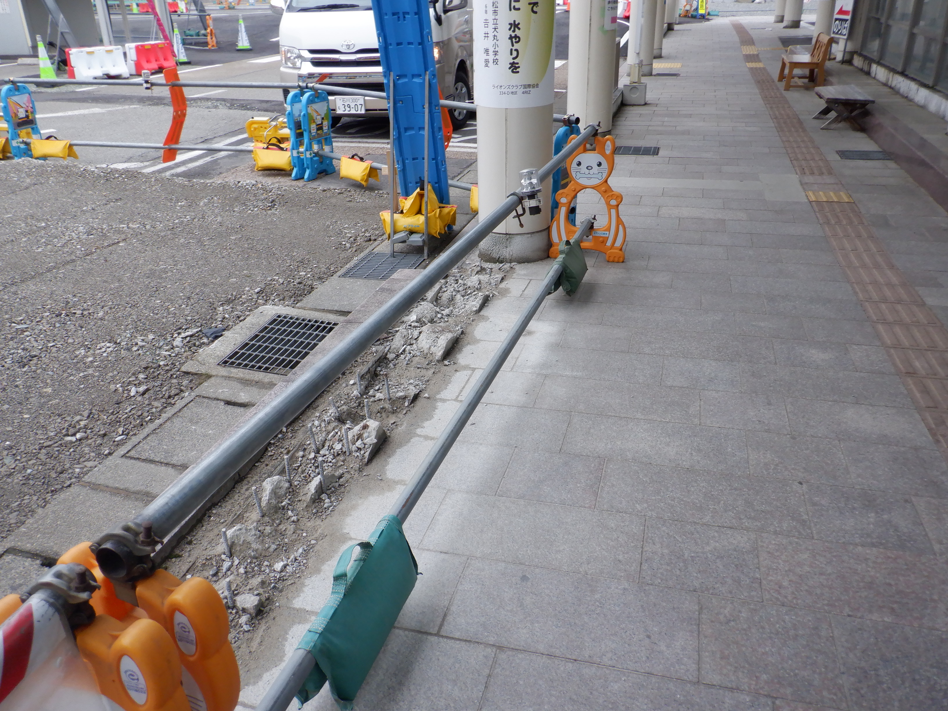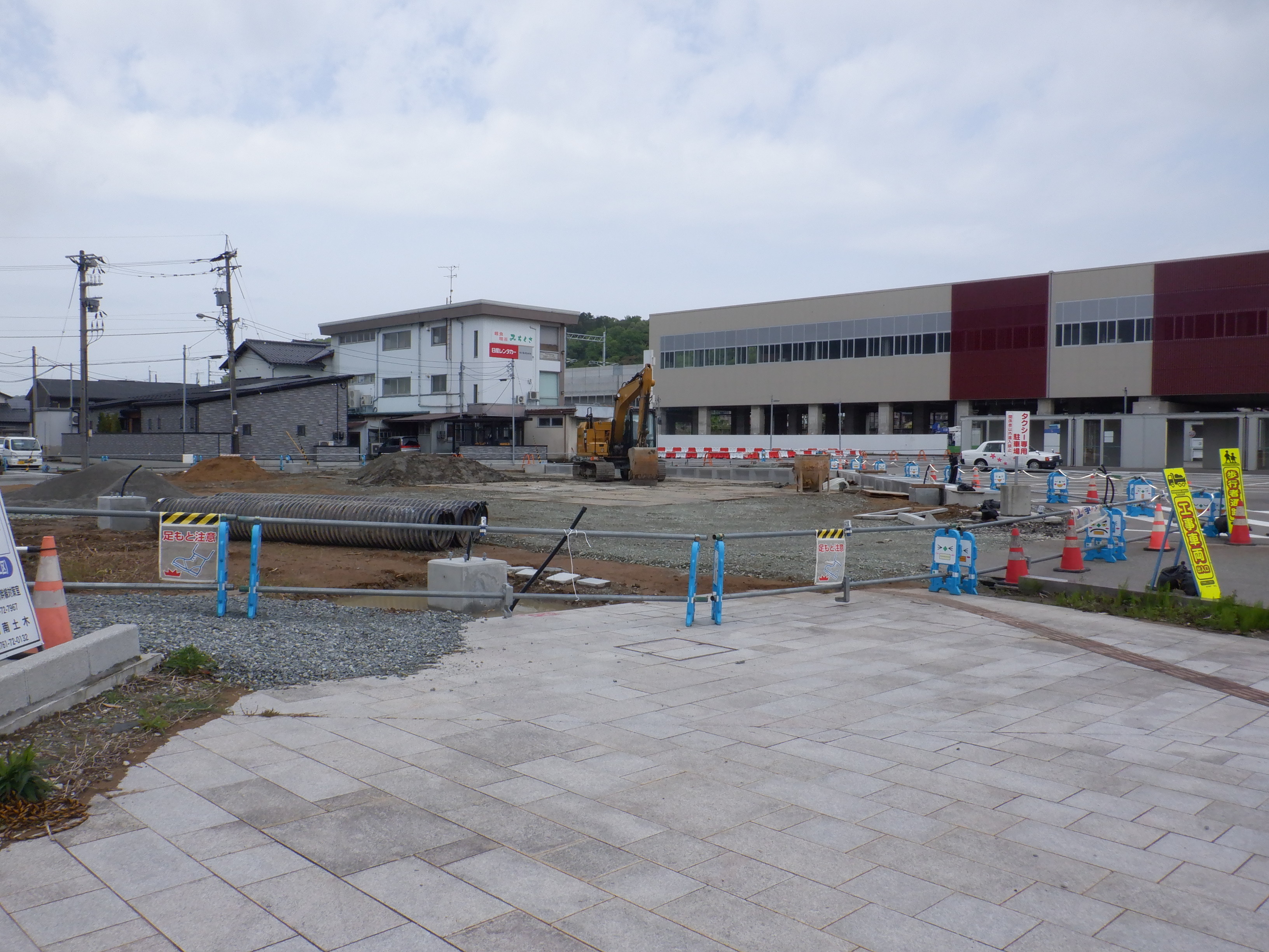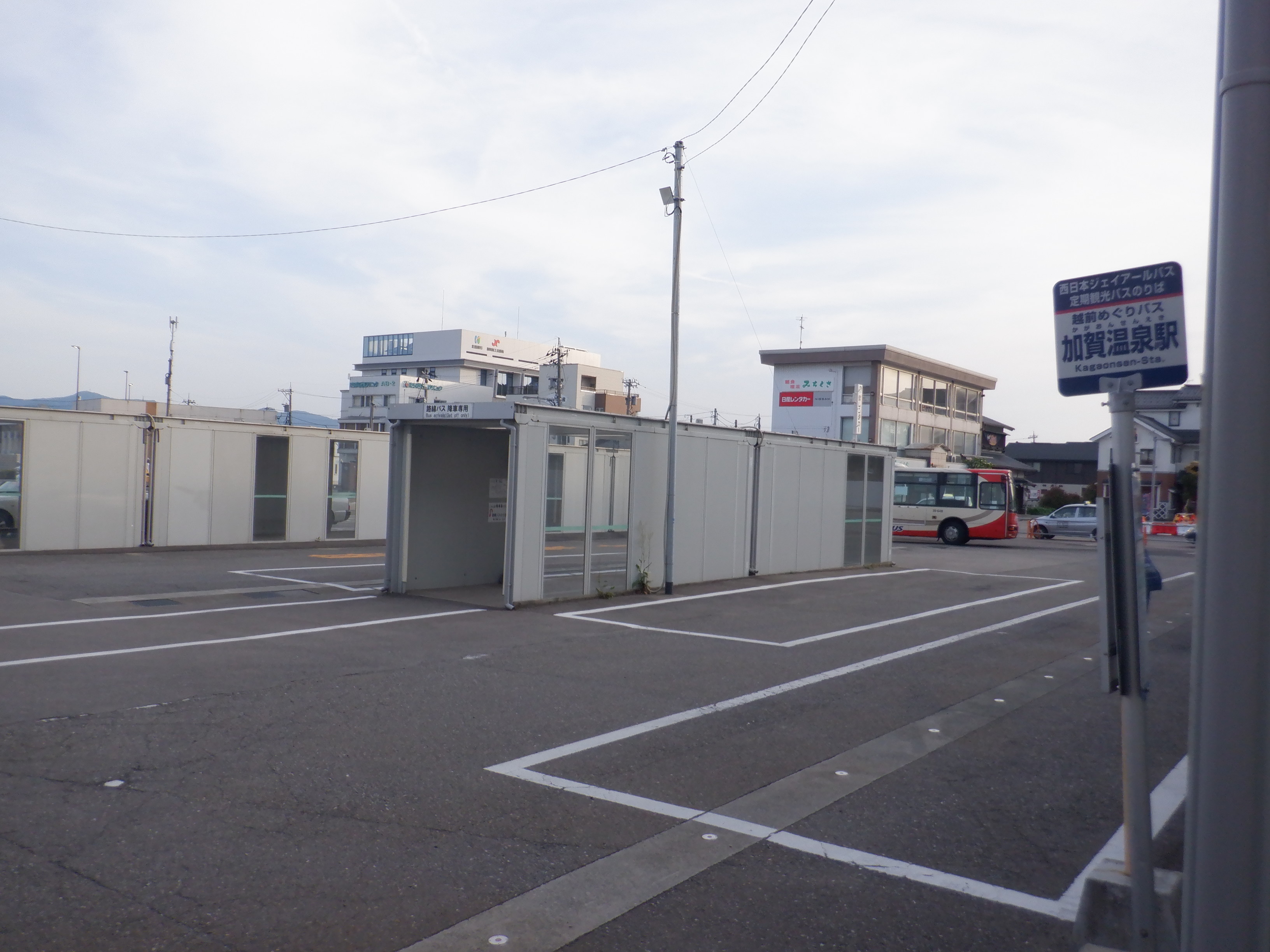 仮設駅舎の横から見た仮設バスのりばとかつてのバスのりば。