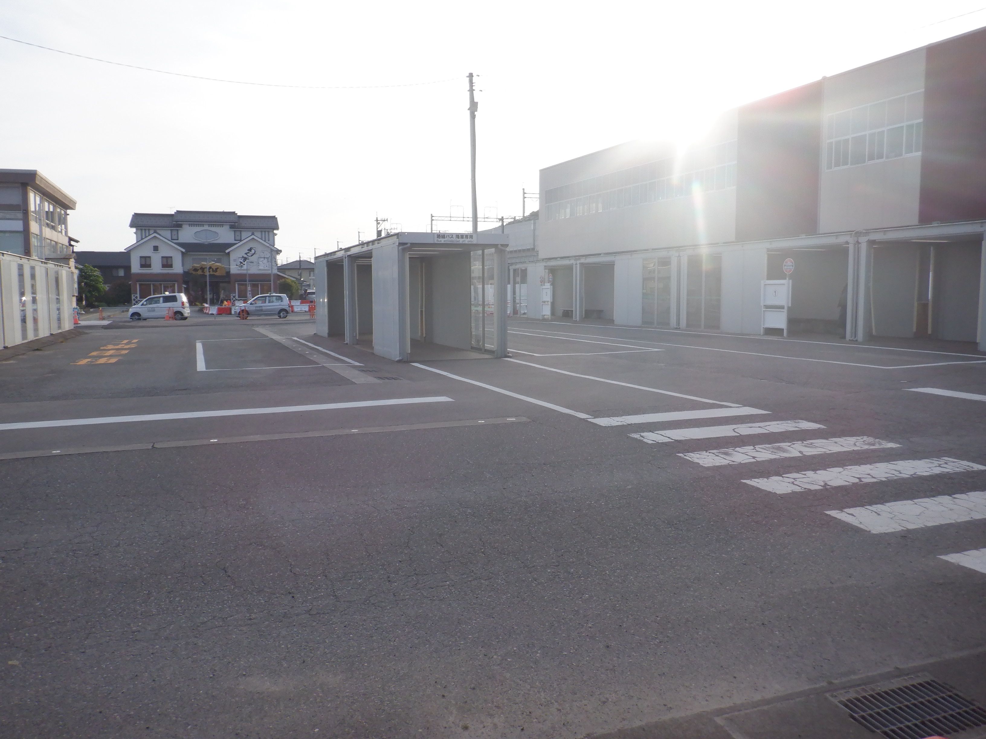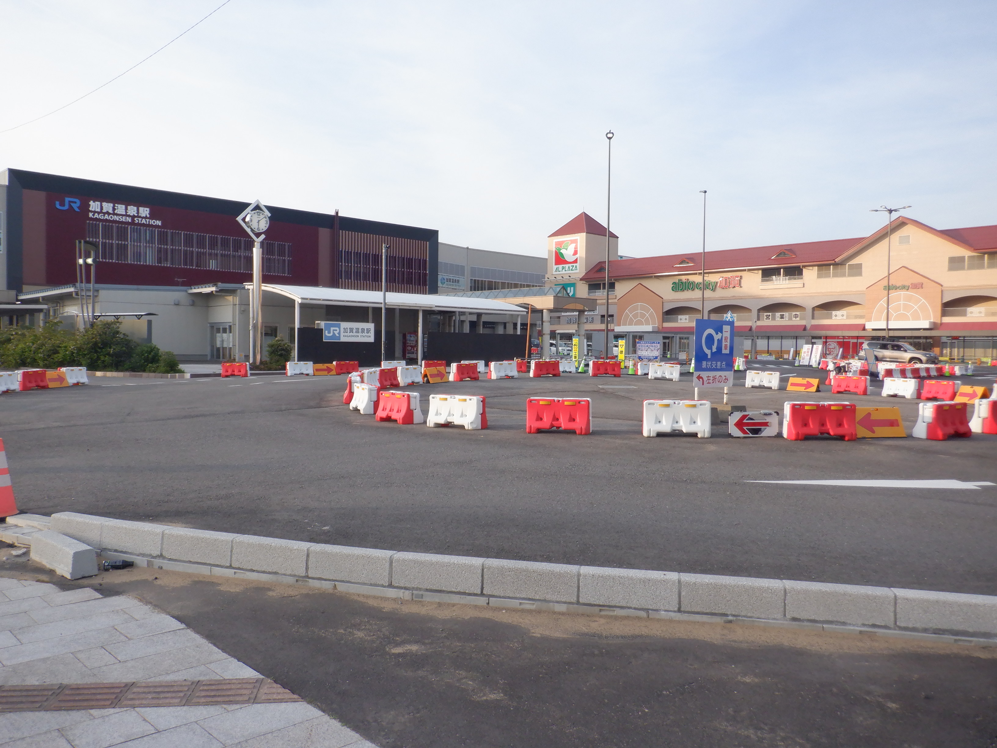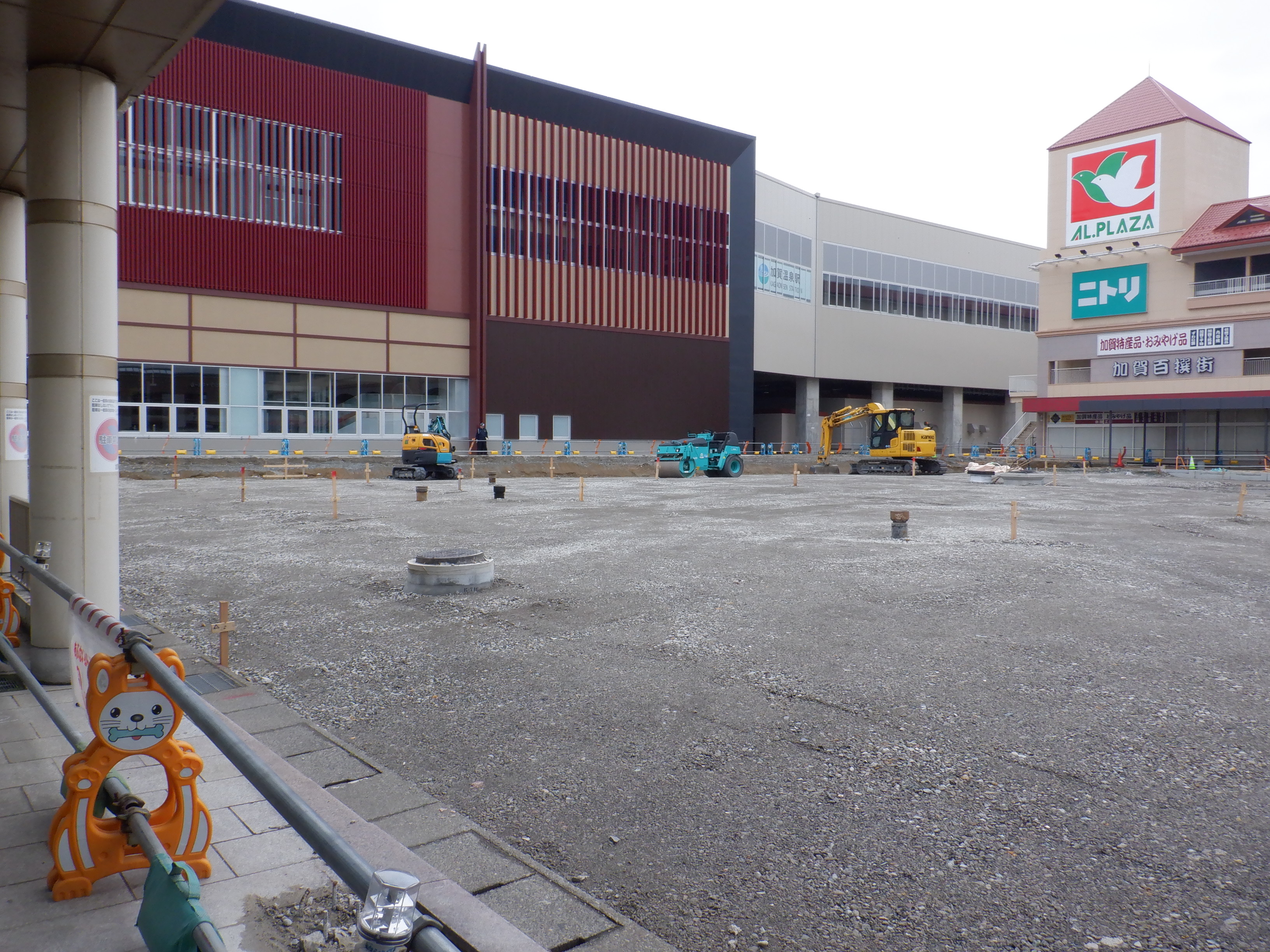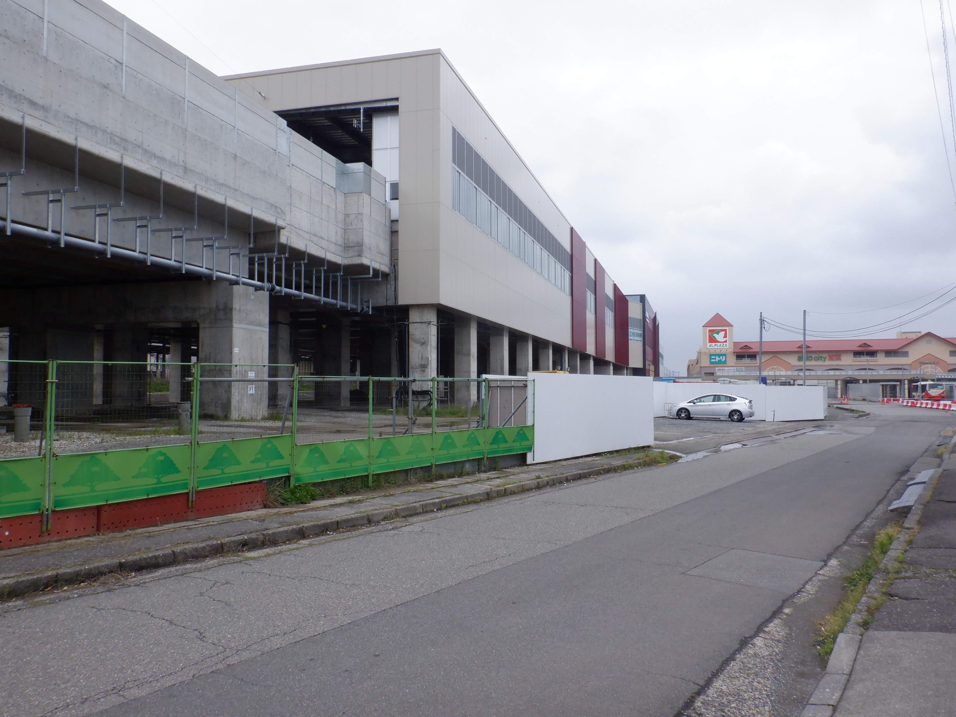 アルプラザの前のシェルターの工事が進んでいるように見えます。また、駅近くには商工会議所や北國銀行などが入るビルができていました。