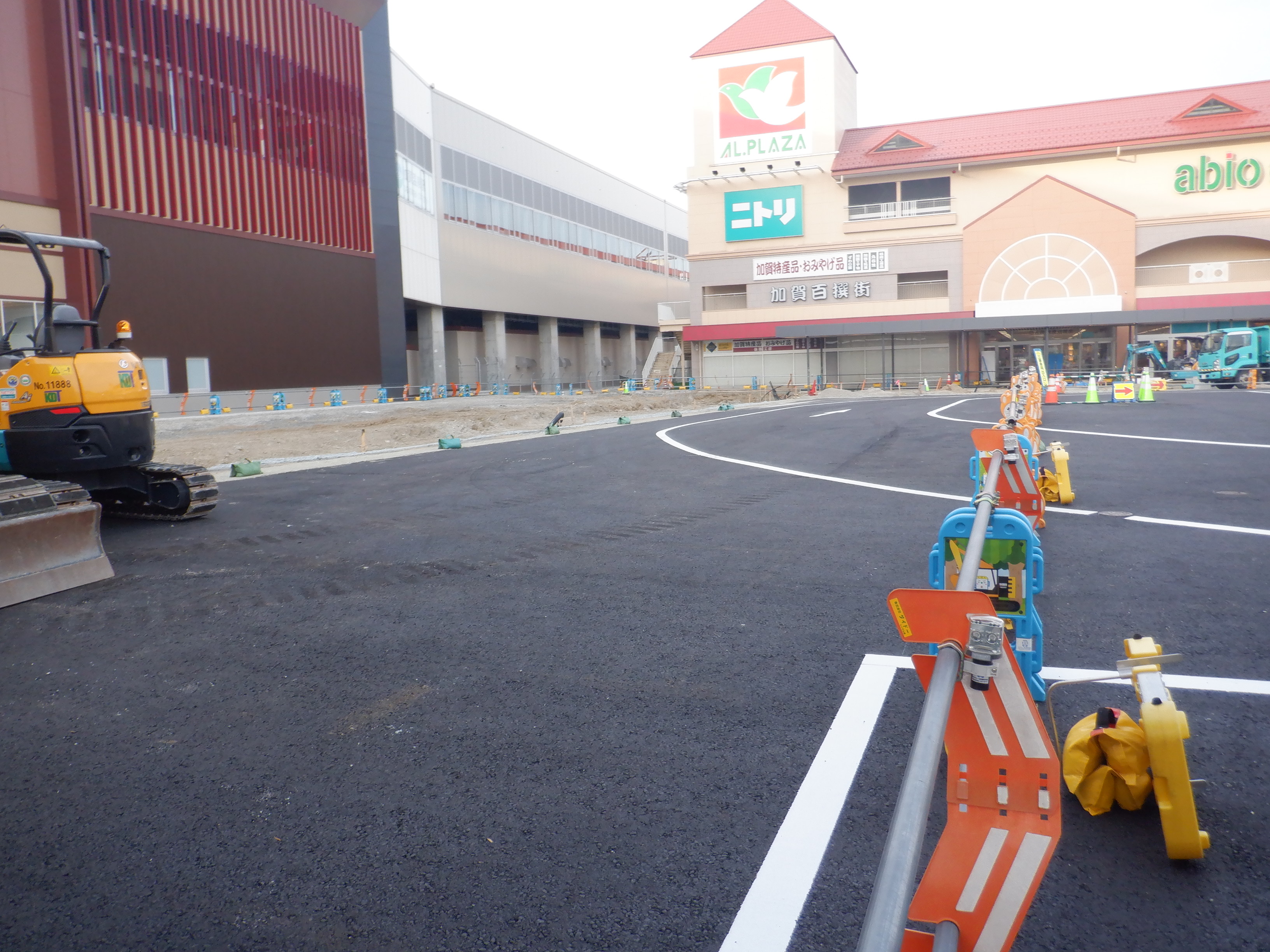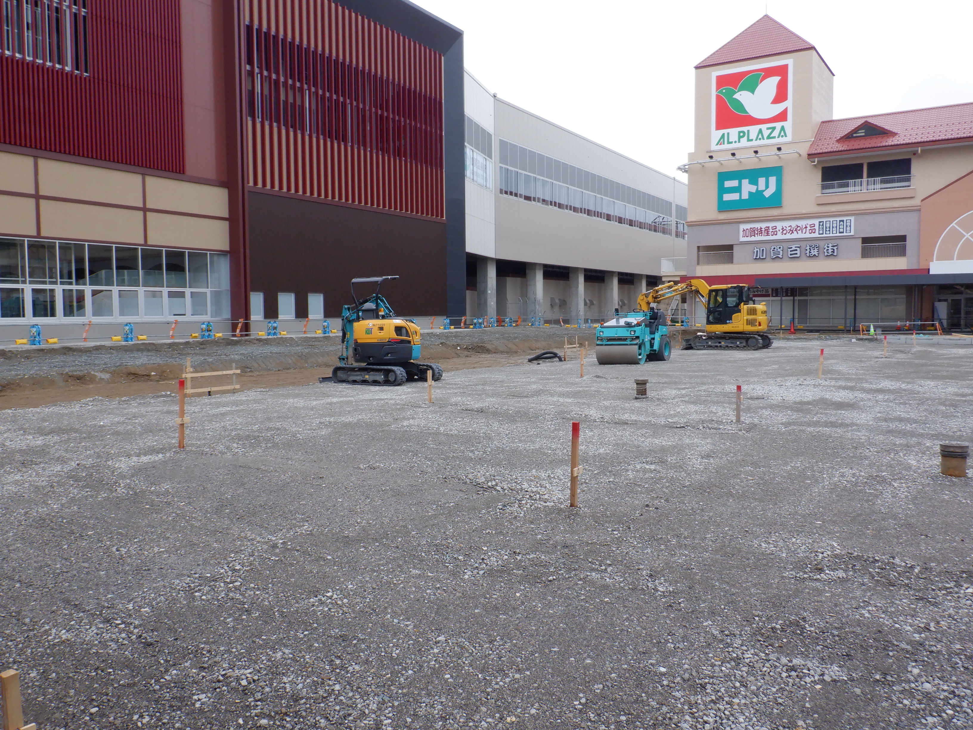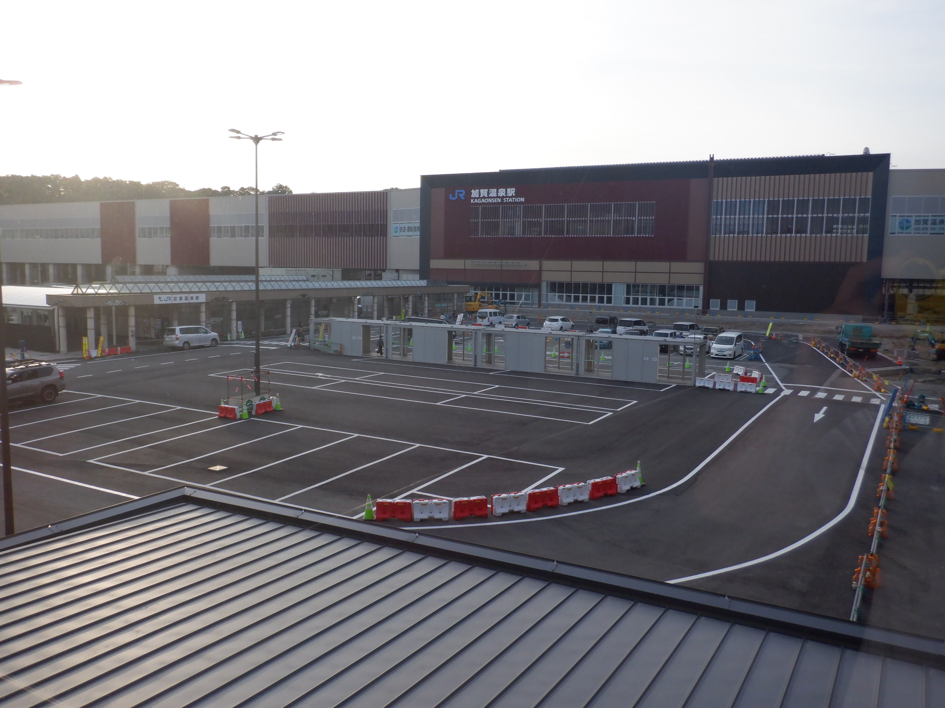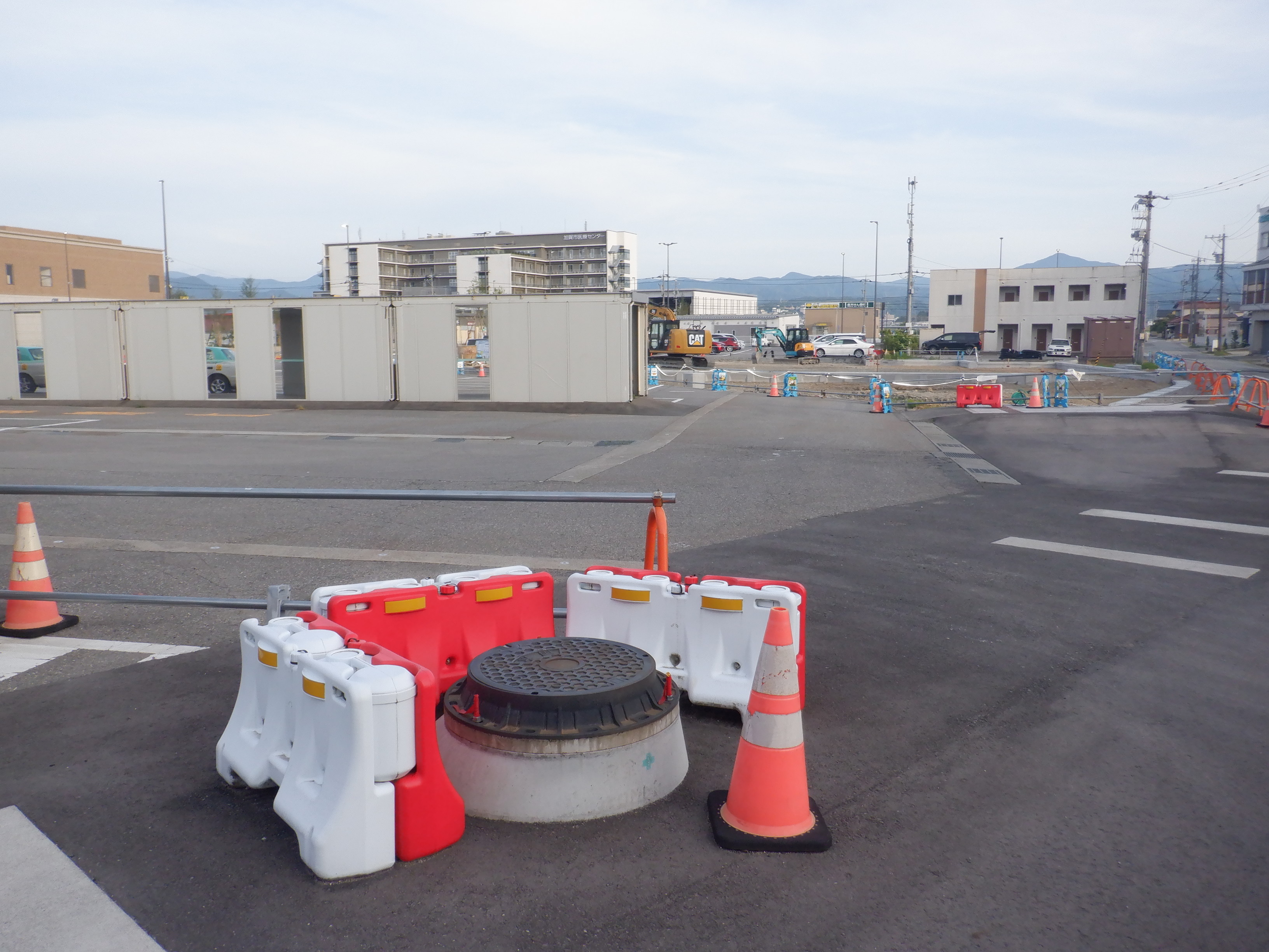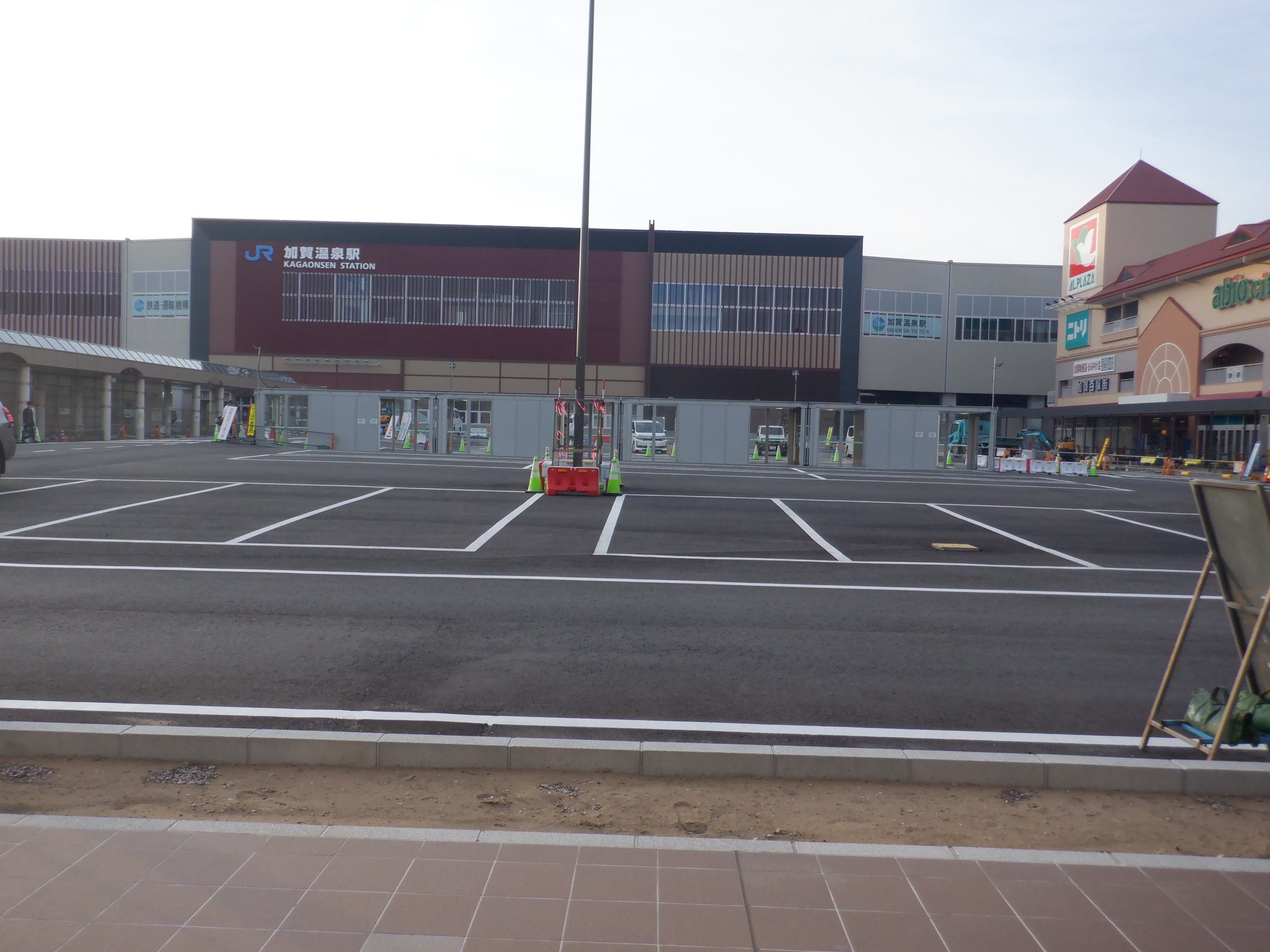 アルプラザの前のシェルターの工事が進んでいるように見えます。また、駅近くには商工会議所や北國銀行などが入るビルができていました。