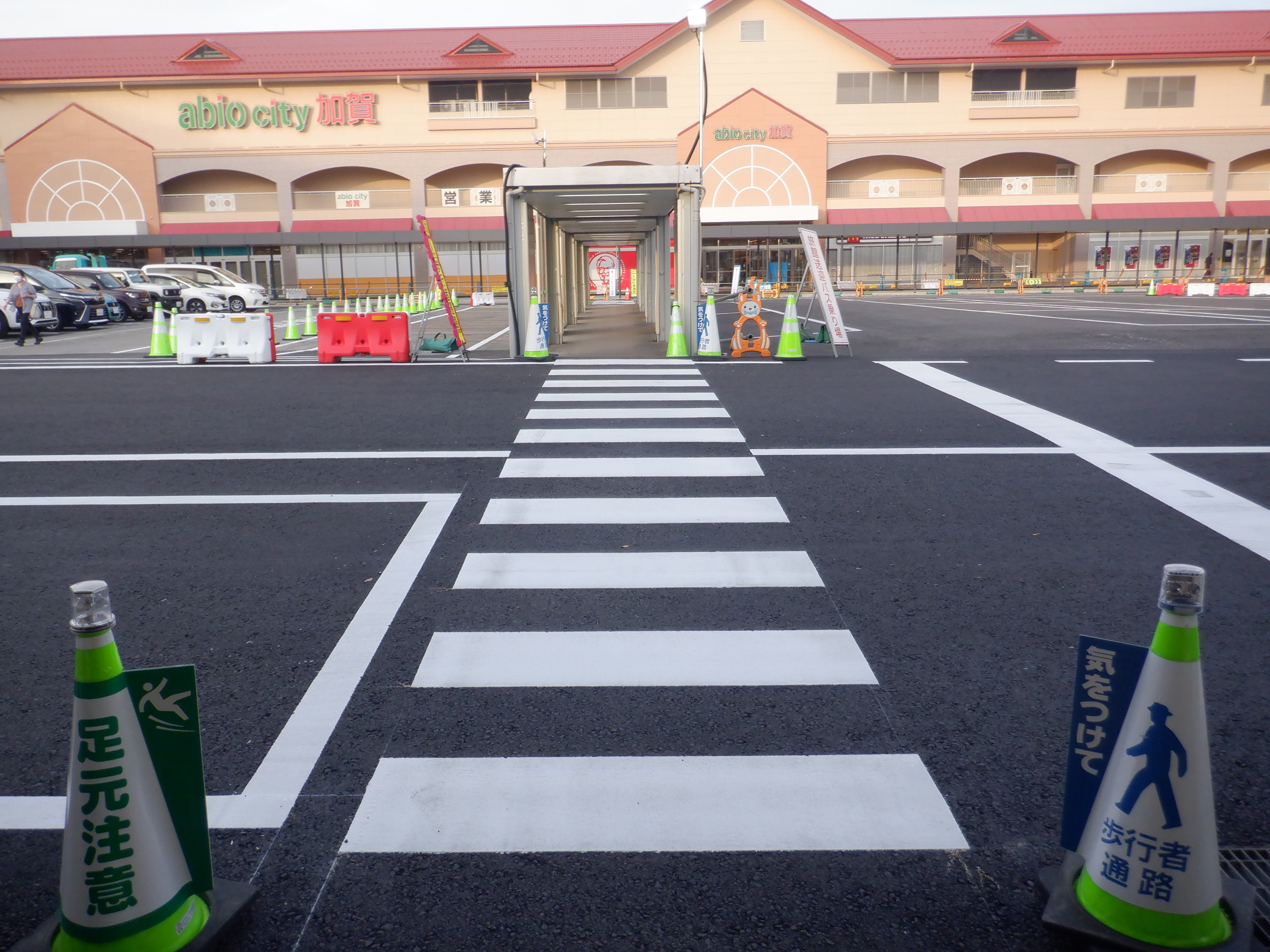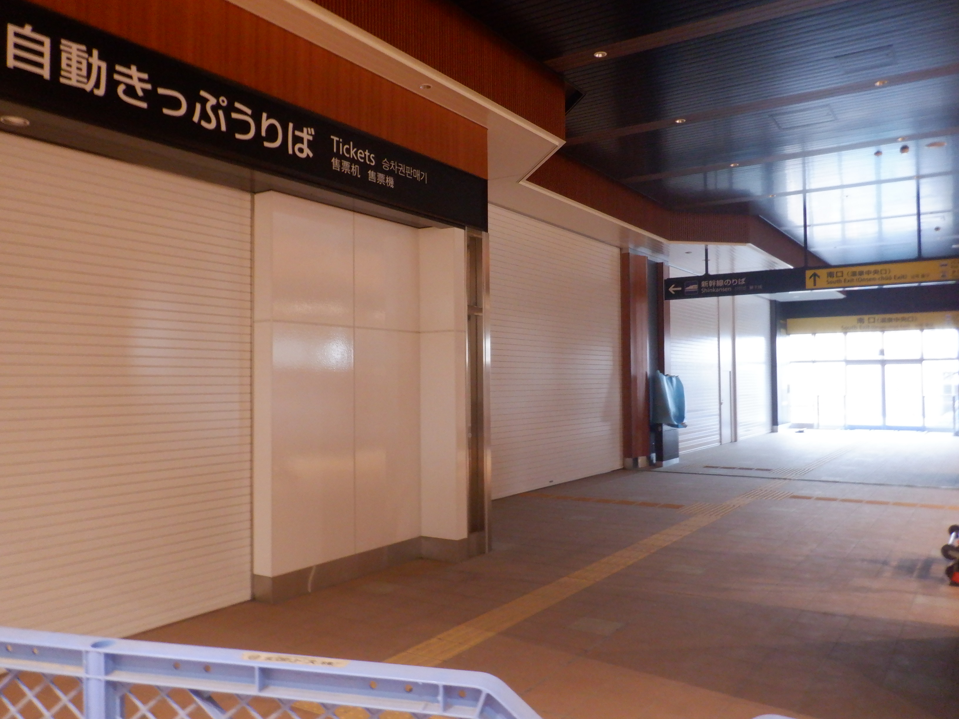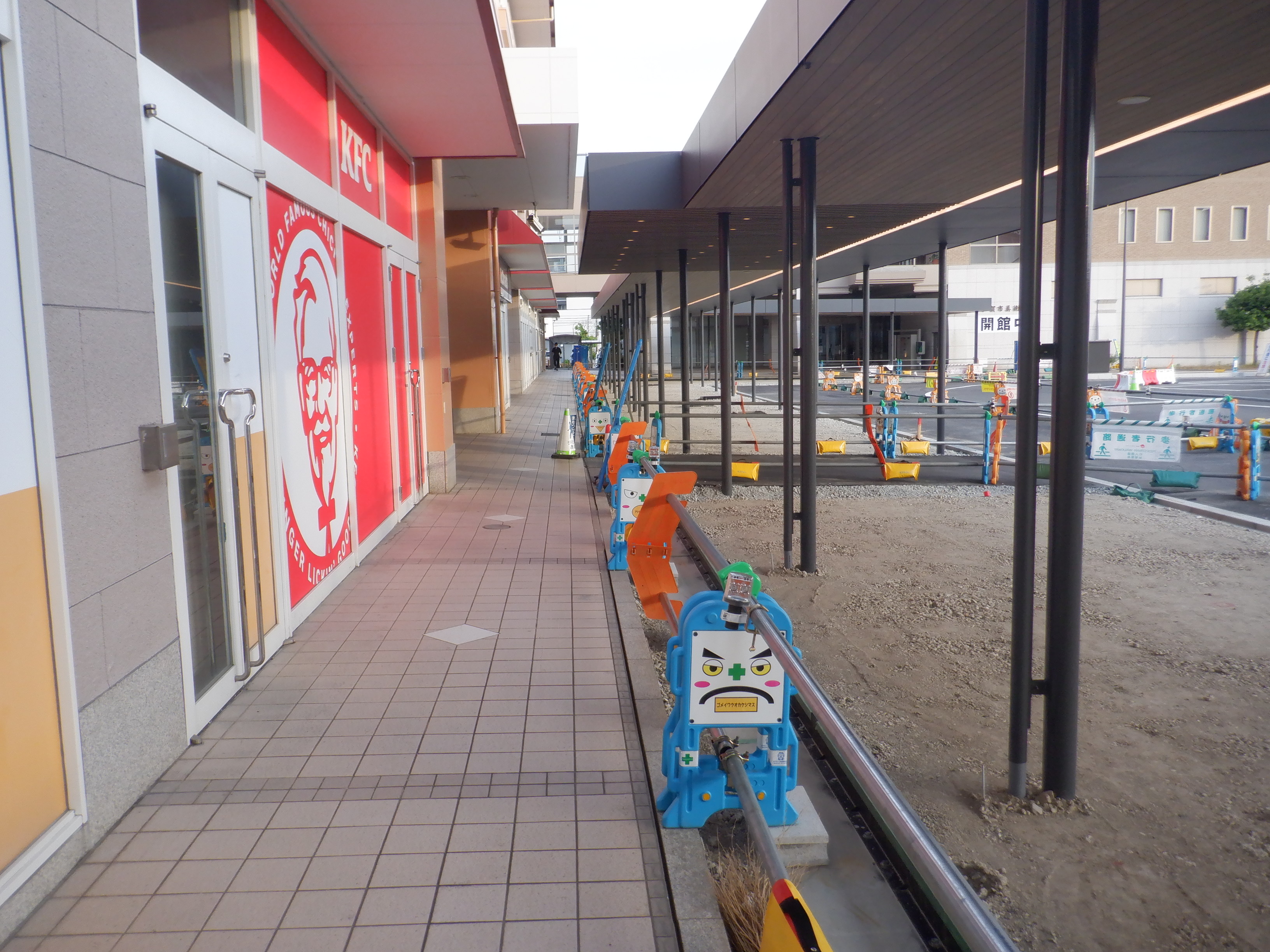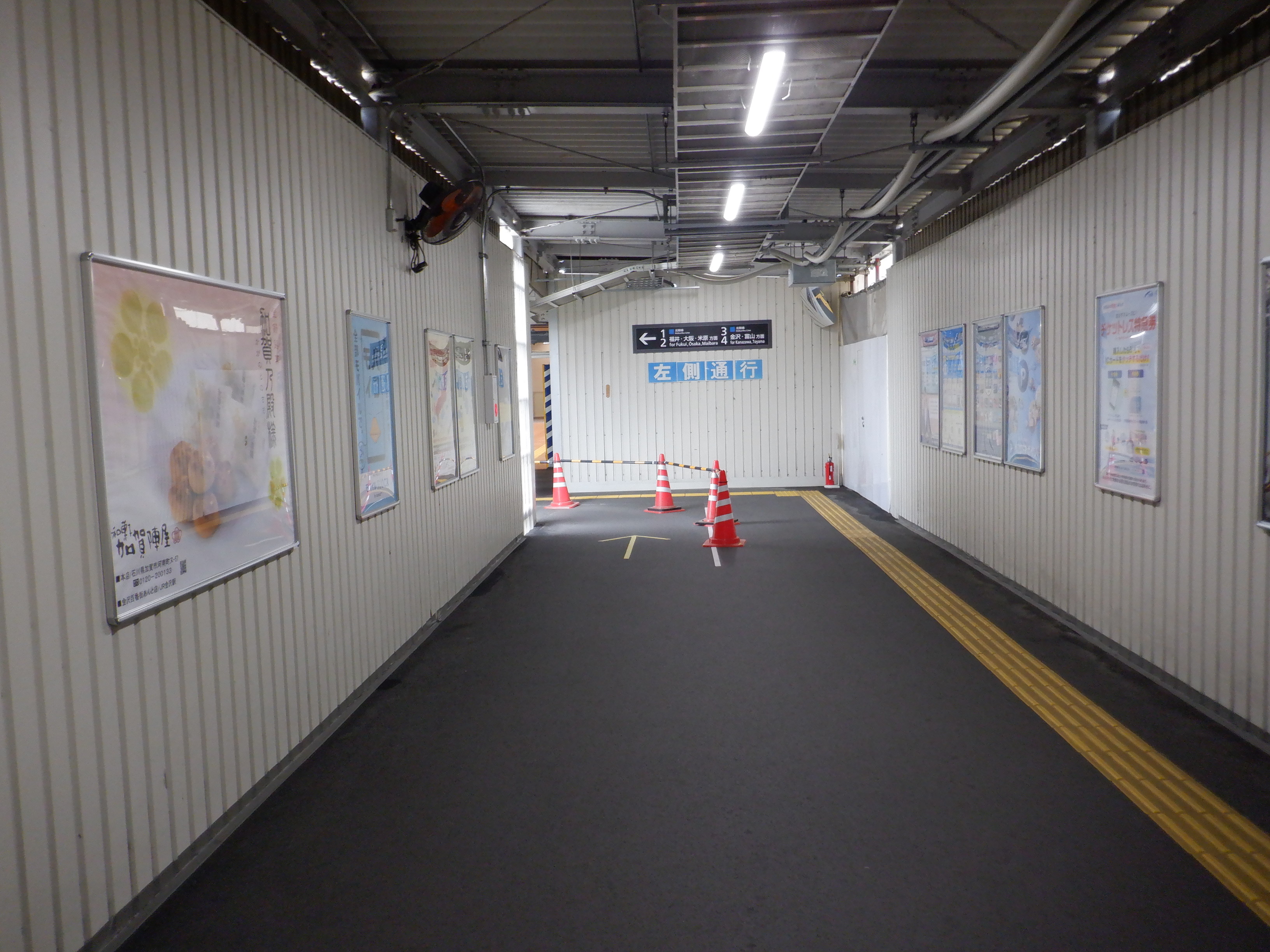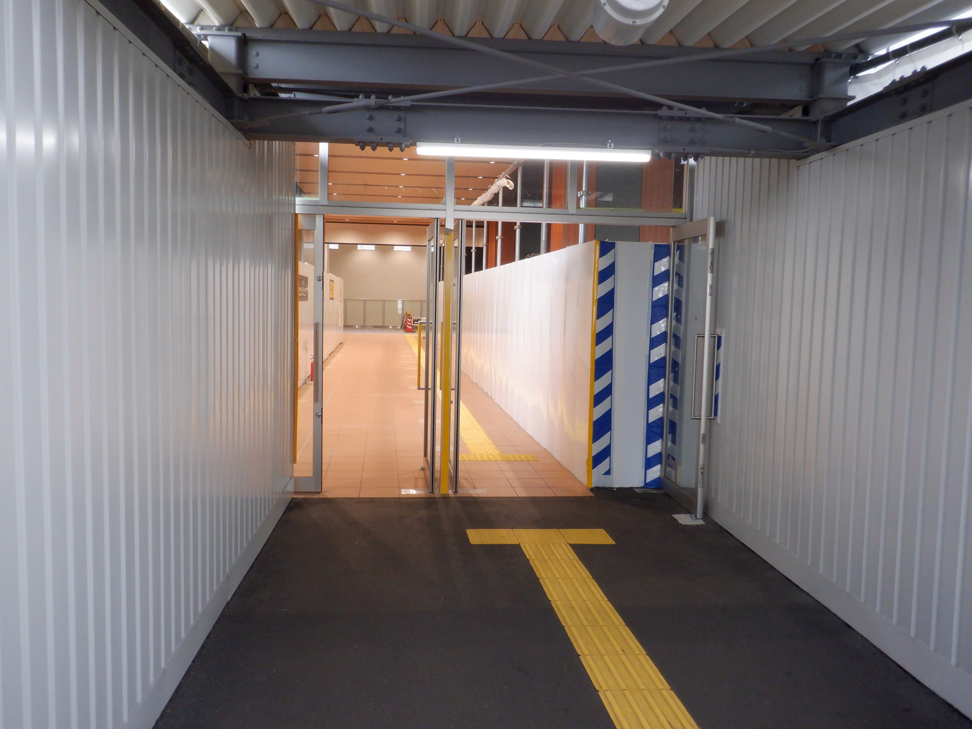 仮設駅舎の横の通路とそこから見たアルプラザ・新幹線駅舎。この後ここが仮設バスのりばになります。