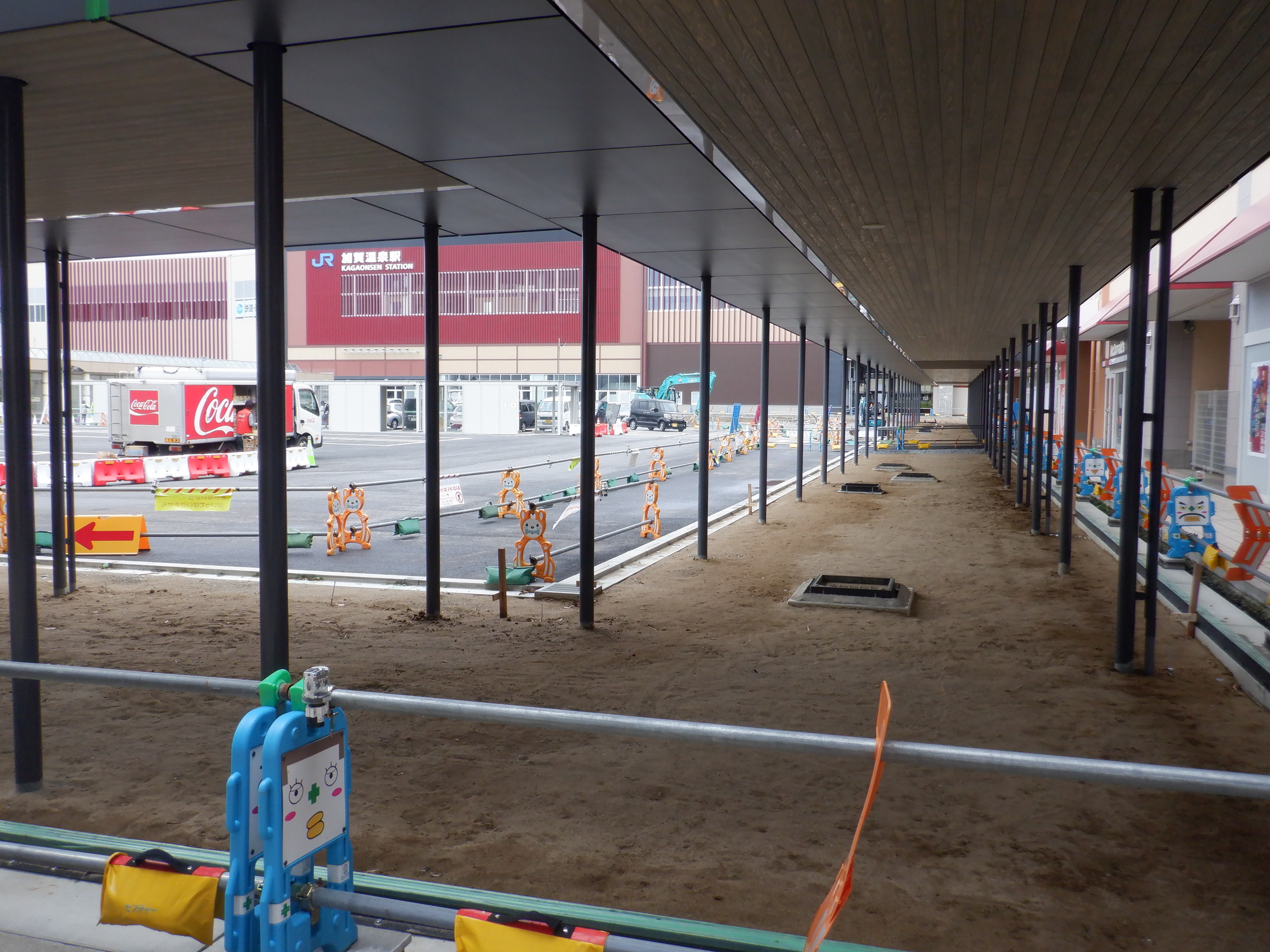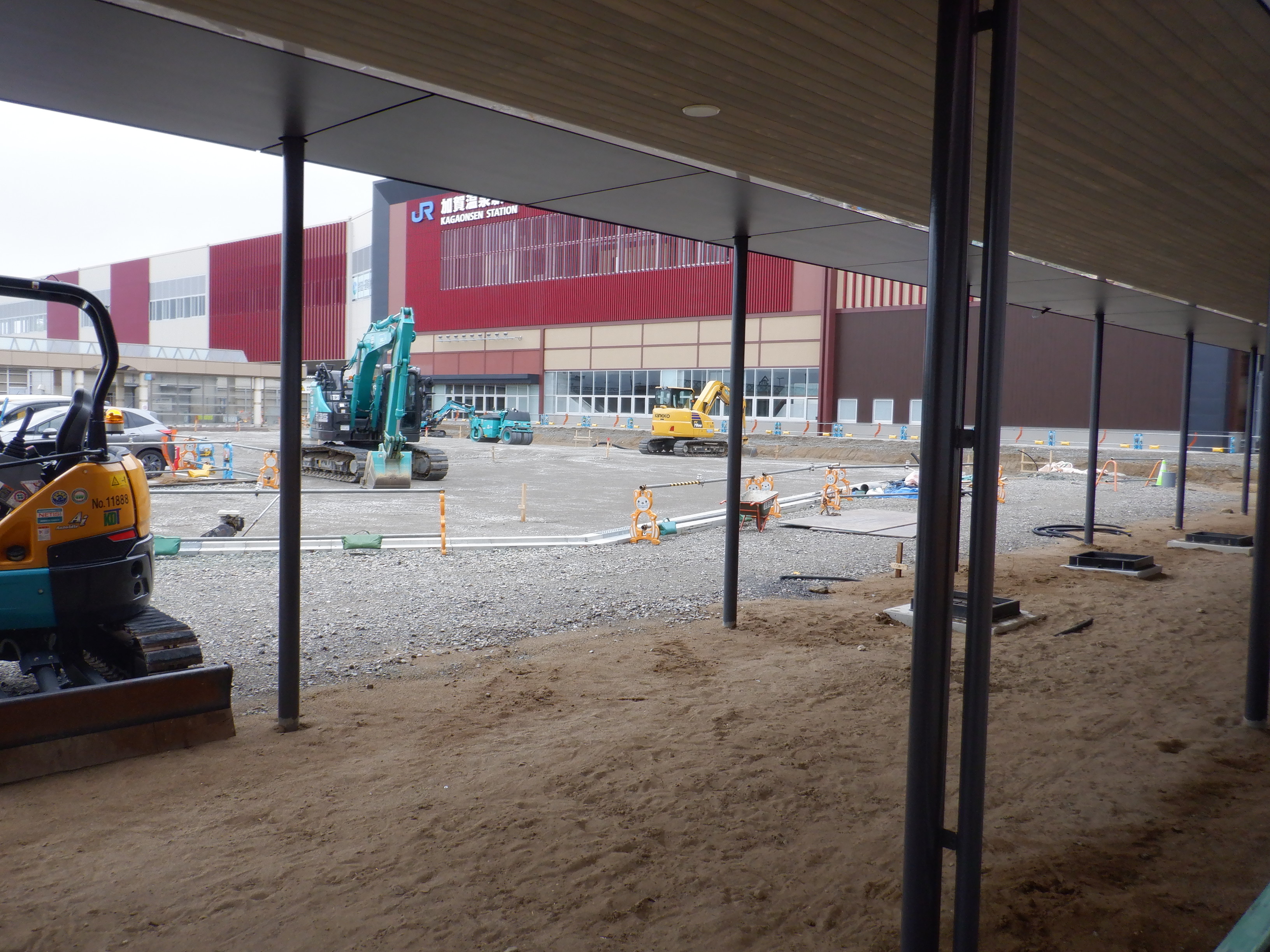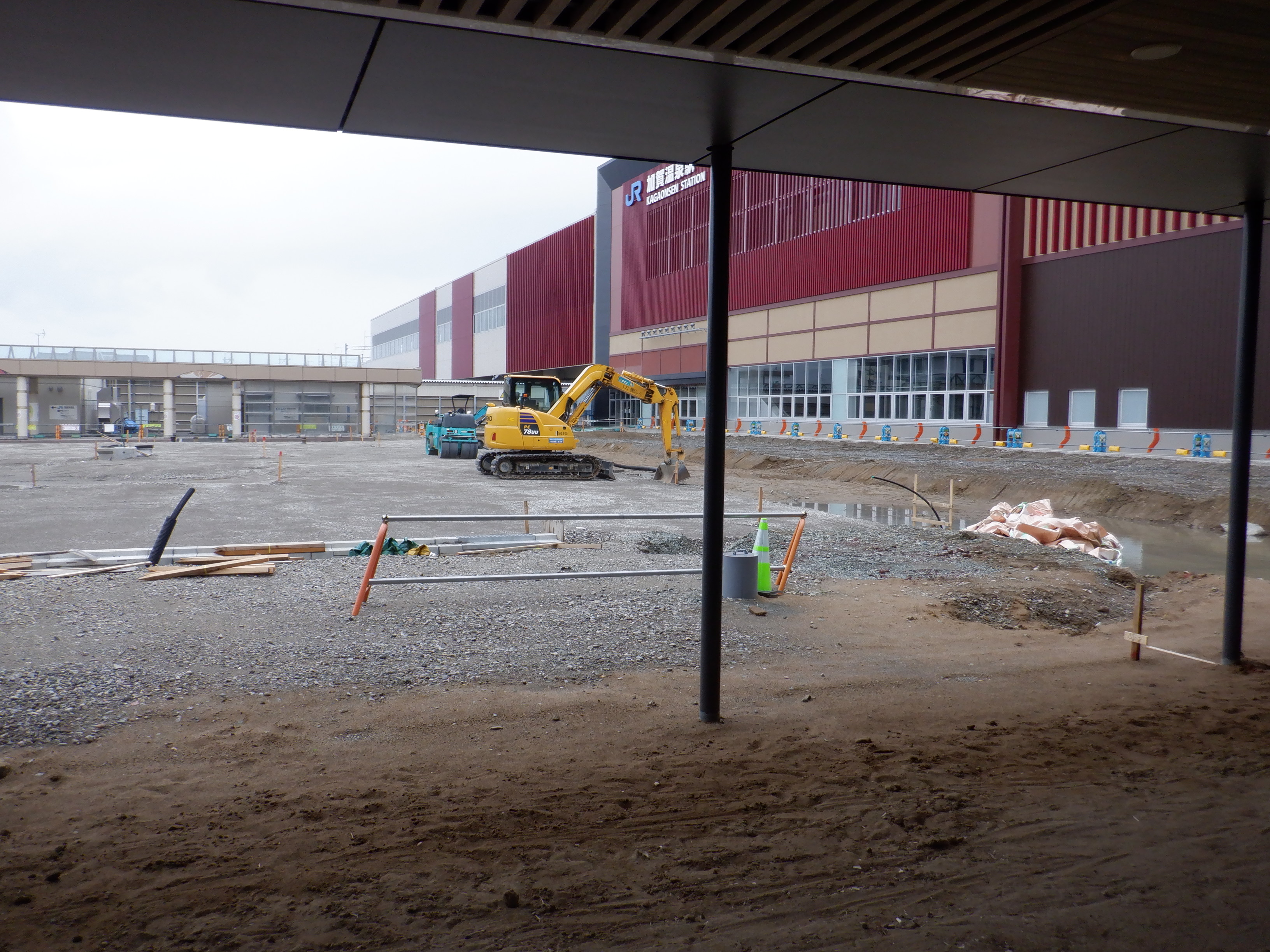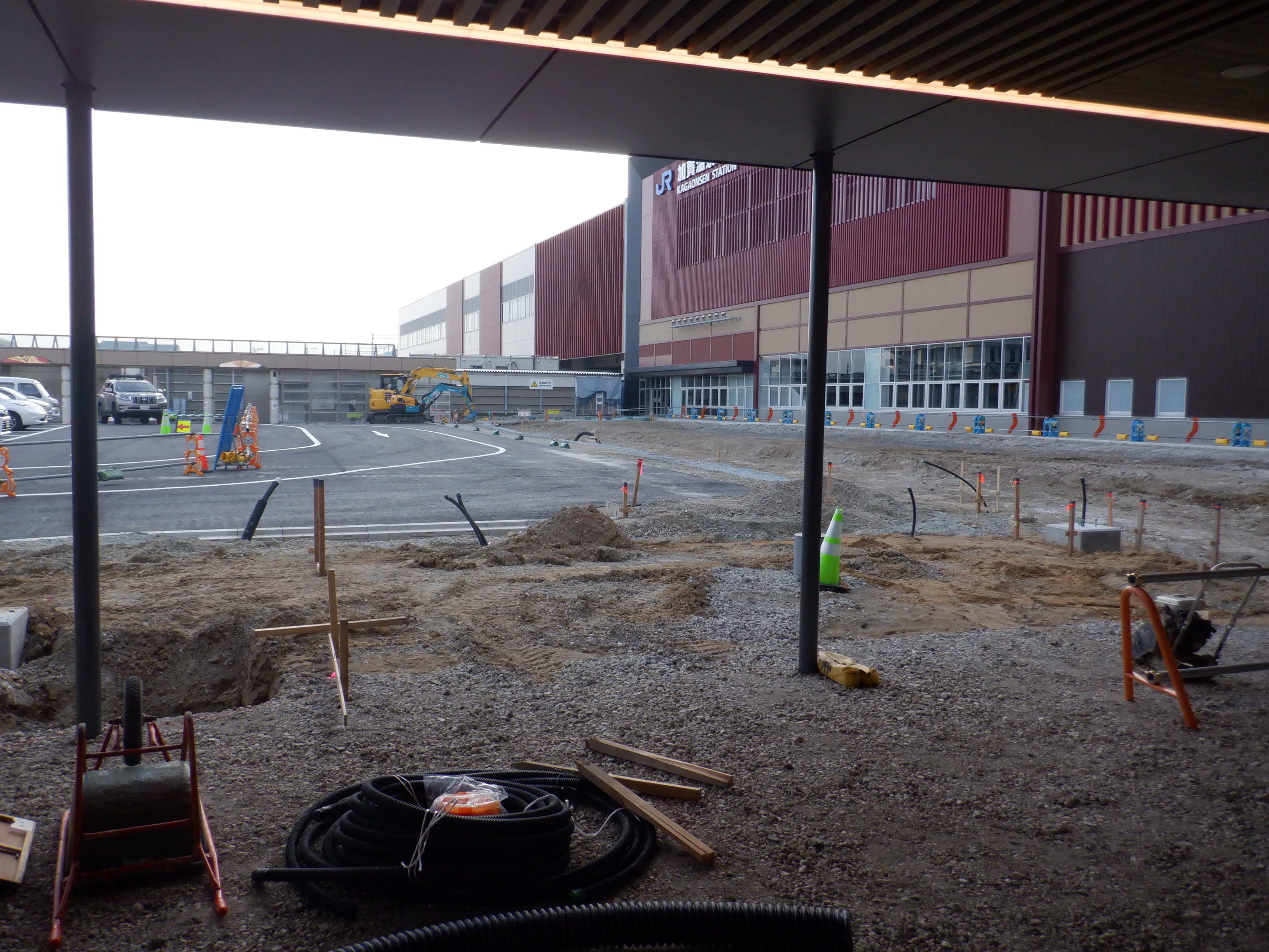 アルプラザの前のシェルター建設中の様子と、そこから見た新幹線駅舎。