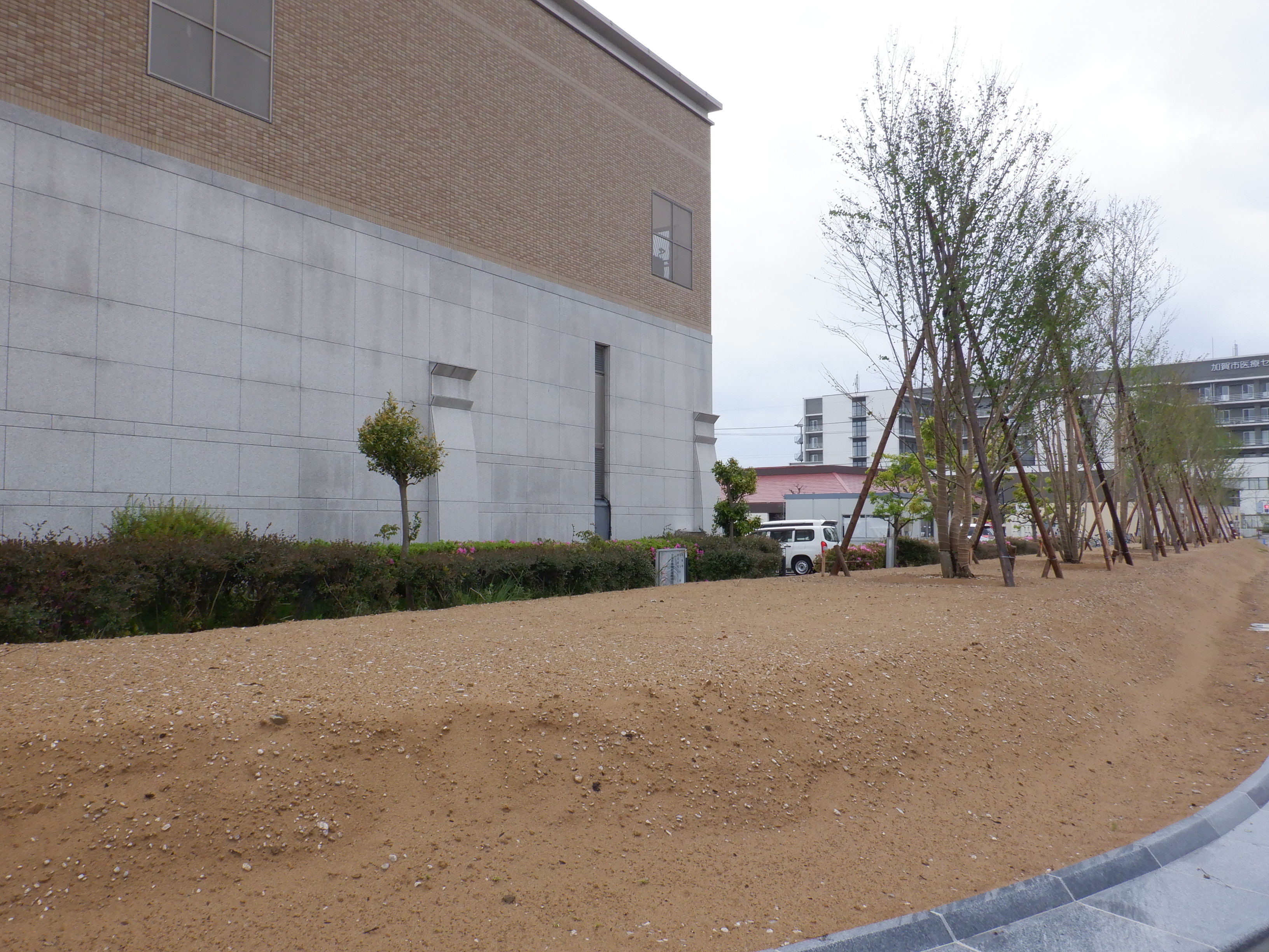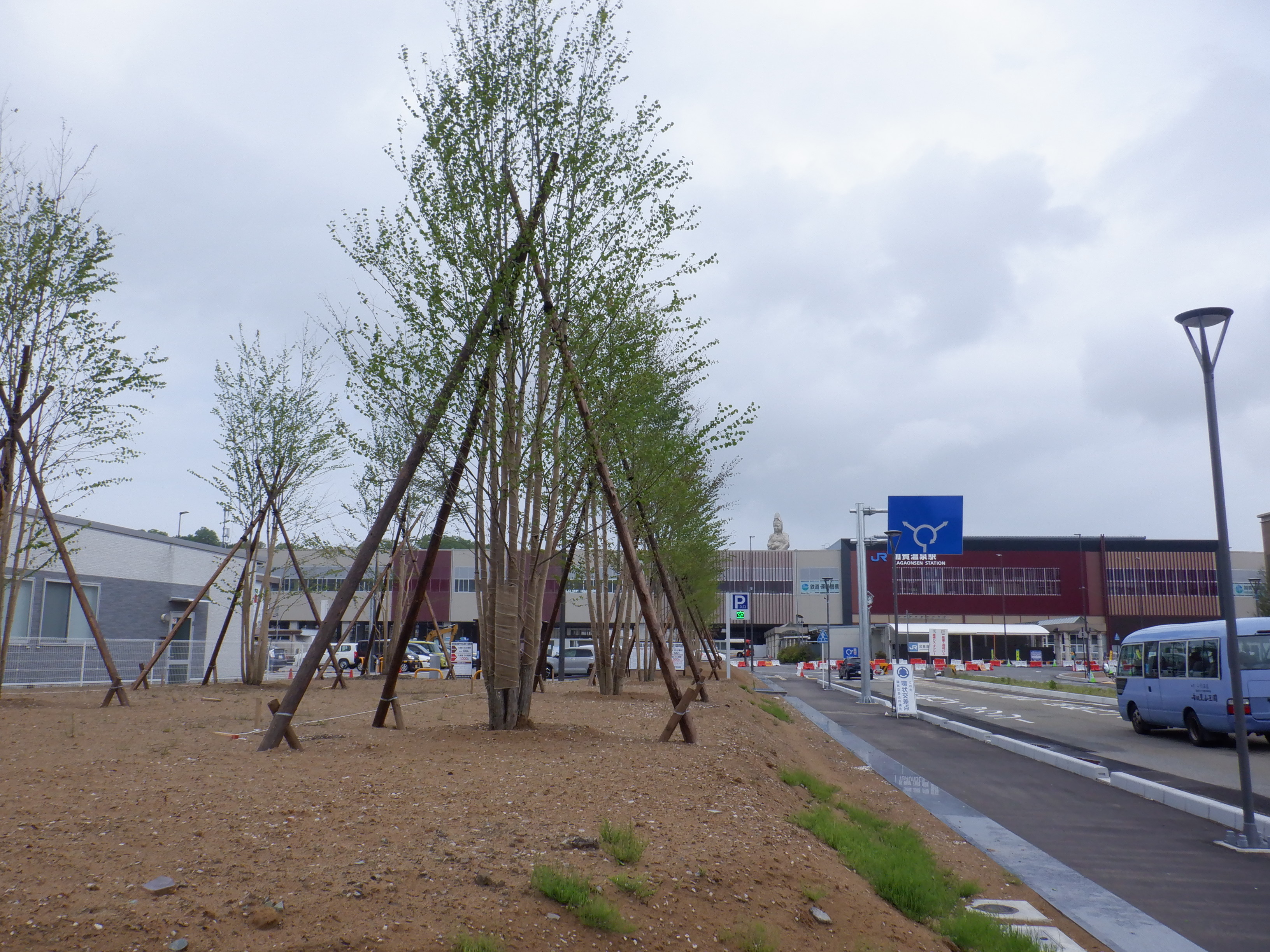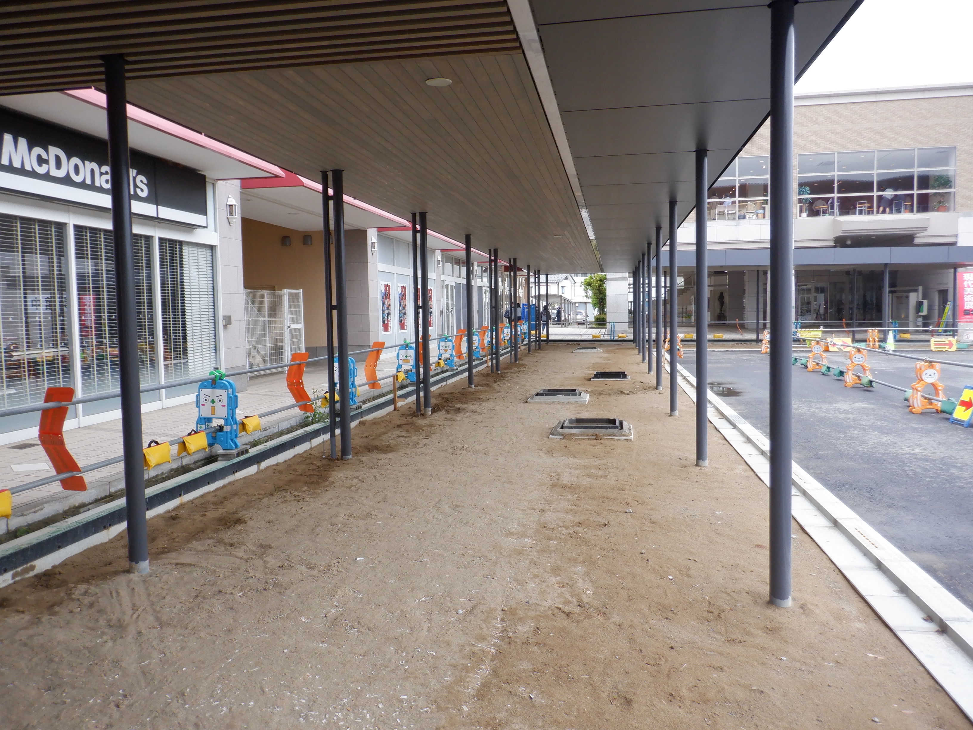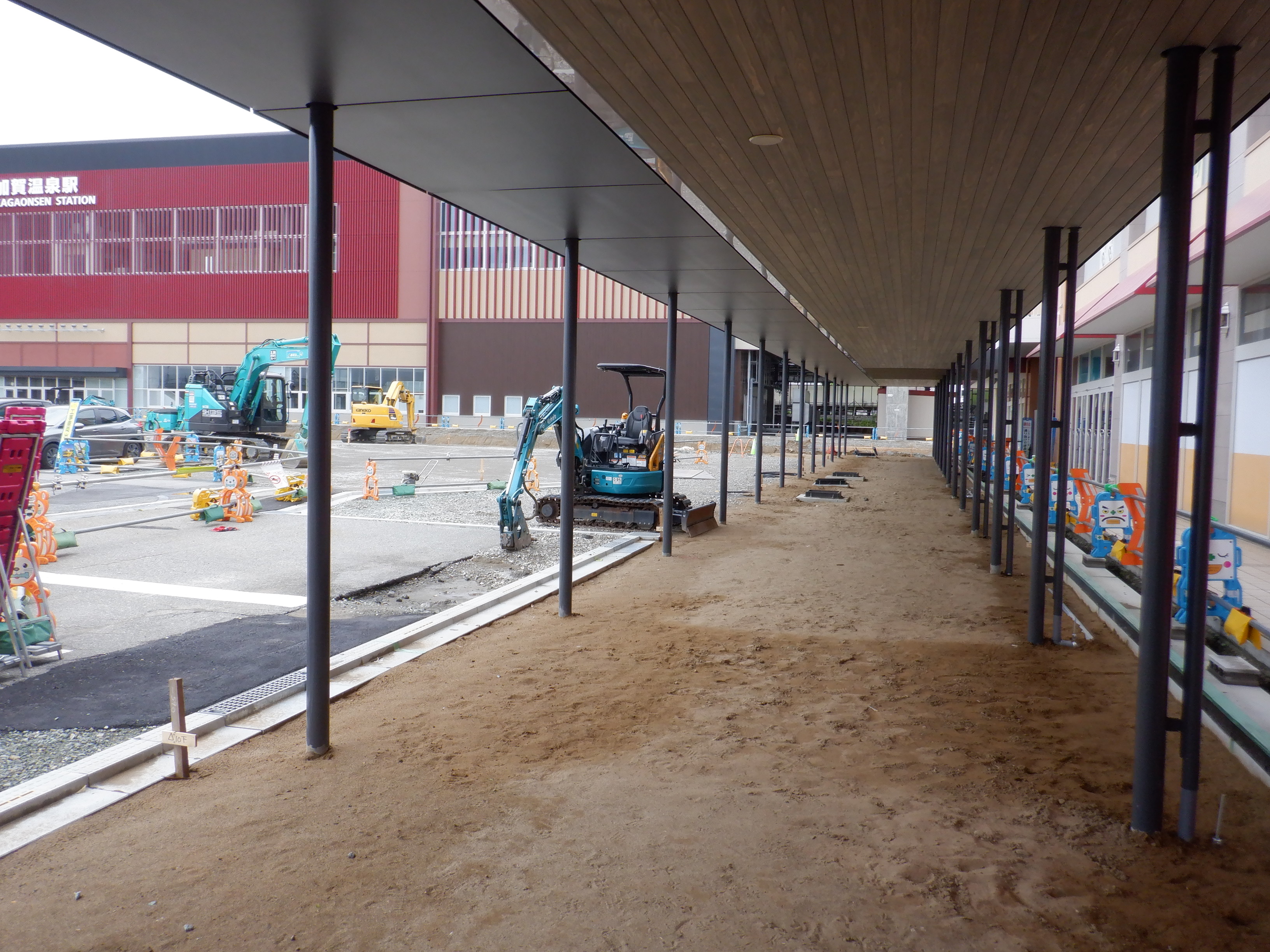 アルプラザの前のシェルター建設中の様子と、そこから見た新幹線駅舎。