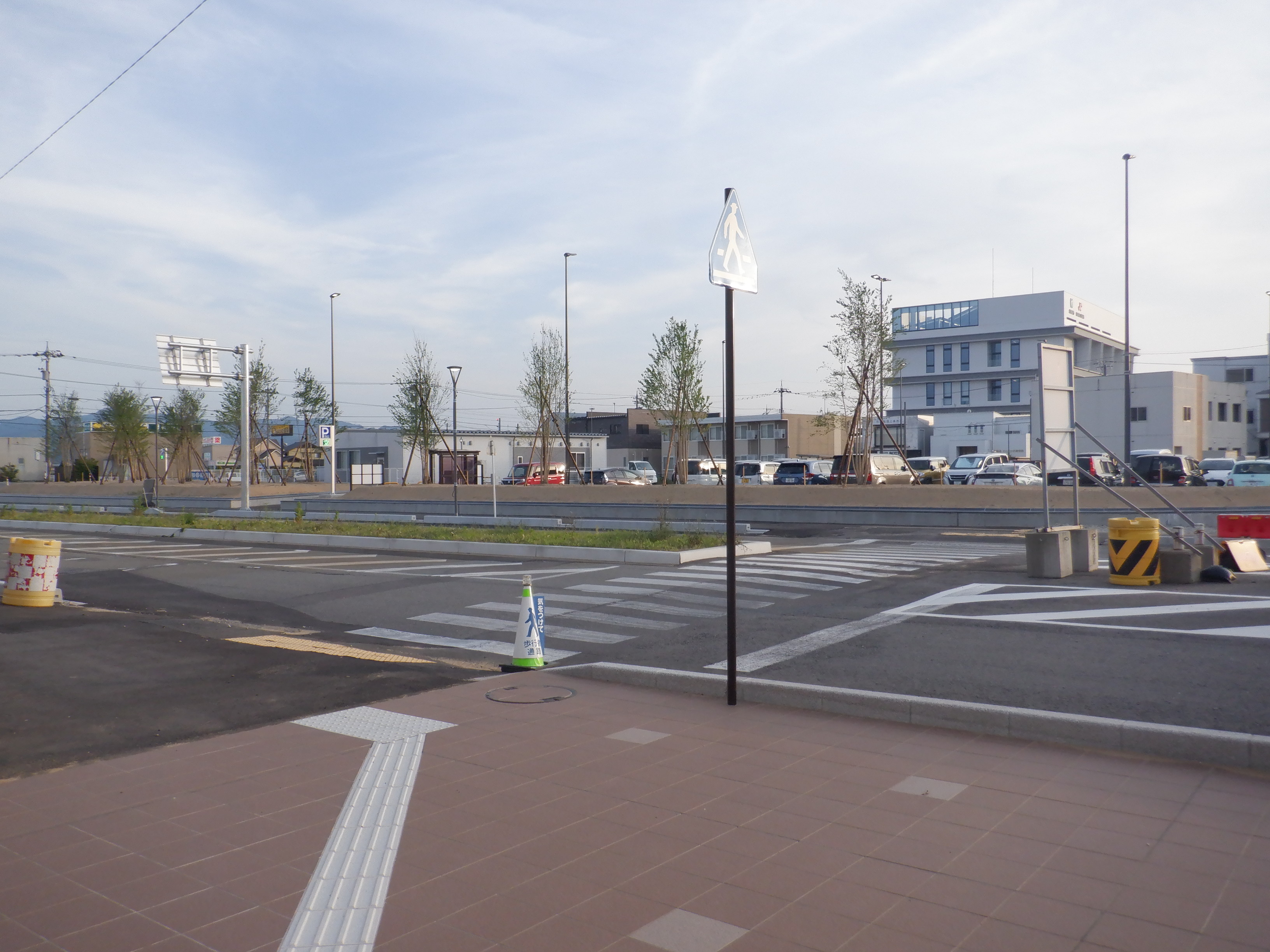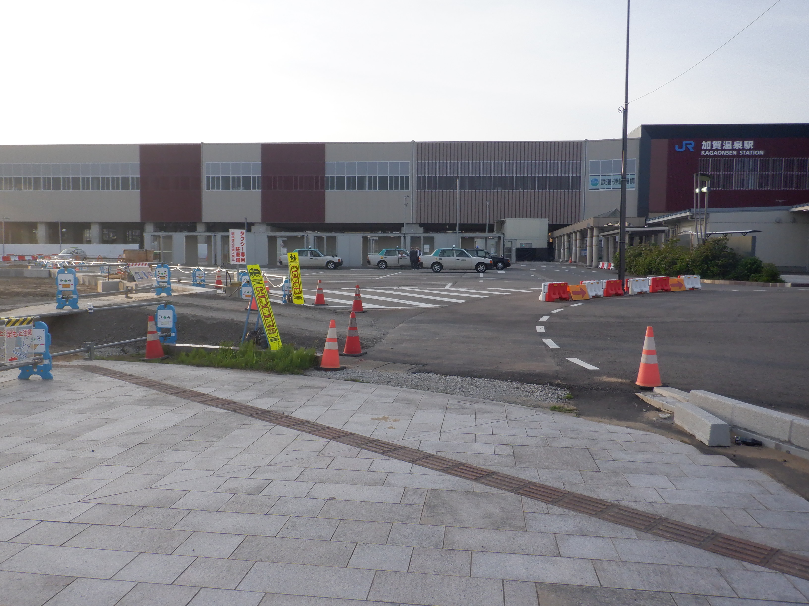 再び駅前の環状交差点となるところと、そこから見た仮設バスのりばの前のタクシーのりば。。