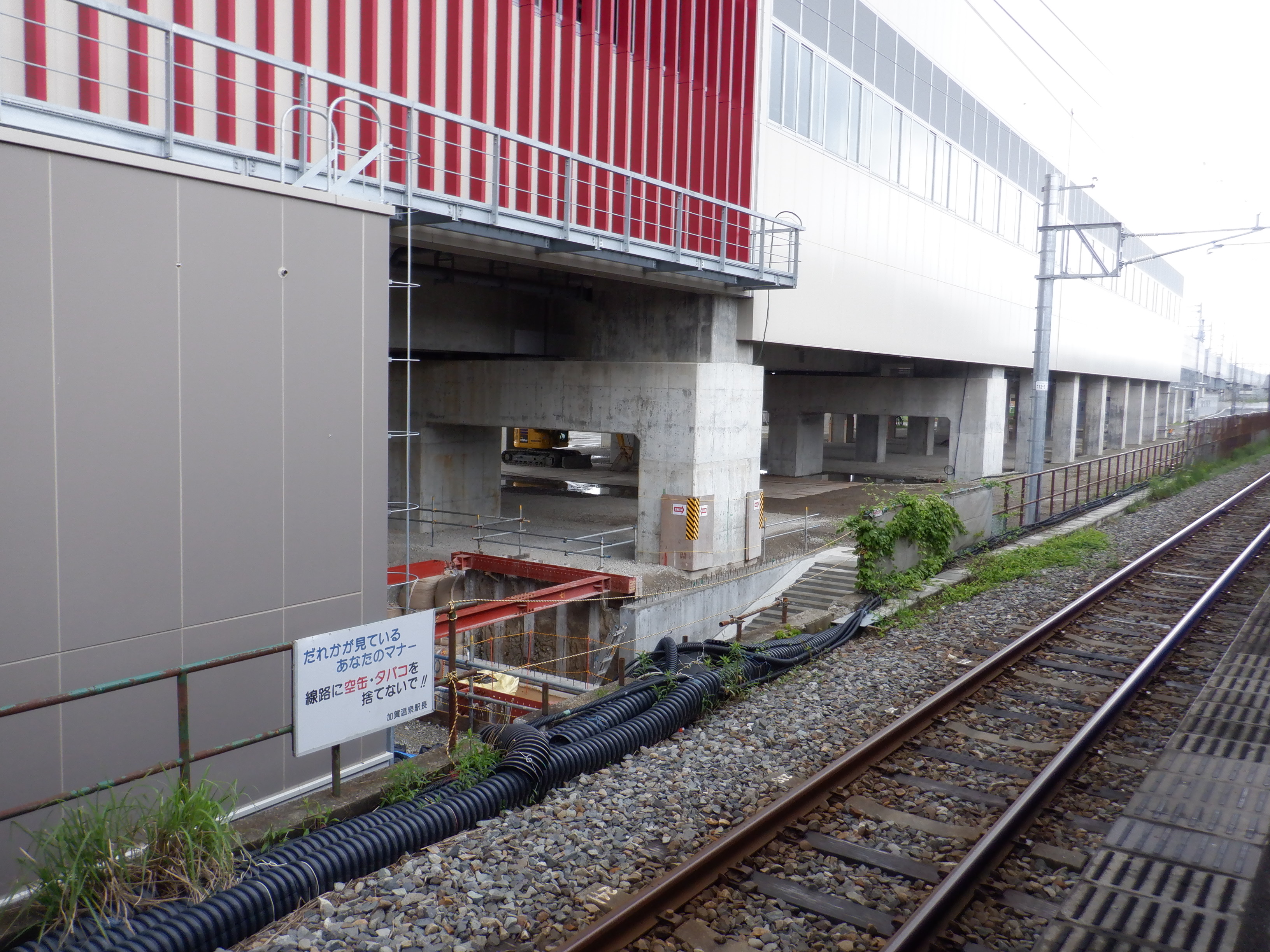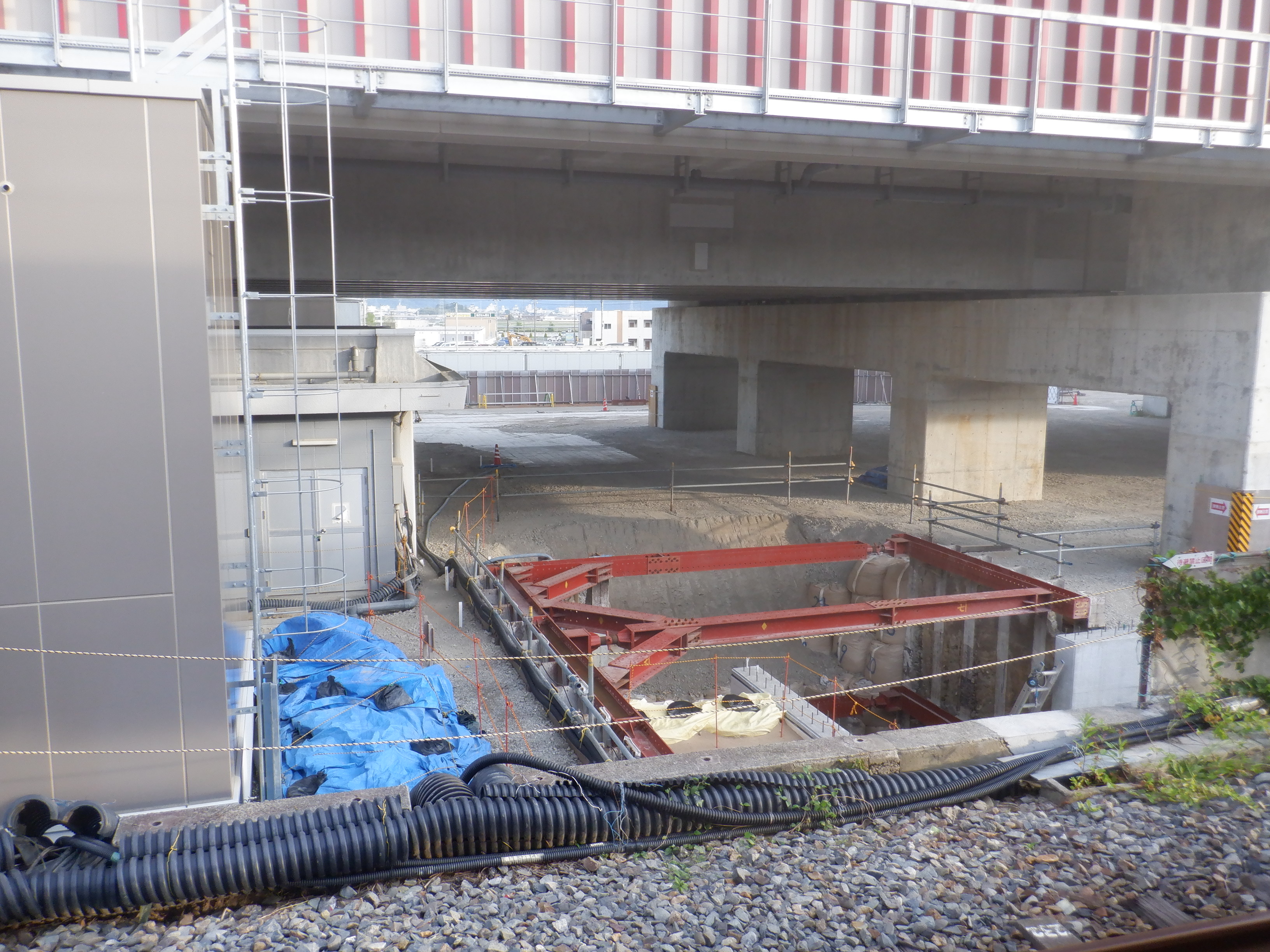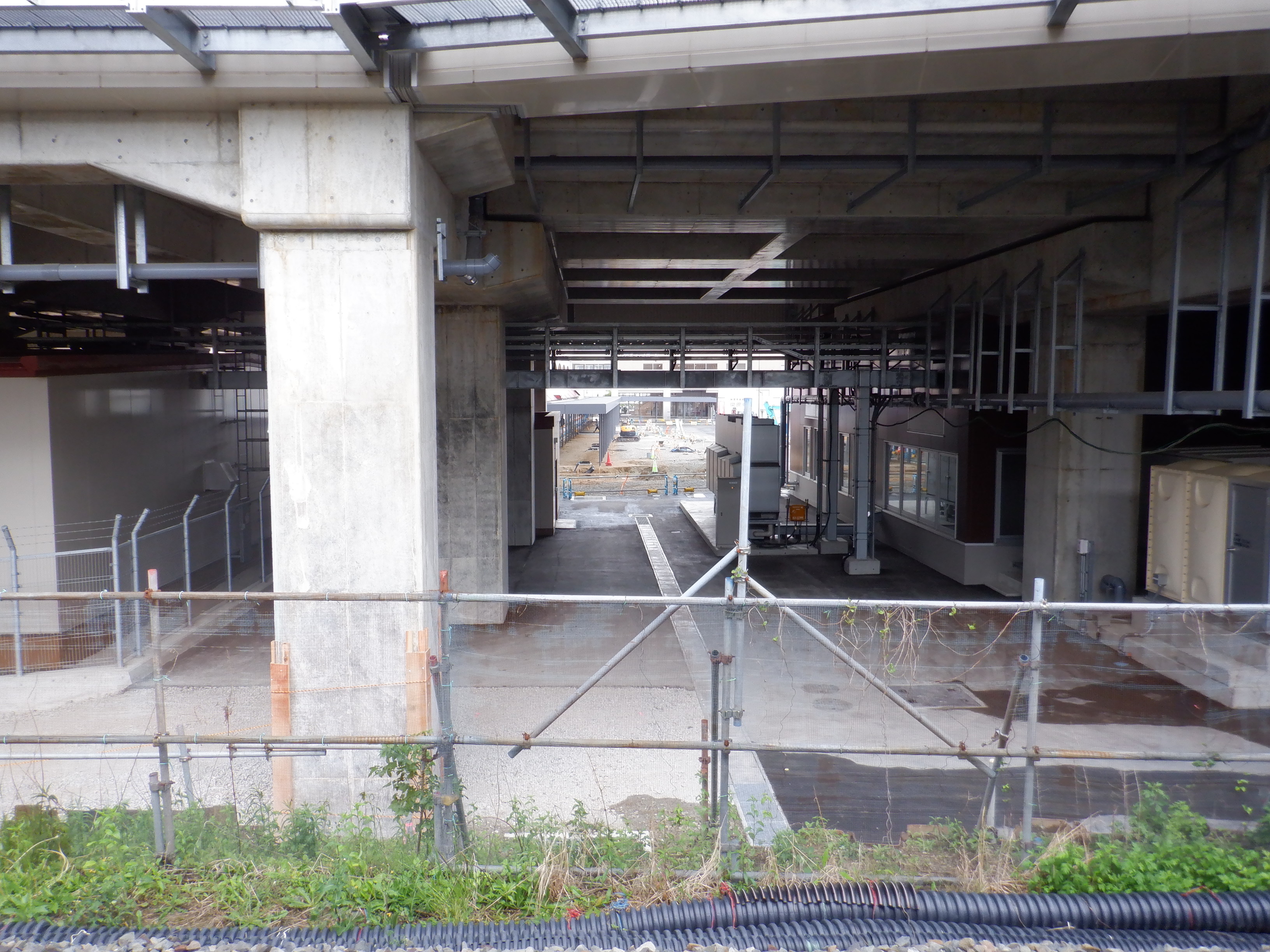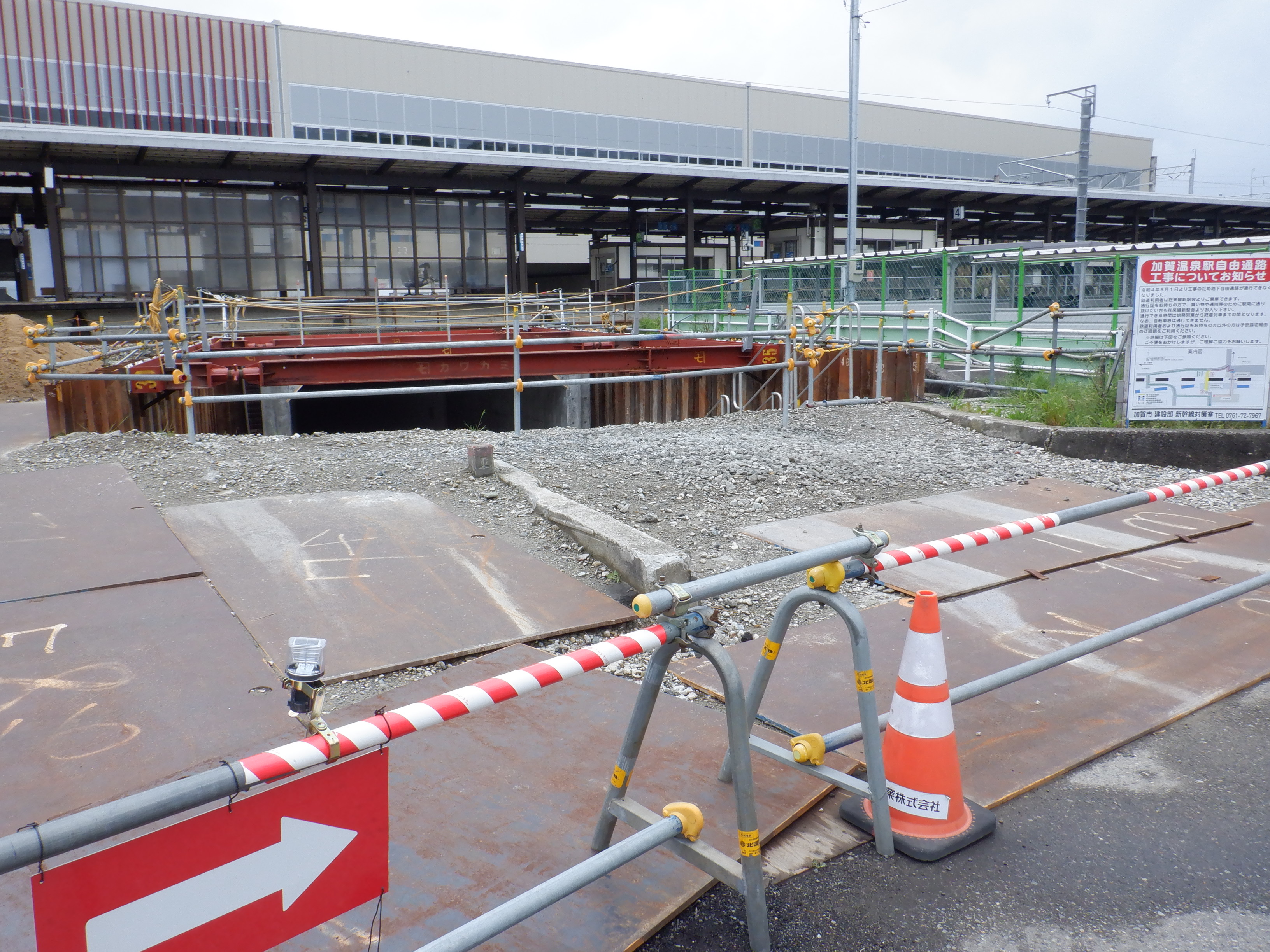 北口駅舎の横から見た地下自由通路を再建設中のところ。