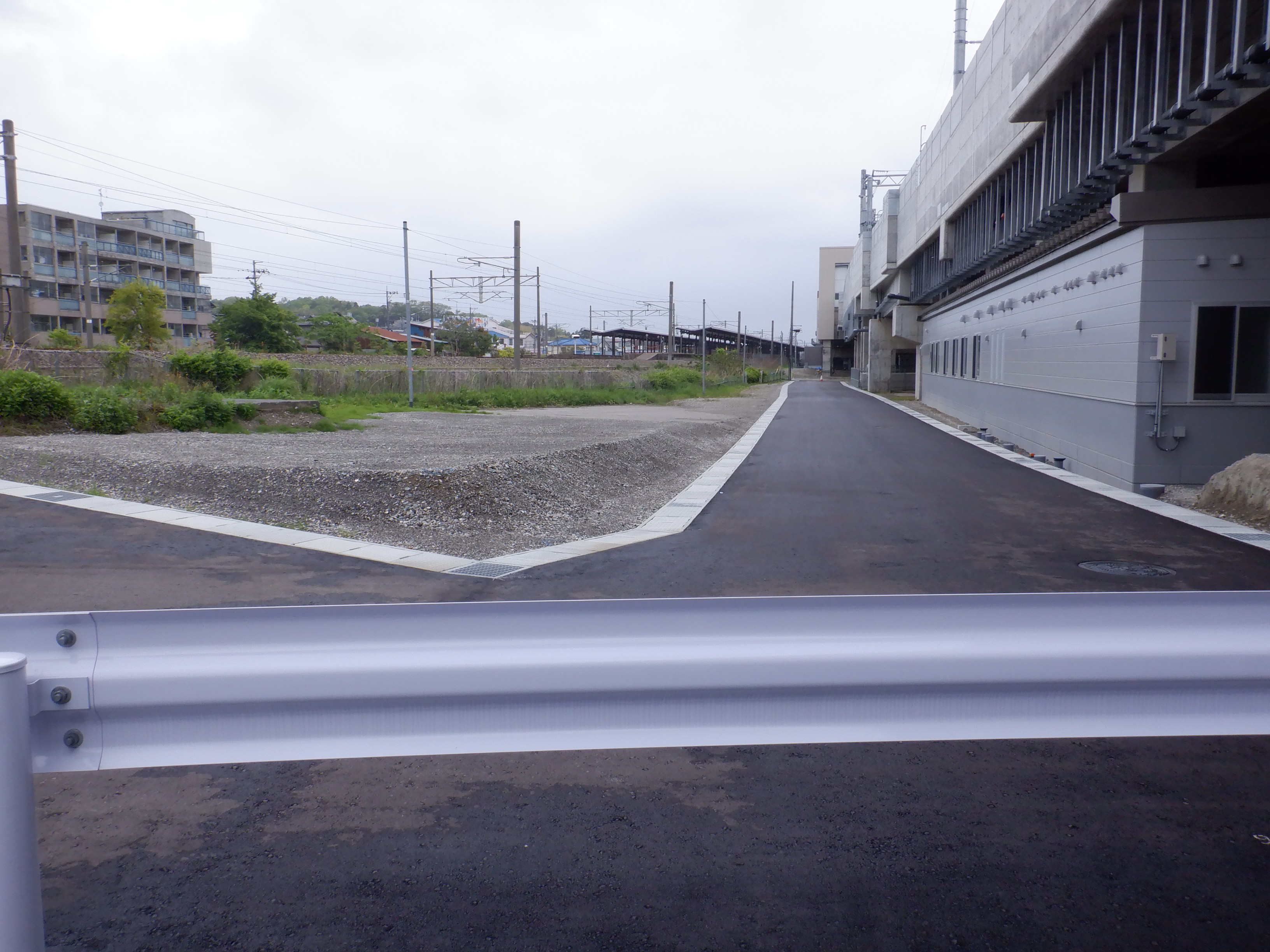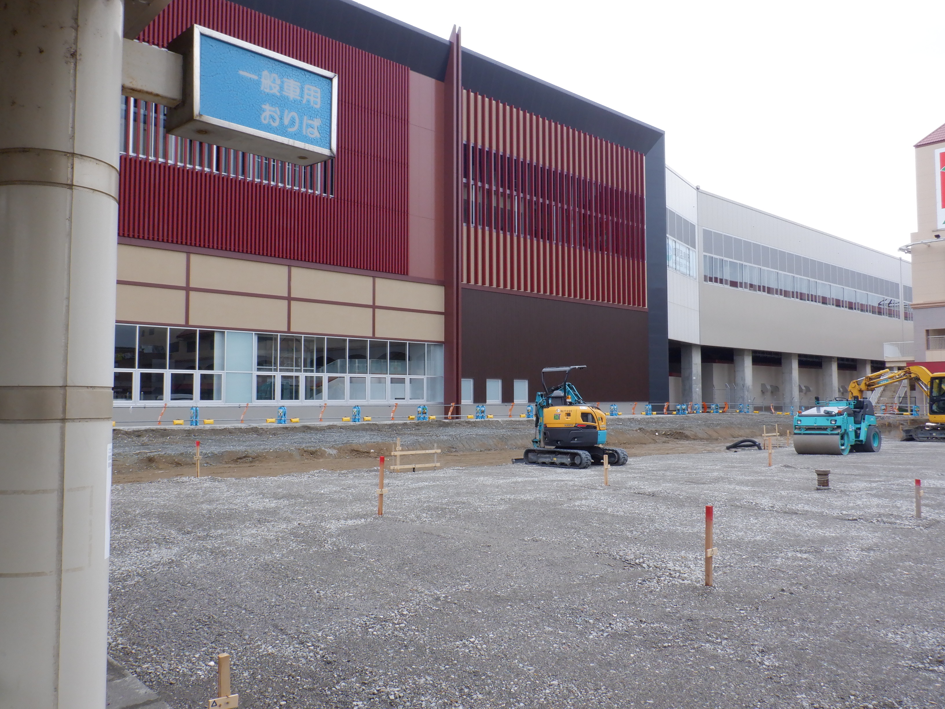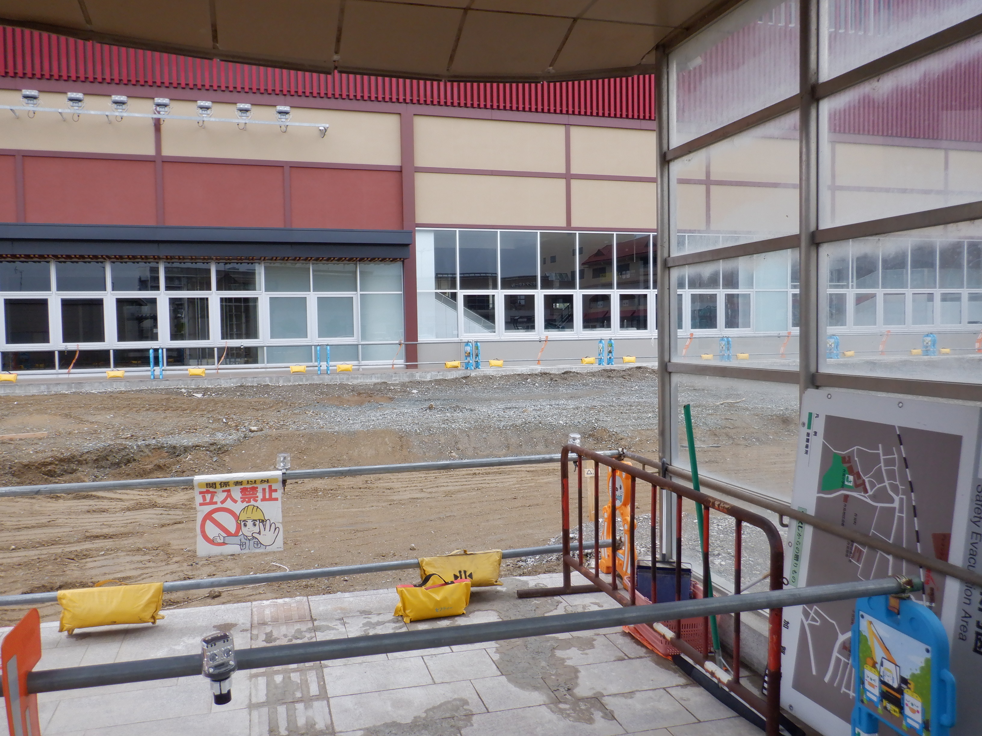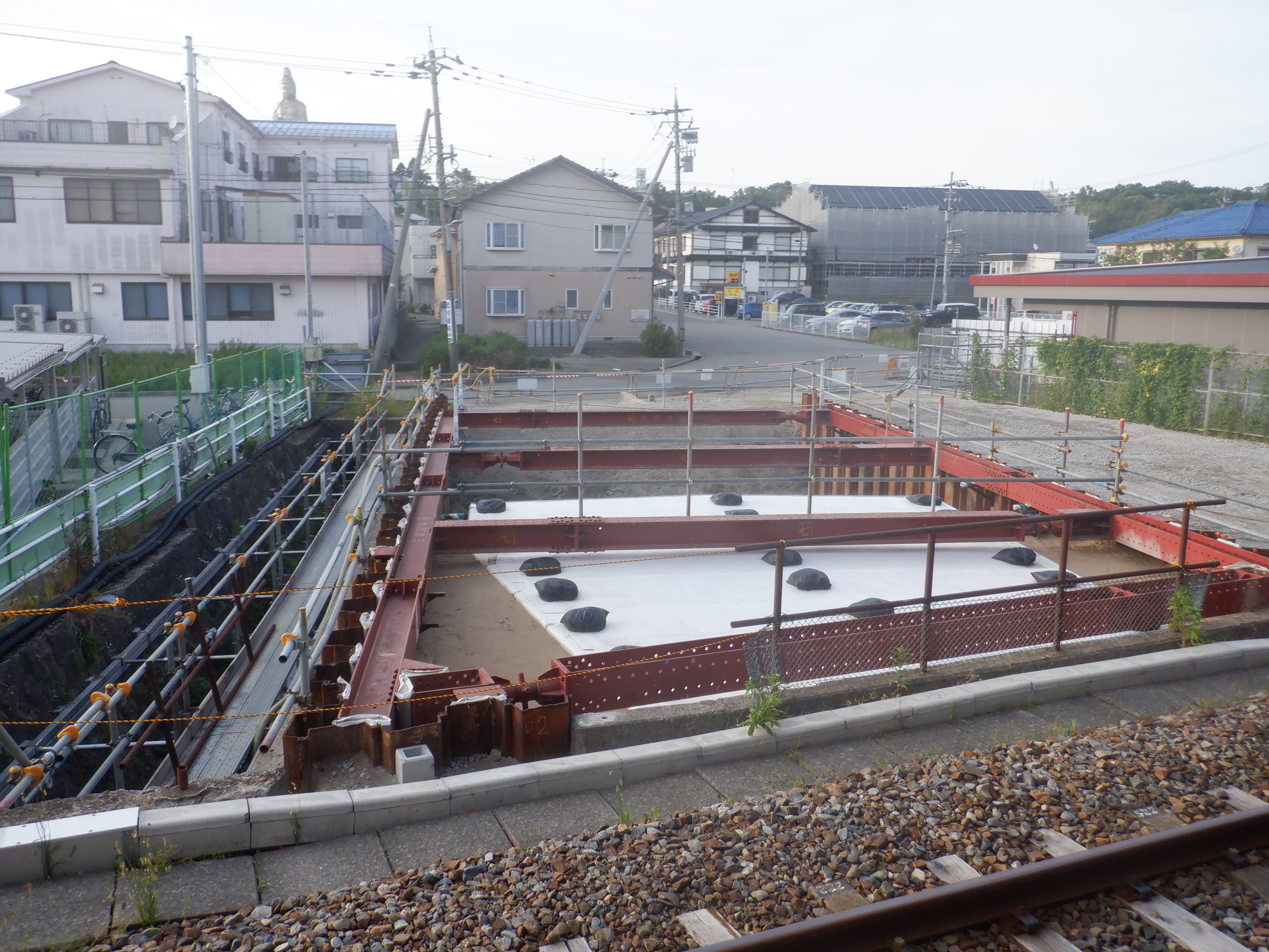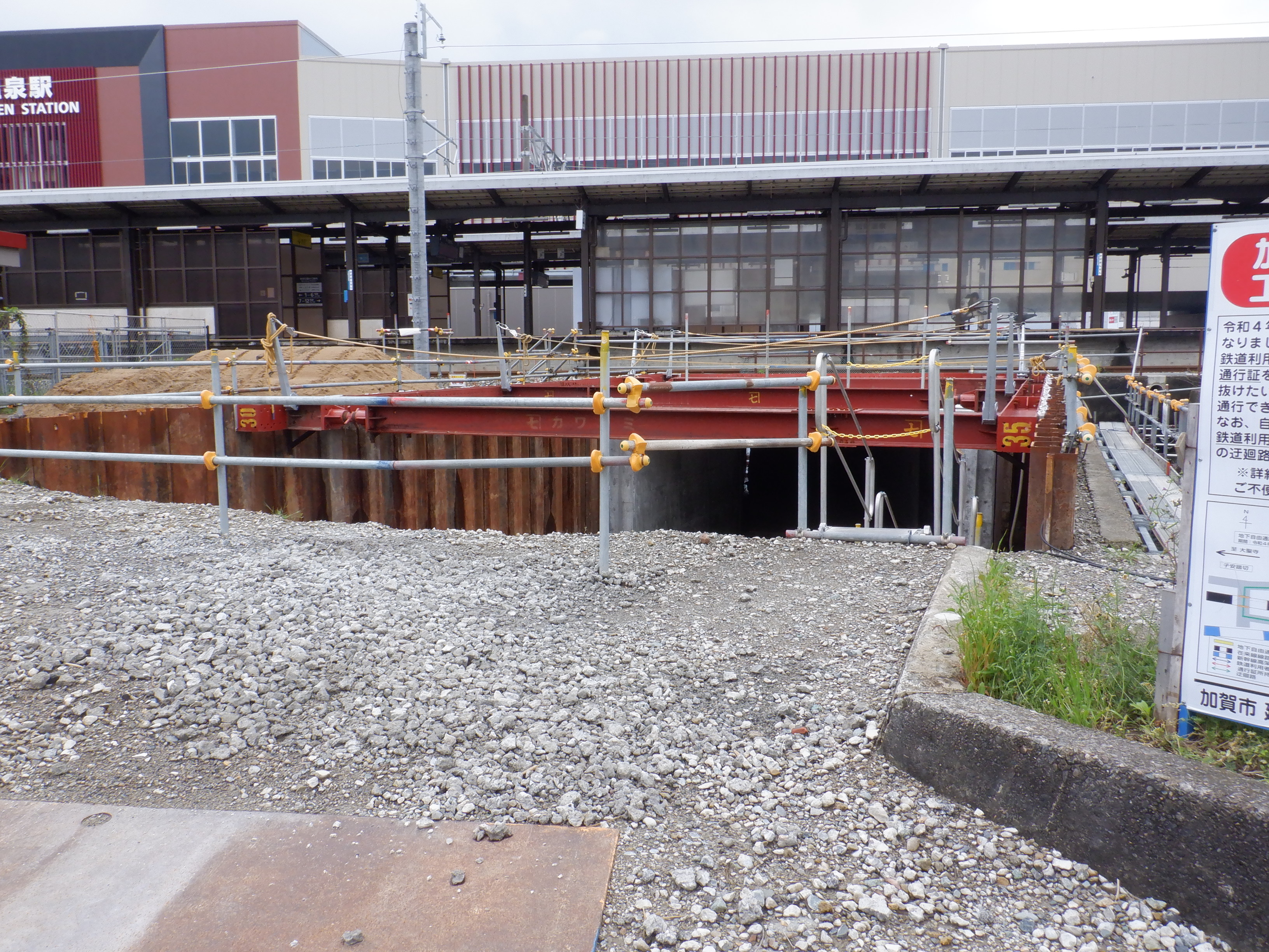 北口駅舎の横から見た地下自由通路を再建設中のところ。