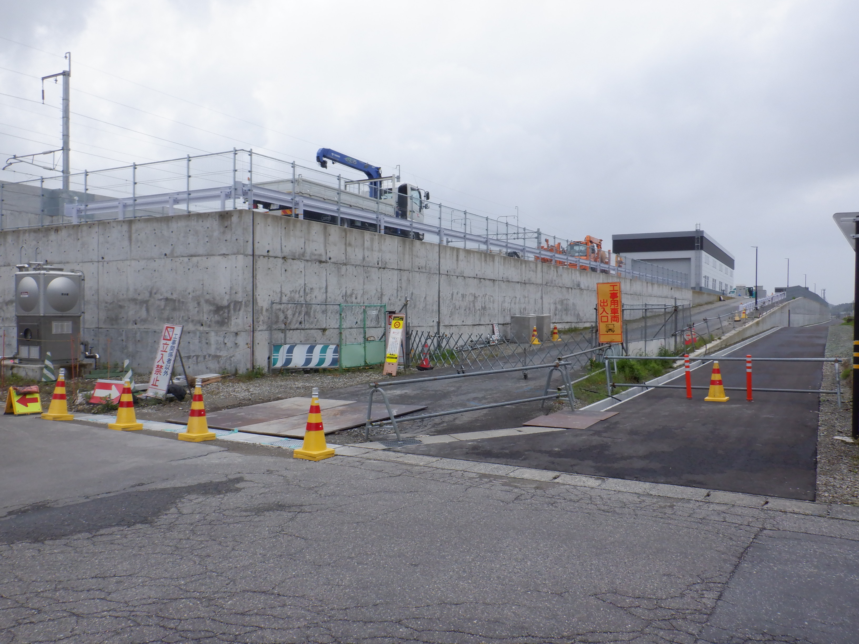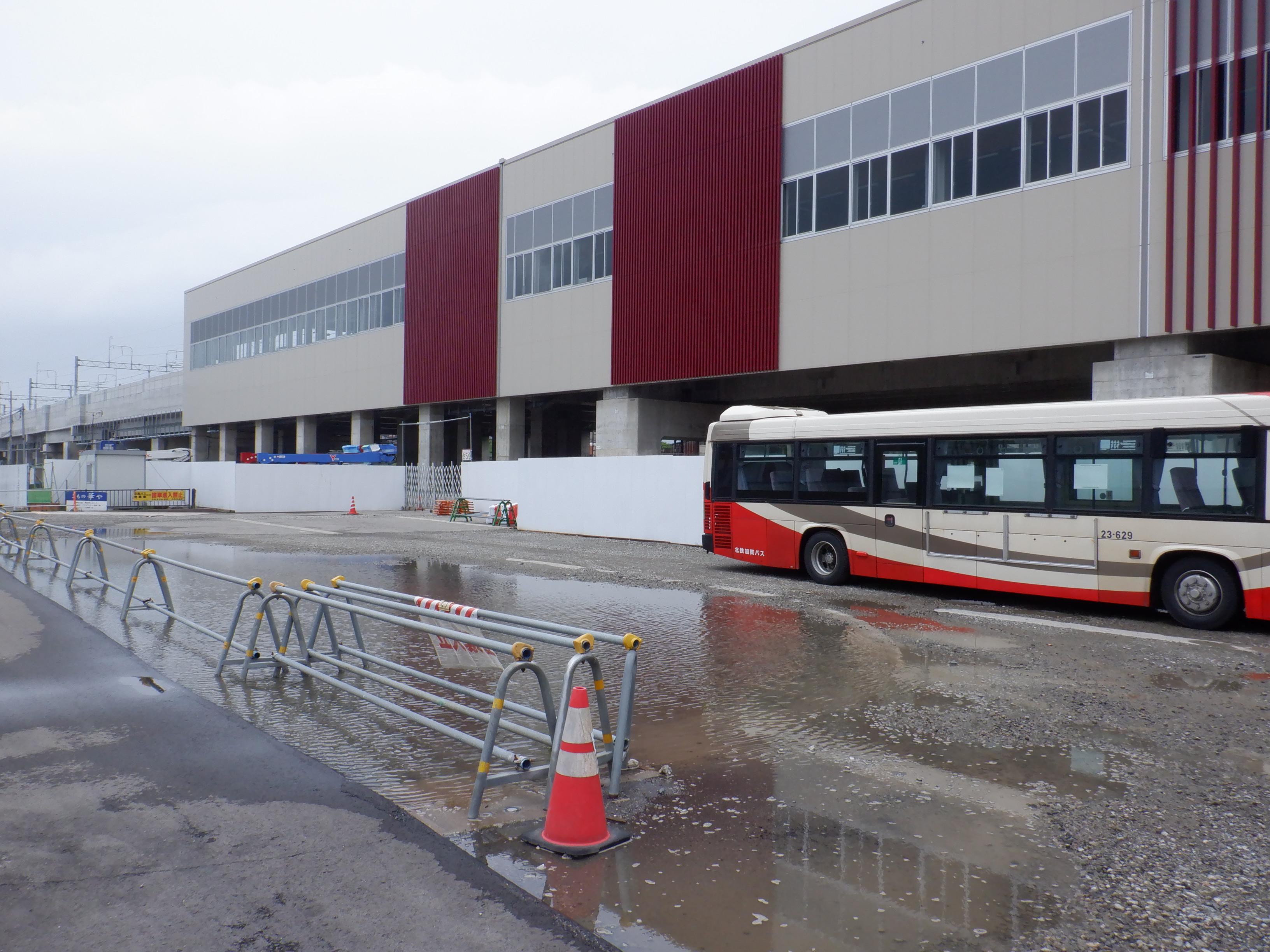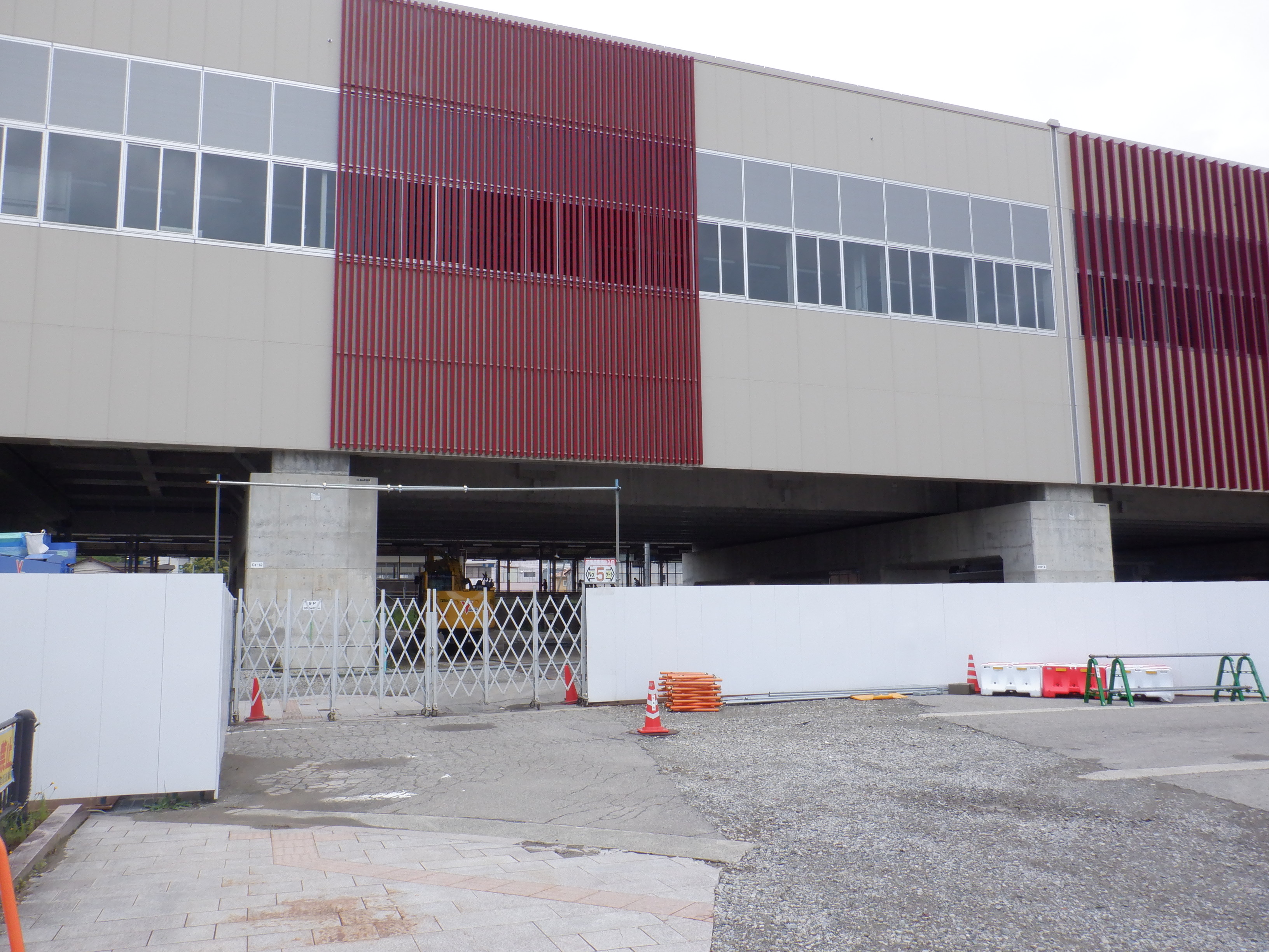 アルプラザ側のシェルター建設工事とそこから見た新幹線駅舎。