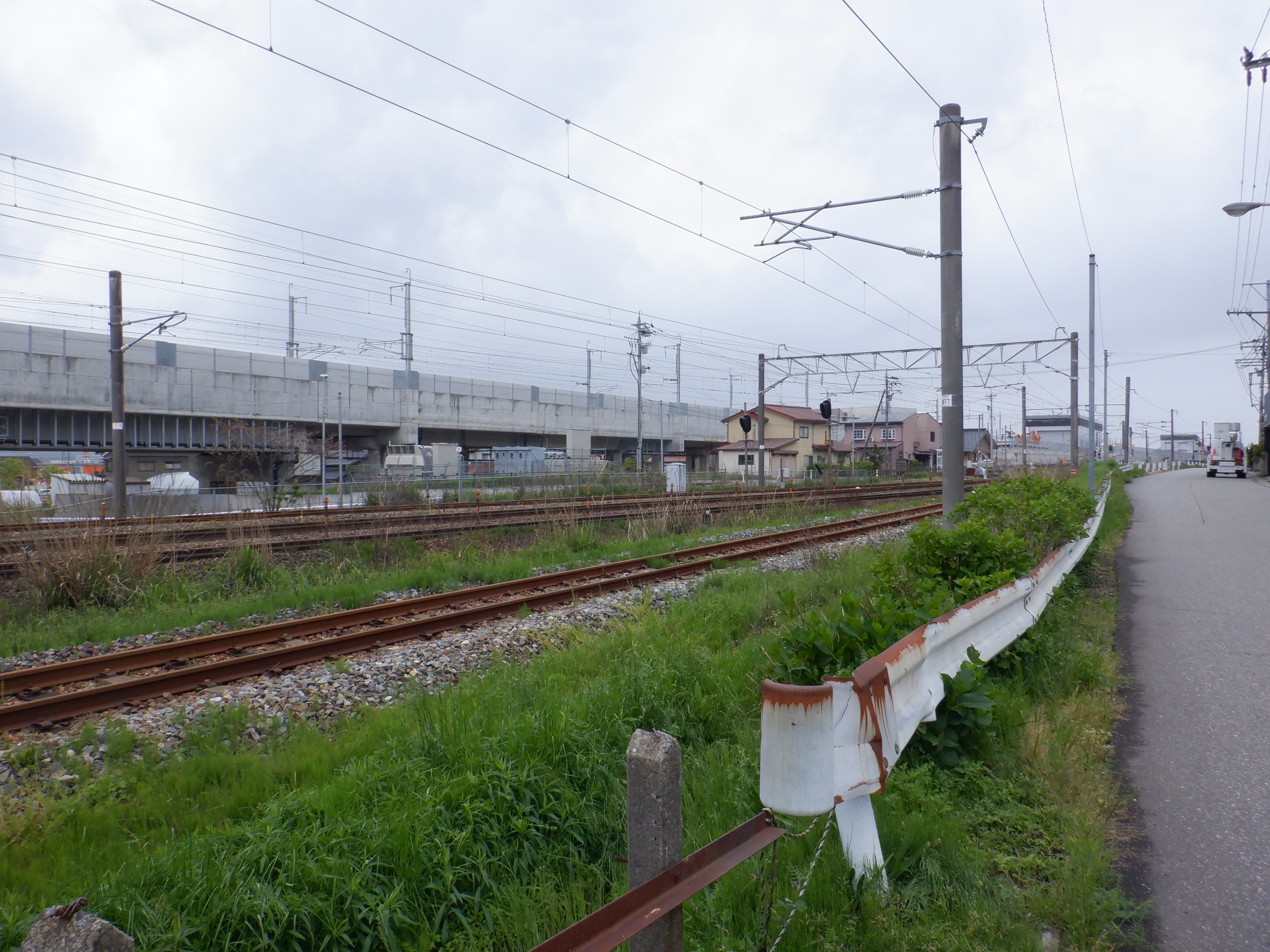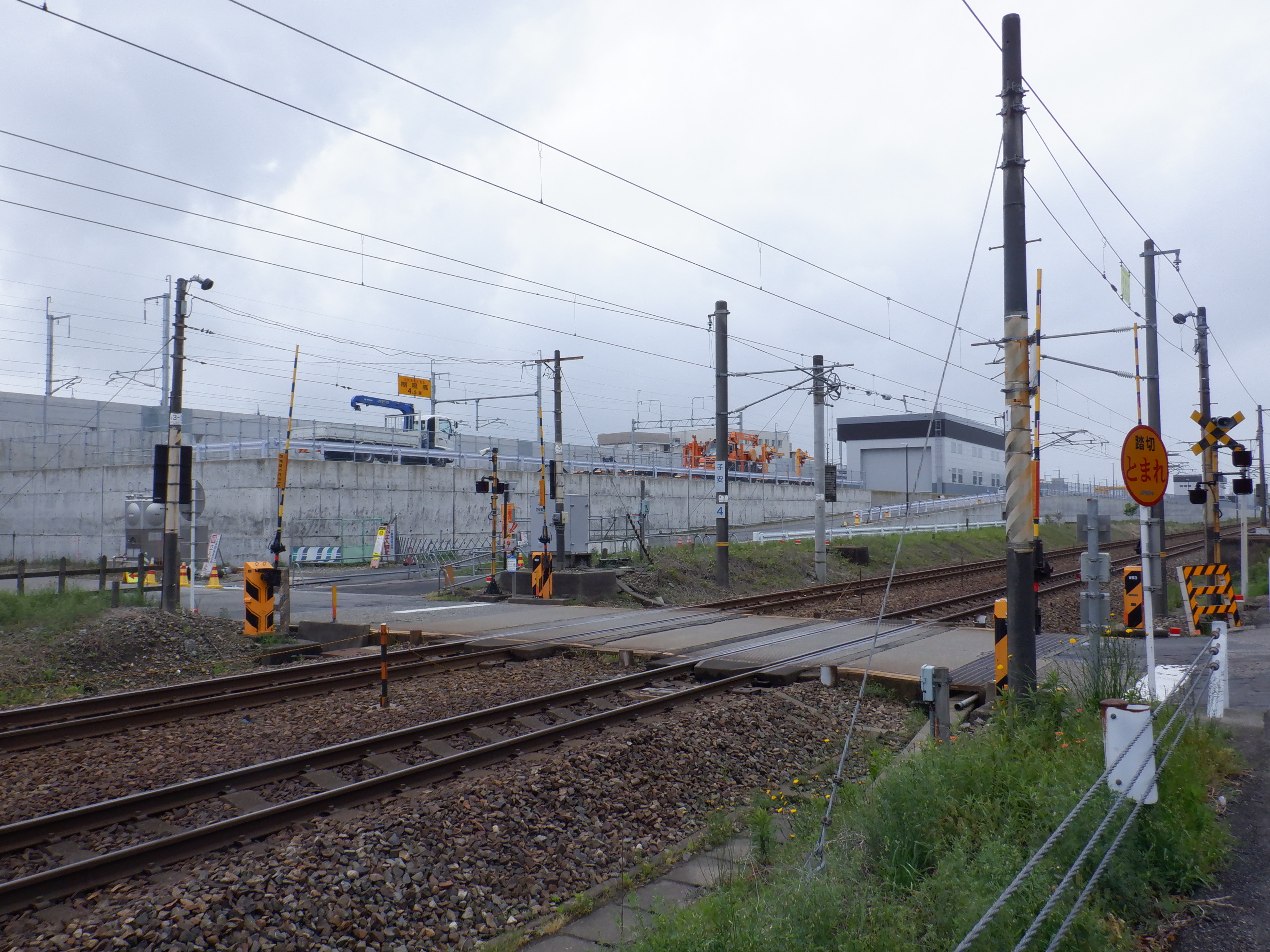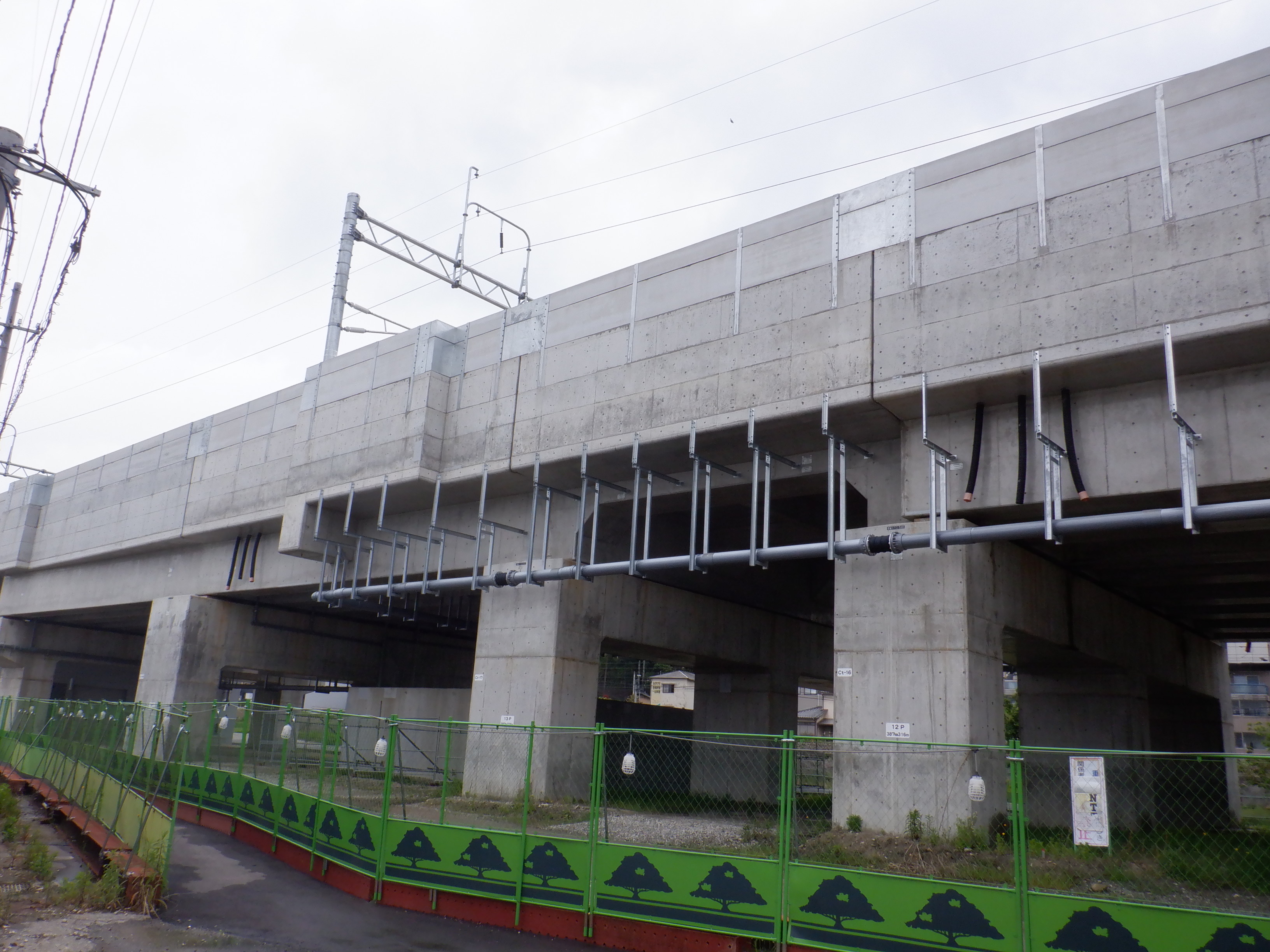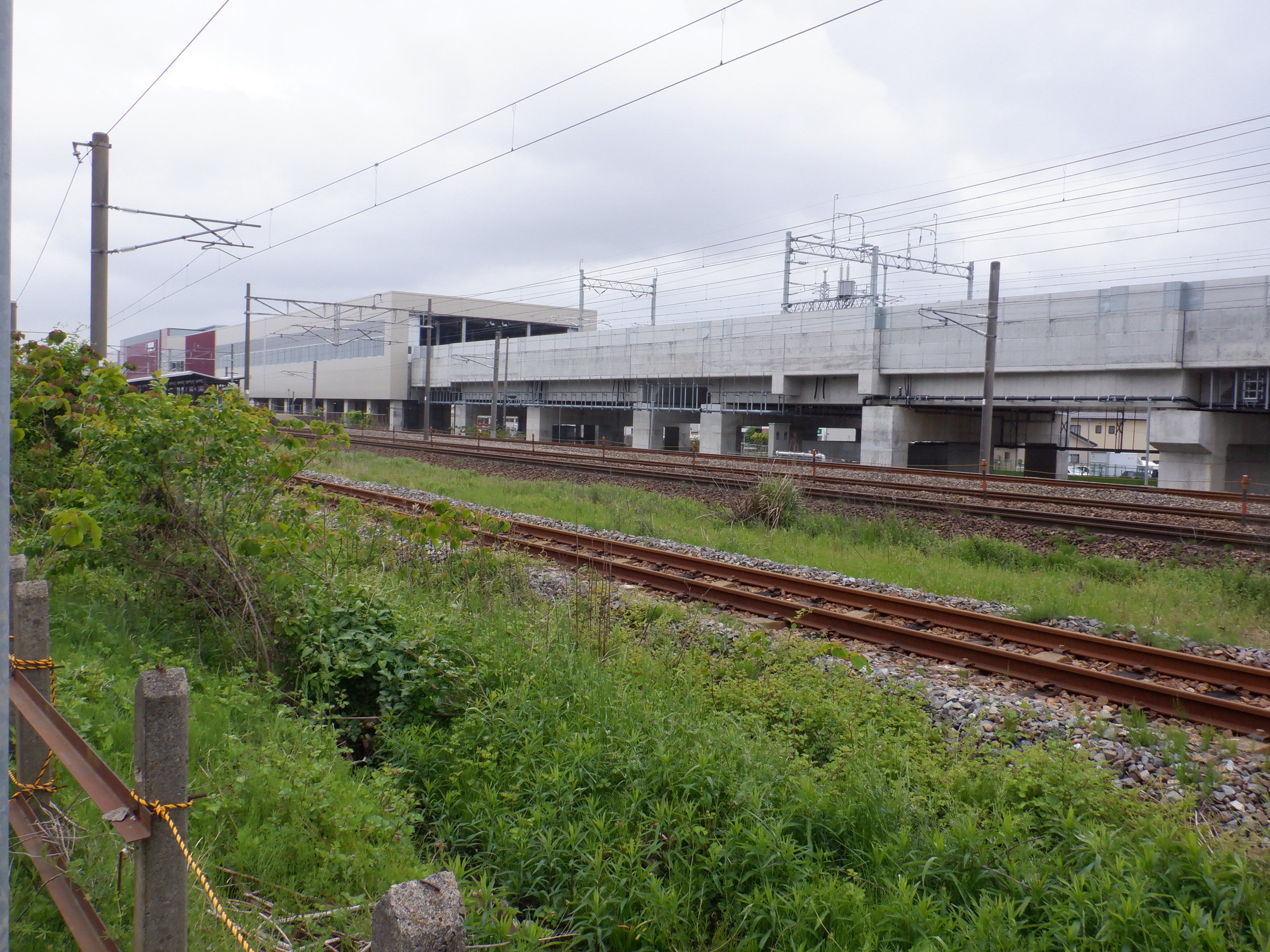 アルプラザ側のシェルター建設工事とそこから見た新幹線駅舎。