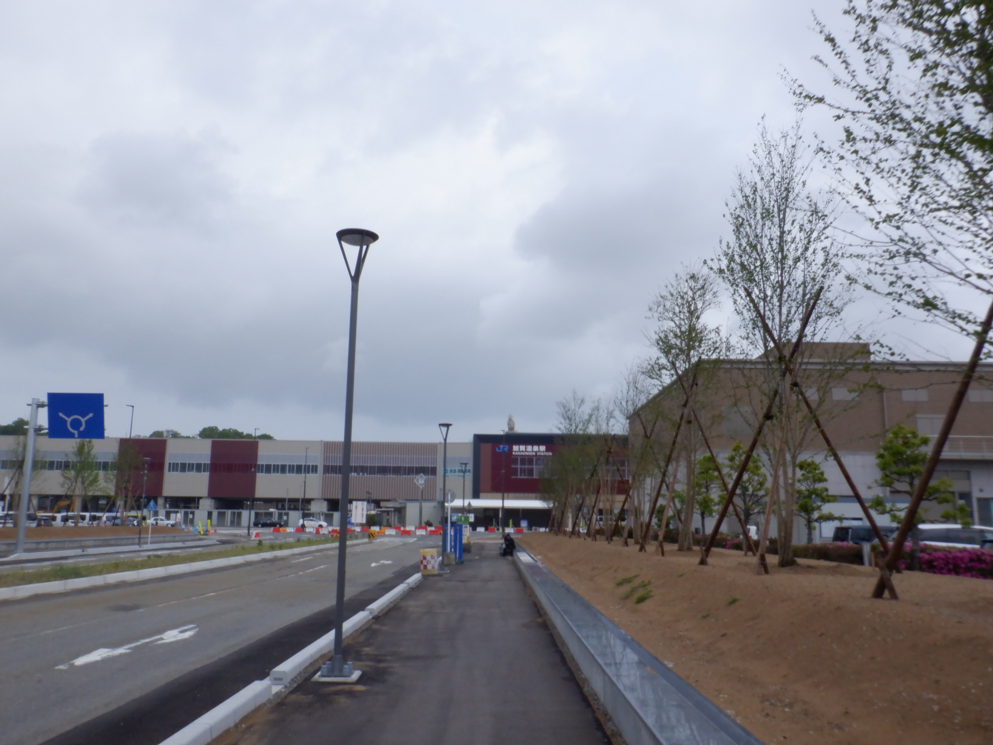 仮設駅舎のアルプラザ側とその先から見た新幹線駅舎。