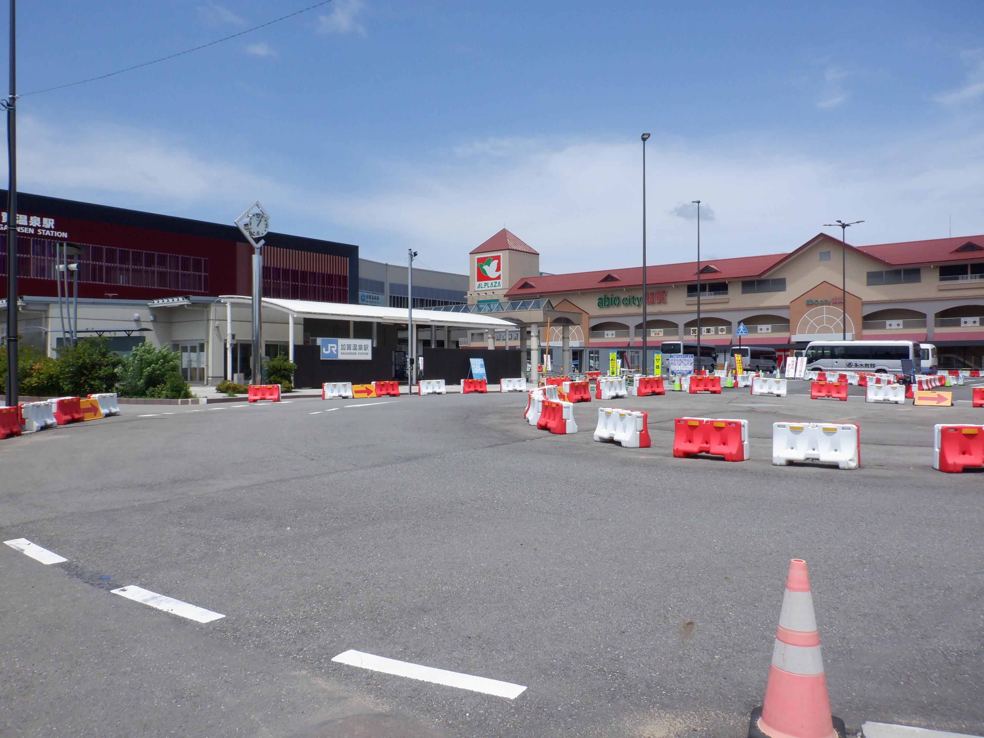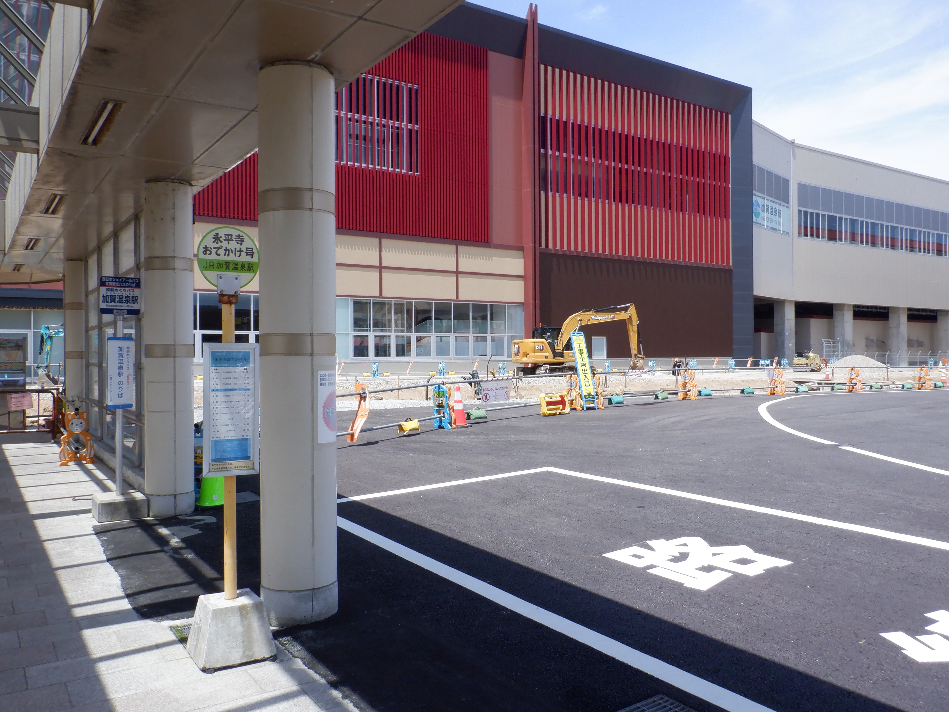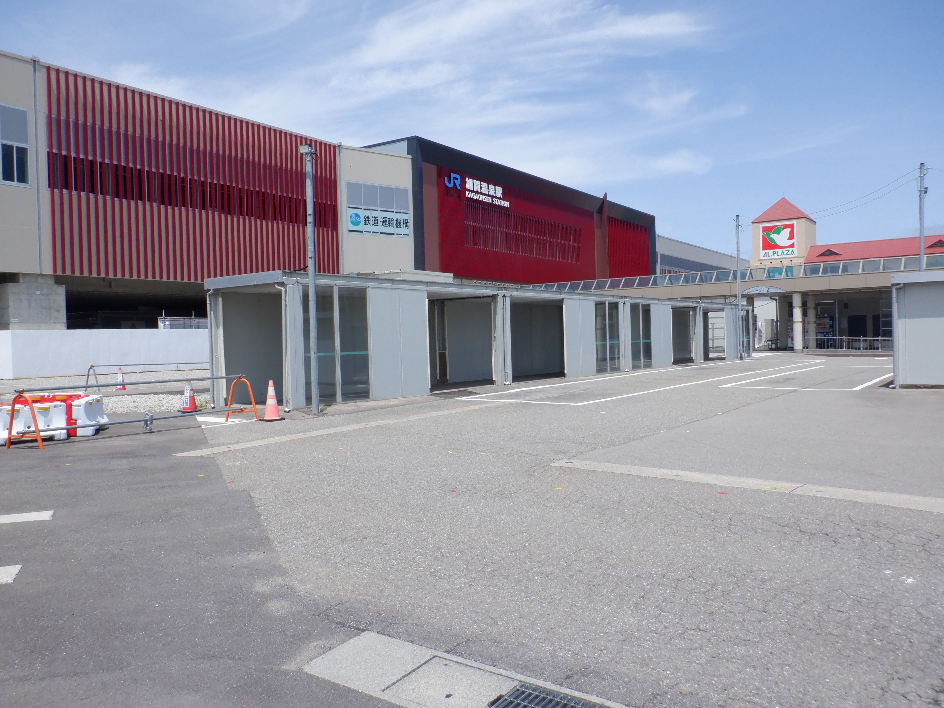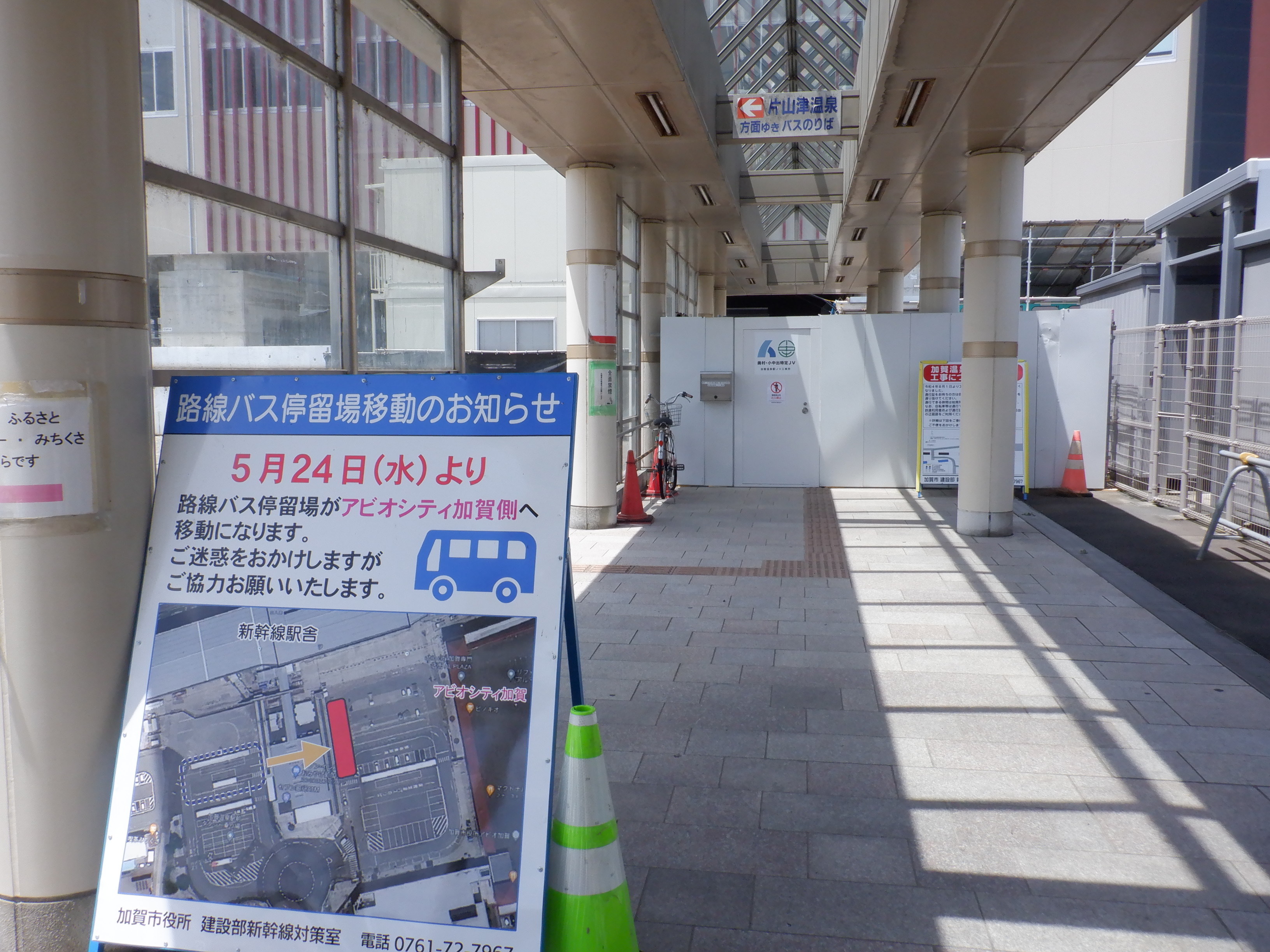 仮設駅舎のアルプラザ側の仮設バスのりばとそこから見た新幹線駅舎。