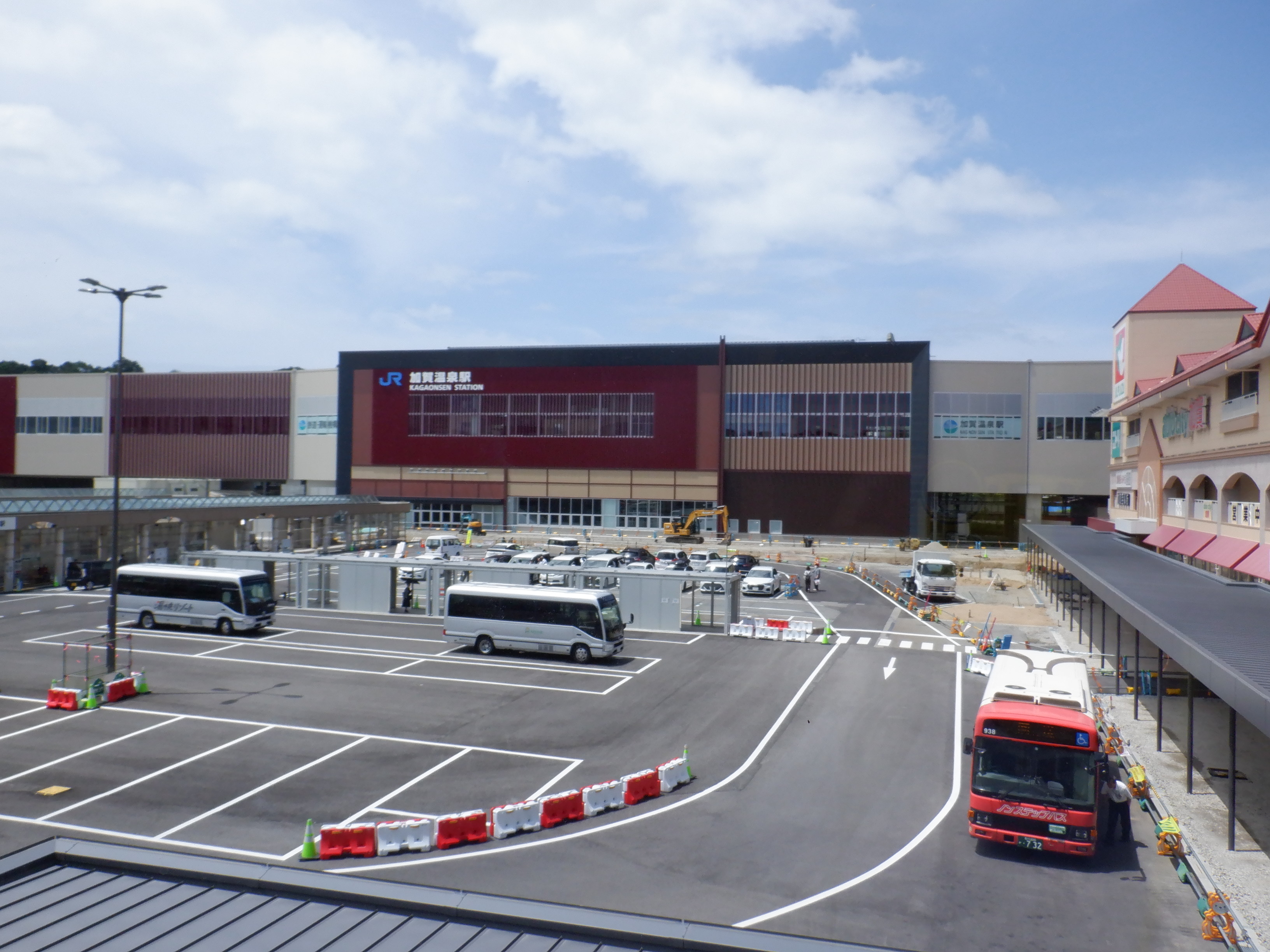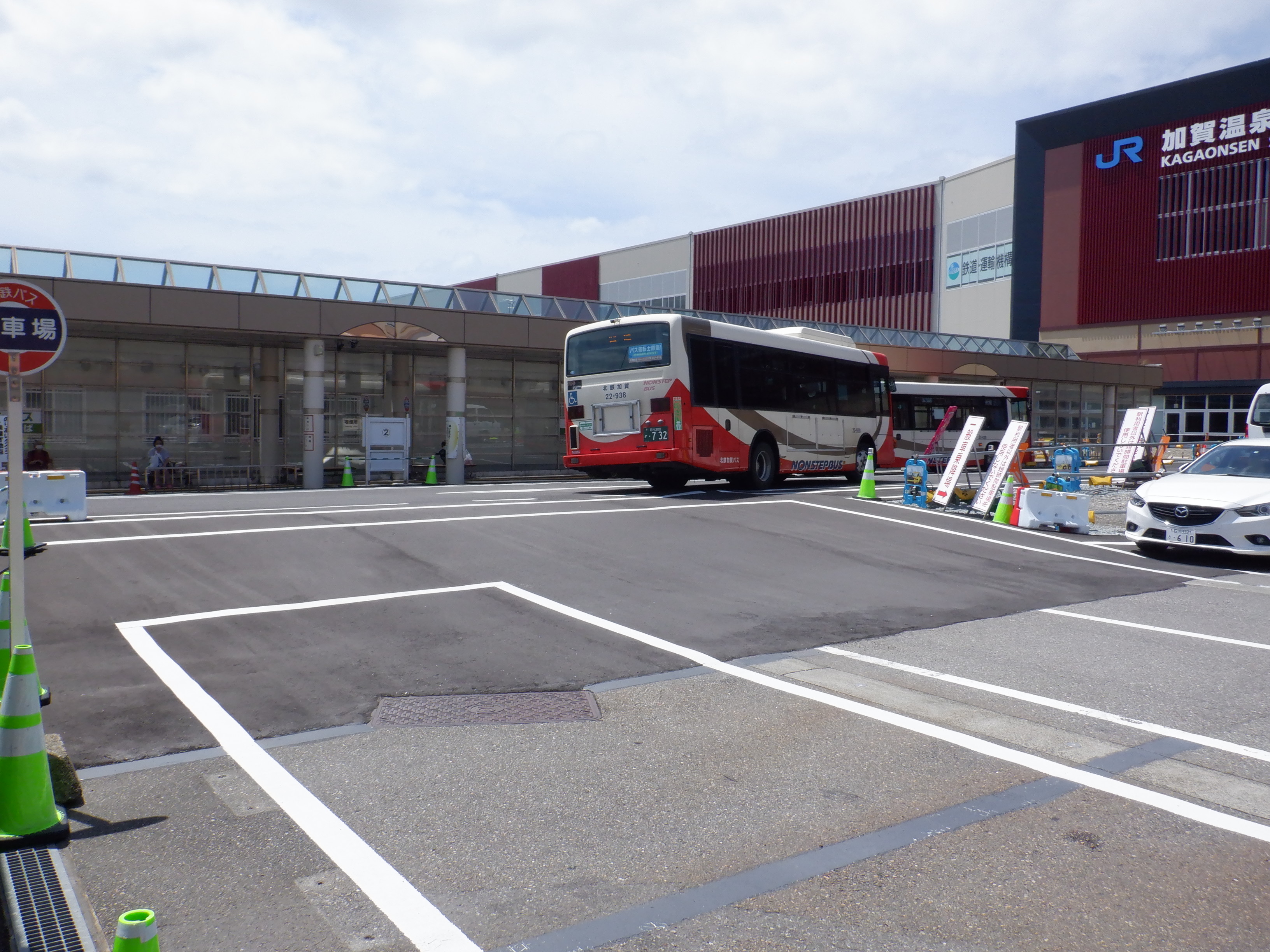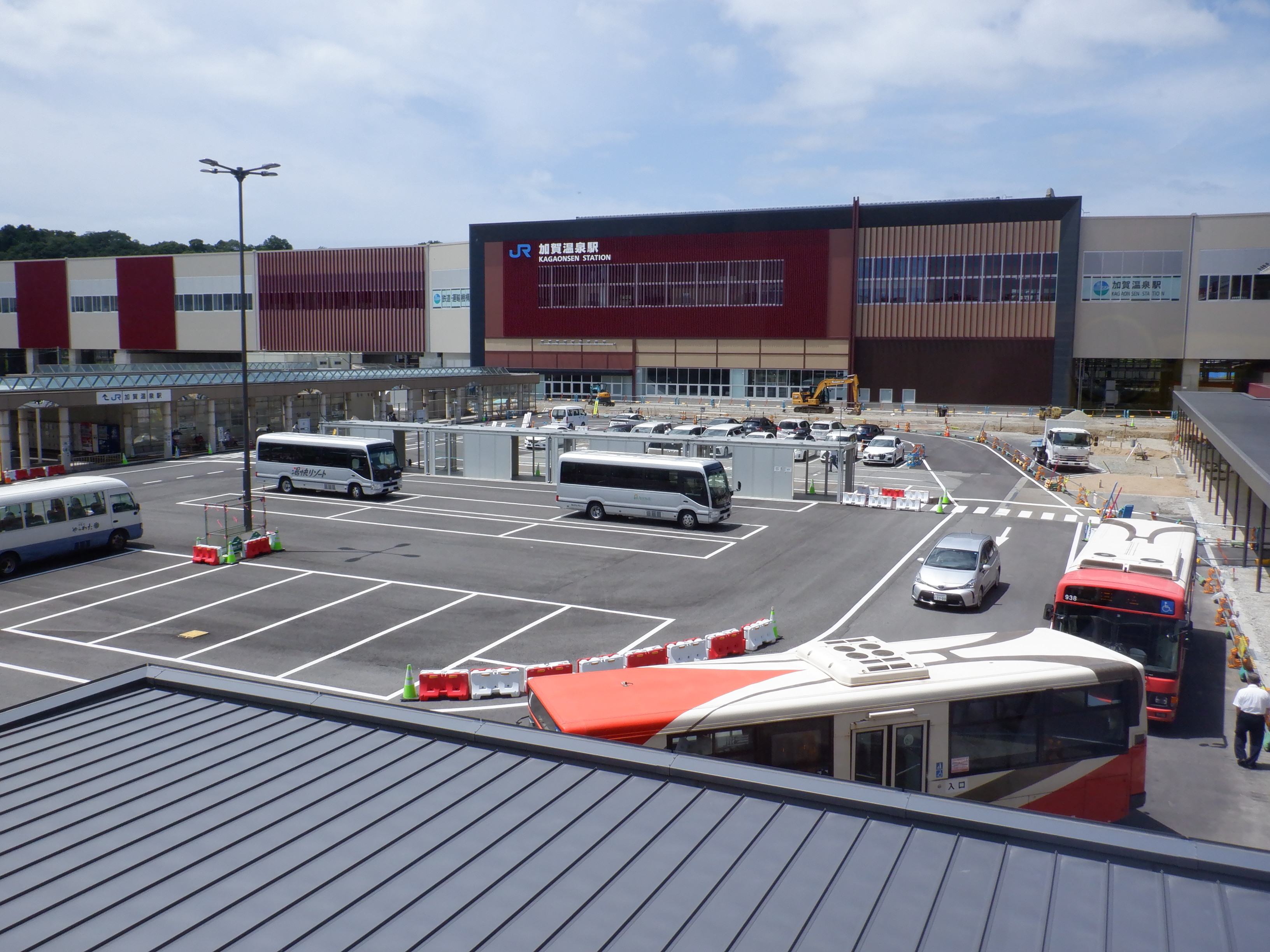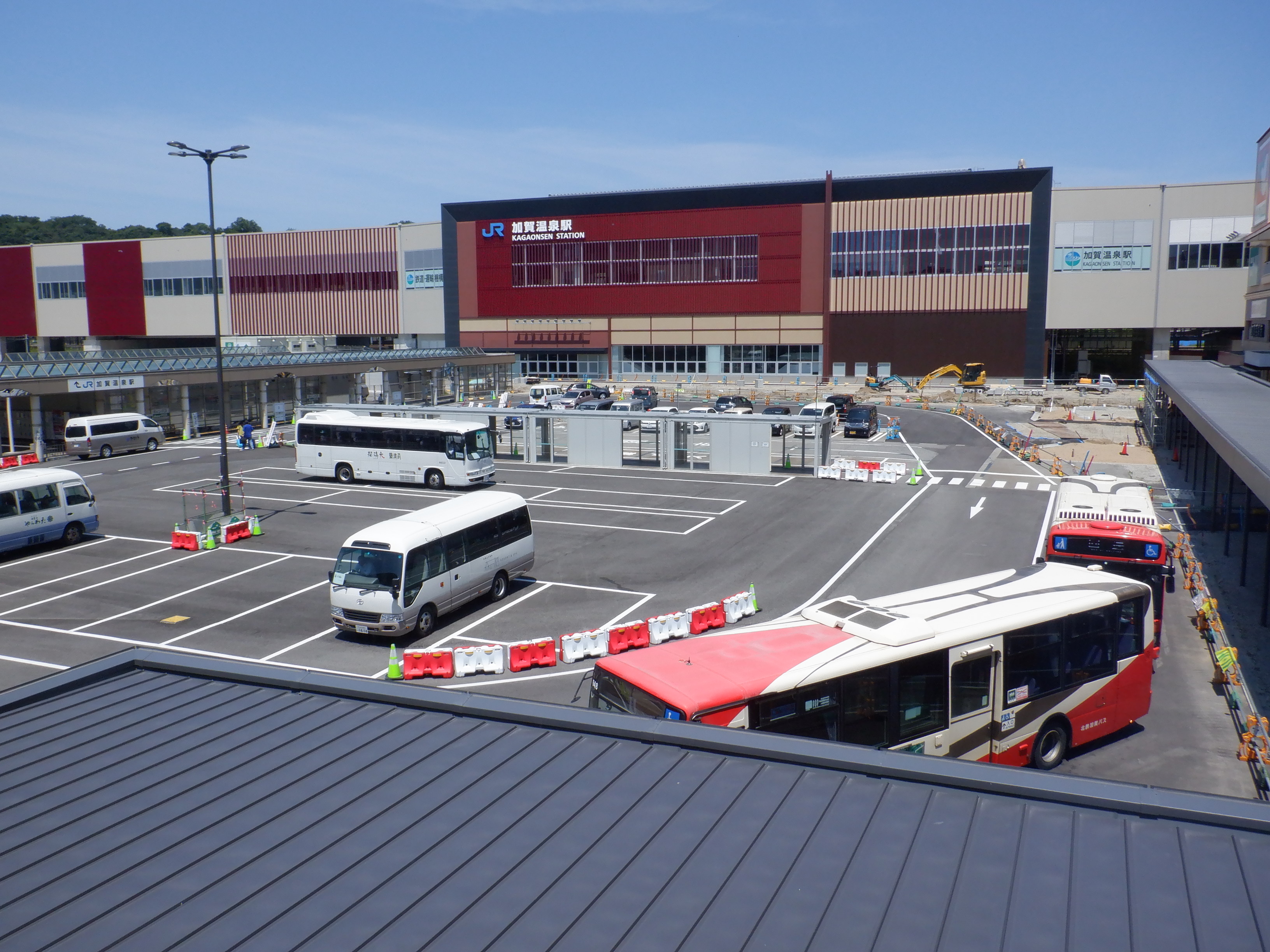 仮設駅舎のアルプラザ側の仮設バスのりばとそこから見た新幹線駅舎。