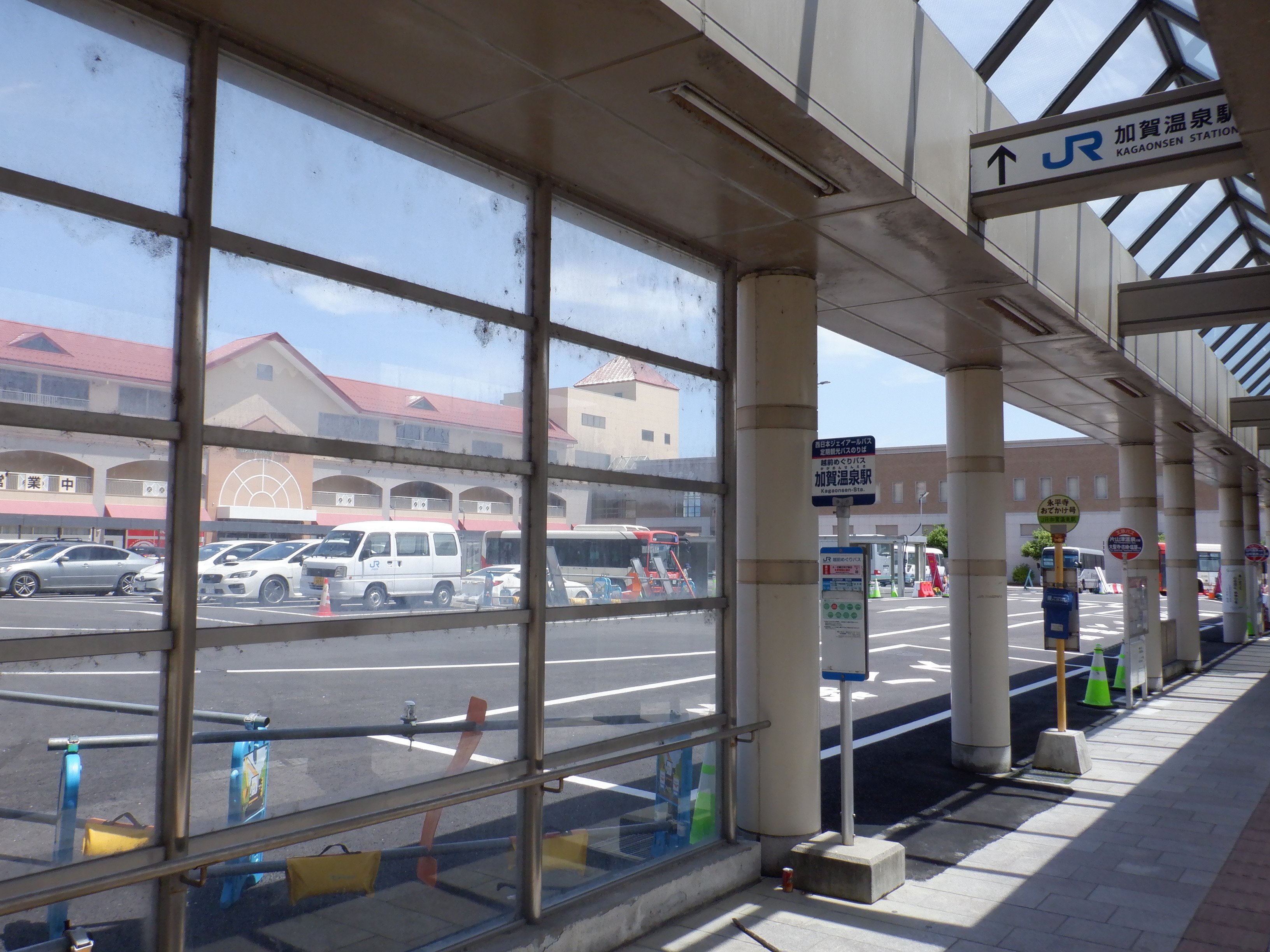 仮設駅舎のアルプラザ側の仮設バス停とそこから見た新幹線駅舎。