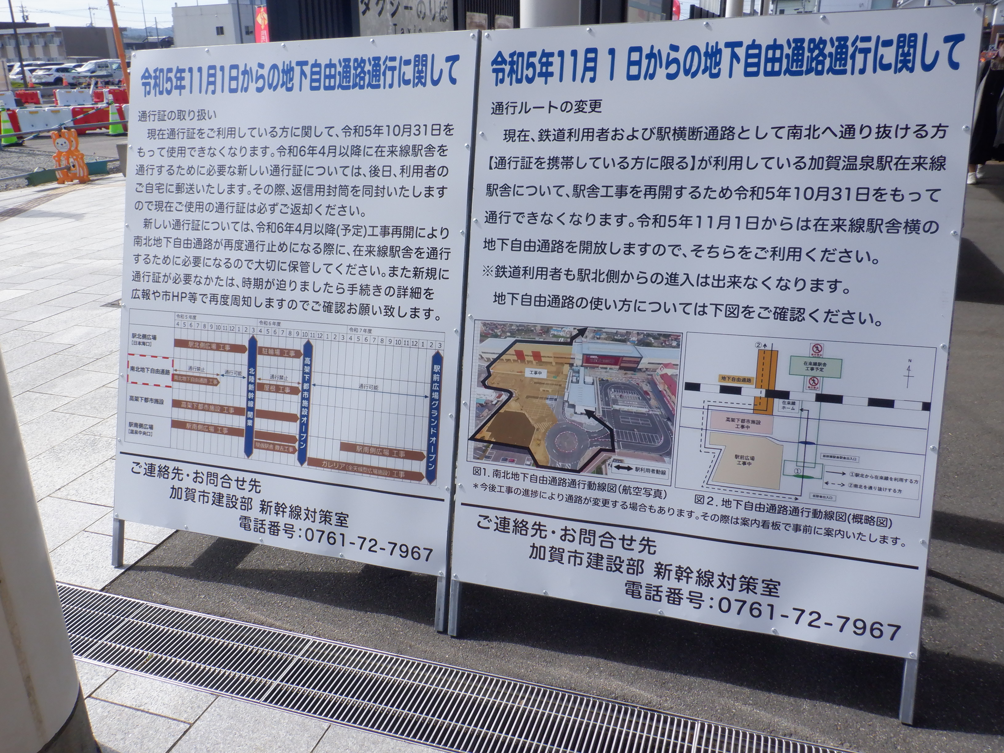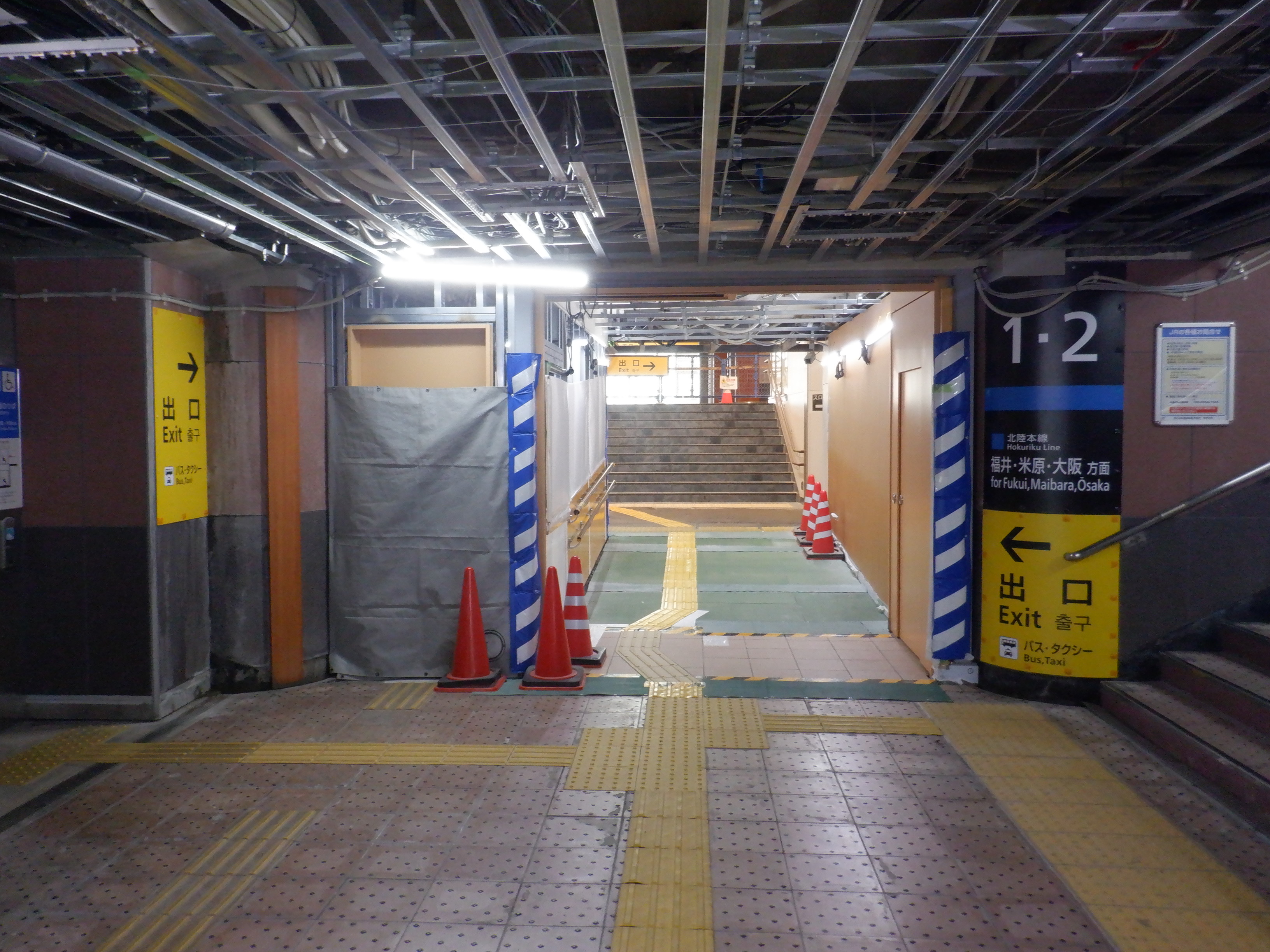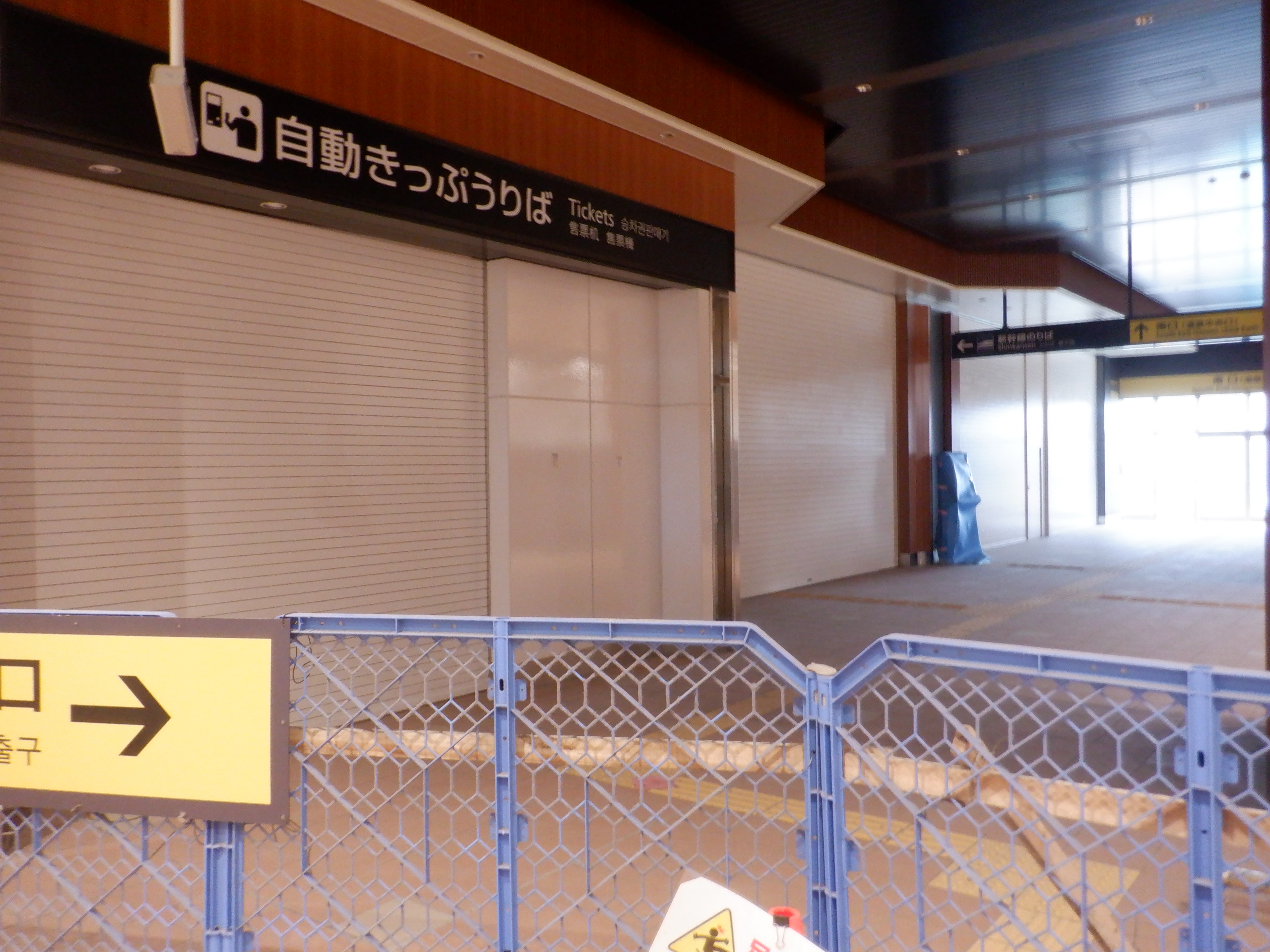 北口への地下自由通路への通路だったところにコンビニ・待合室等の建設工事の標示がされました。工期は新幹線開業時期を跨ぎます。