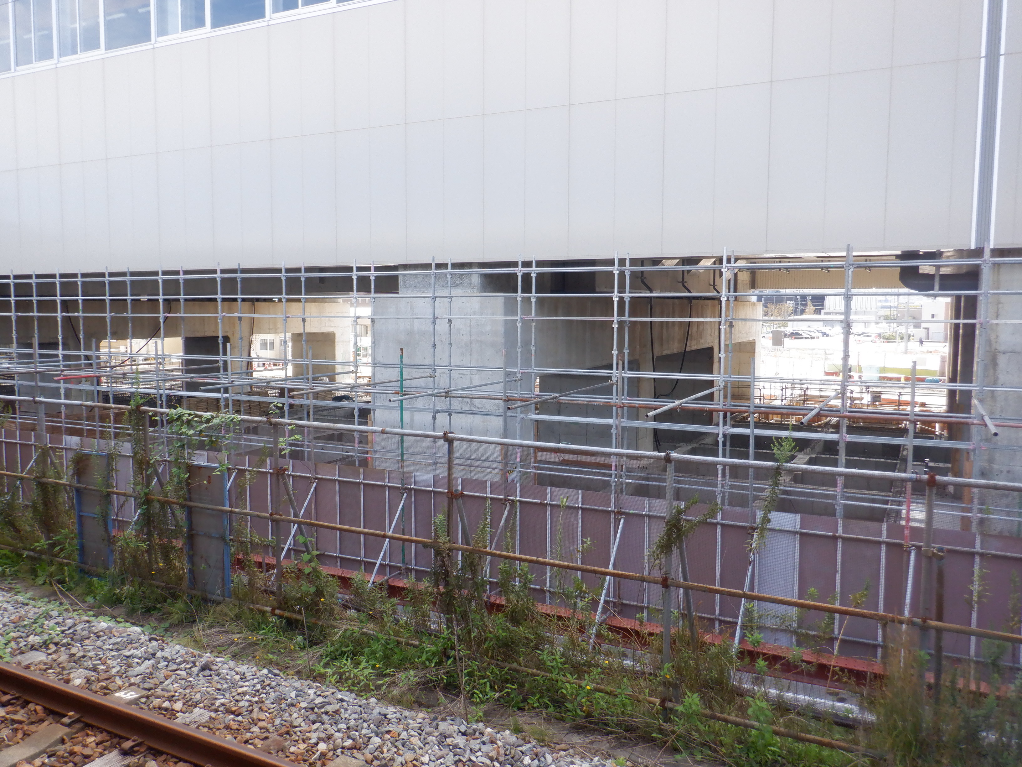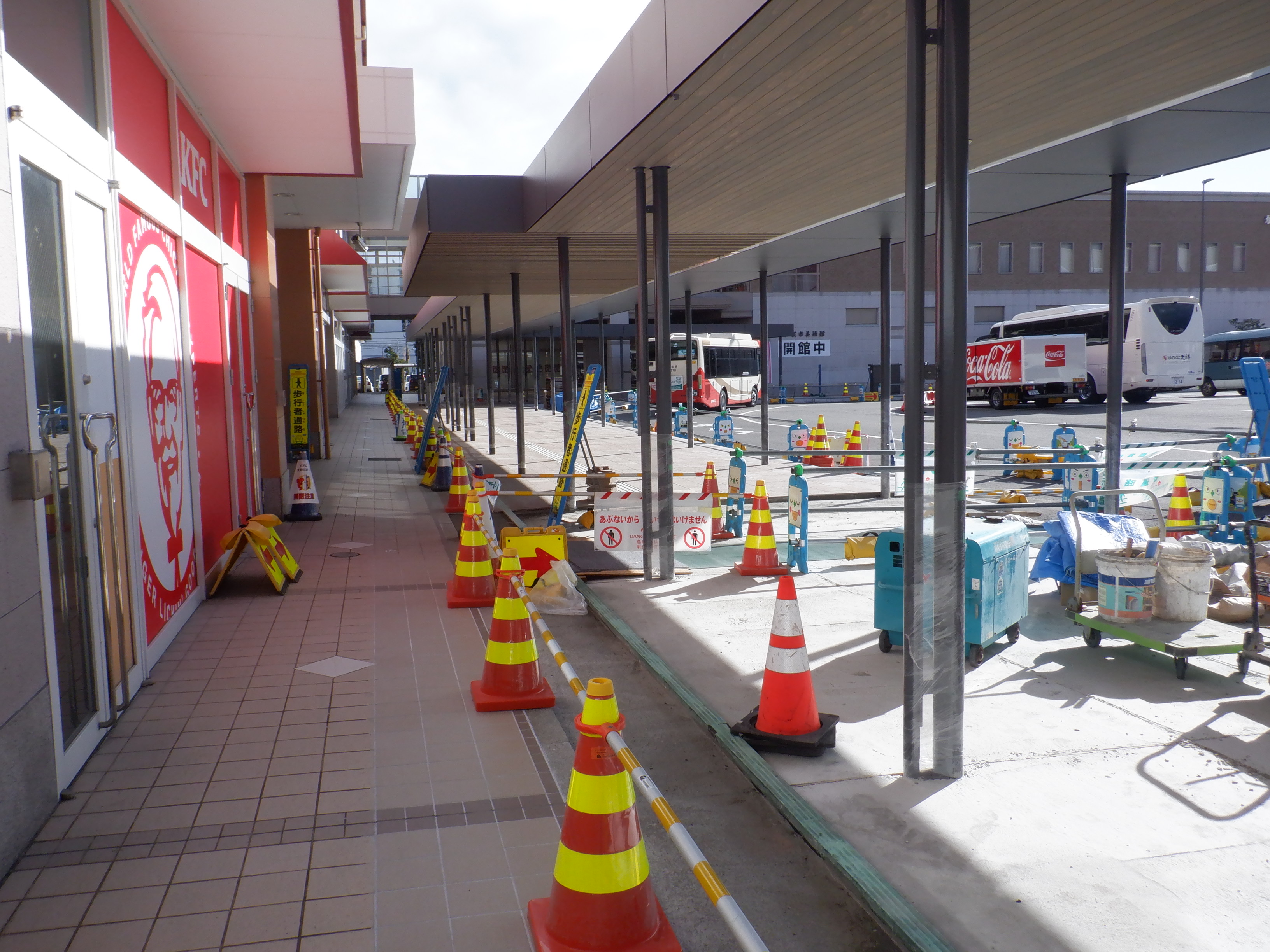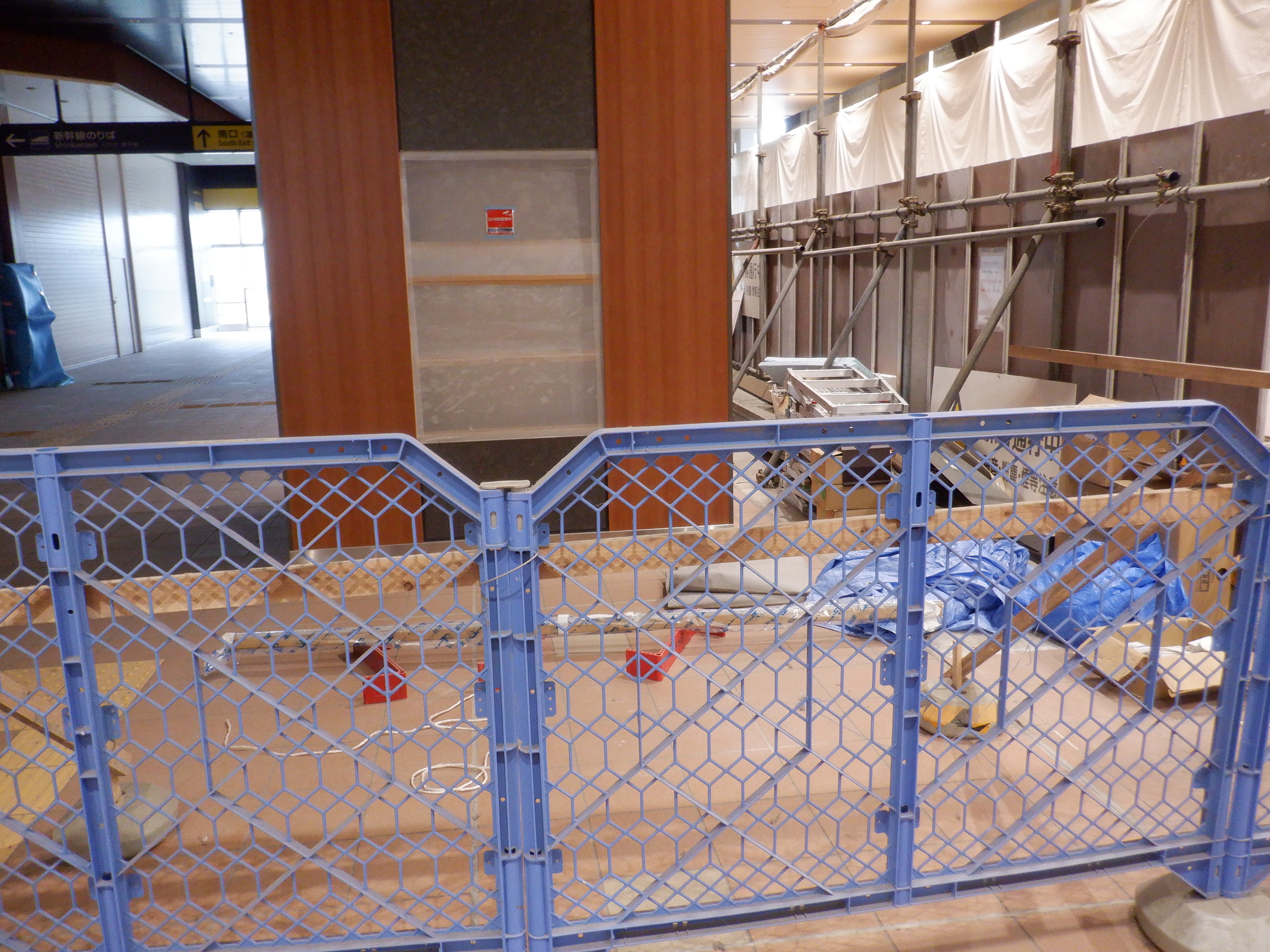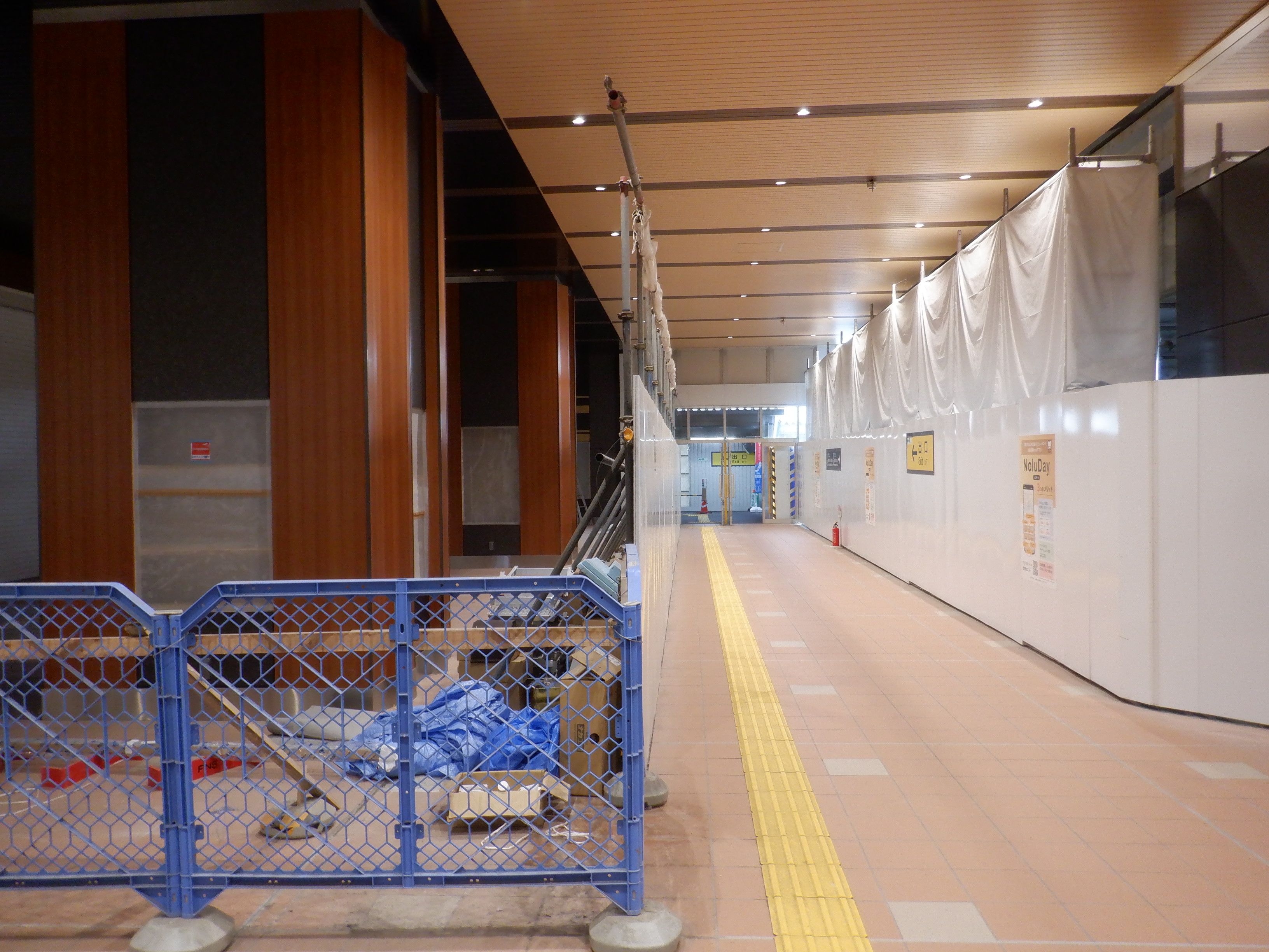 1・2番のりばから見た地下自由通路を再建設中のところとコンビニ・待合室等を建設中のところ。囲いができはじめています。